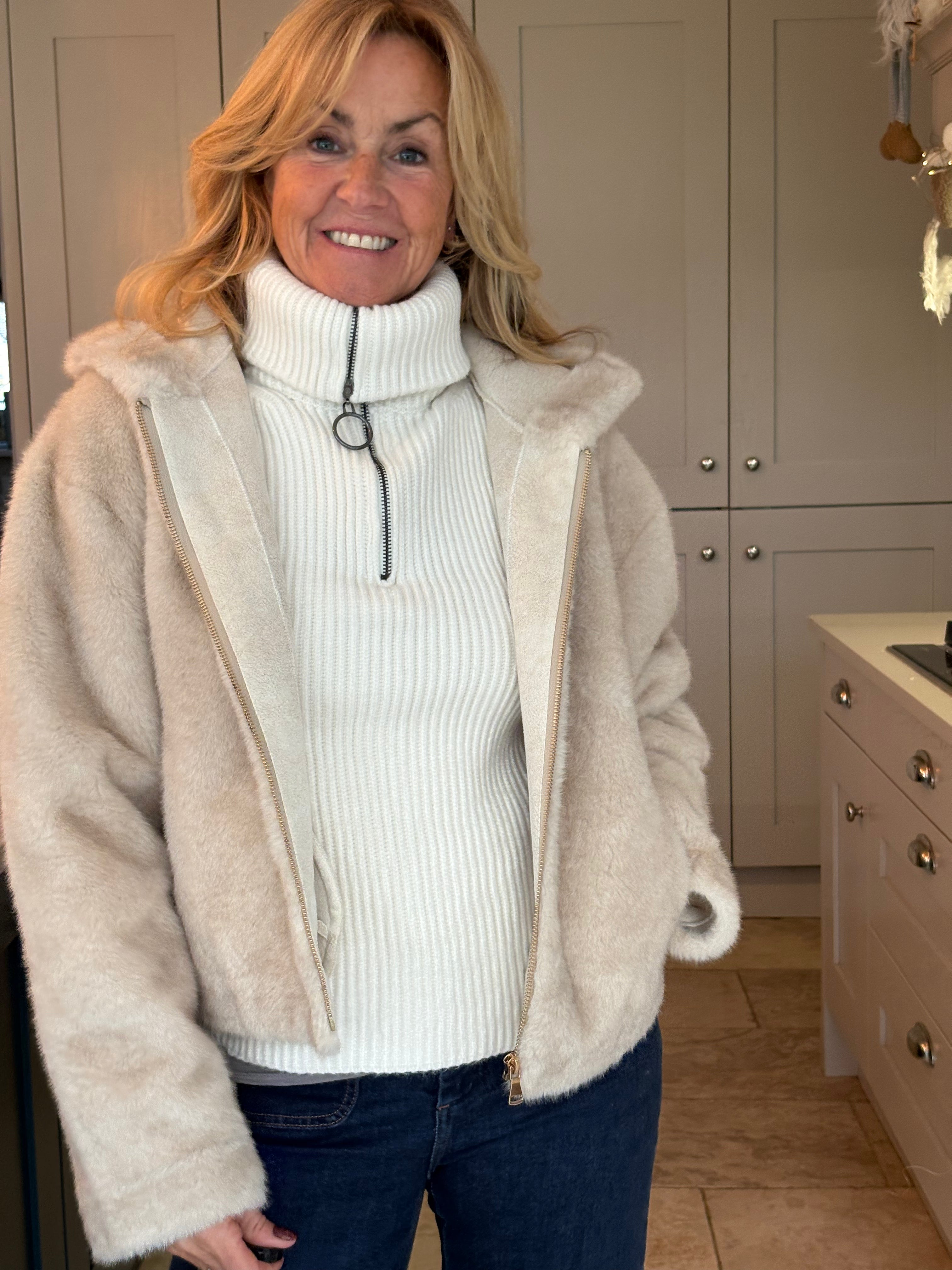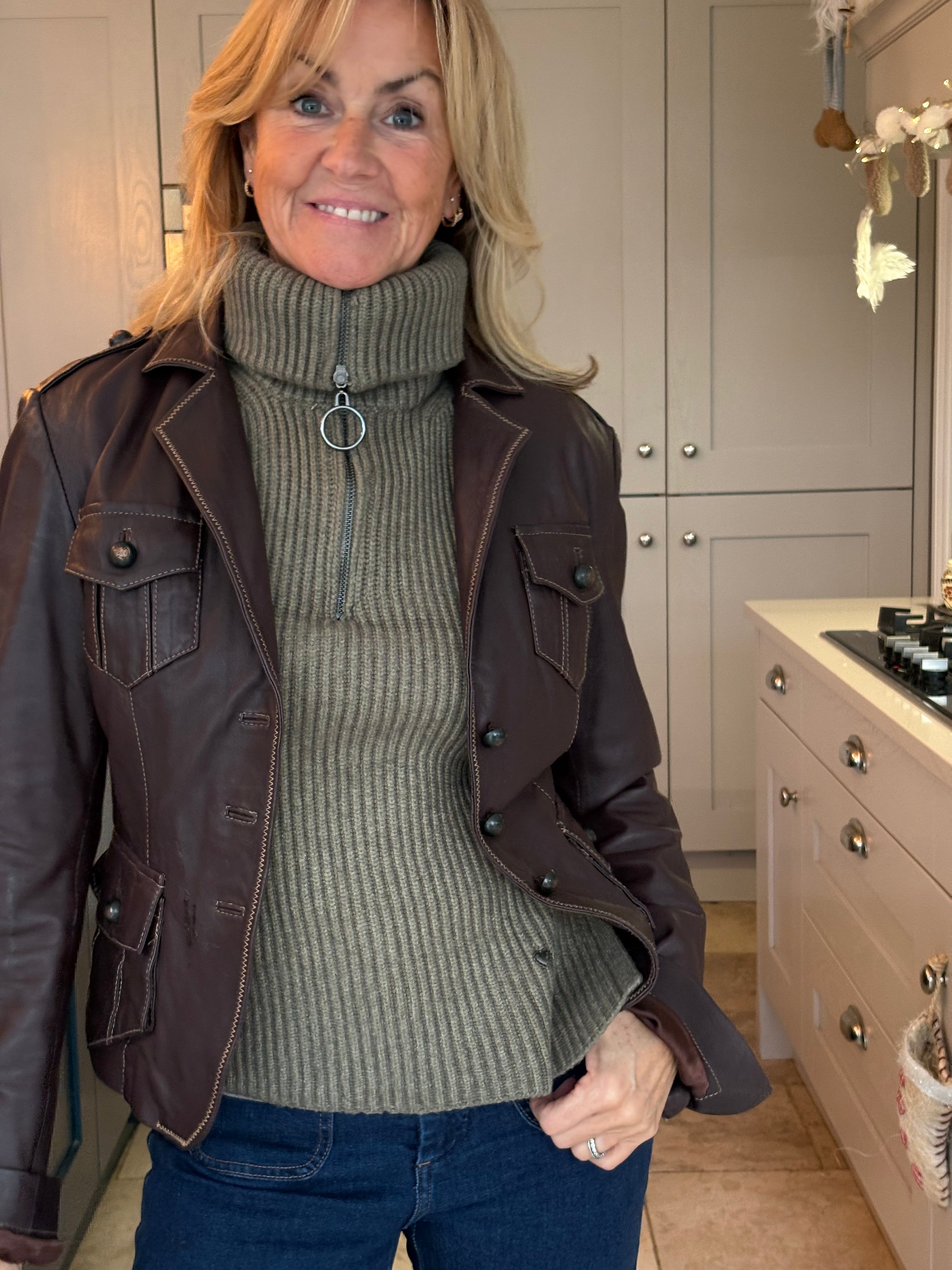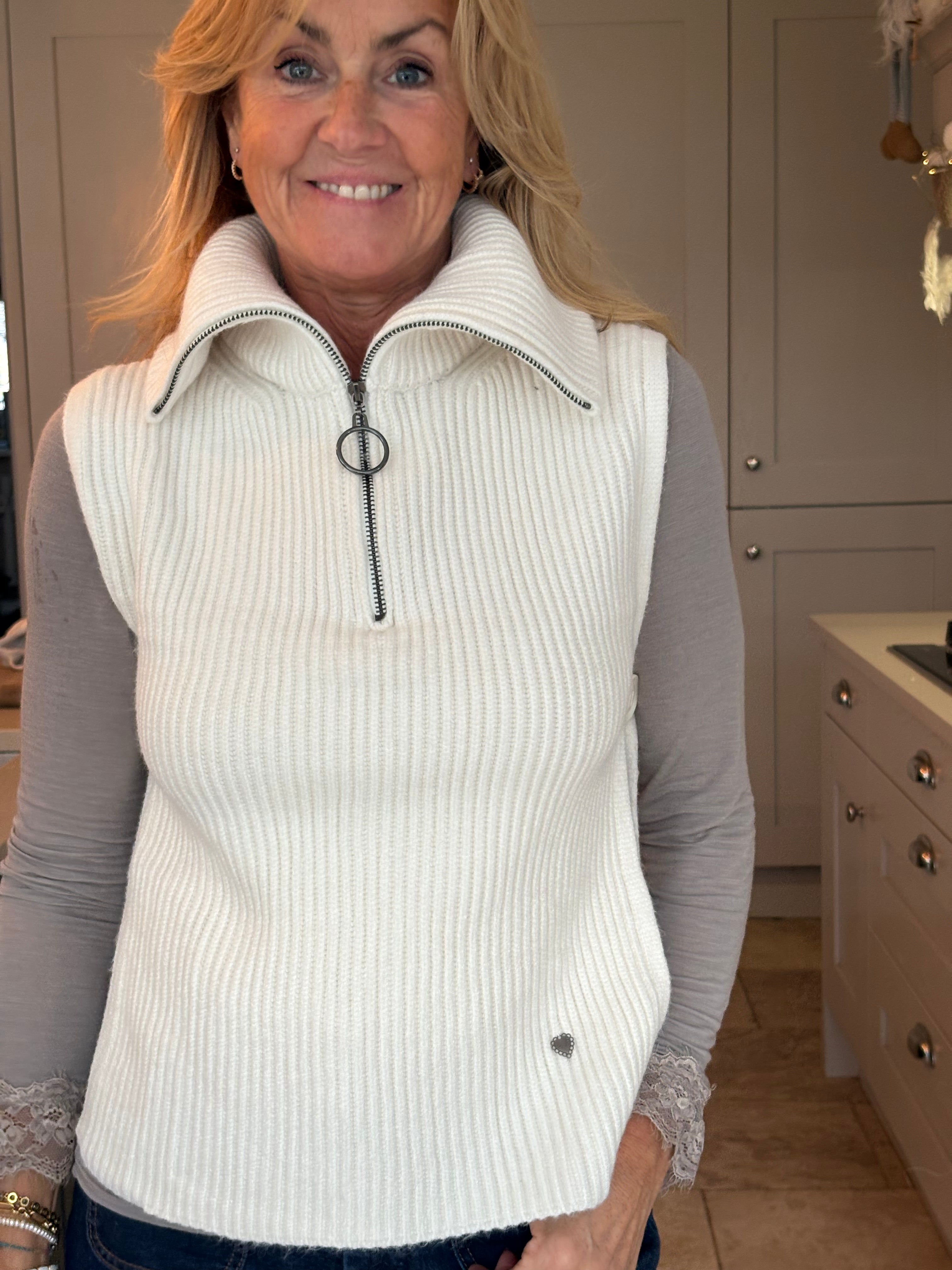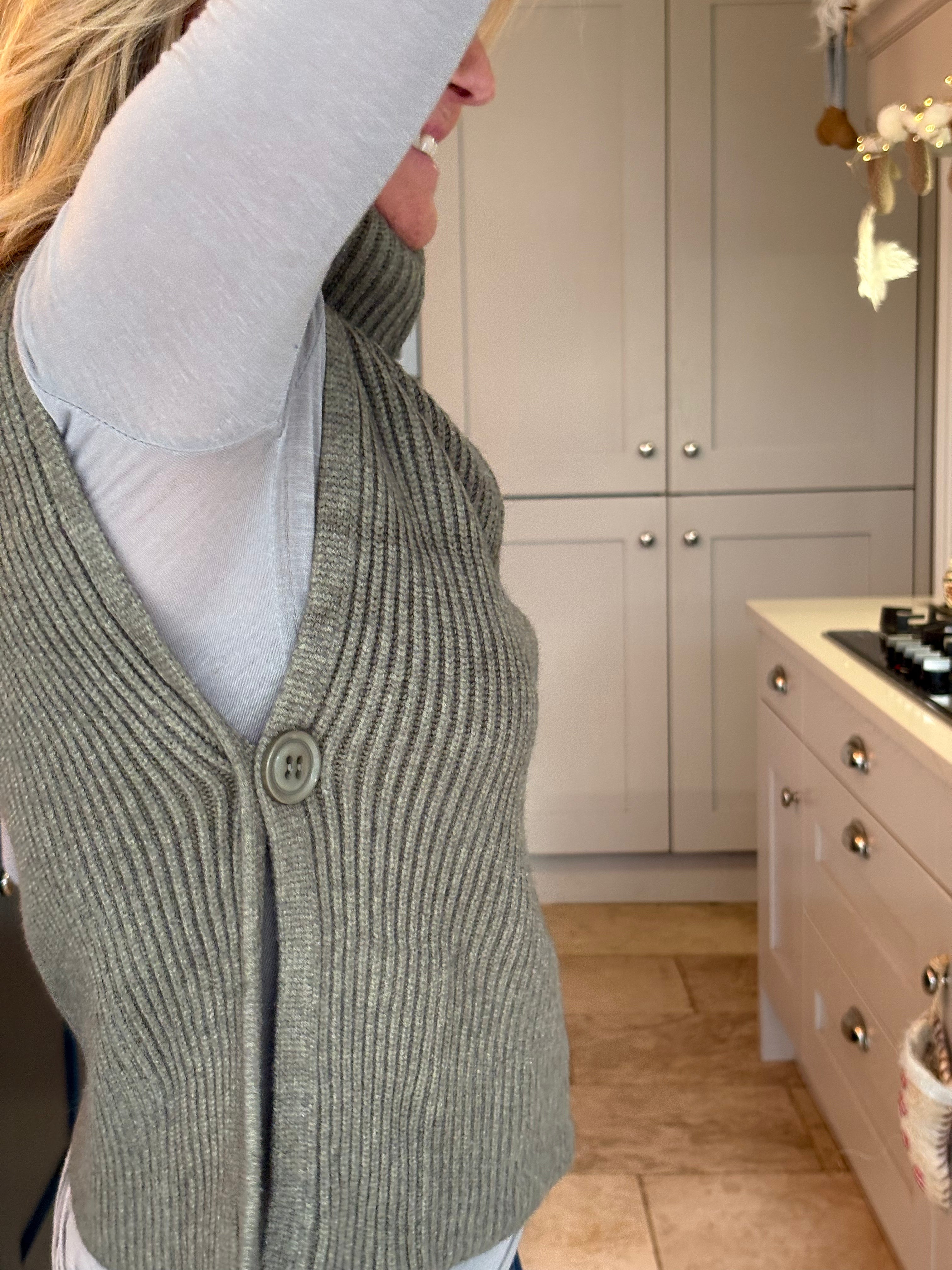 A fabulous ribbed tank top with open sides and a button fastening.  The Eddie falls to just below the waist and has a high ribbed neck with a quarter zip, making it easy to wear open like a collar or as a polo neck.  This is an excellent piece for layering under a coat or jacket when you want to keep your neck and front warm but don't need the bulk of a jumper.  In Khaki and Cream colours.  The Eddie is a one size piece made from viscose, polyester and nylon, giving it a good stretch and softness.