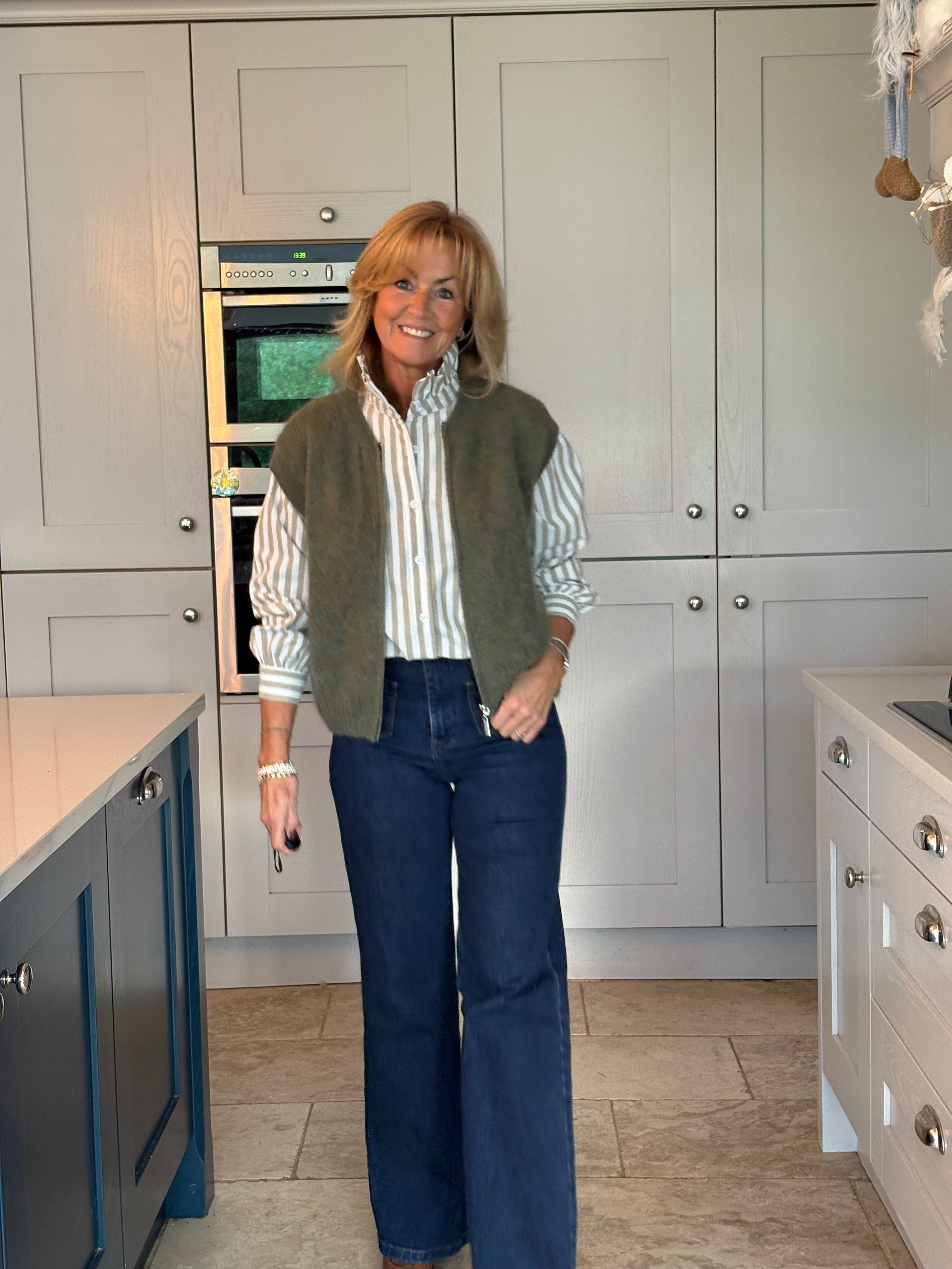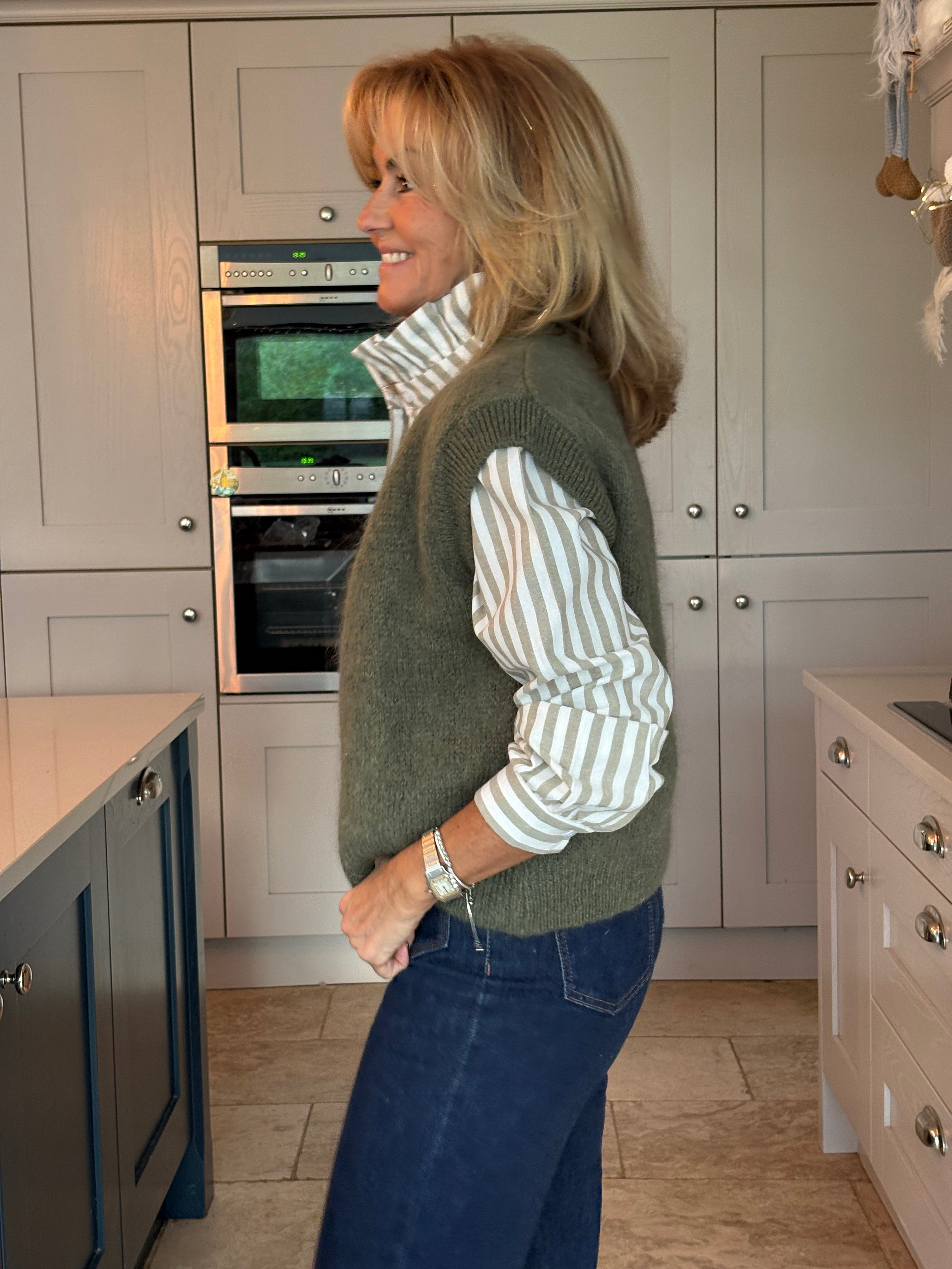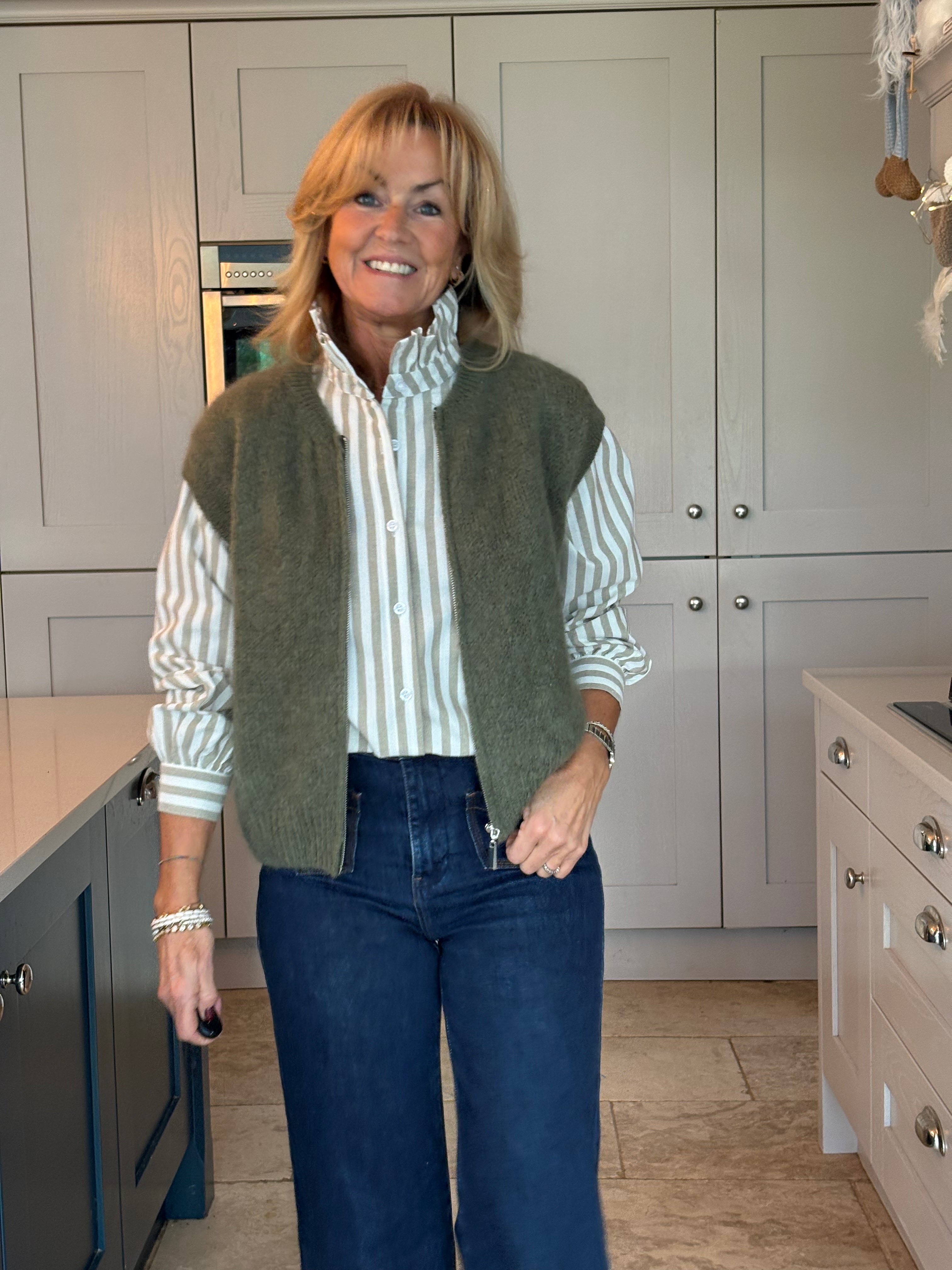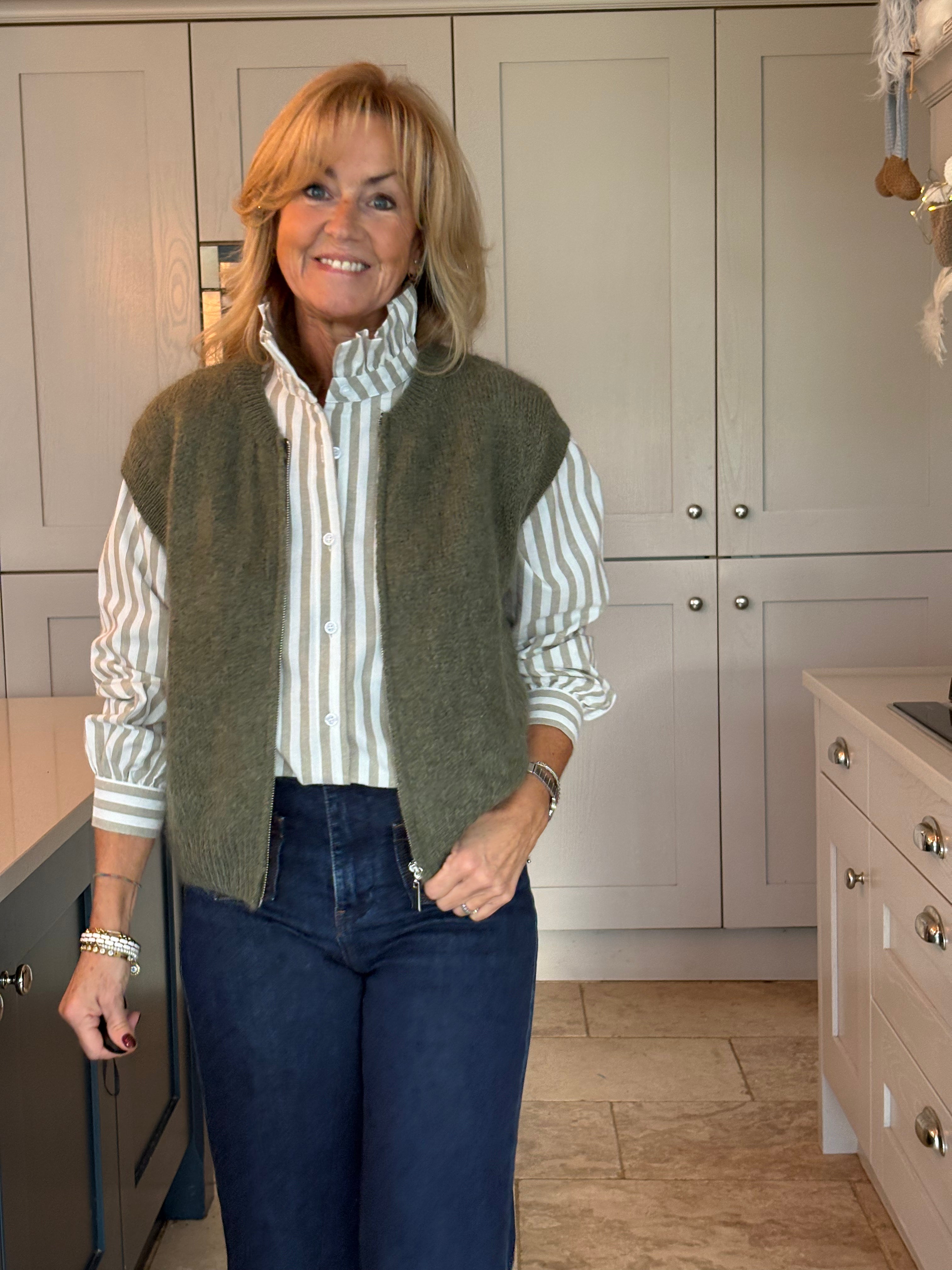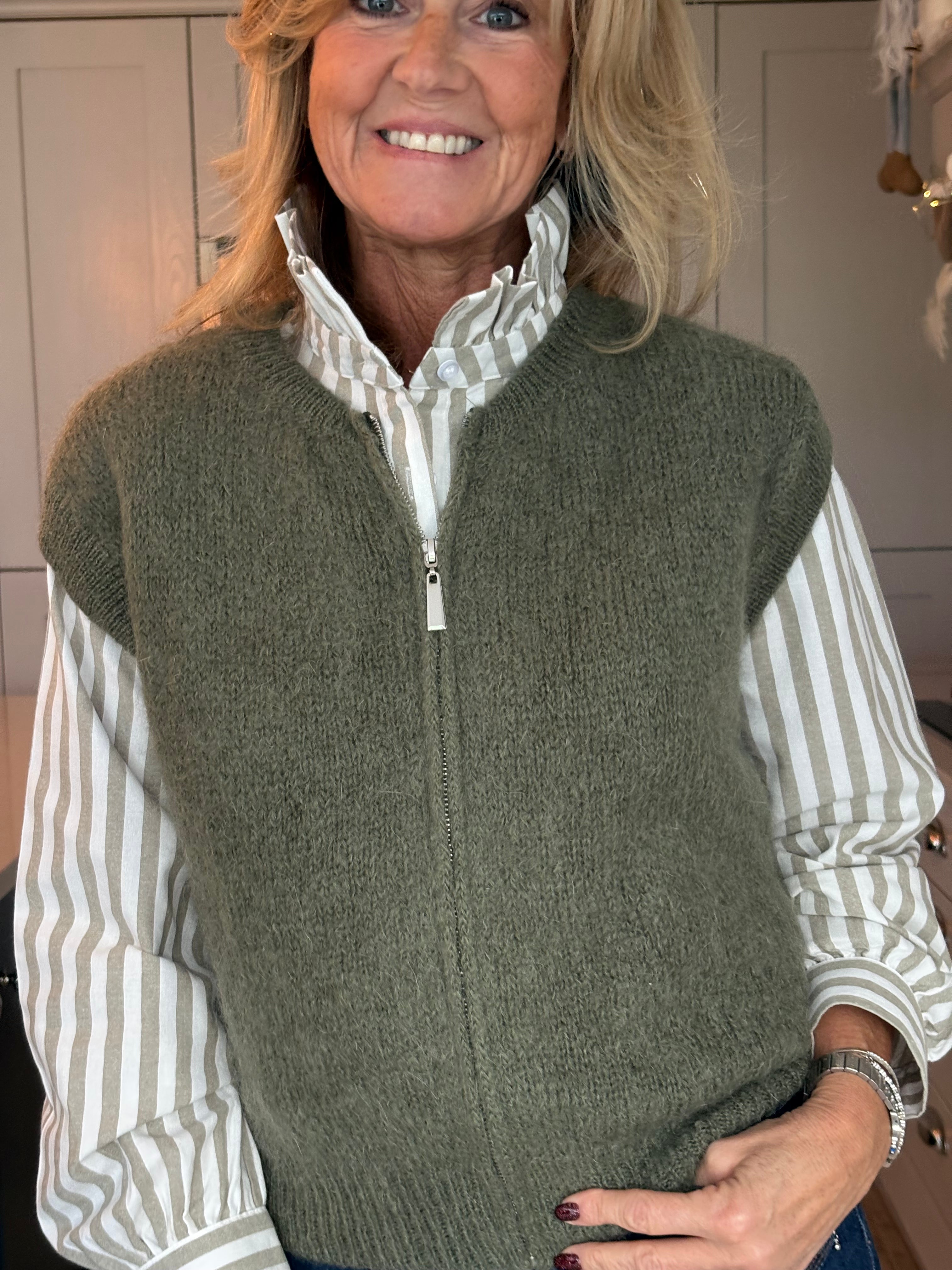This gorgeous taupe, Khaki and burgundy mohair blend jumper. Featuring chic cap sleeves and a stylish zip-front design, it’s as versatile as it is elegant.