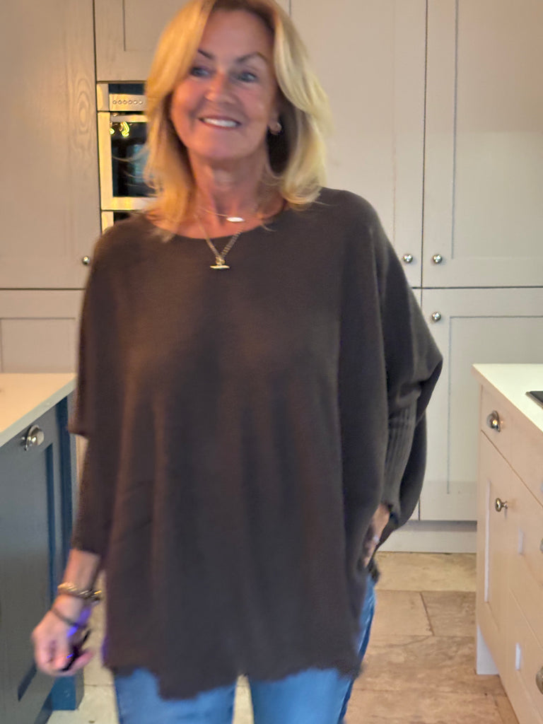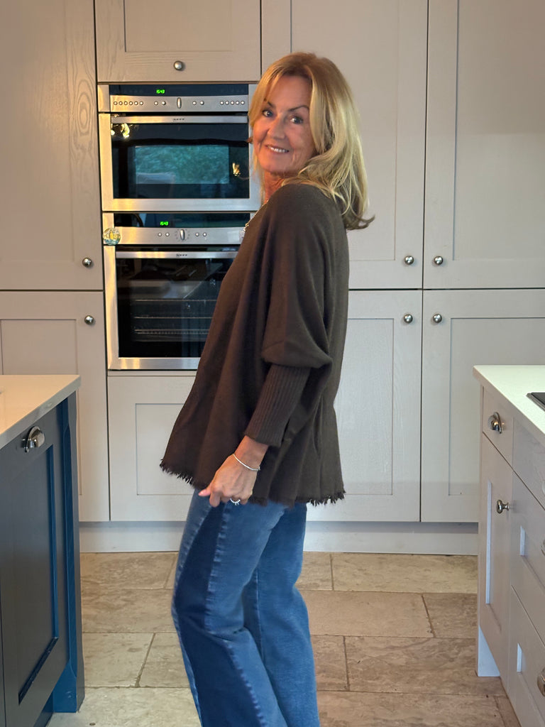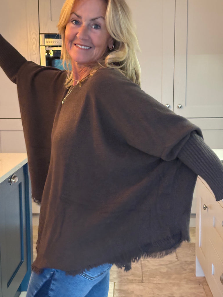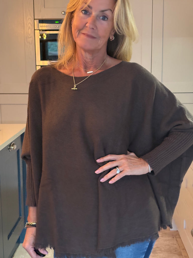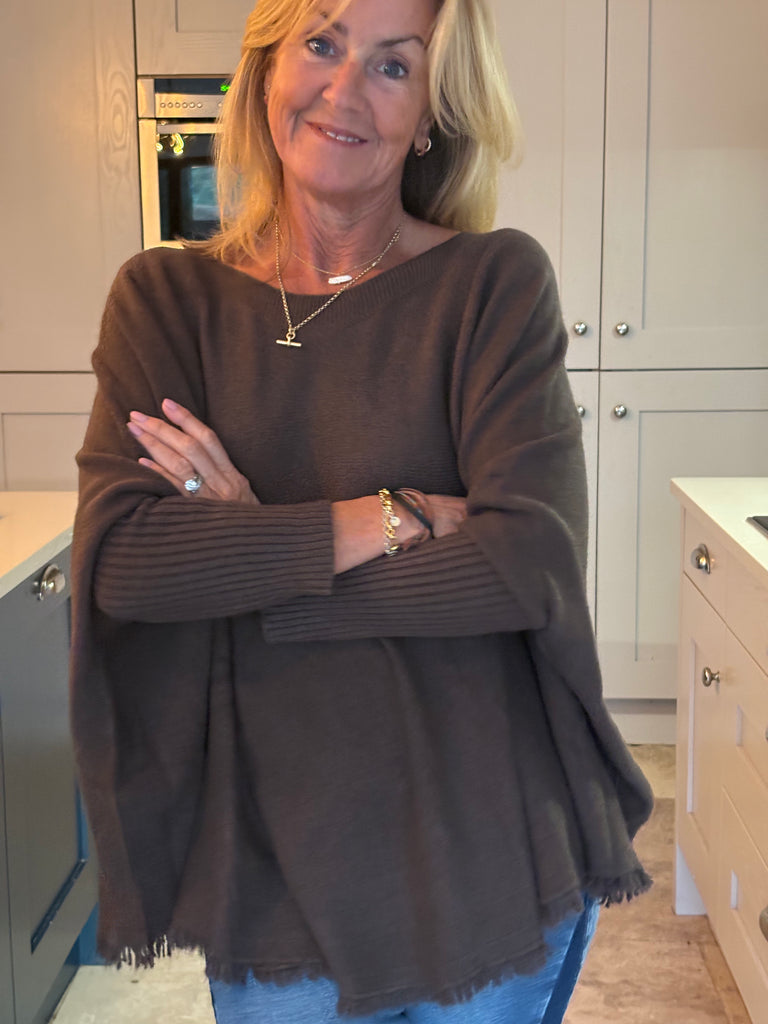 A beautifully fluid poncho jumper in a classic ecru tone and chocolate brown. Designed with a wide boat neckline and a fringed hemline for effortless elegance. The silhouette is loose and draped, offering versatile styling — wear it as a lightweight jumper or layered over other pieces. Long, slim ribbed cuffs add structure and balance to the relaxed shape, making this poncho a timeless, easy-to-wear staple.
