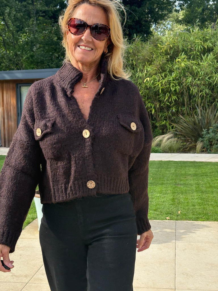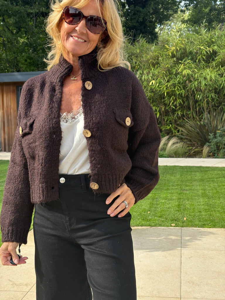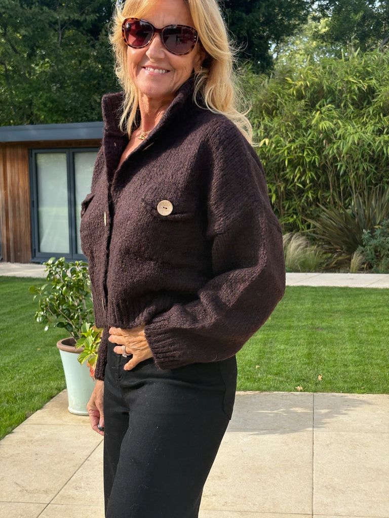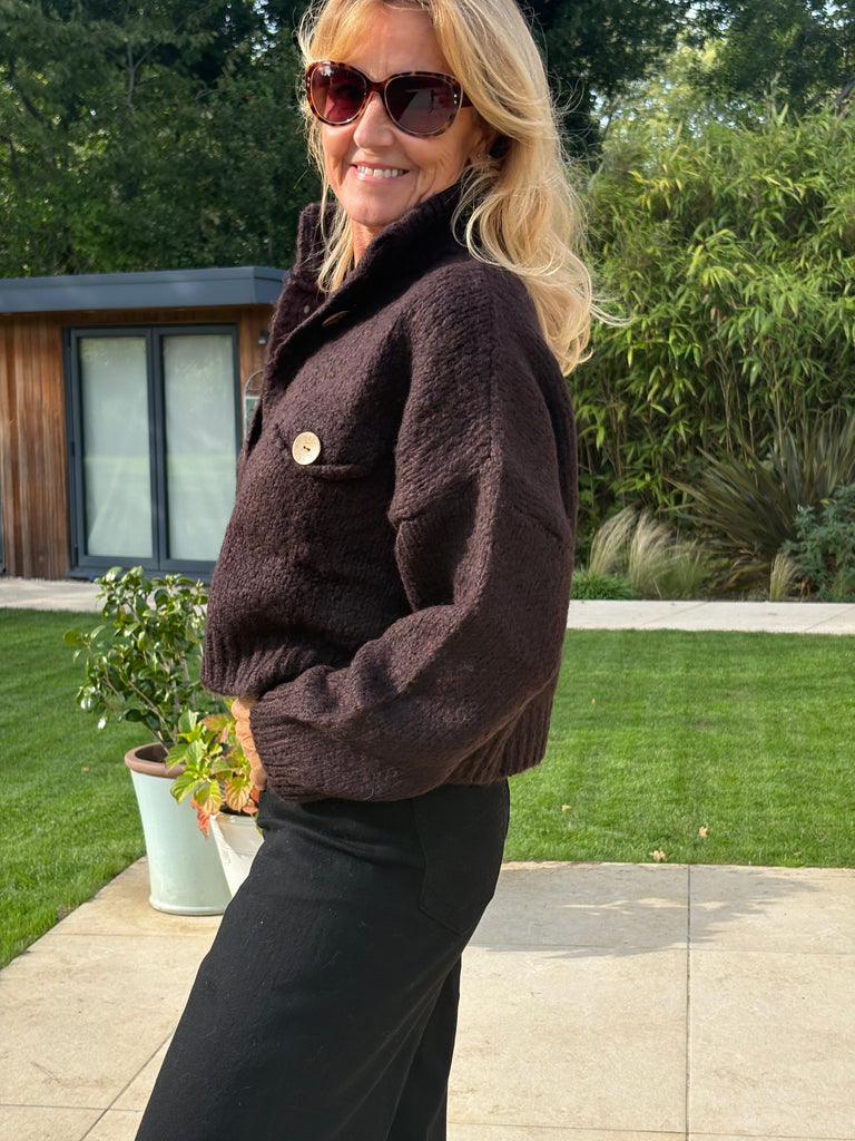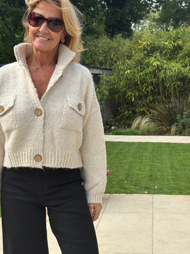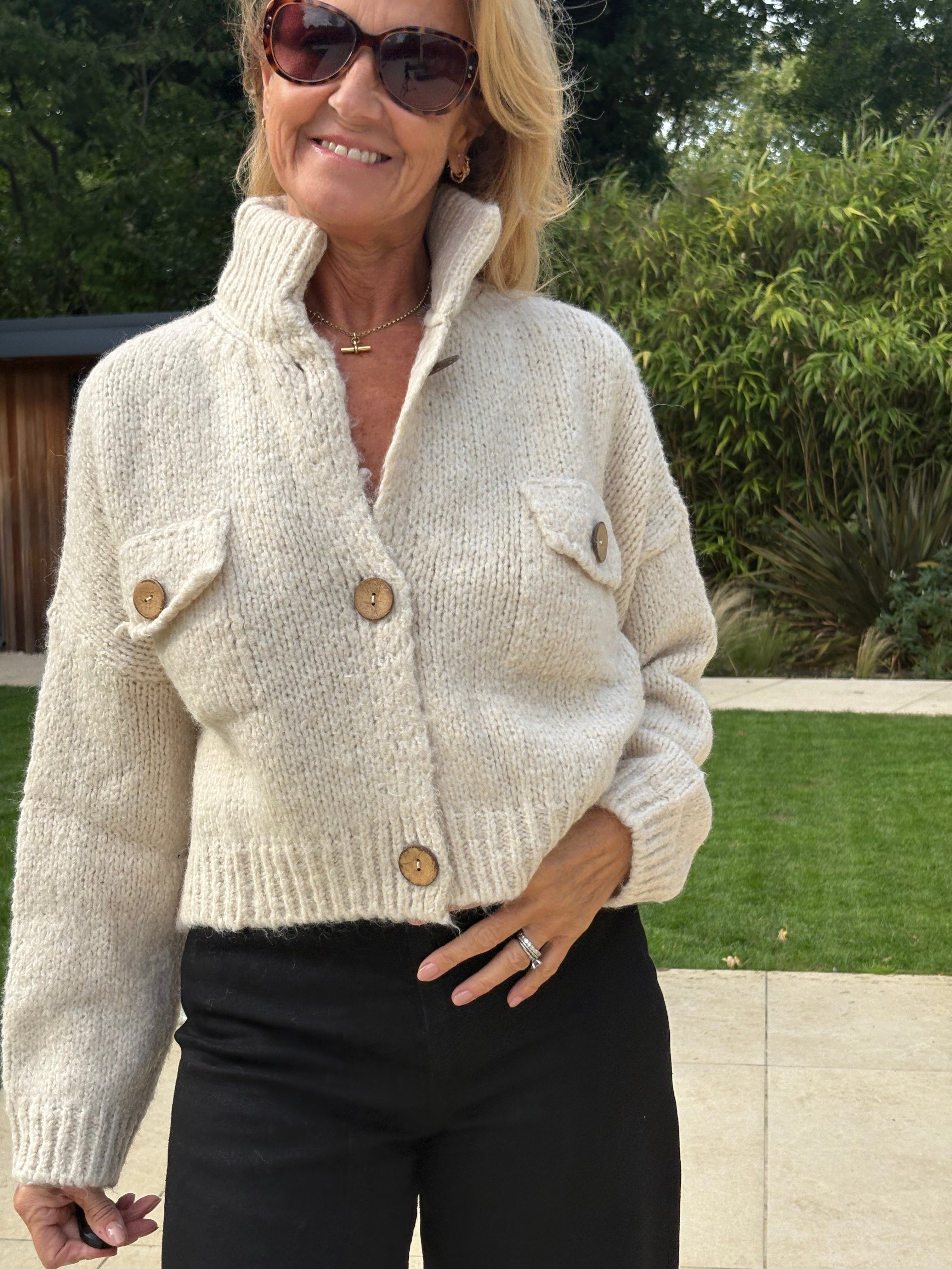 Stay cosy and chic with this gorgeous big knit cropped cardigan. Featuring a stylish stand-up turtle neck collar and two practical front pockets, it’s the perfect blend of elegance and comfort.