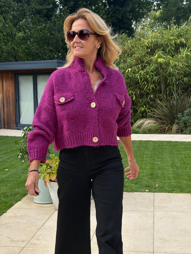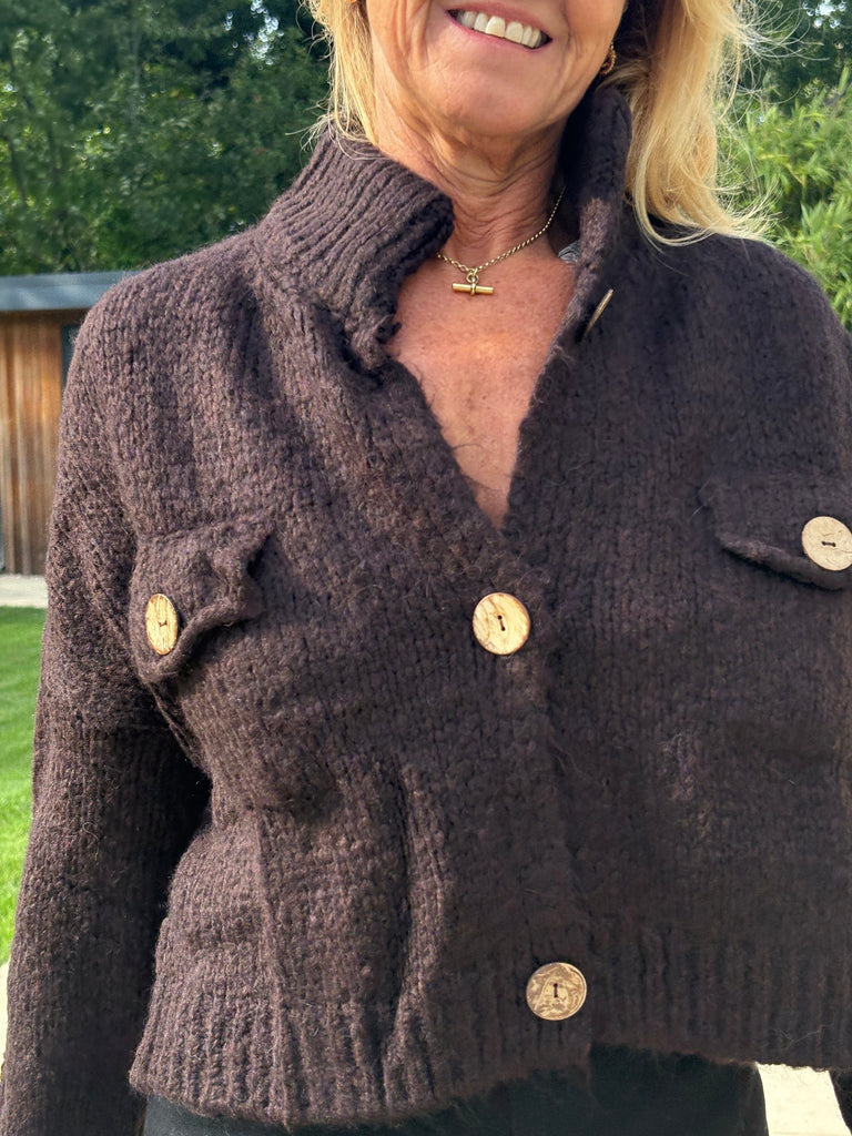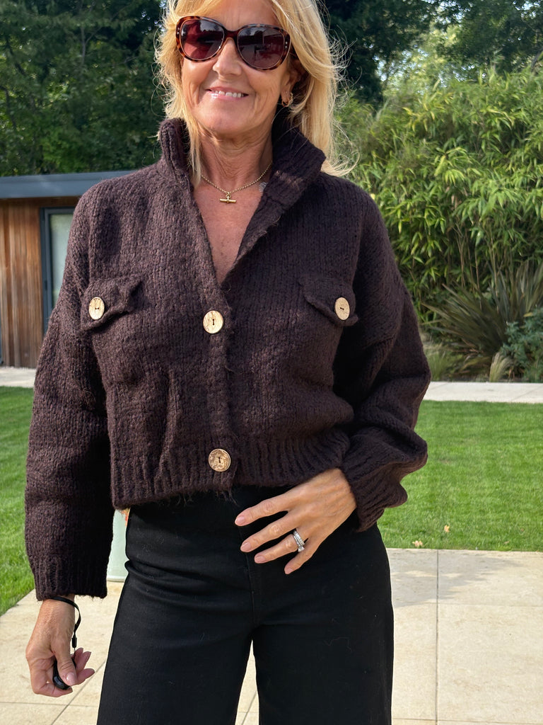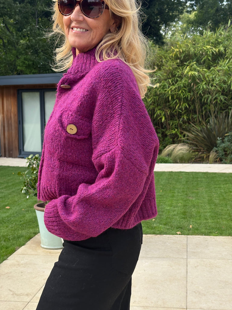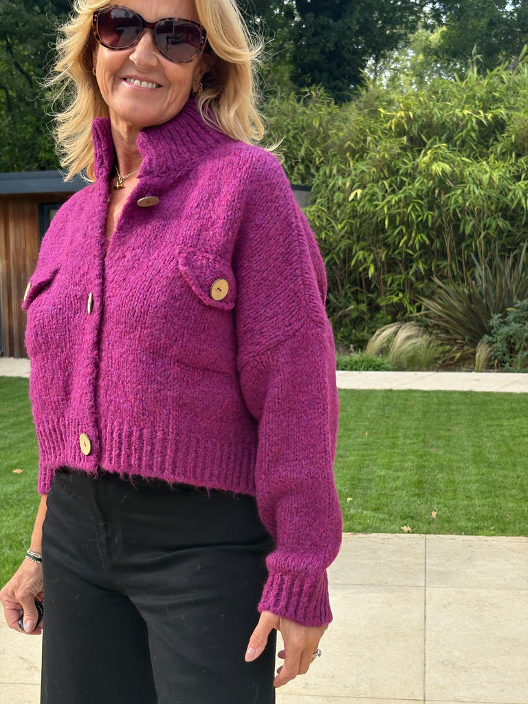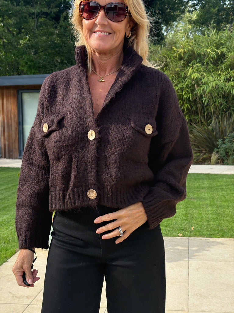 Stay cosy and chic with this gorgeous big knit cropped cardigan. Featuring a stylish stand-up turtle neck collar and two practical front pockets, it’s the perfect blend of elegance and comfort.