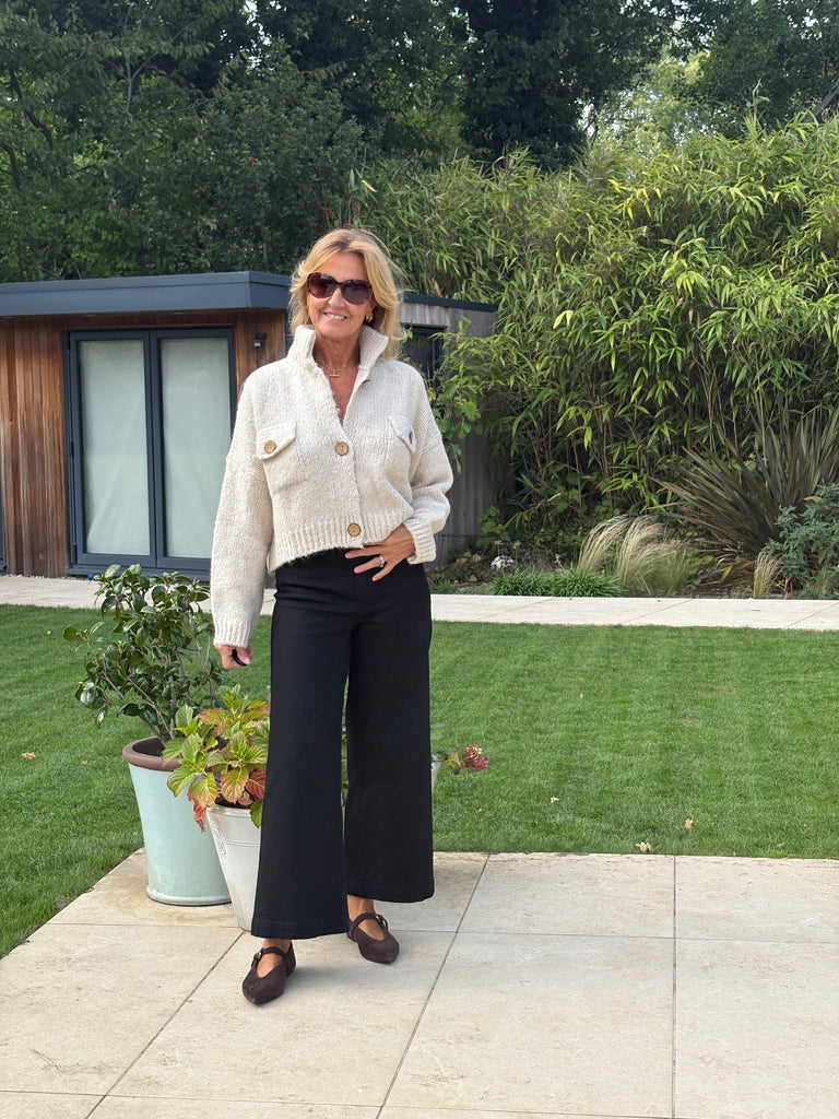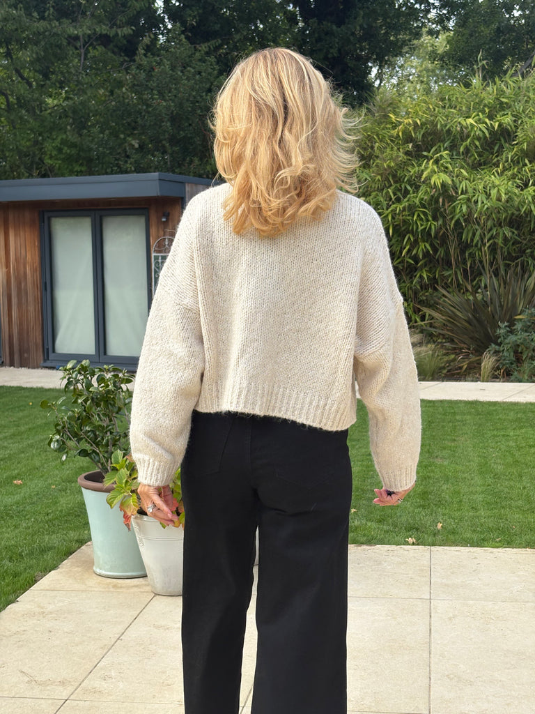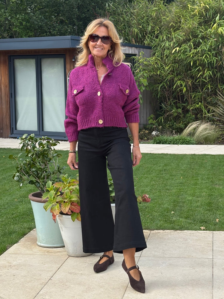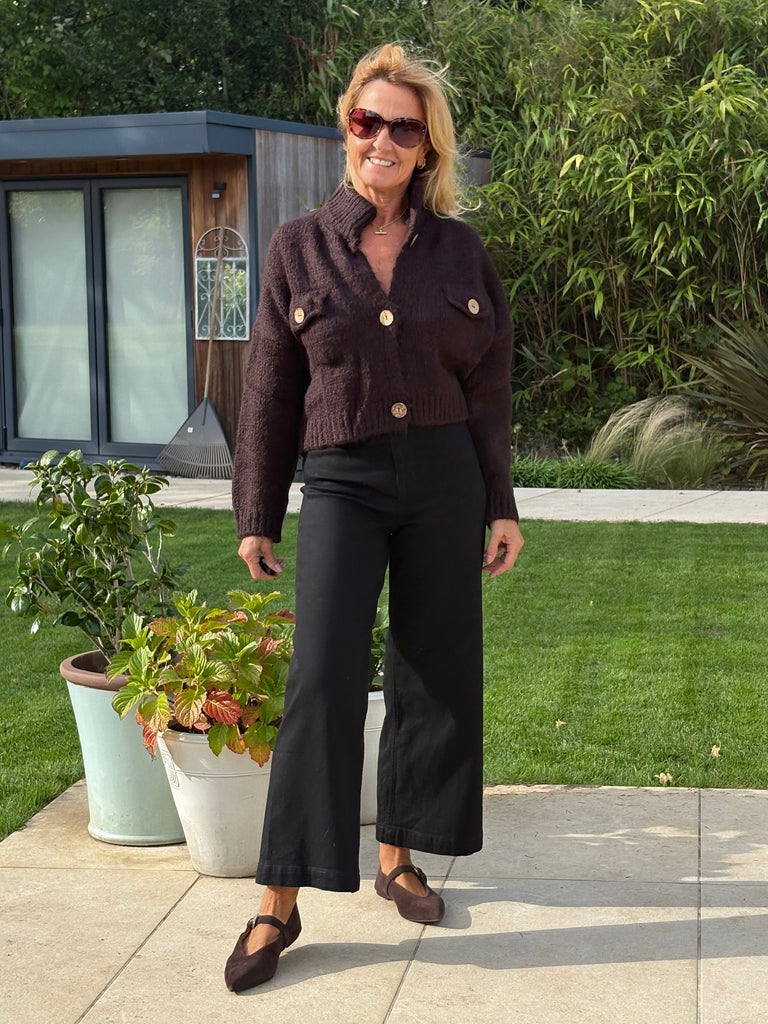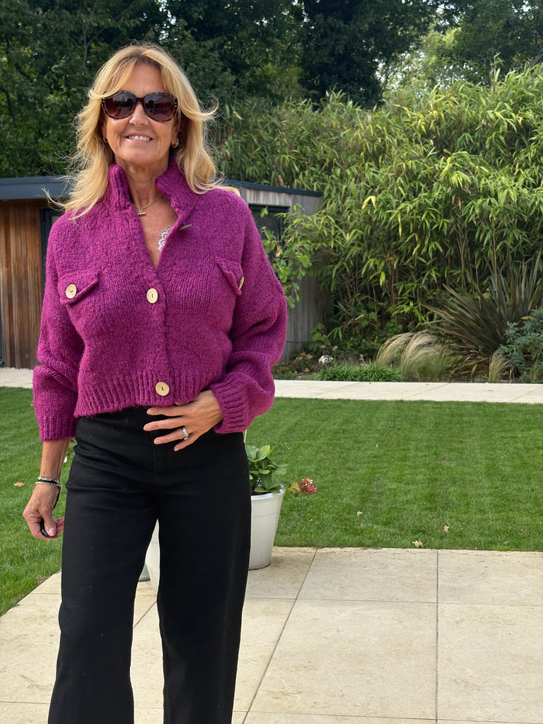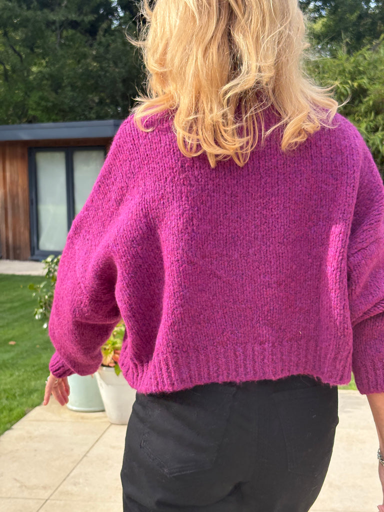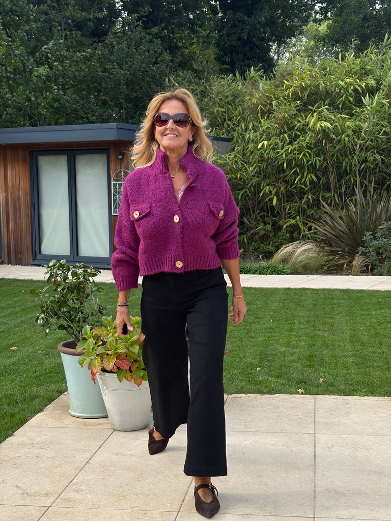 Stay cosy and chic with this gorgeous big knit cropped cardigan. Featuring a stylish stand-up turtle neck collar and two practical front pockets, it’s the perfect blend of elegance and comfort.