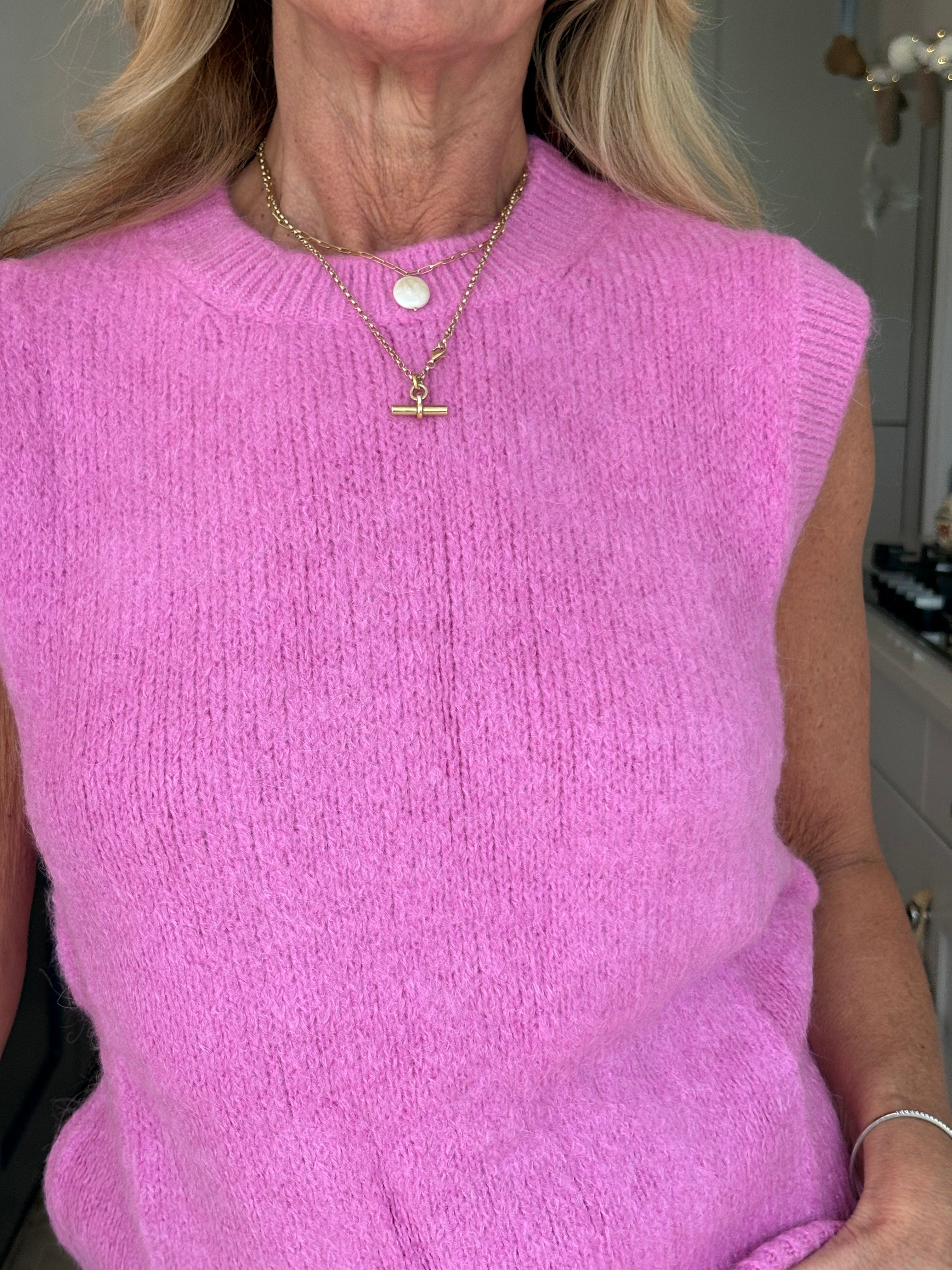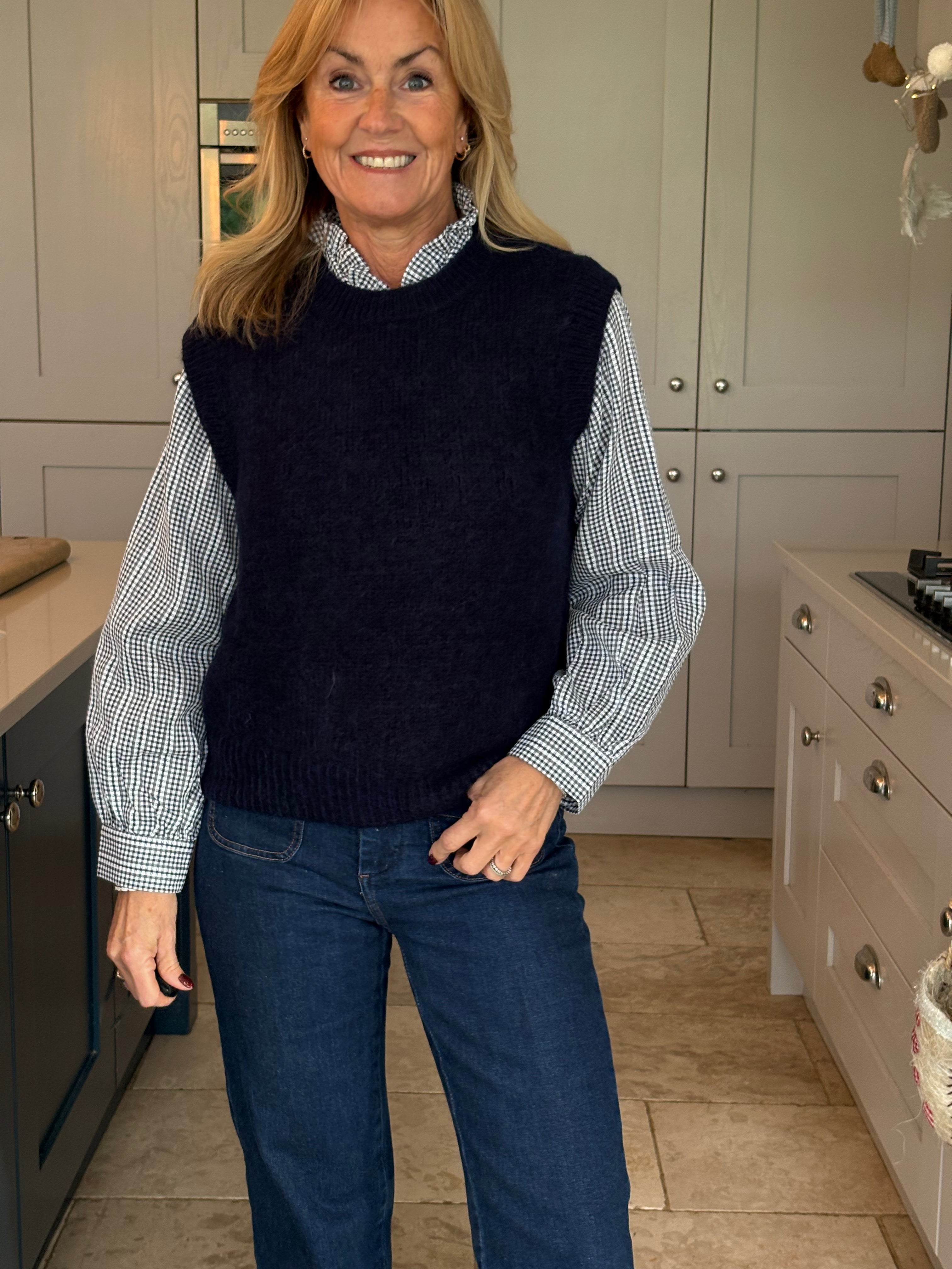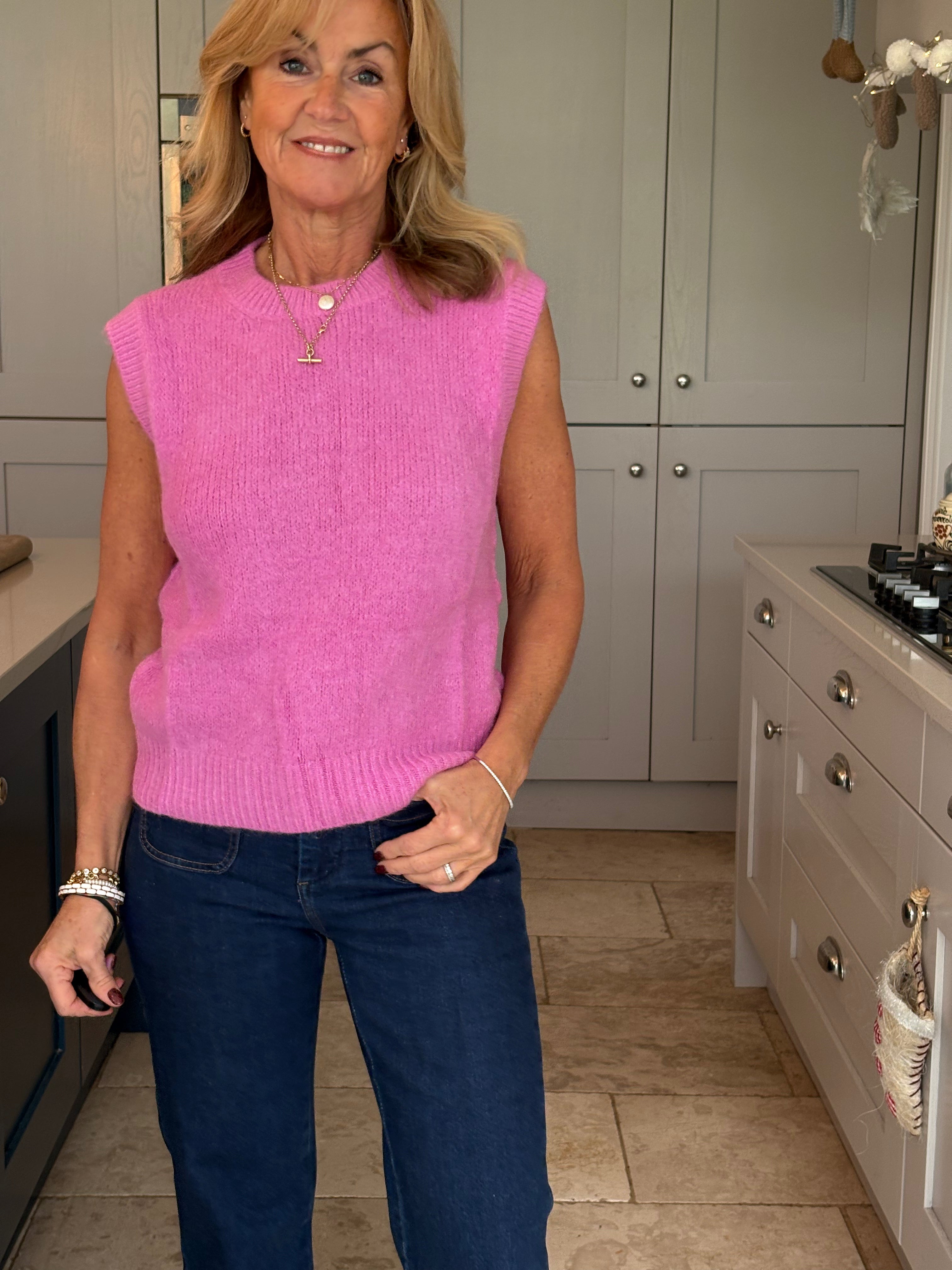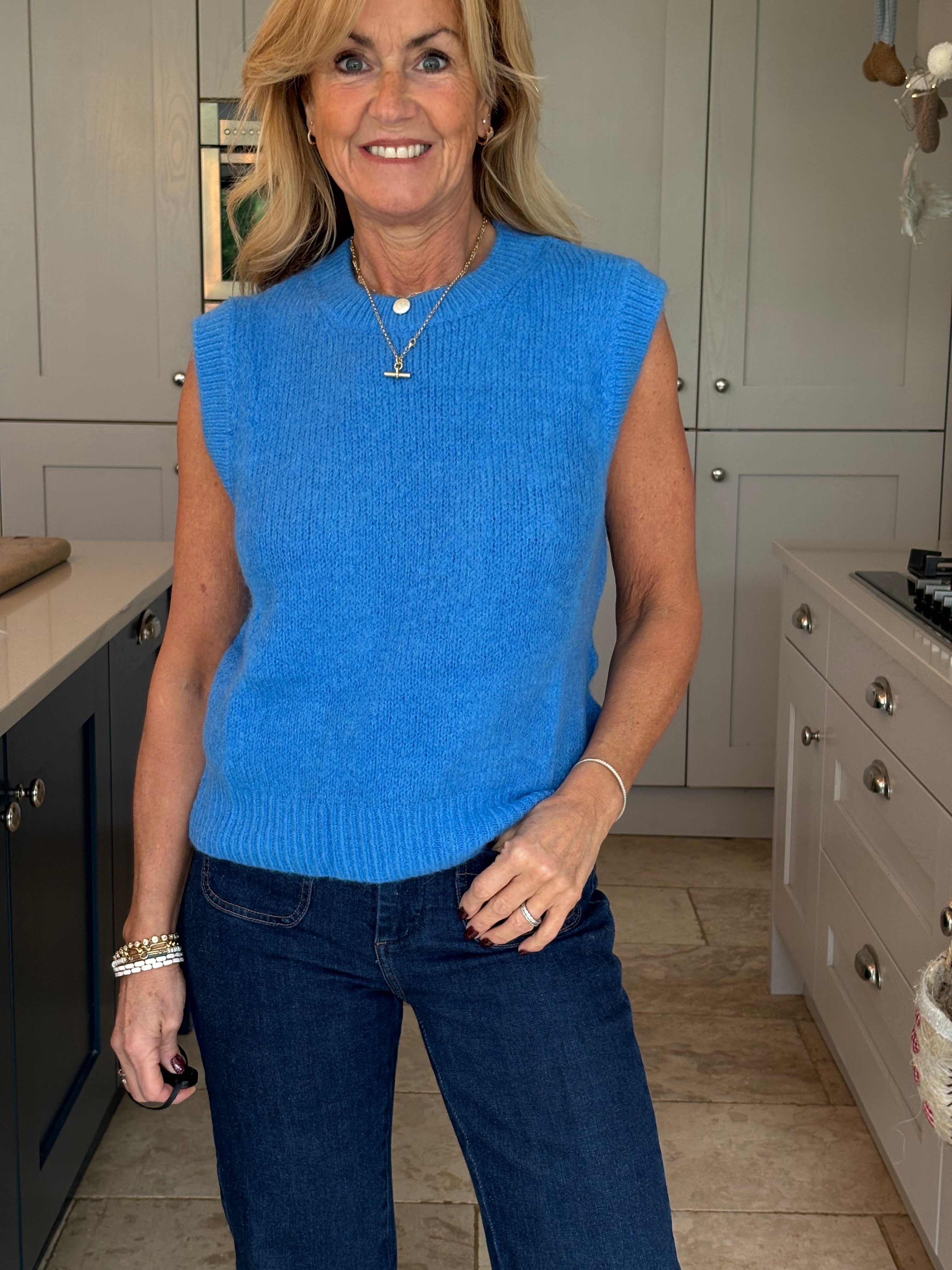 A really great fitting tank top made from acrylic, polyamide, alpaca, wool and elastane. Soft and comfortable with a ribbed crew neckline, ribbed arm holes and a ribbed hemline. The Kate is not too long and baggy which makes it ideal to wear on it's own, on top of a dress or with a shirt. In 3 fabulous colours, navy, pink and royal blue.