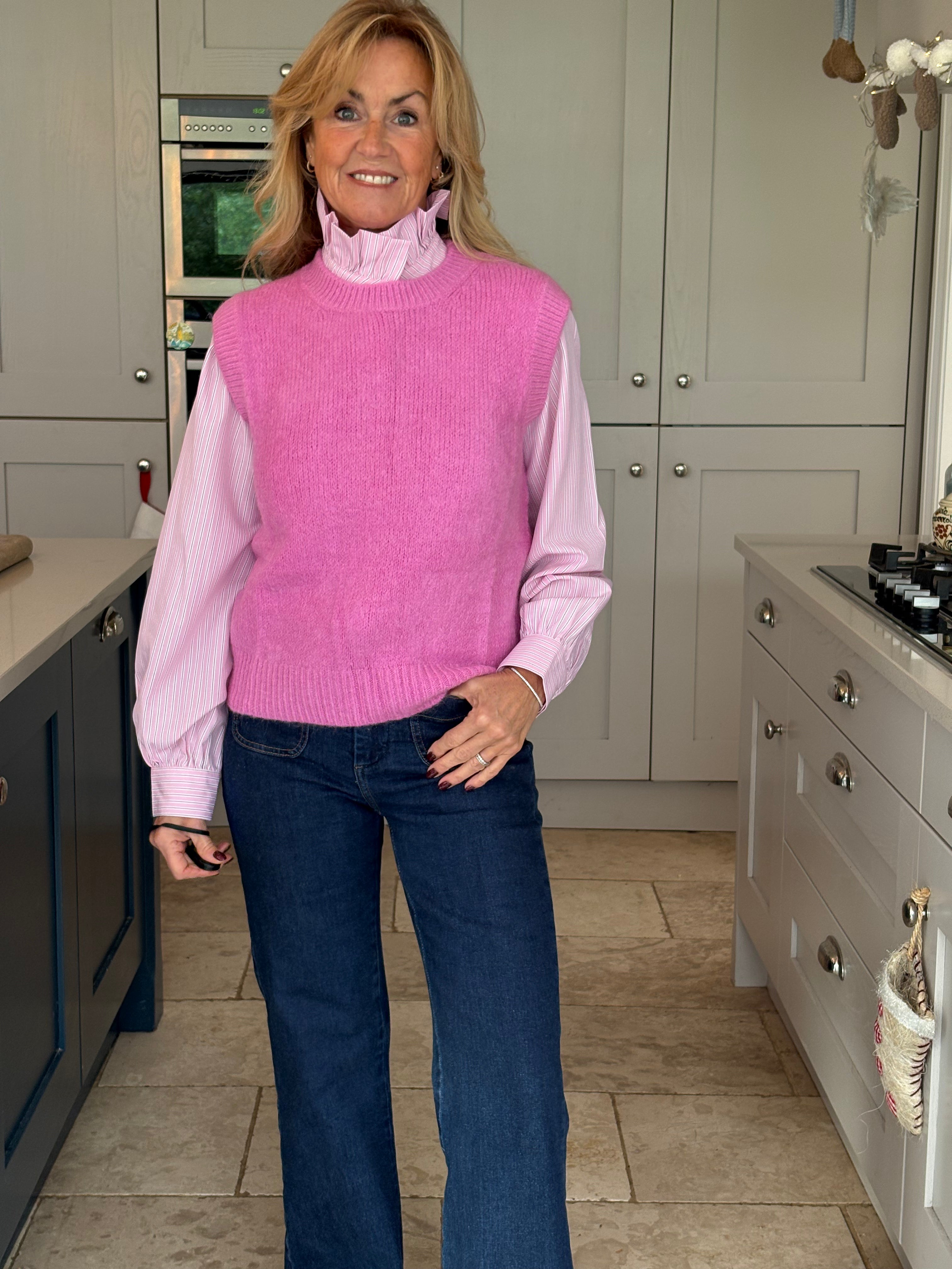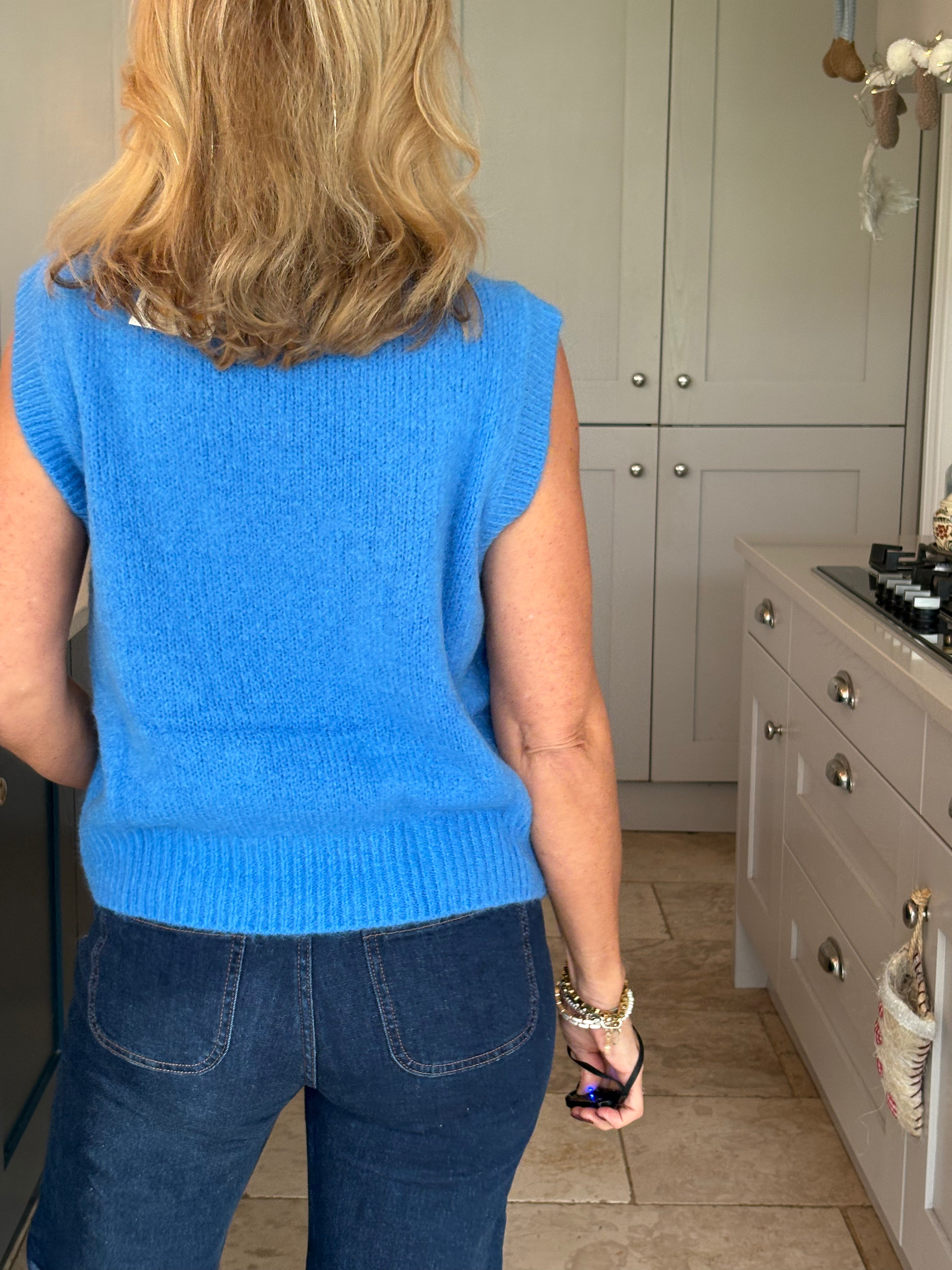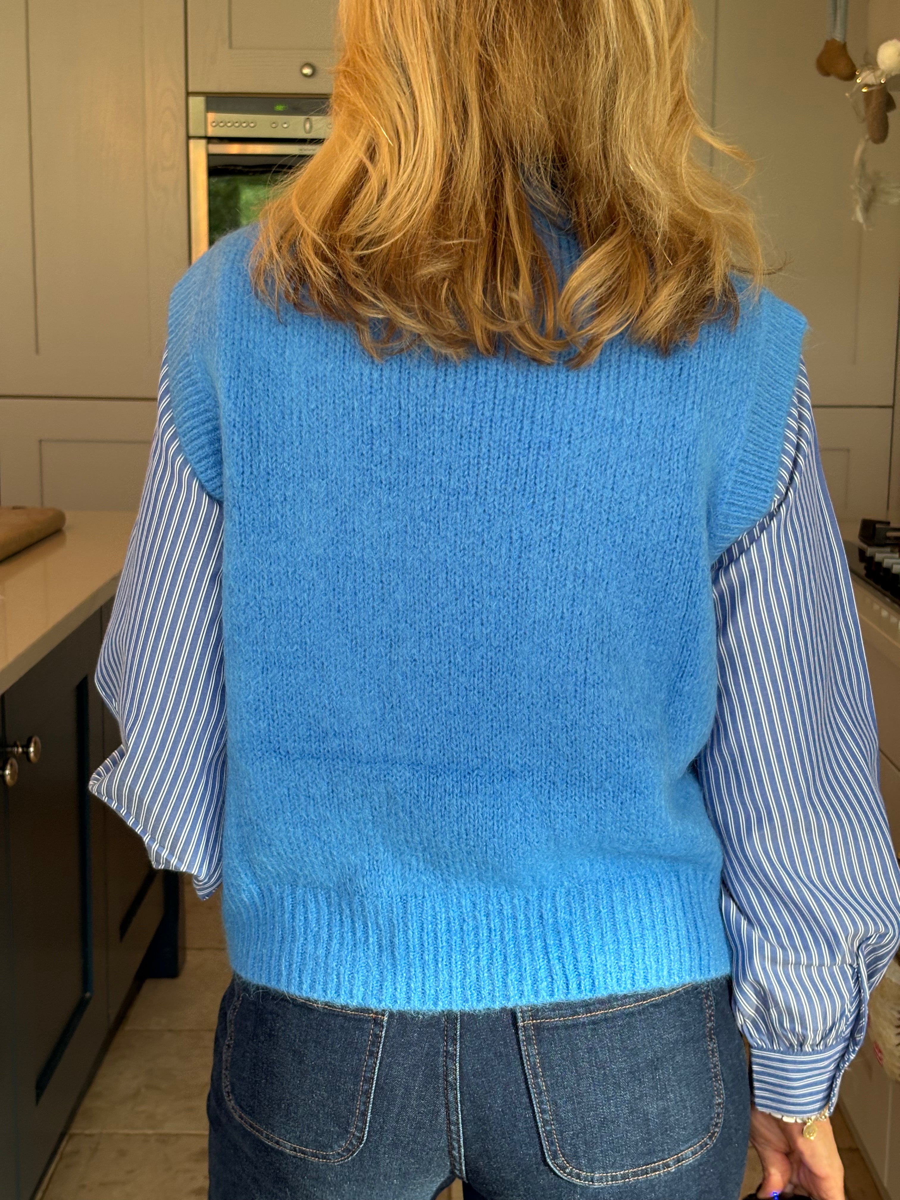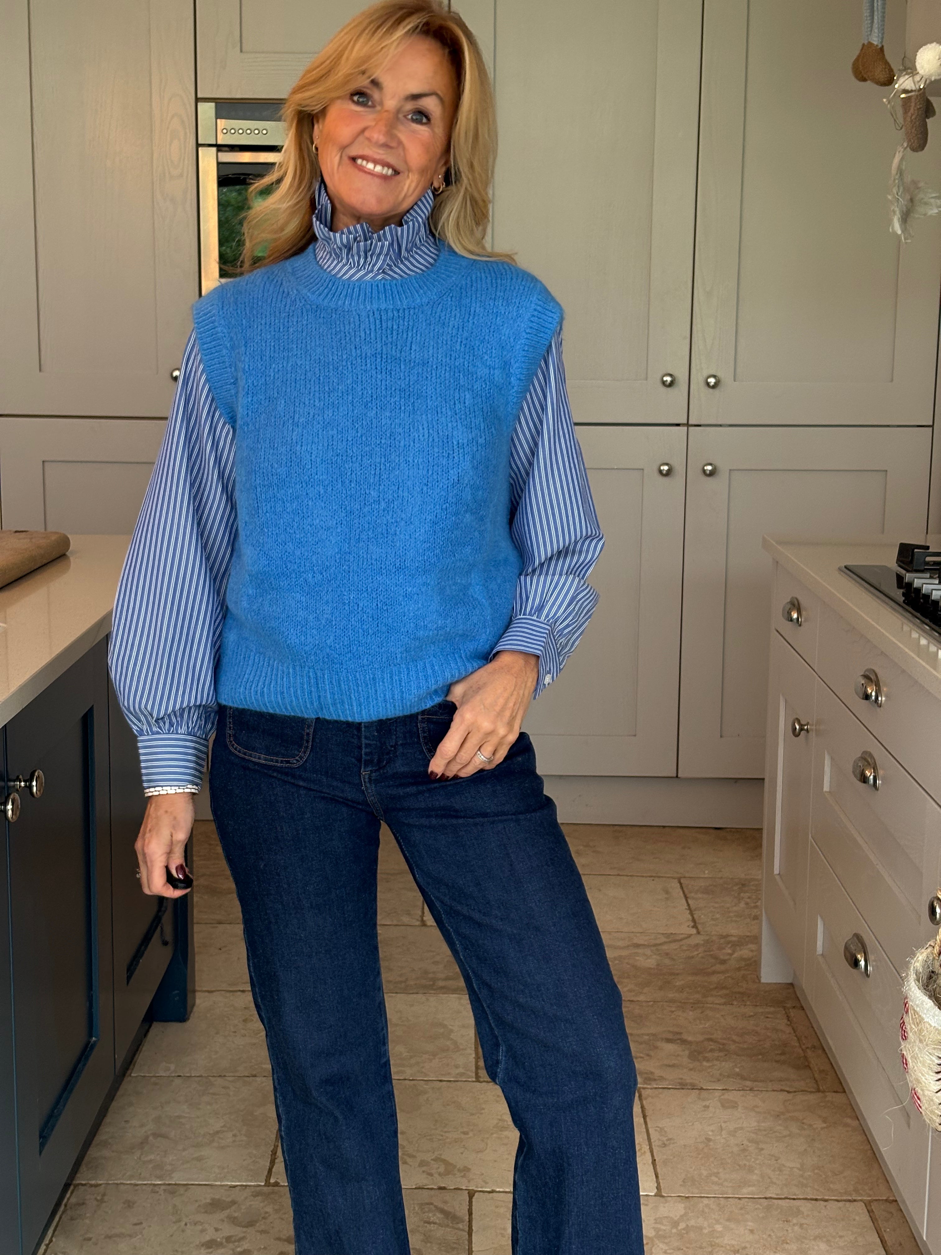 A really great fitting tank top made from acrylic, polyamide, alpaca, wool and elastane. Soft and comfortable with a ribbed crew neckline, ribbed arm holes and a ribbed hemline. The Kate is not too long and baggy which makes it ideal to wear on it's own, on top of a dress or with a shirt. In 3 fabulous colours, navy, pink and royal blue.