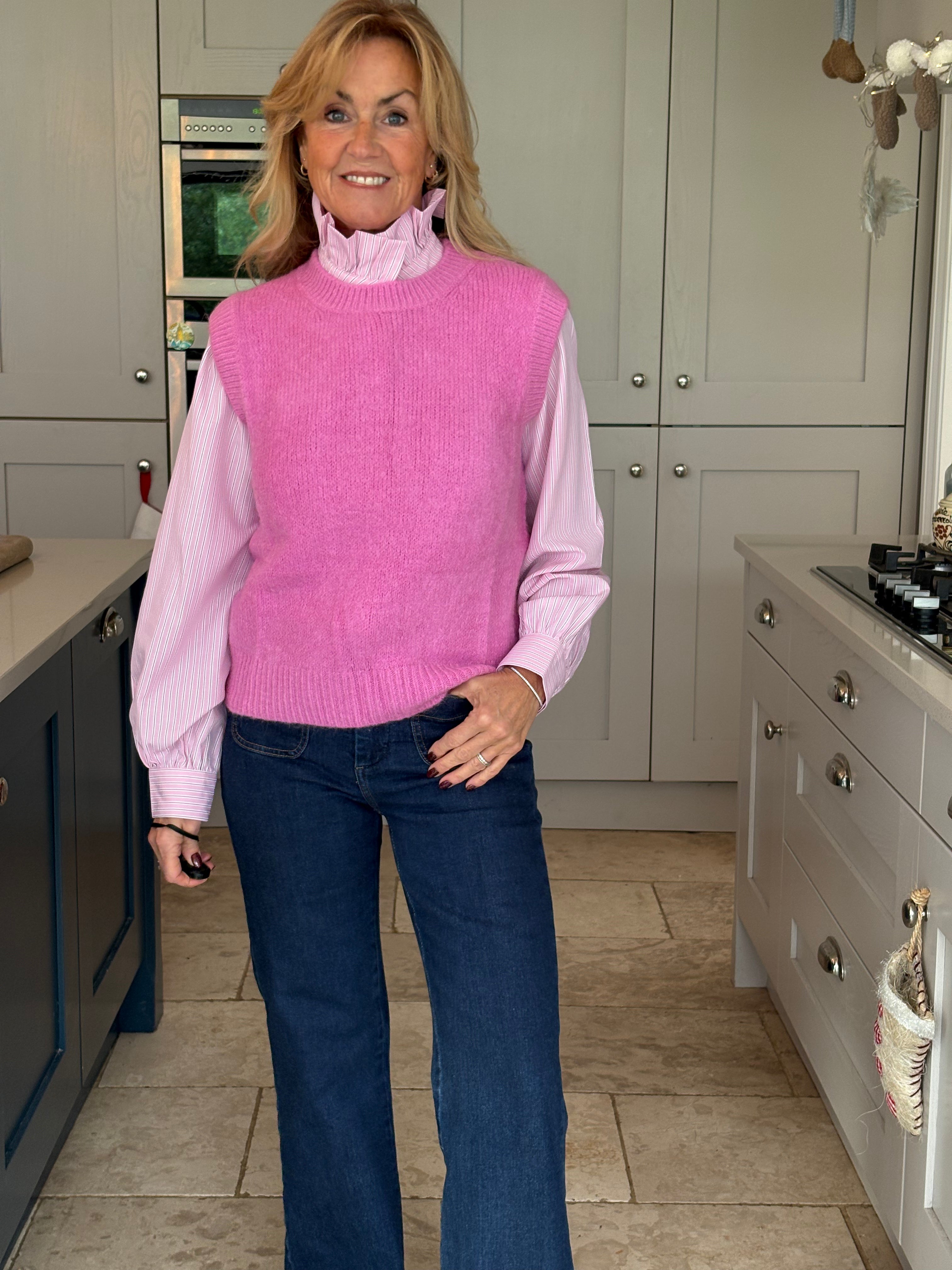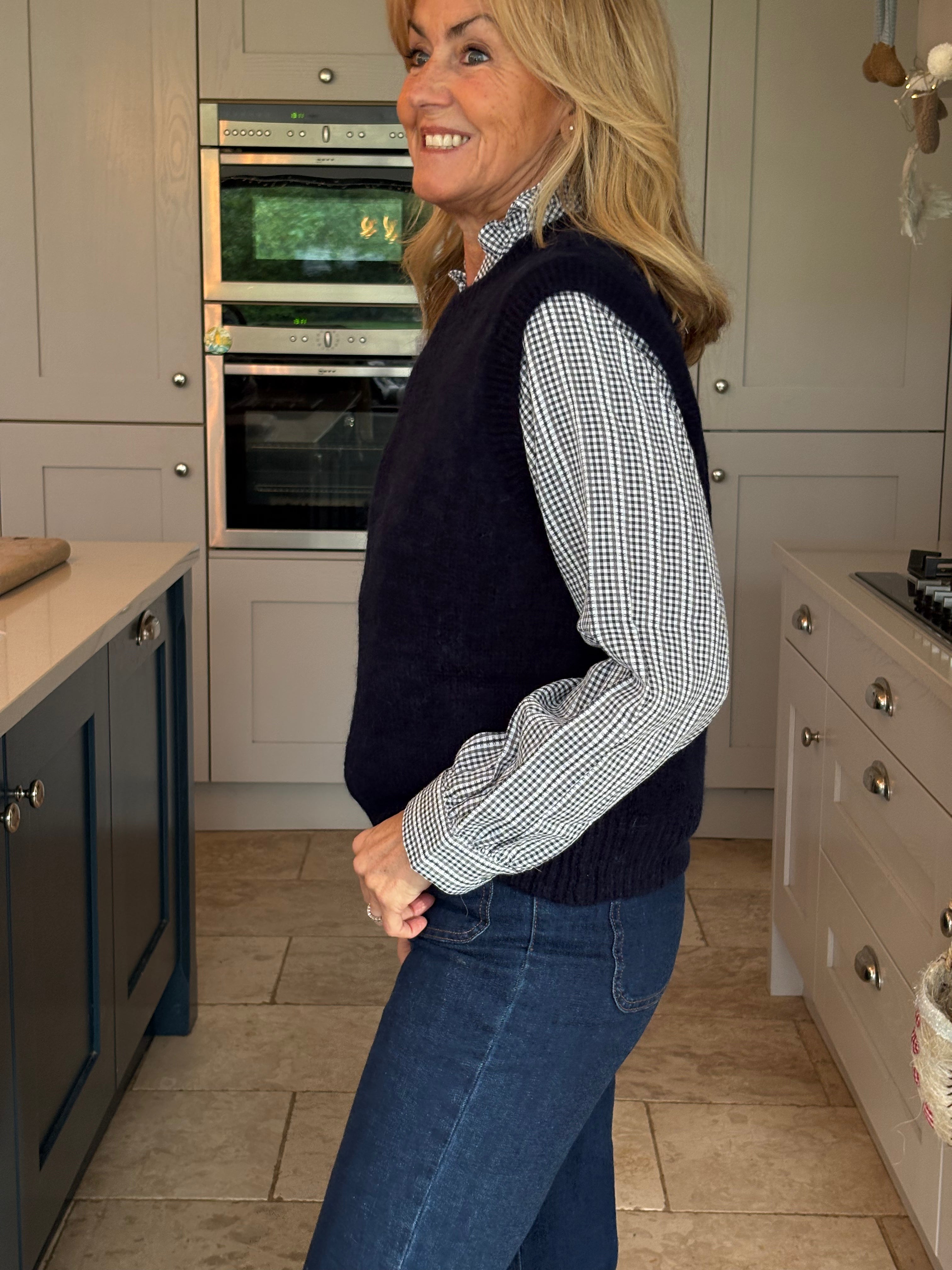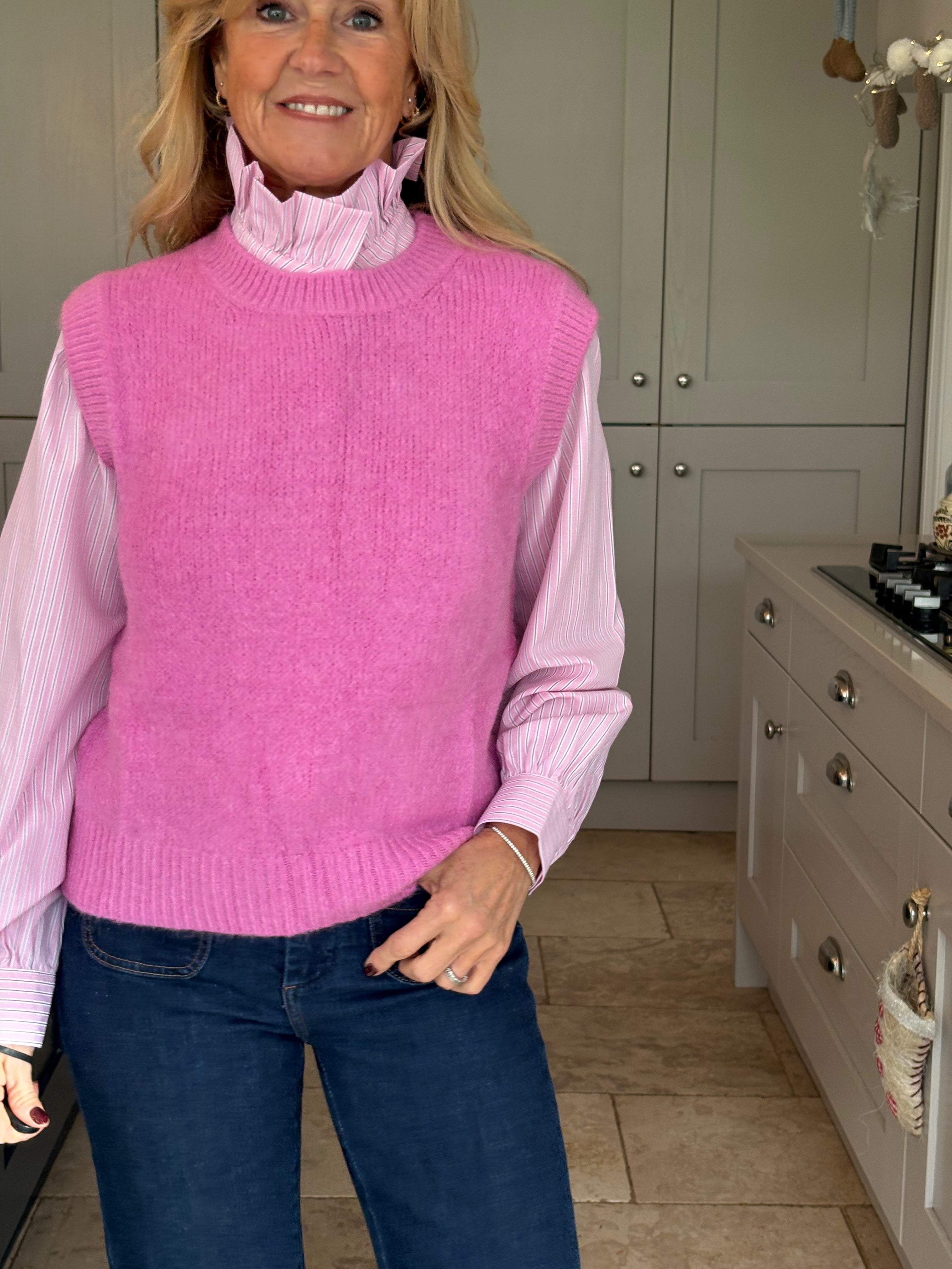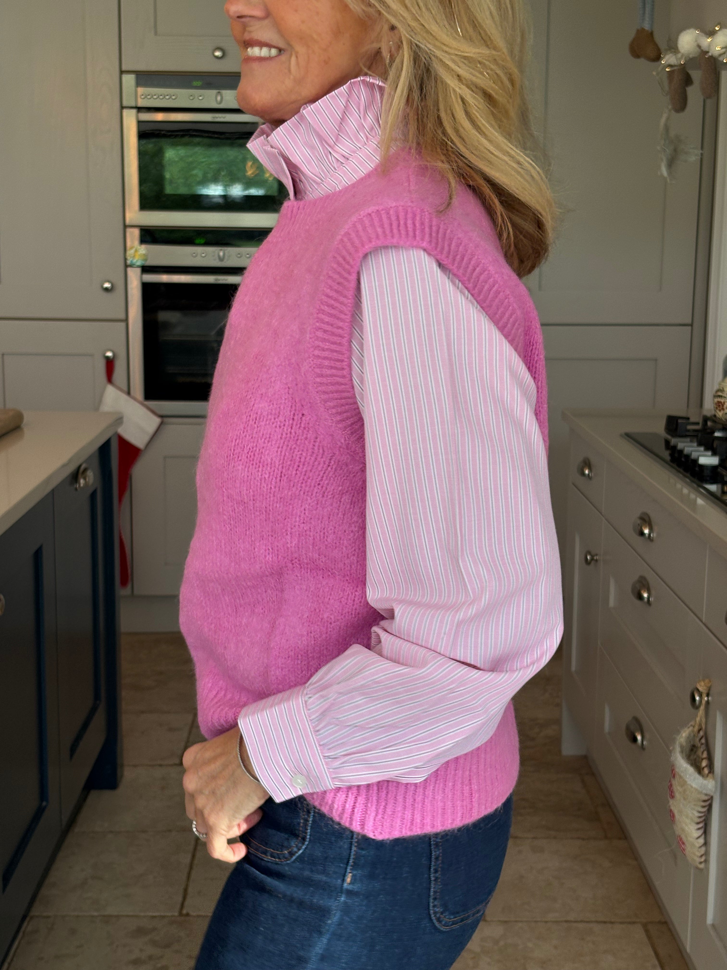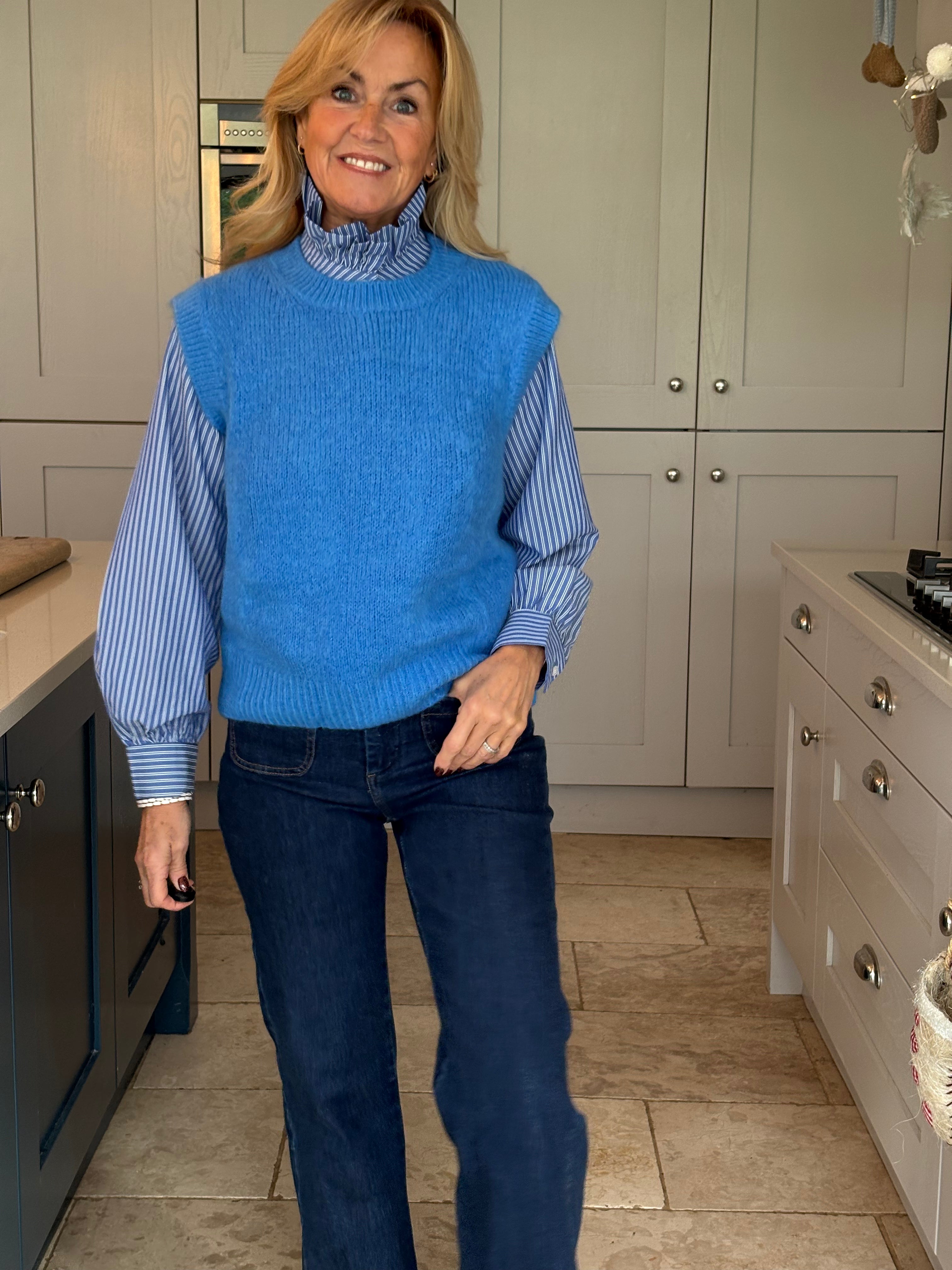 A really great fitting tank top made from acrylic, polyamide, alpaca, wool and elastane. Soft and comfortable with a ribbed crew neckline, ribbed arm holes and a ribbed hemline. The Kate is not too long and baggy which makes it ideal to wear on it's own, on top of a dress or with a shirt. In 3 fabulous colours, navy, pink and royal blue.