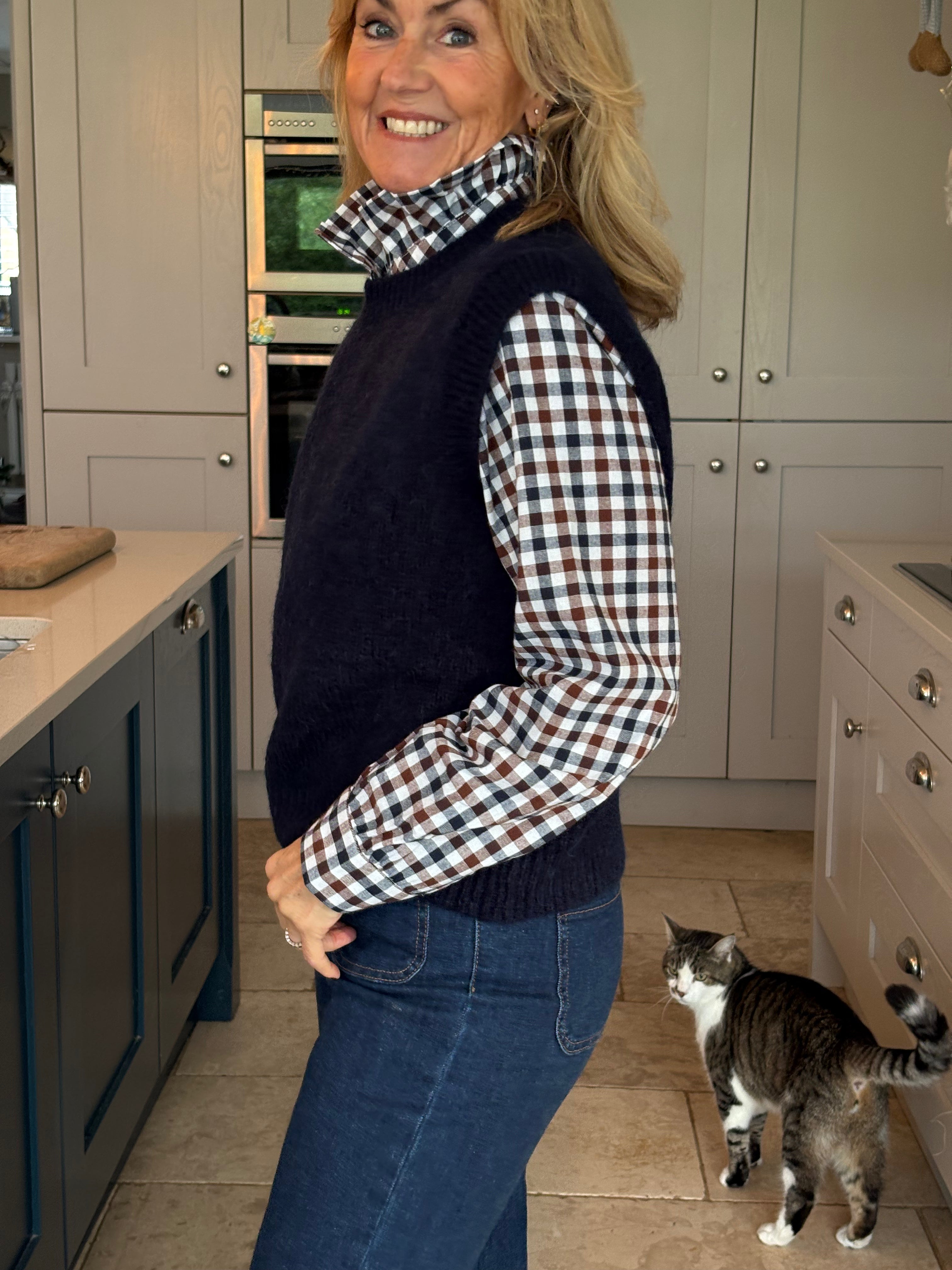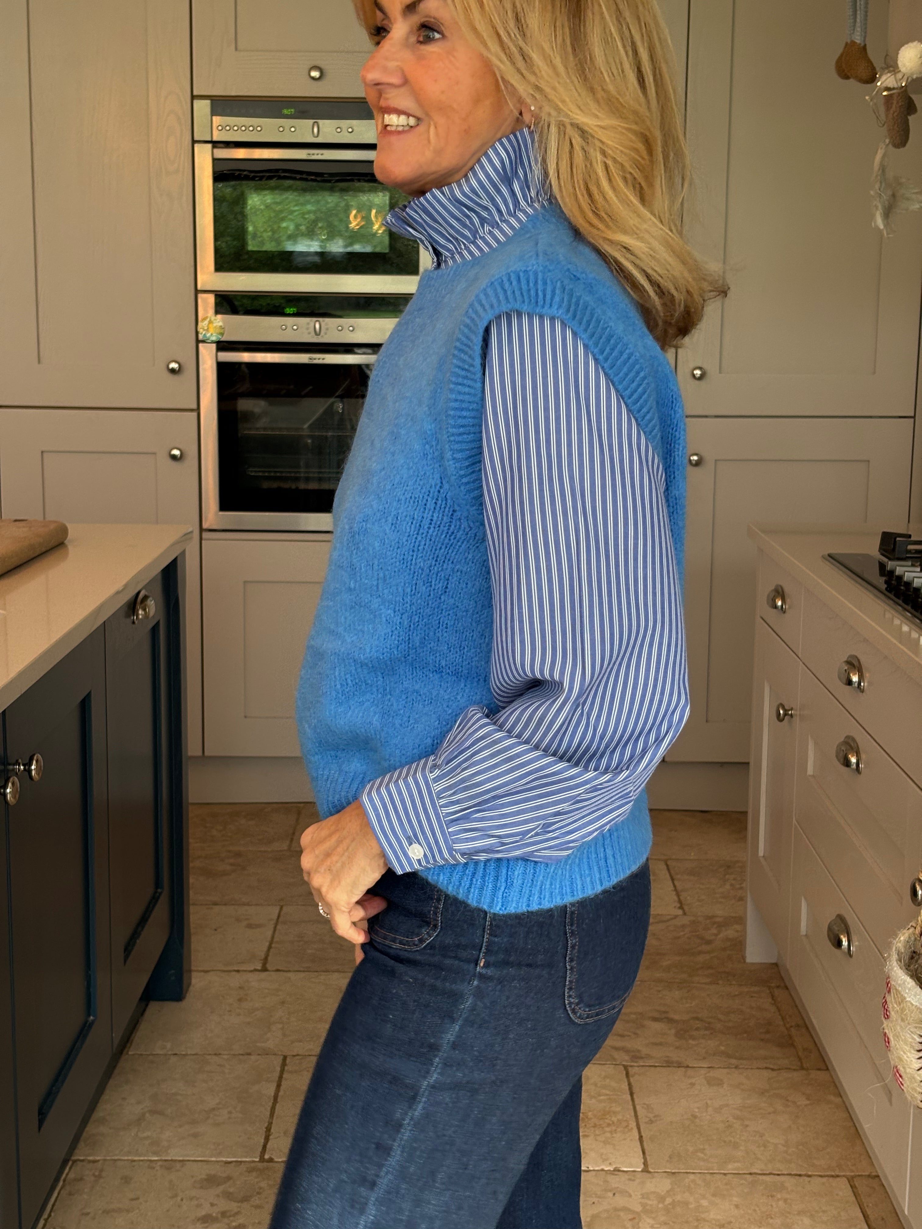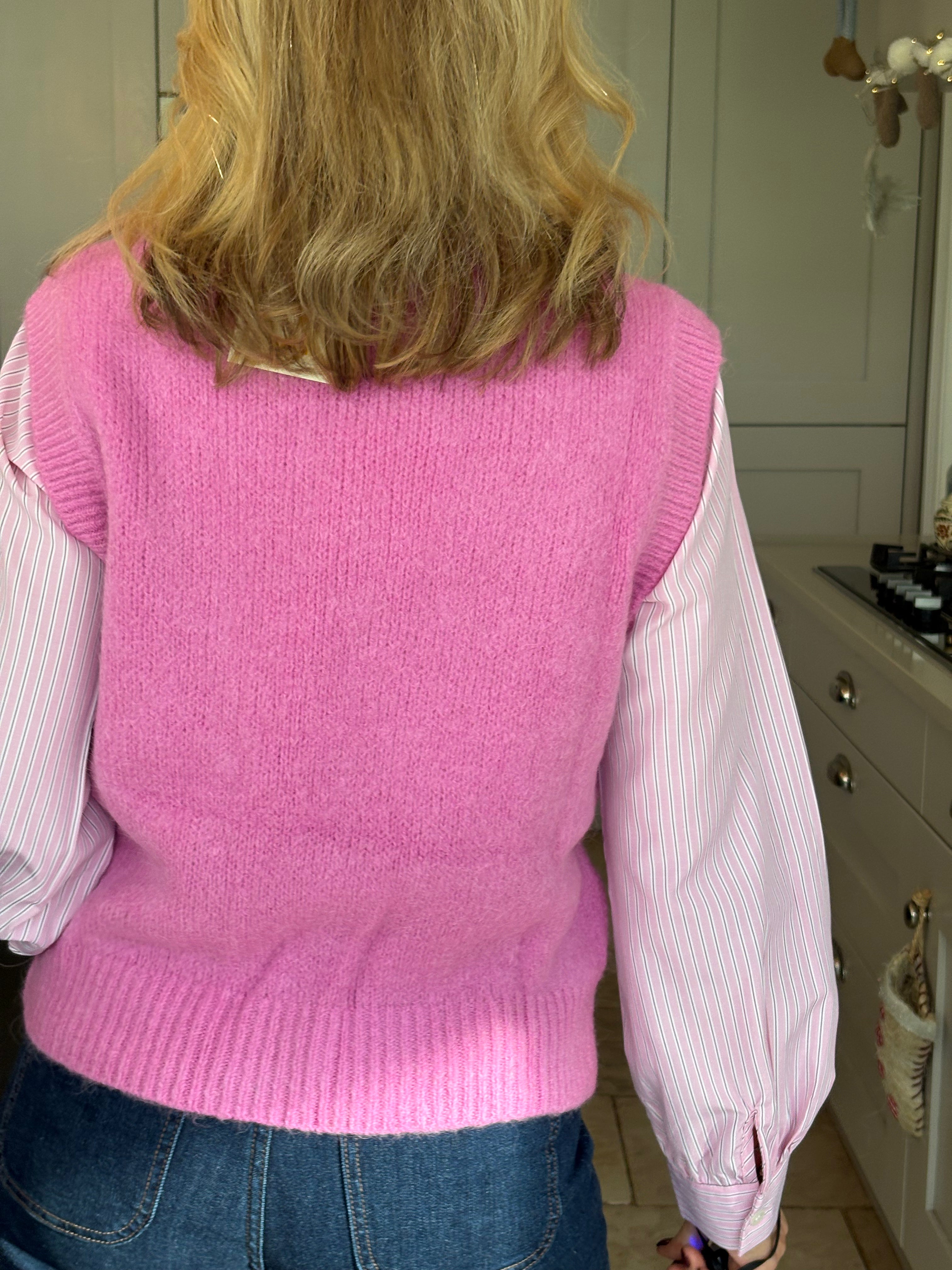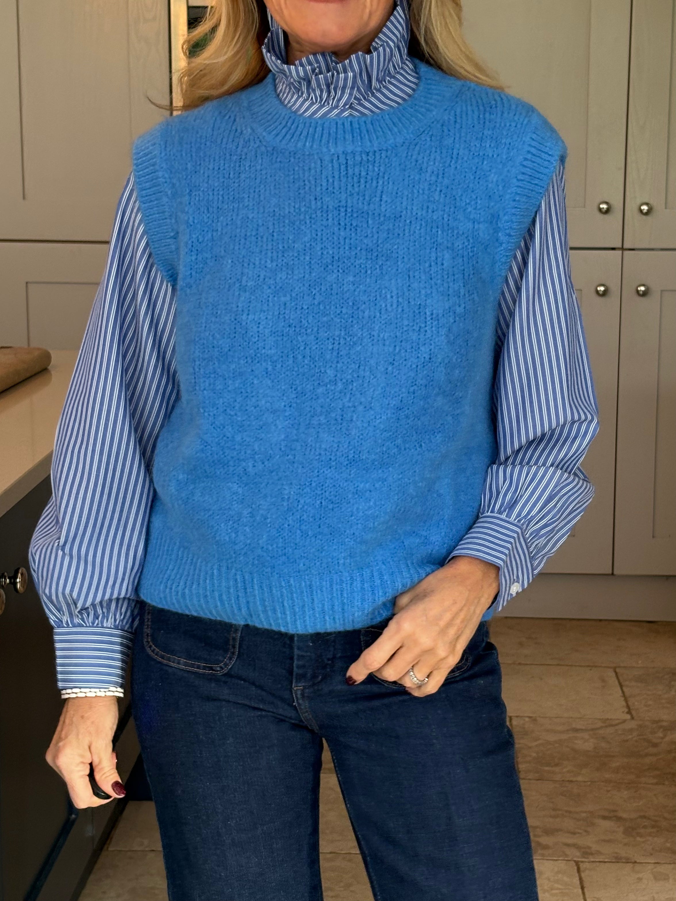 A really great fitting tank top made from acrylic, polyamide, alpaca, wool and elastane. Soft and comfortable with a ribbed crew neckline, ribbed arm holes and a ribbed hemline. The Kate is not too long and baggy which makes it ideal to wear on it's own, on top of a dress or with a shirt. In 3 fabulous colours, navy, pink and royal blue.
