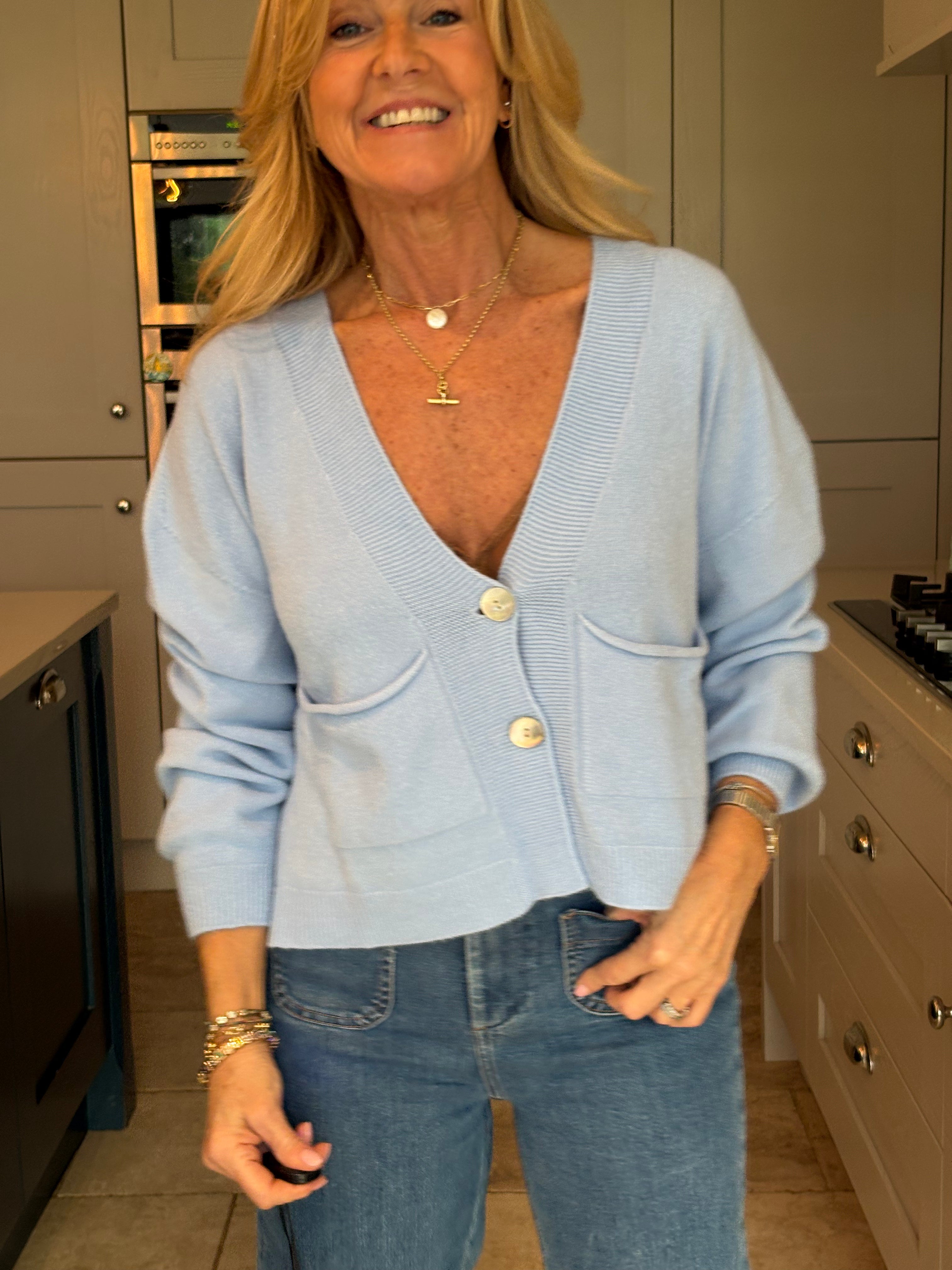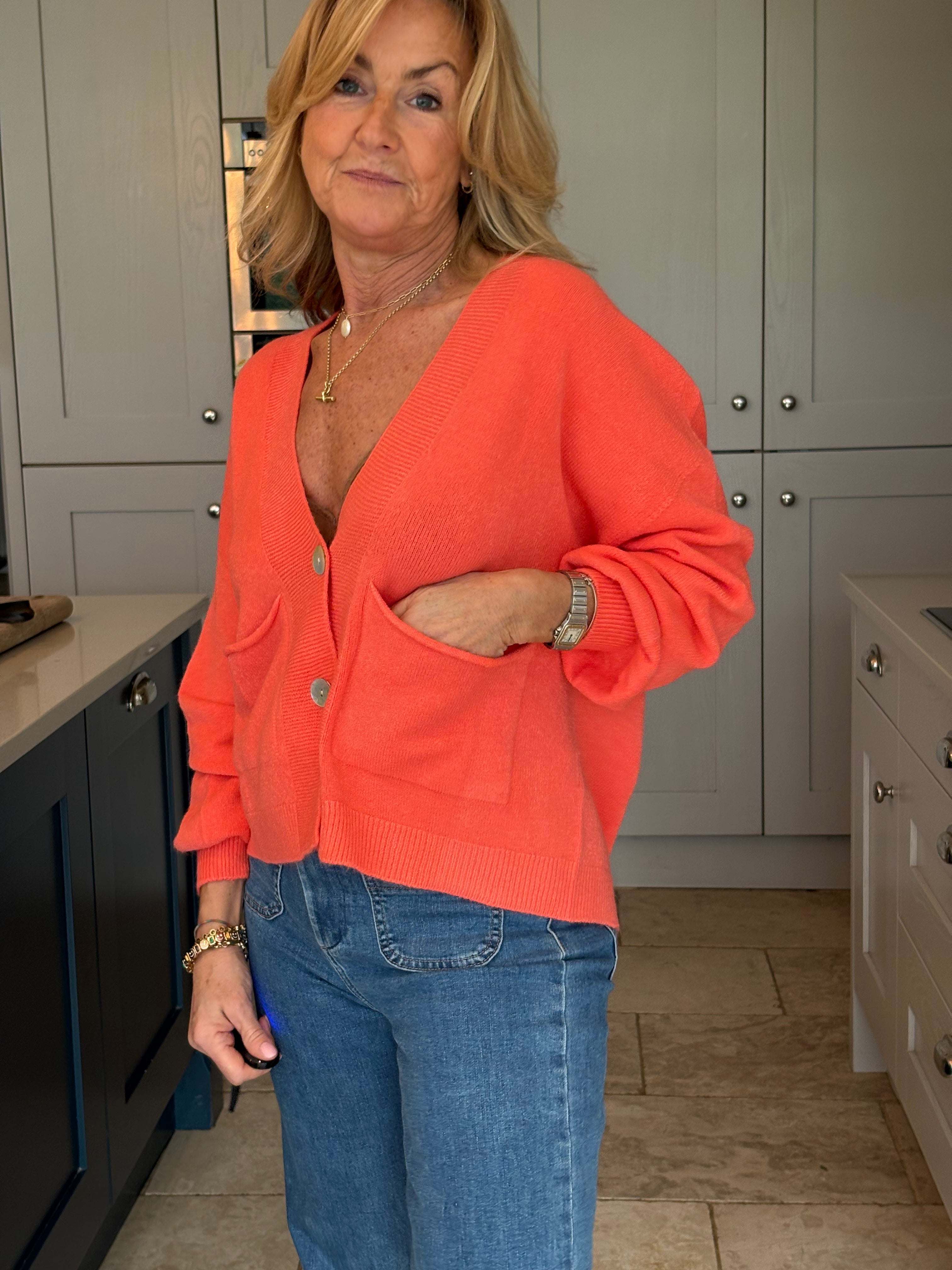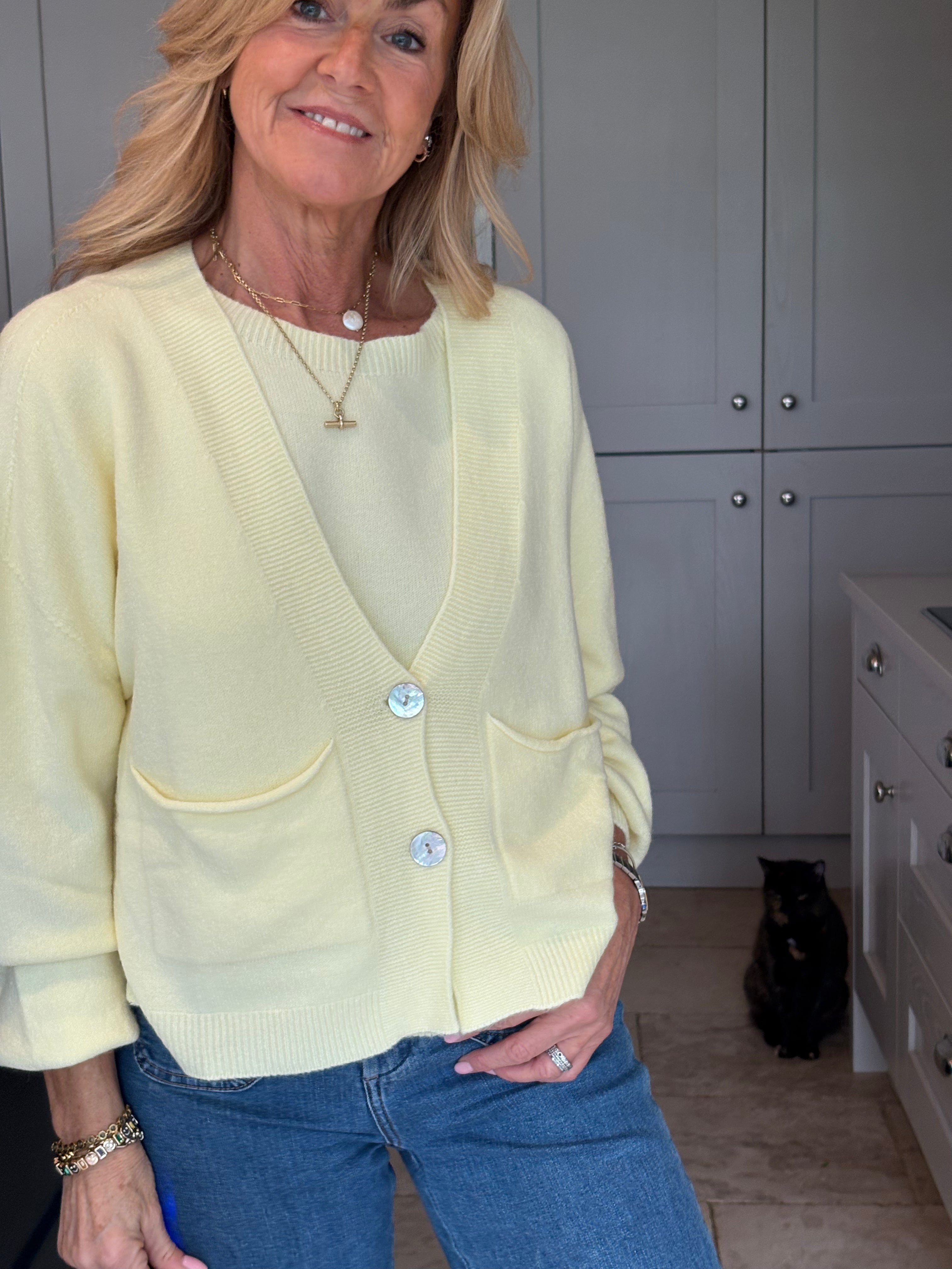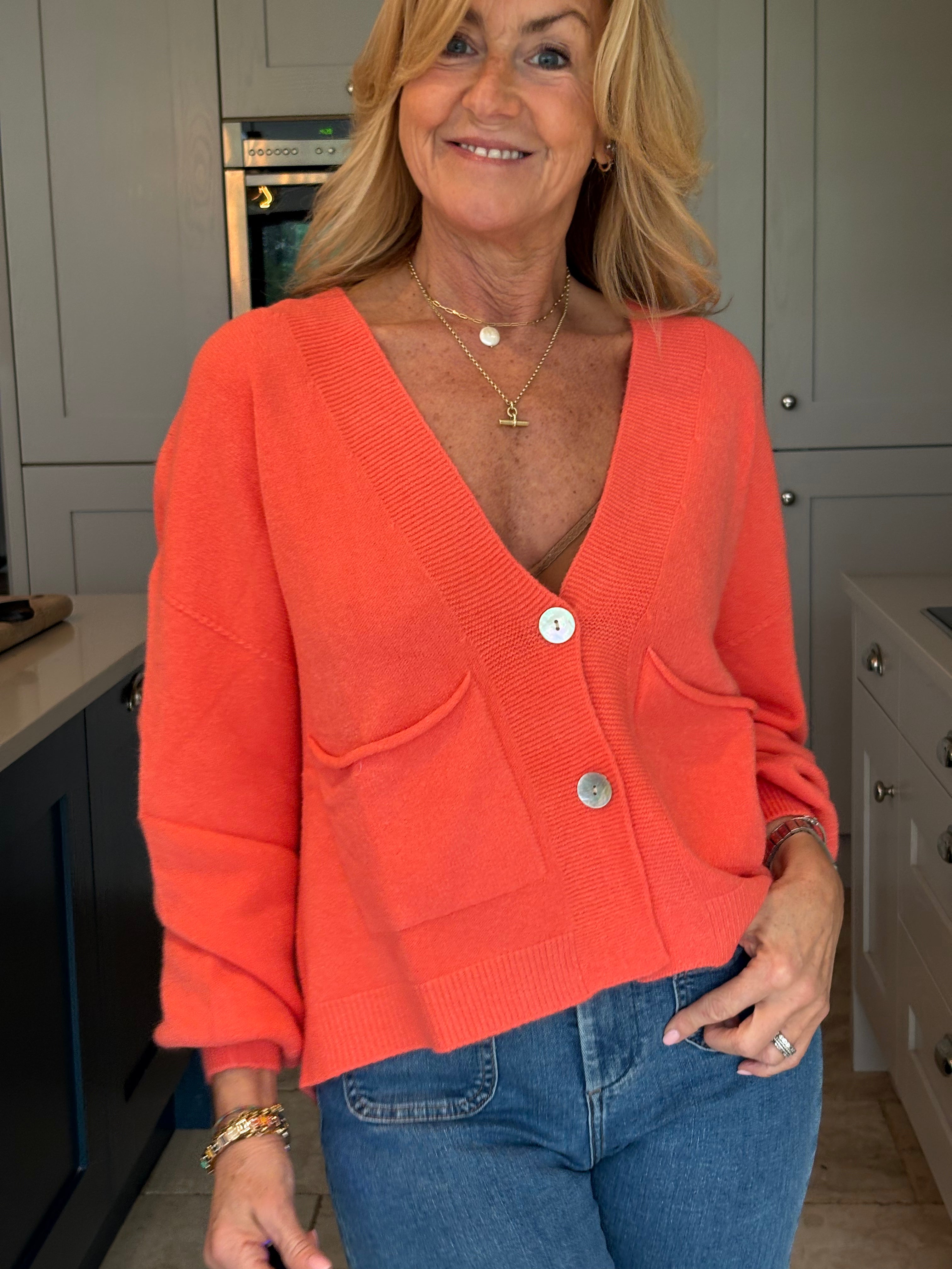 The Ornella is a beautifully soft to touch cardigan. Short and boxy in style with a deep rib trimmed neckline and two front pockets. The Ornella does not contain any wool. Made in Italy from viscose, polyester and polyamide. It is a one size cardigan and will fit a size 8 - 14.