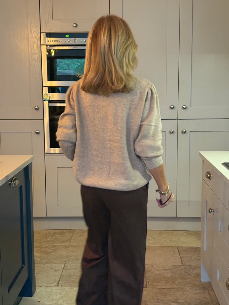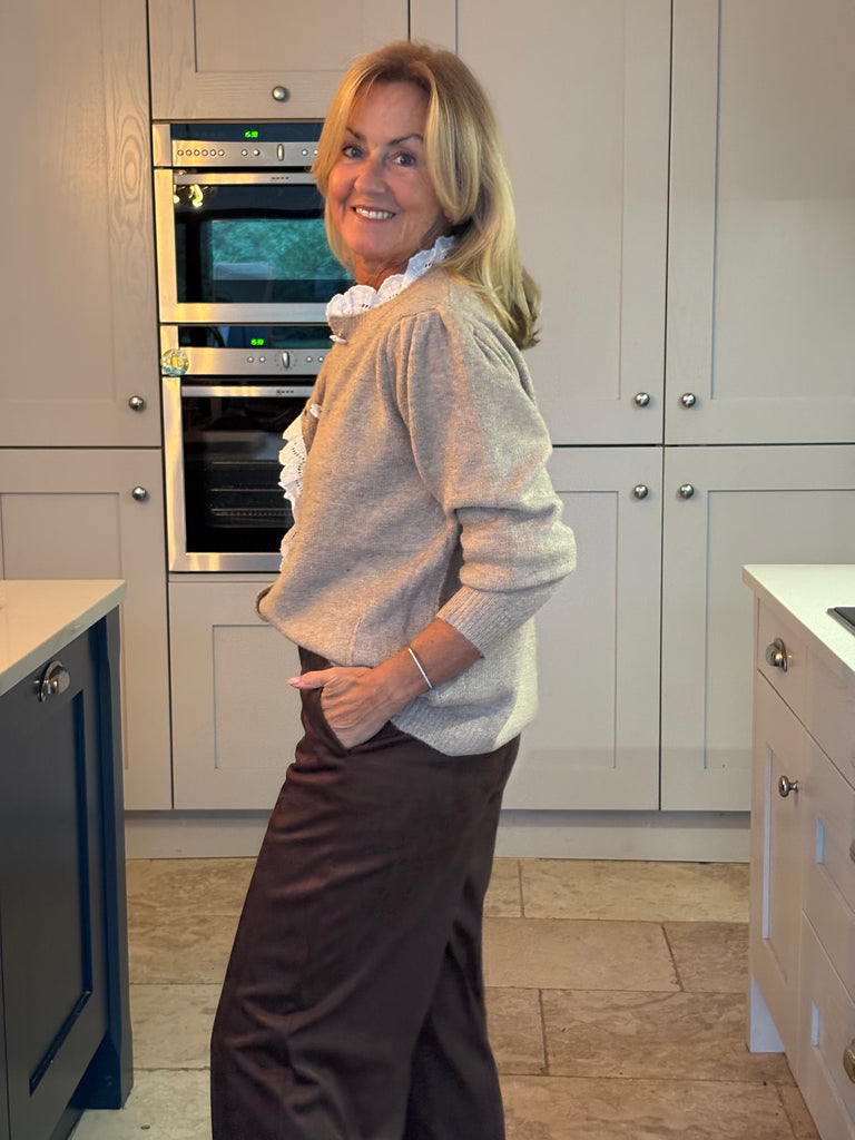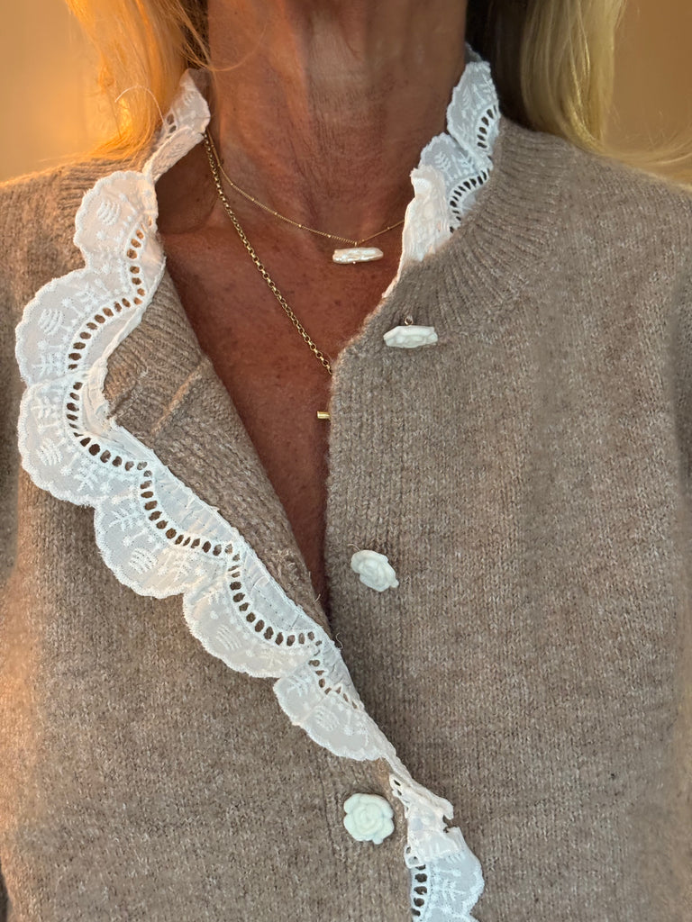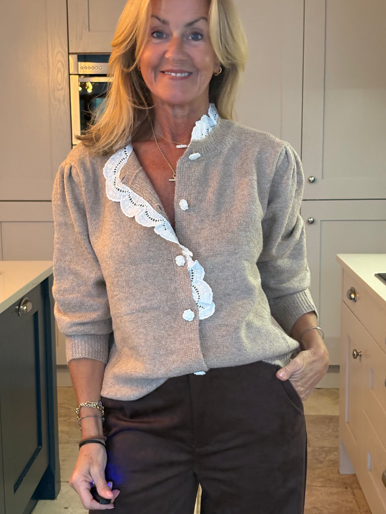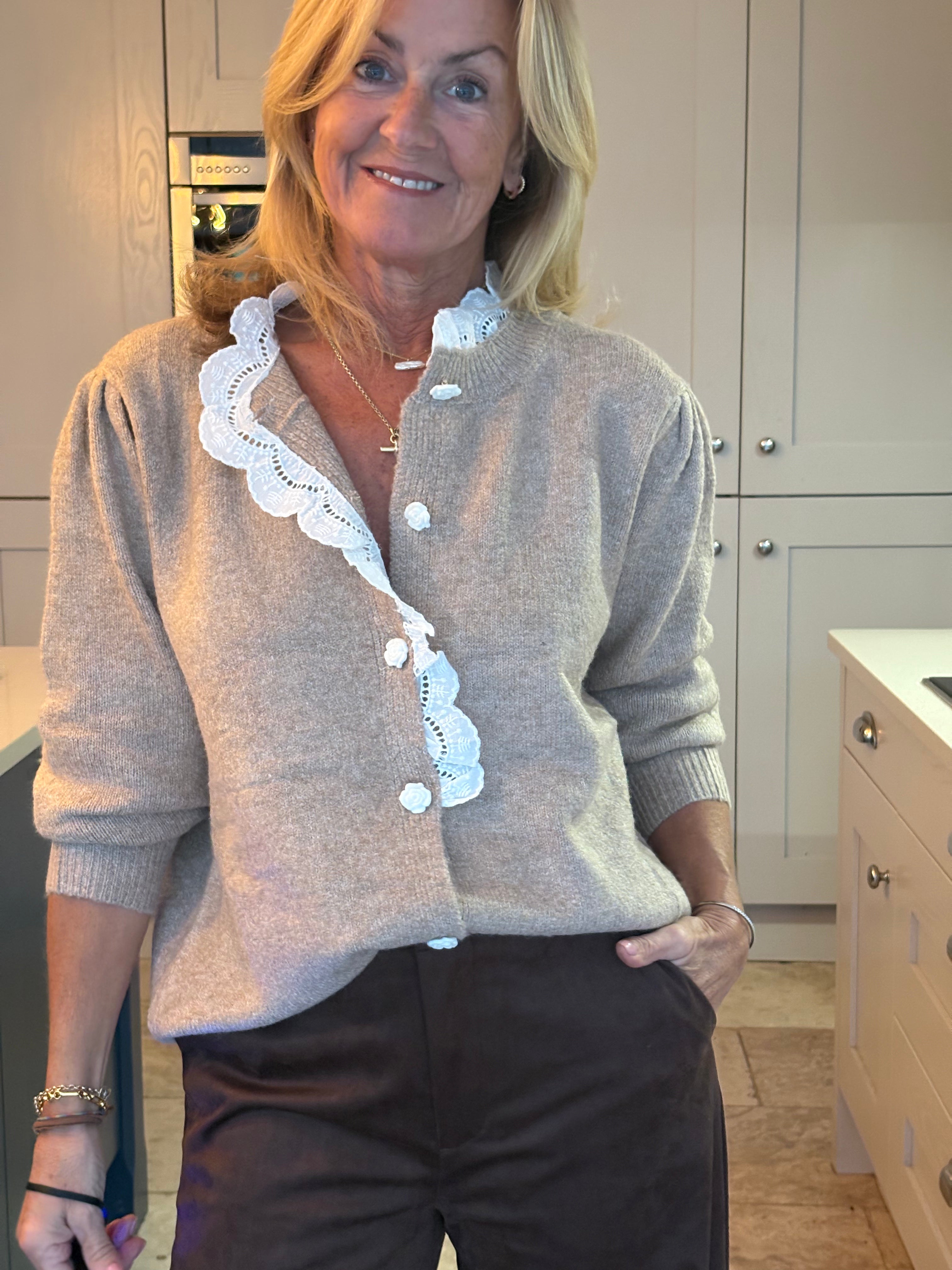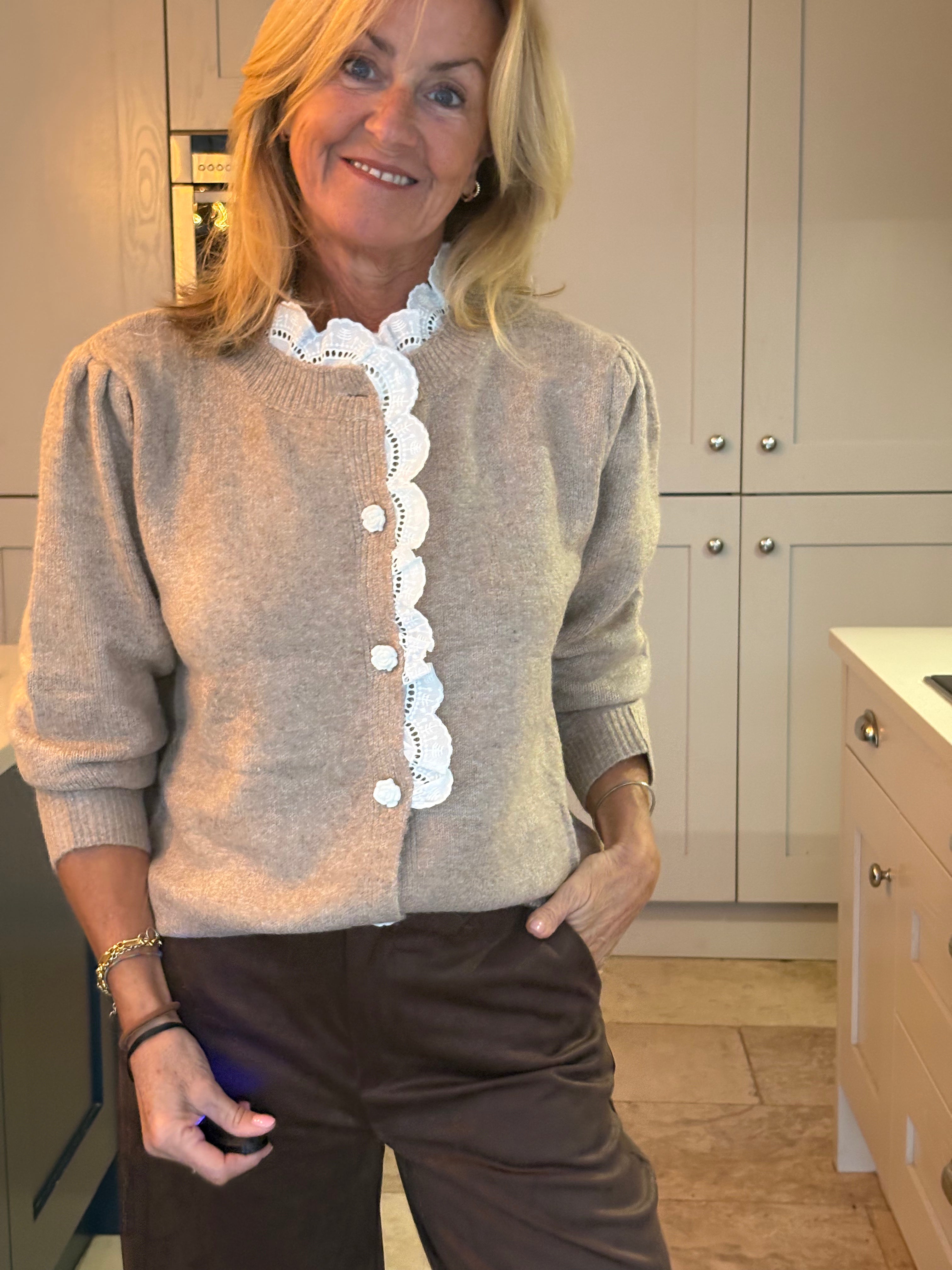 A beautiful light camel cardigan featuring softly gathered, puffed shoulders and a stunning white cotton frill that traces the collar and flows halfway down the front. Delicate white rose-shaped buttons complete the look, adding a playful, feminine touch. A perfect blend of elegance and charm.
