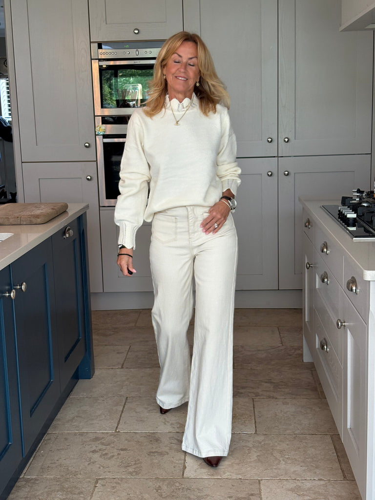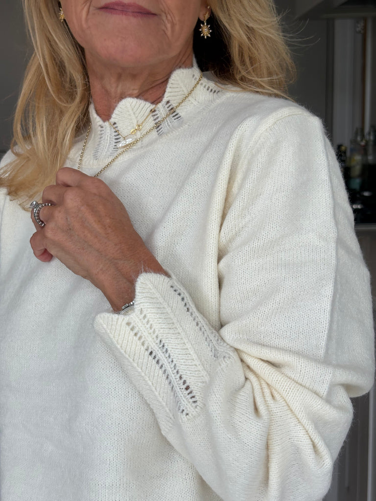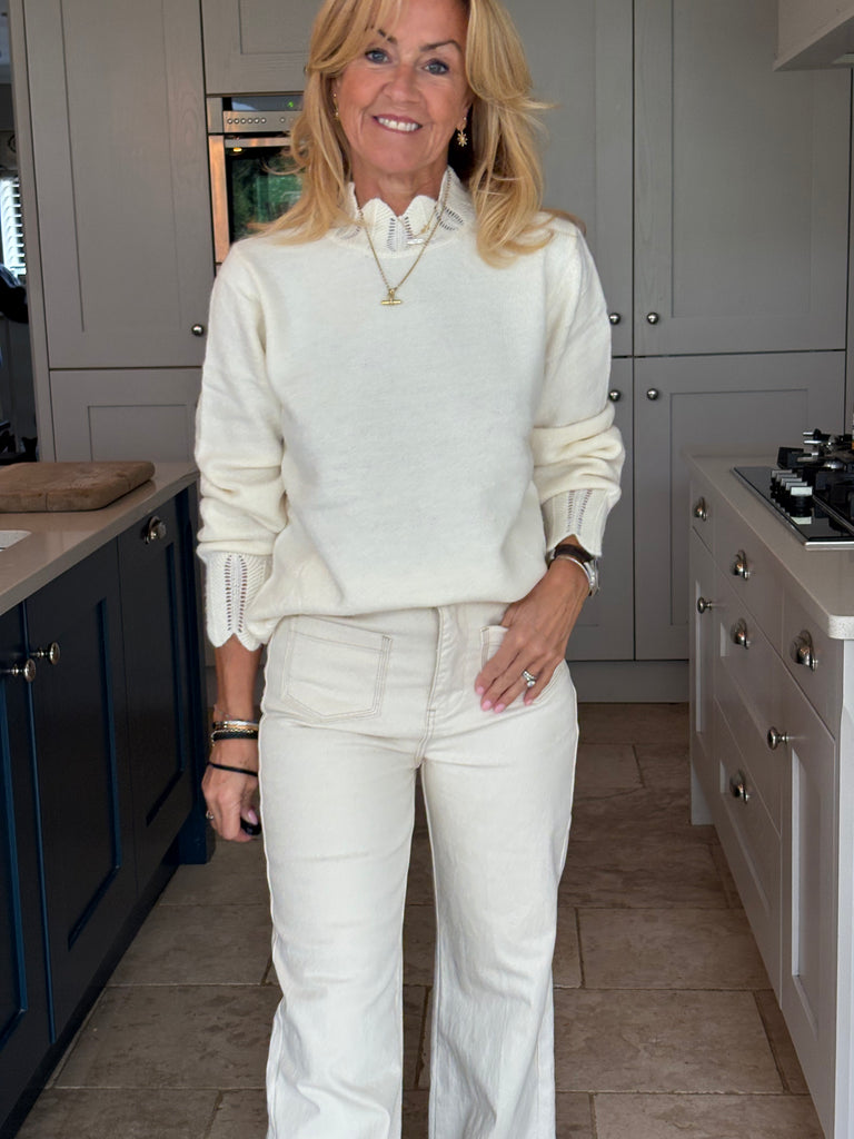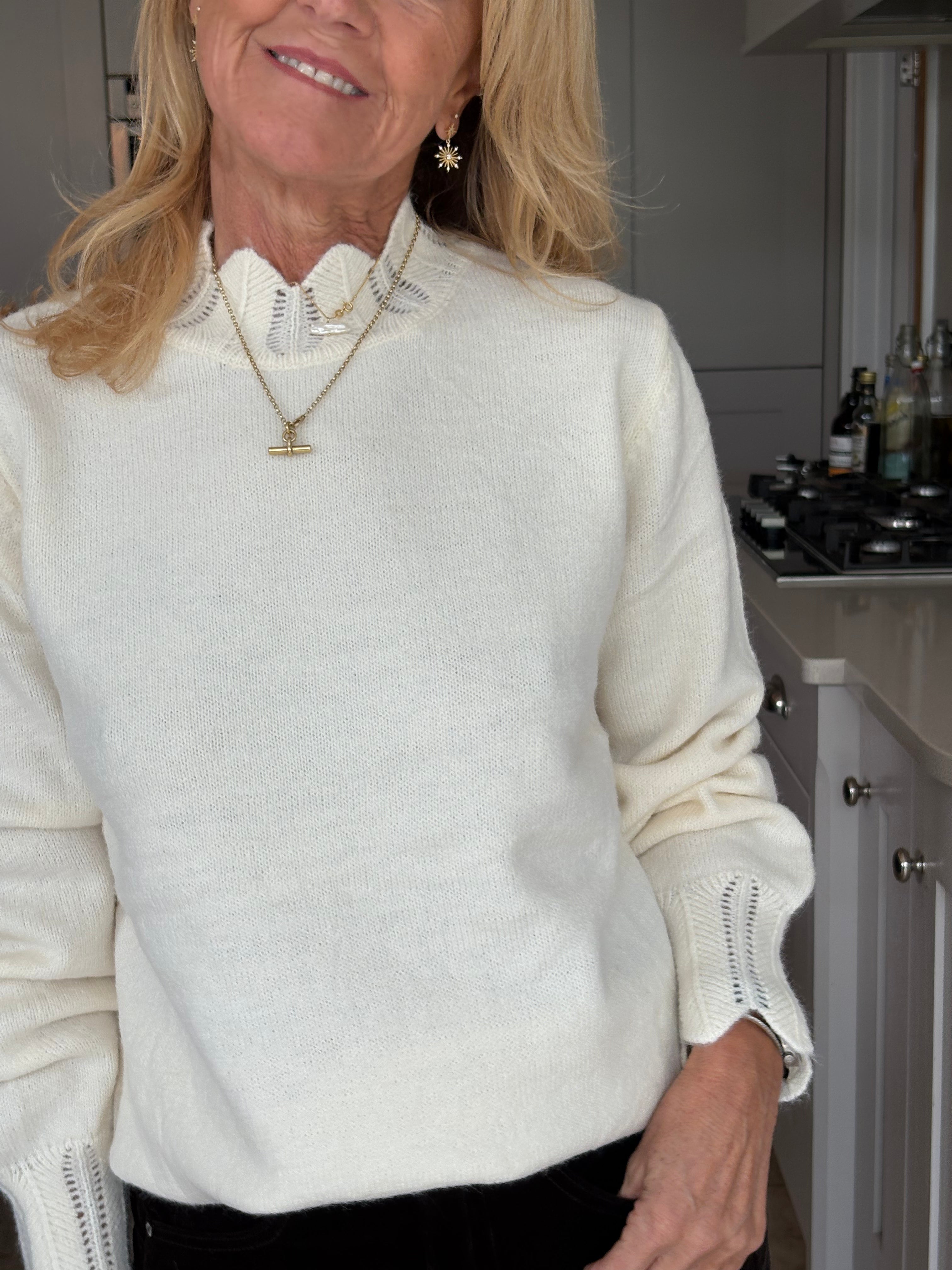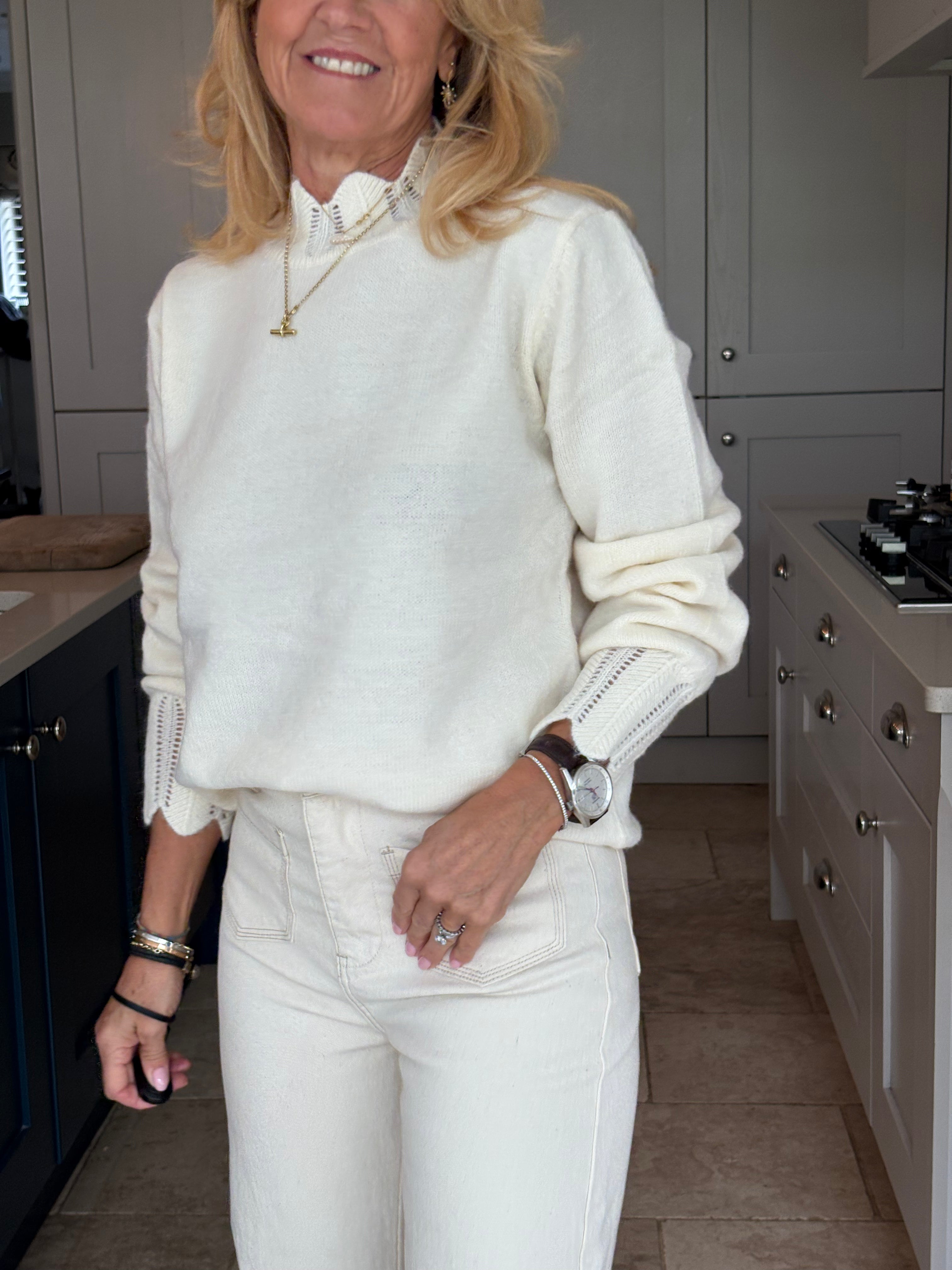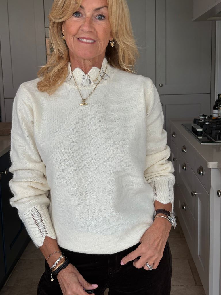 A stunning classic and elegant cream polo neck jumper with the polo neck and cuff in a knitted lace detail giving the jumper a really elegant edge.  This jumper is made from polyamide, polyester and acrylic making it really soft and kind against the skin.