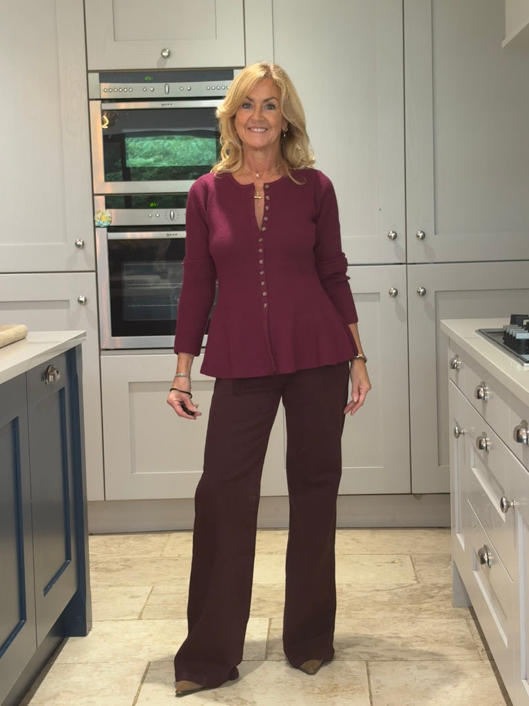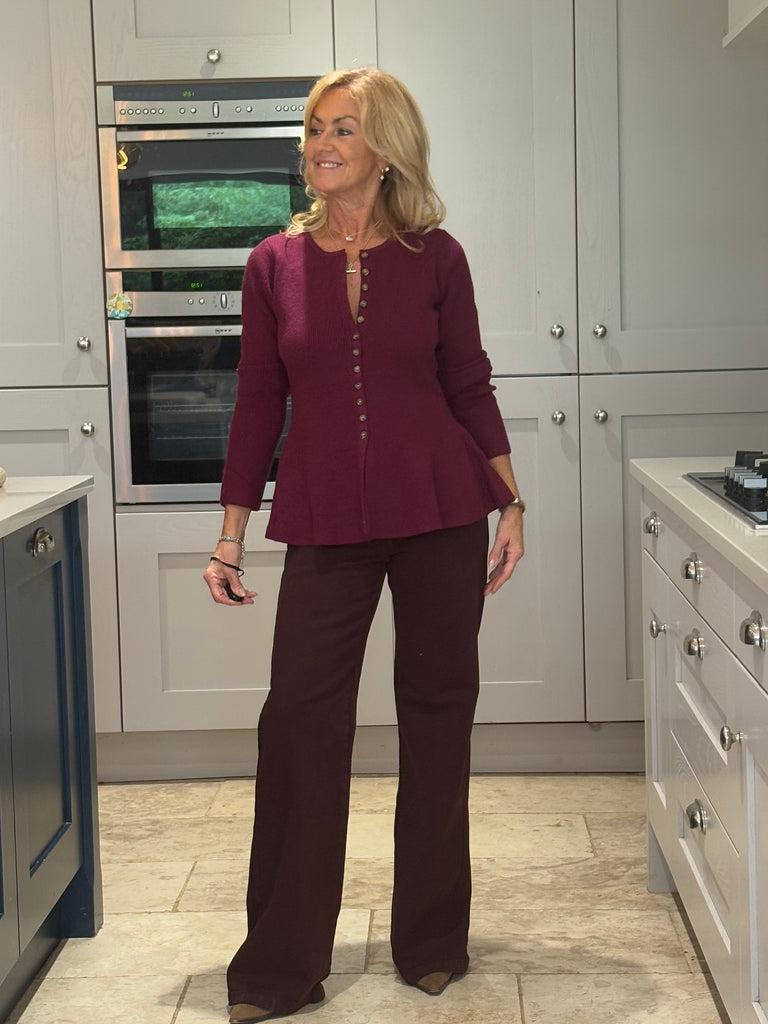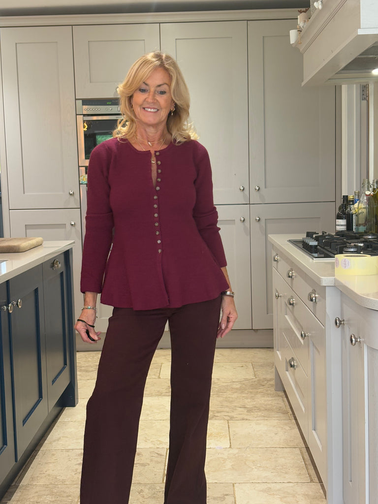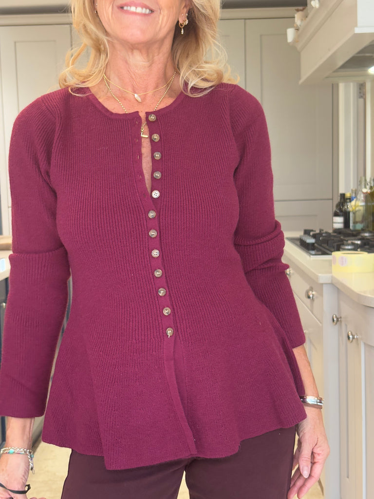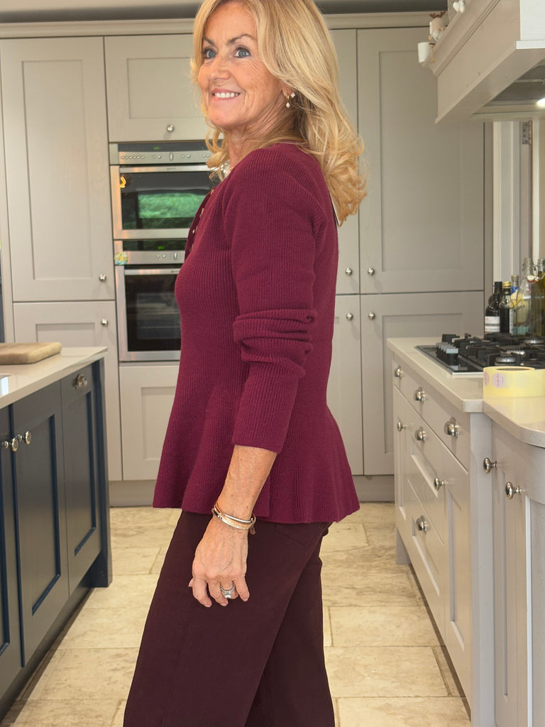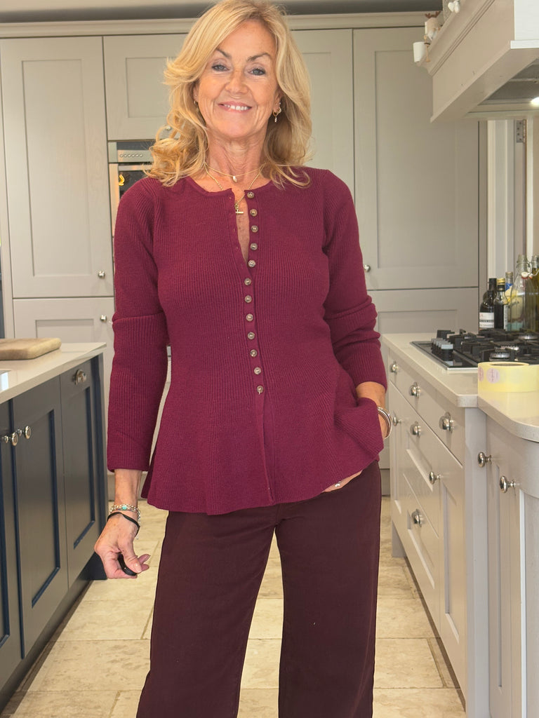A sophisticated knitted cardigan-jacket with a round neckline and button-down front. Designed with fine ribbing that gently cinches the waist before flaring into a subtle, skirt-like shape at the hips, creating an elegant, feminine silhouette. A beautifully structured piece that blends comfort with timeless style. Rich burgundy colour.