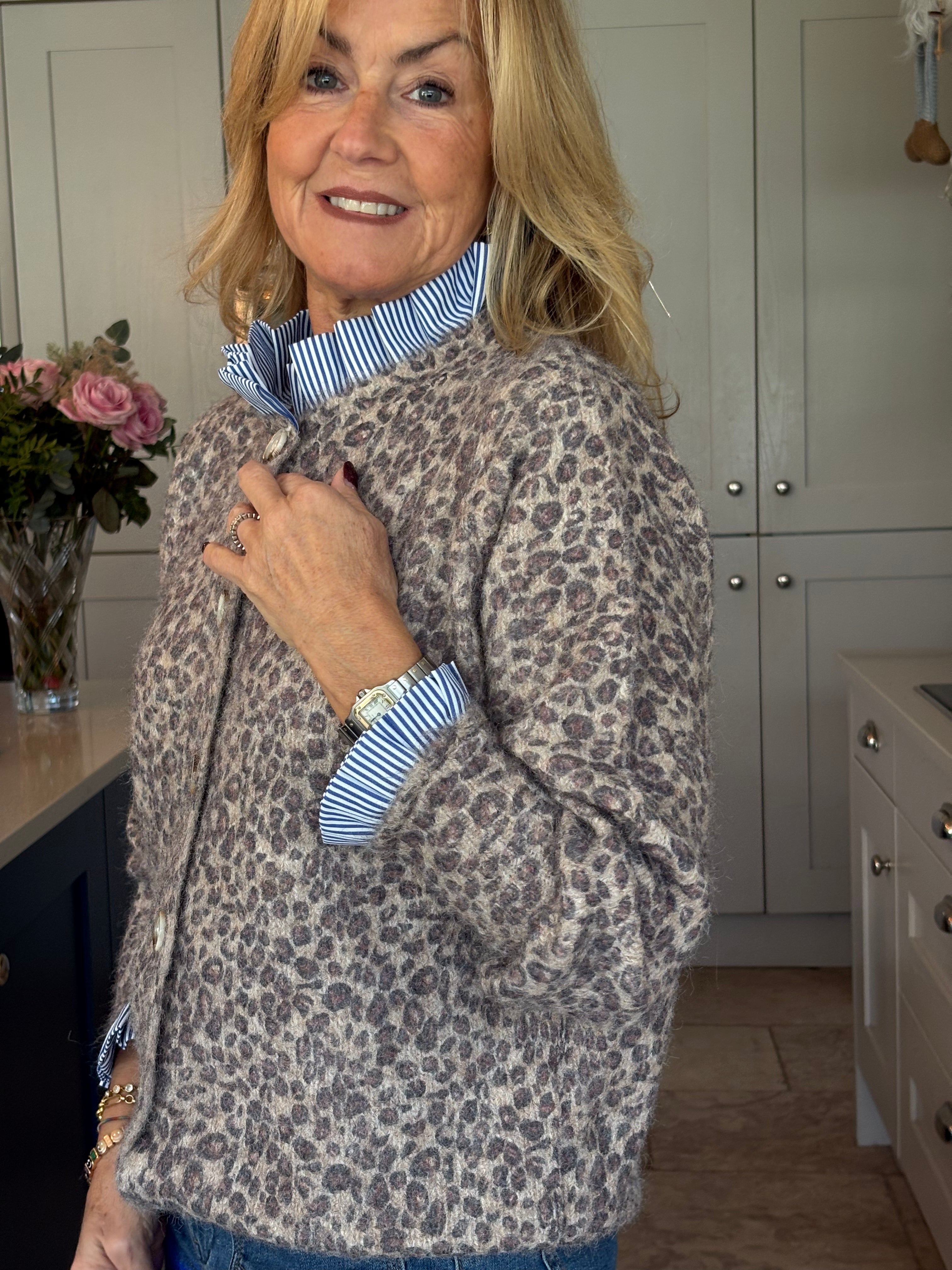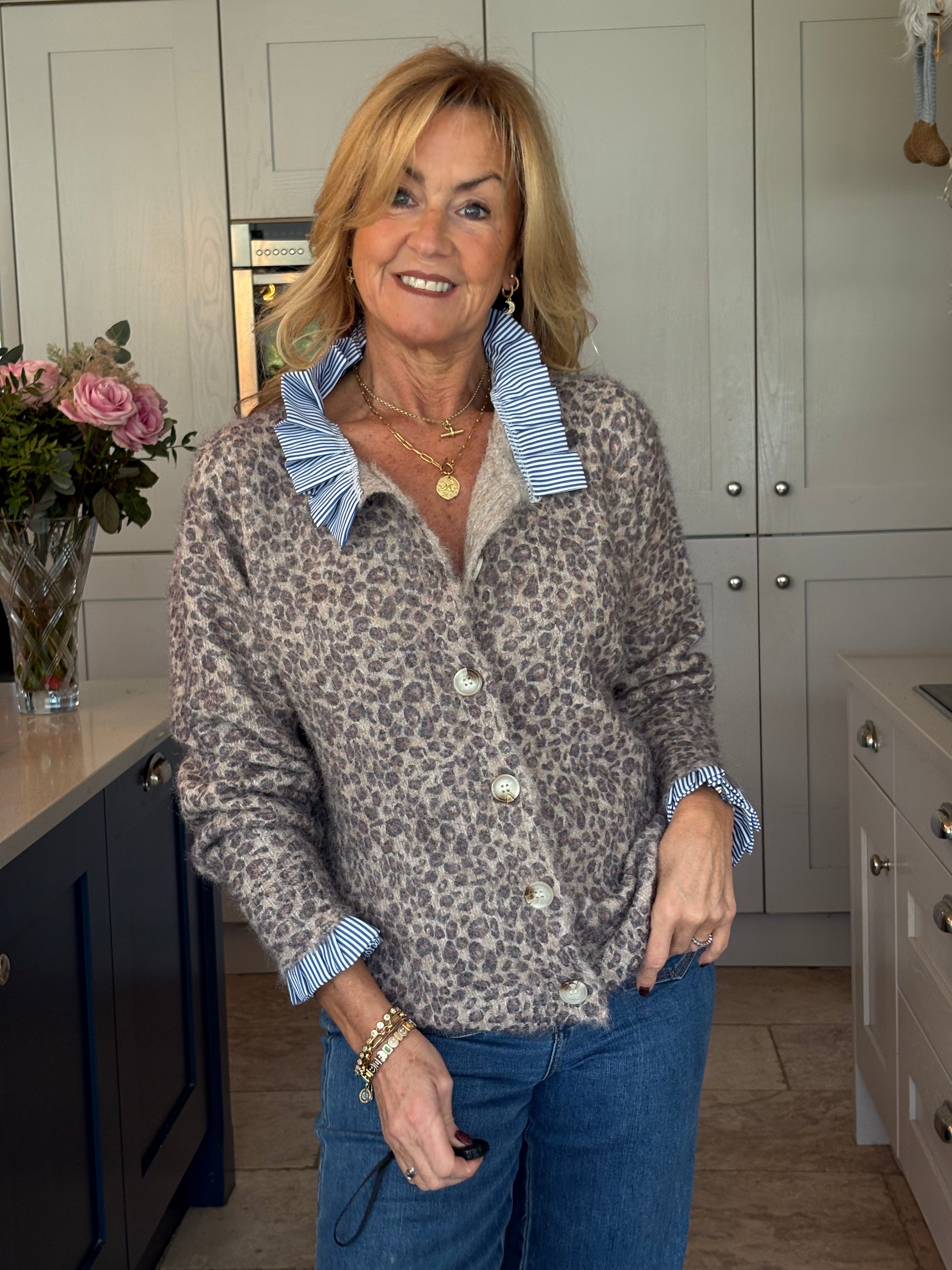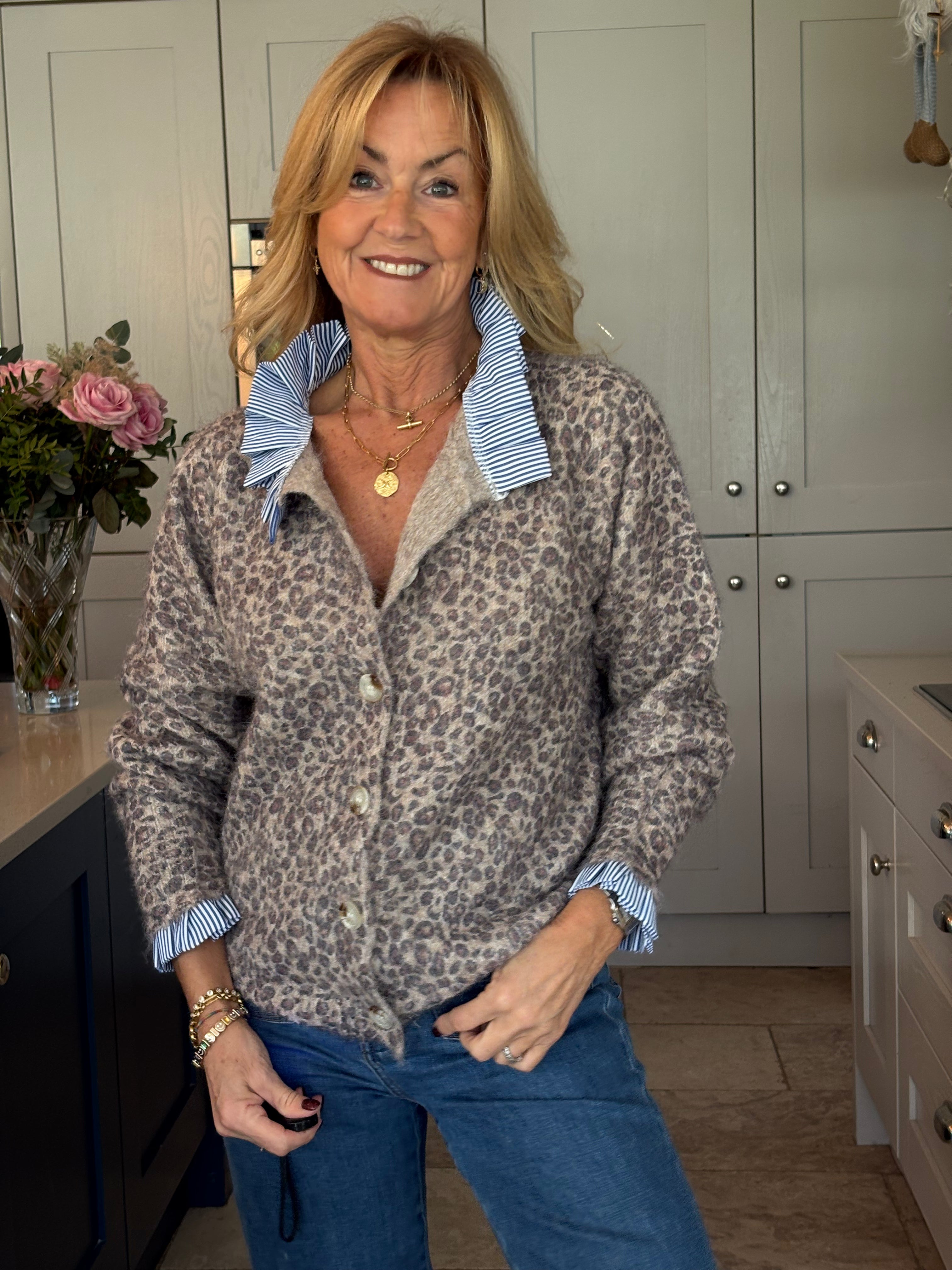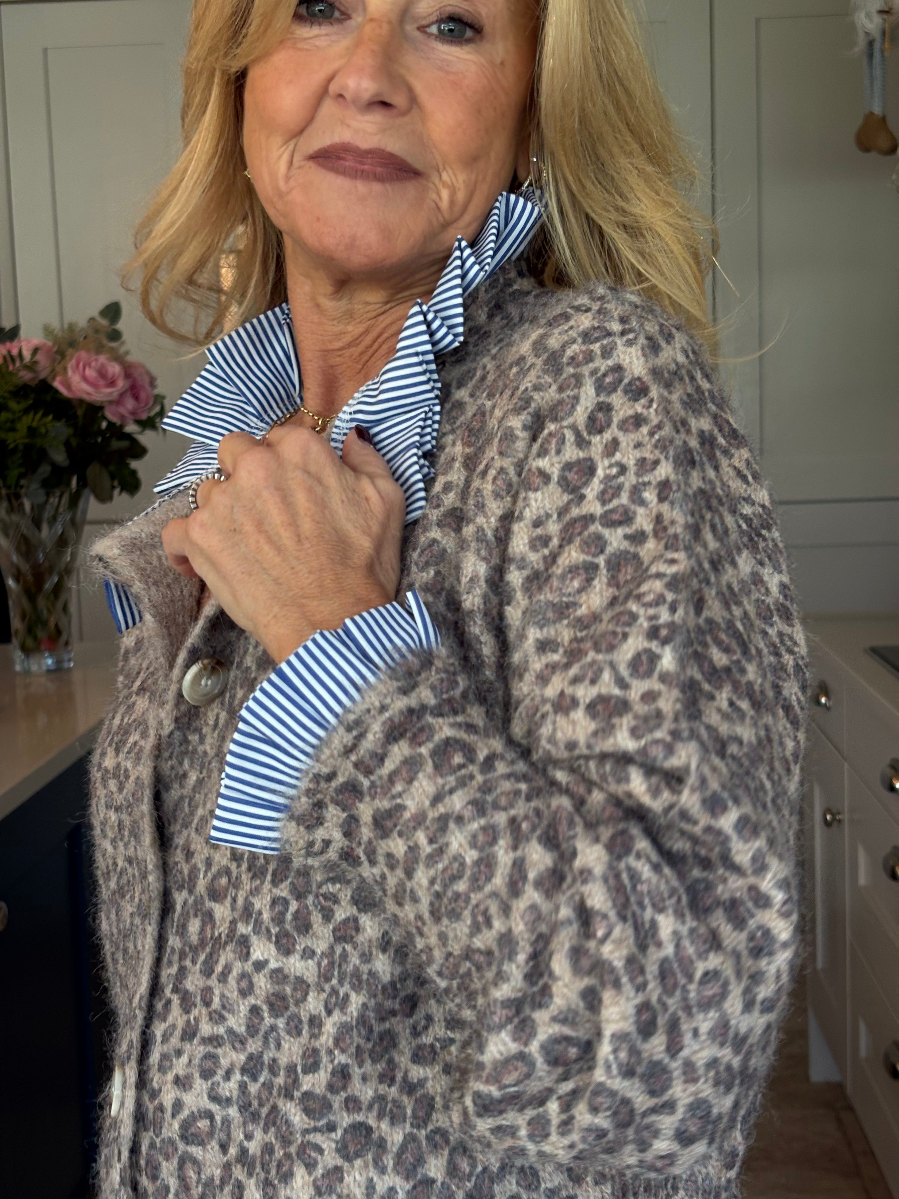 A really clever cardigan which looks like it has a high pleated collared shirt underneath but it is infact trimmed at the neckline and at the cuffs with a blue pin striped pleated collar and cuffs. The leopard print body of the cardigan is soft and fluffy and loosely fitted. The sleeves have a long tight cuff adding to the elegant detail on this cardigan. The Winnie is a one size item.