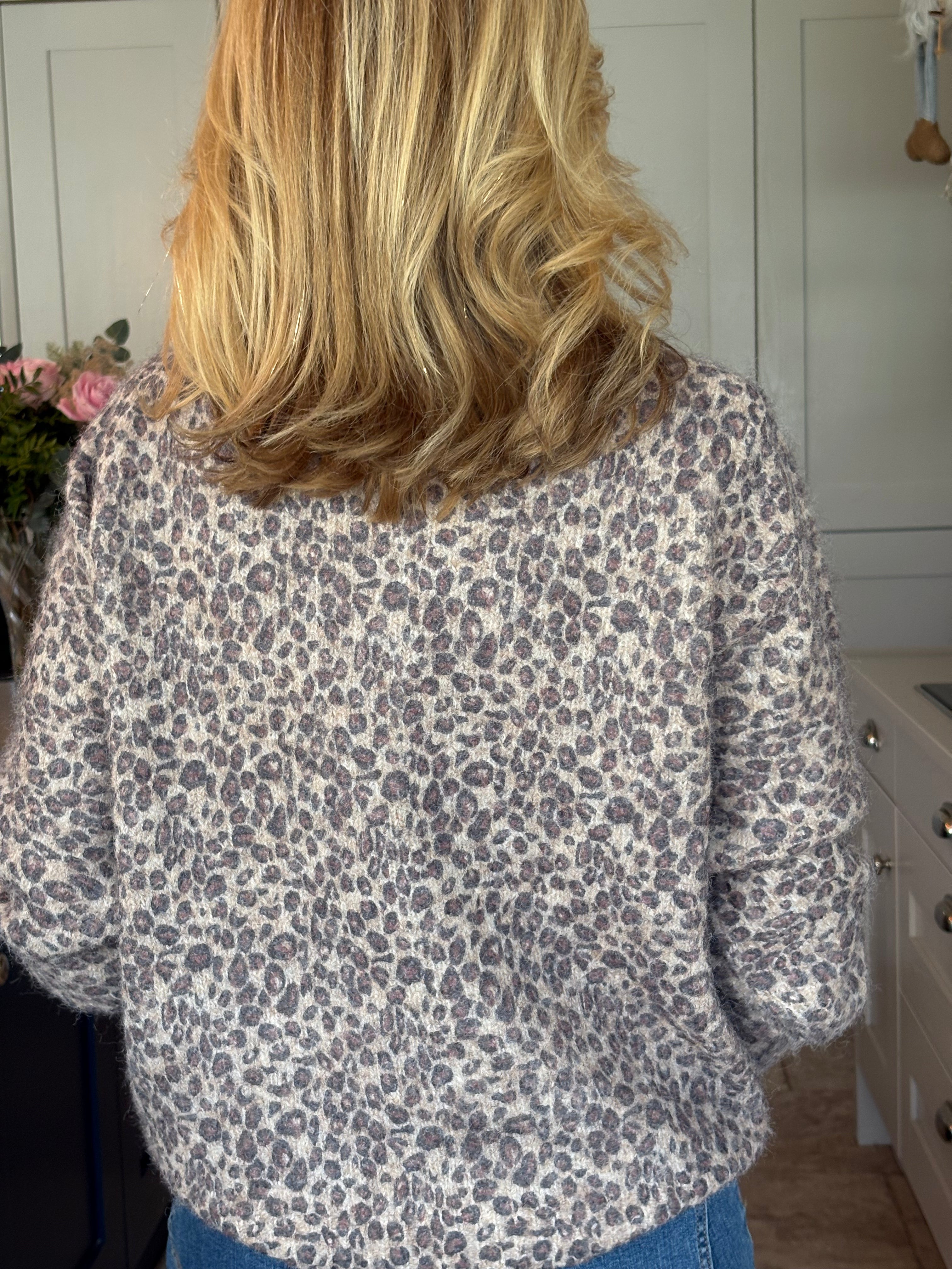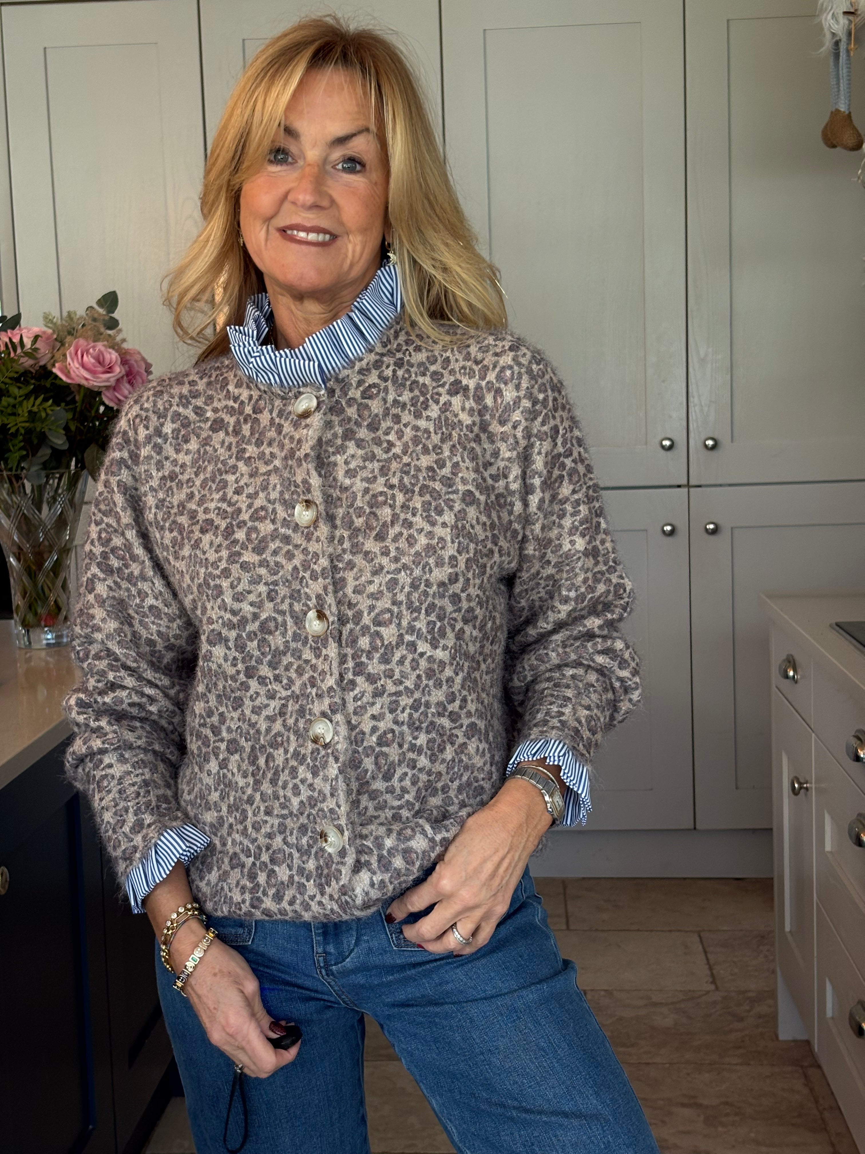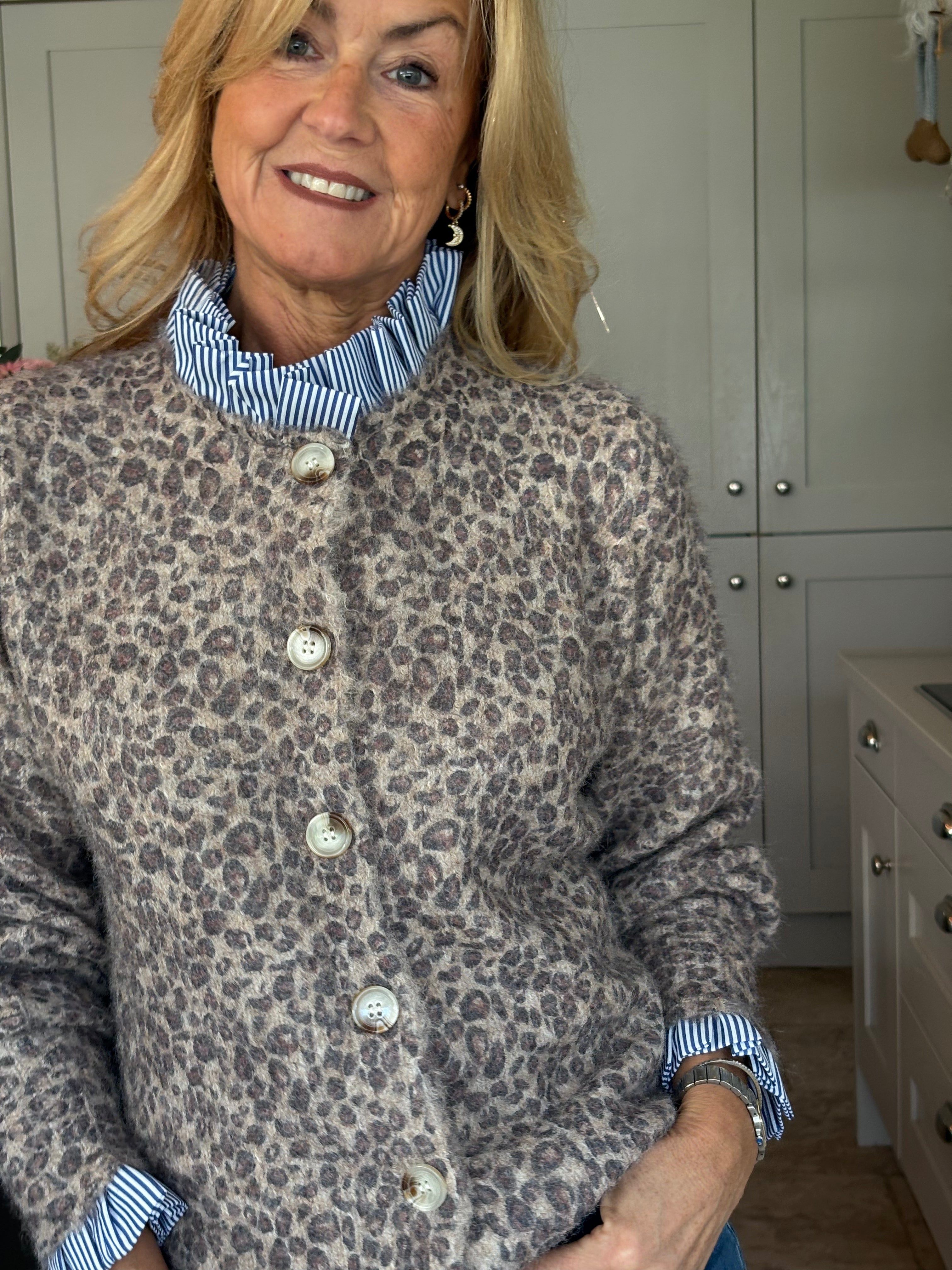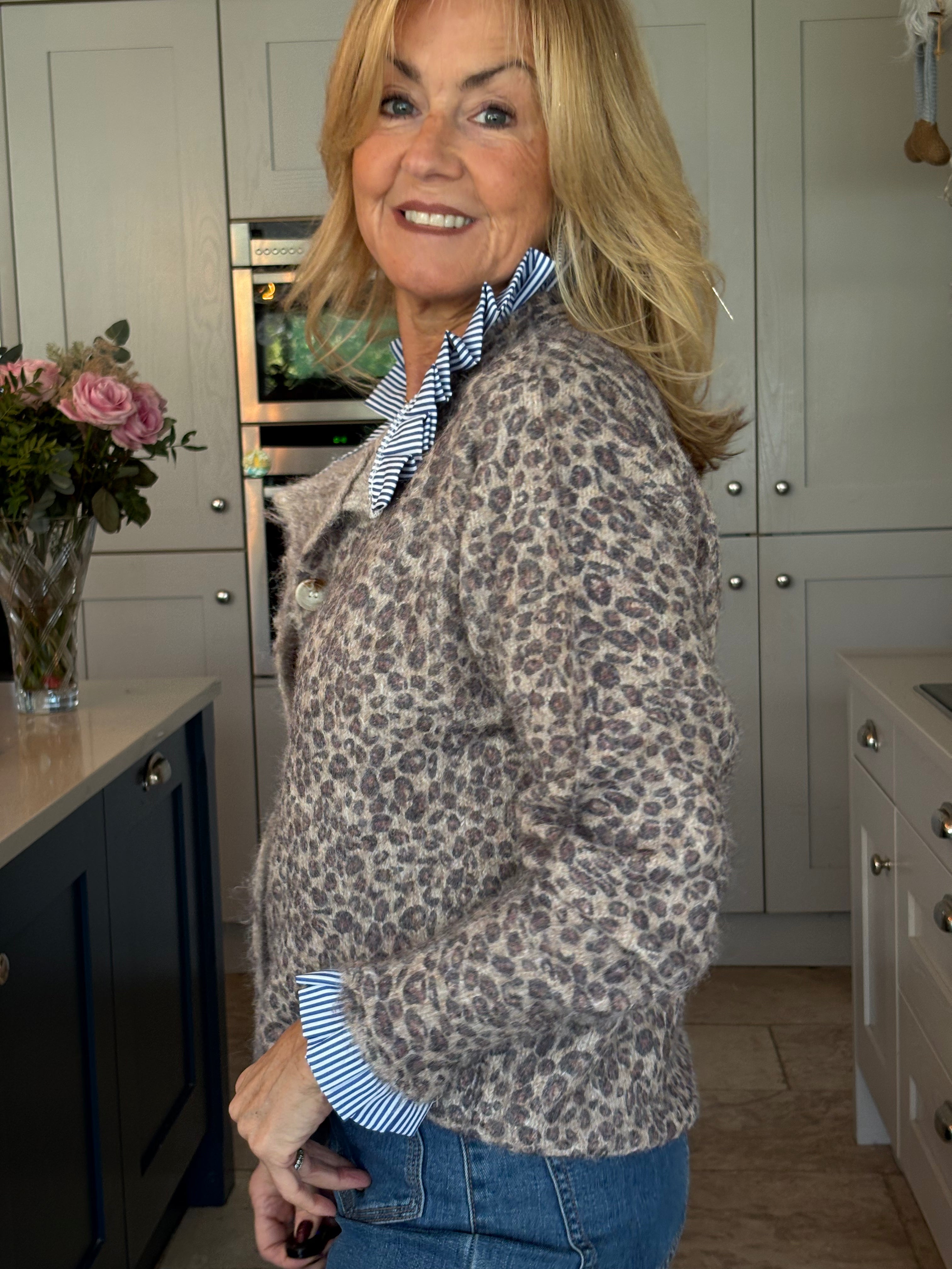 A really clever cardigan which looks like it has a high pleated collared shirt underneath but it is infact trimmed at the neckline and at the cuffs with a blue pin striped pleated collar and cuffs. The leopard print body of the cardigan is soft and fluffy and loosely fitted. The sleeves have a long tight cuff adding to the elegant detail on this cardigan. The Winnie is a one size item.