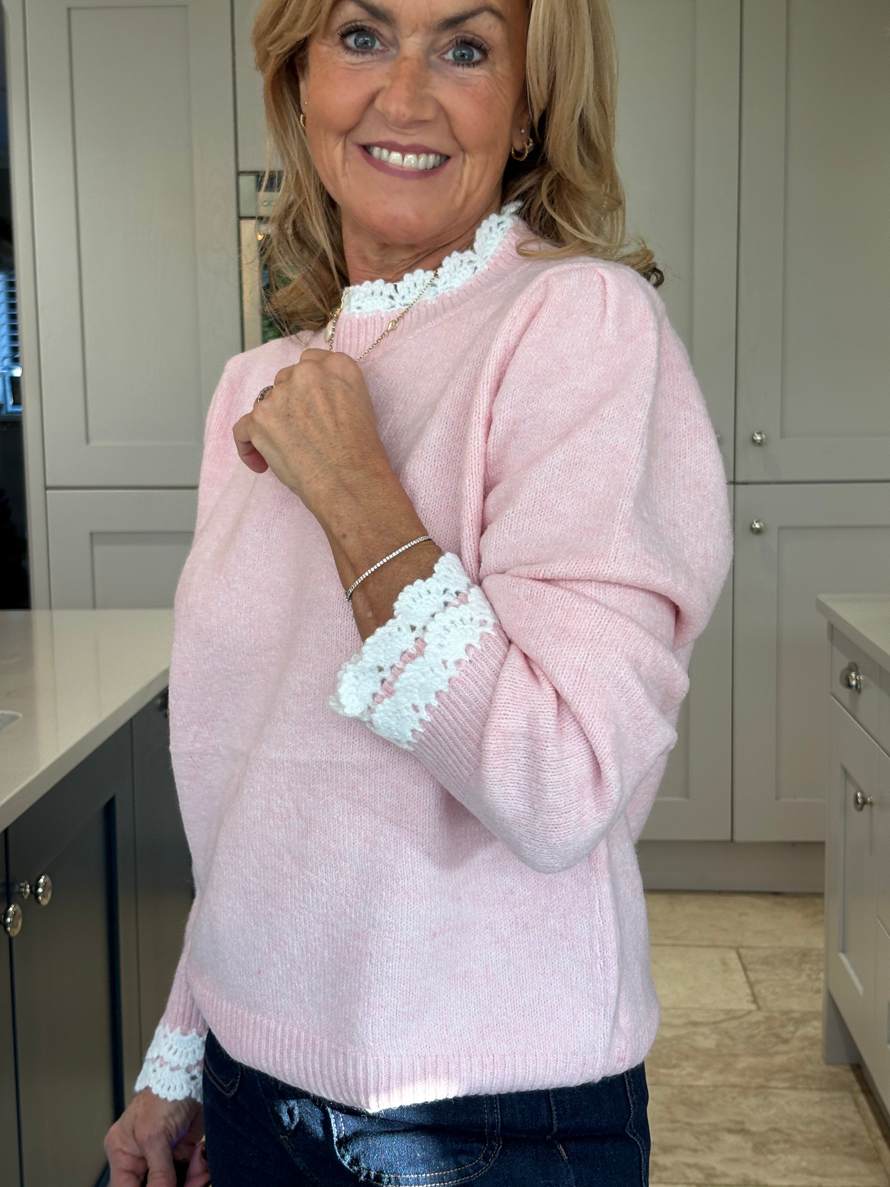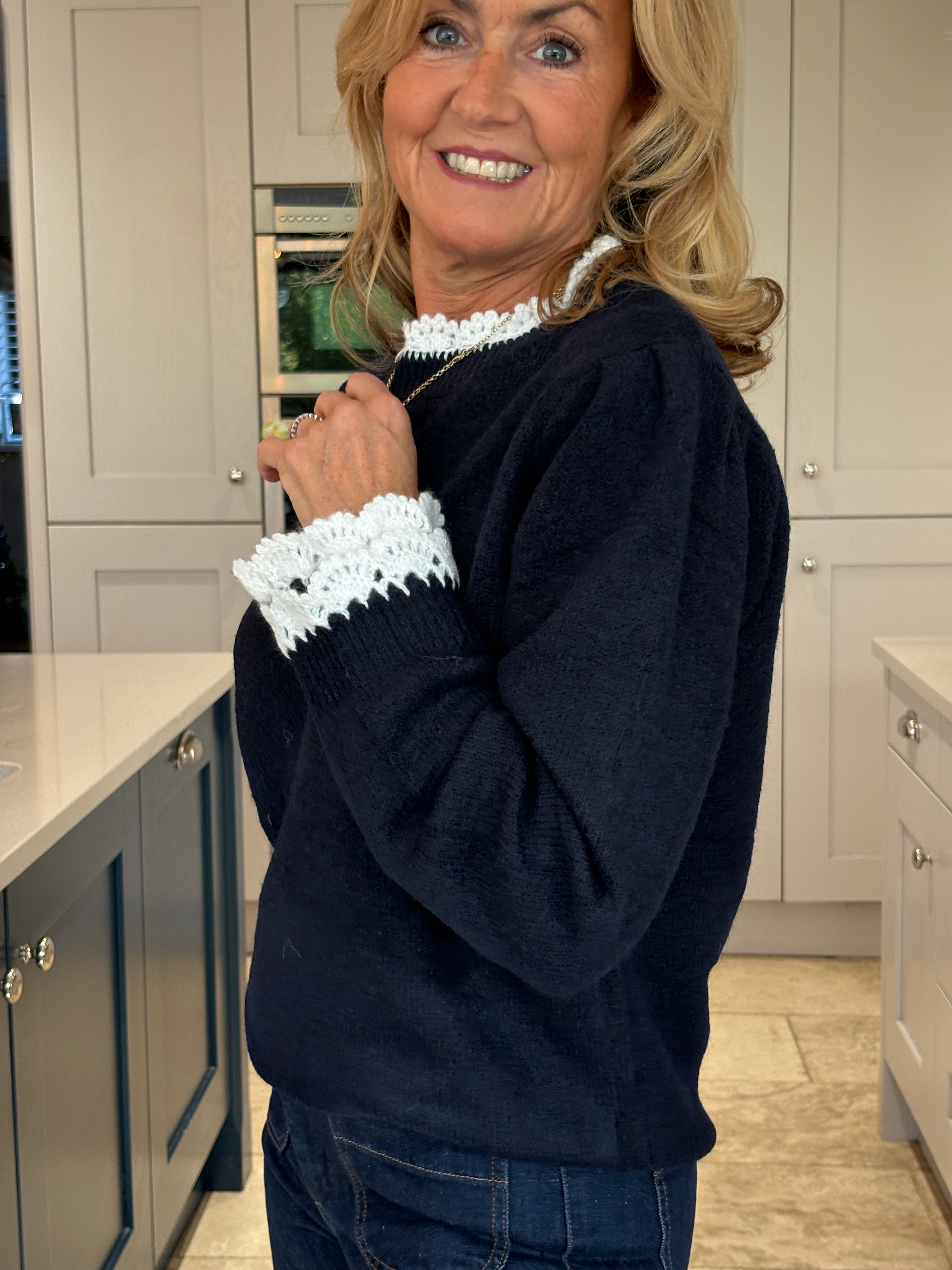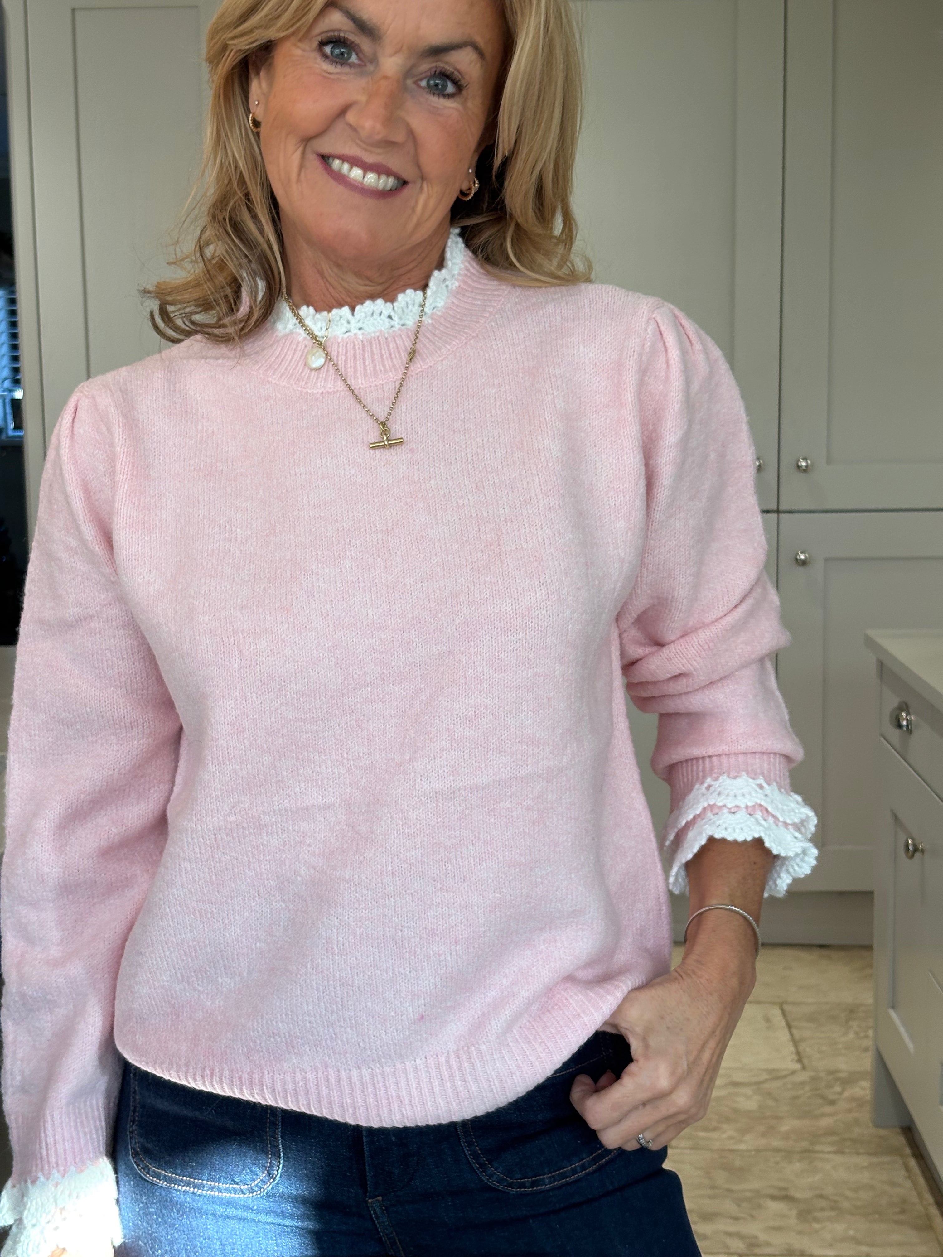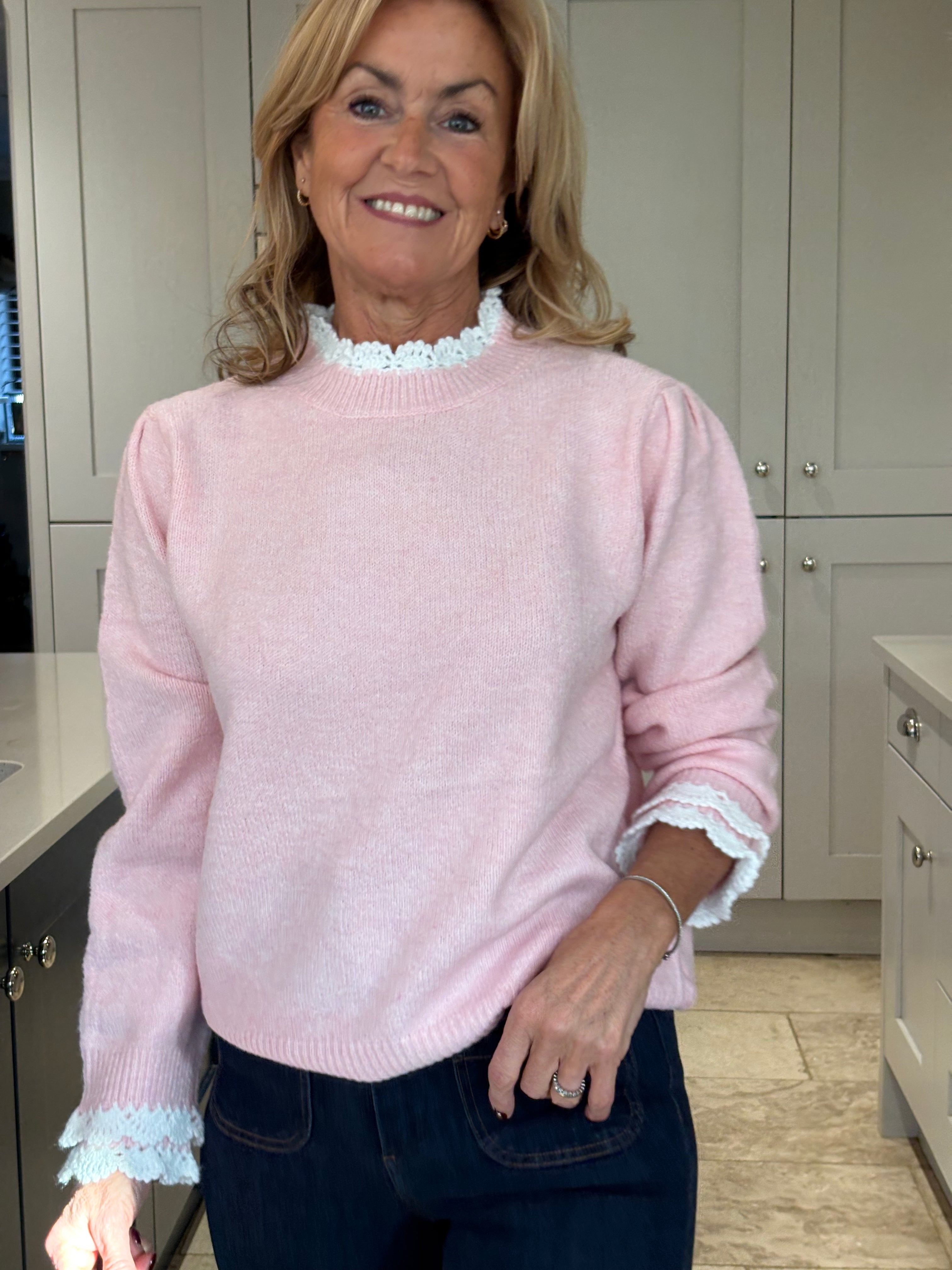 A super cute traditional style crew neck jumper with a gorgeous white crochet trim at the collar and on the cuffs giving the illusion of wearing a shirt underneath. Puff, stylish shoulders. Easy to wear and really soft and comfortable. In baby pink and navy blue.