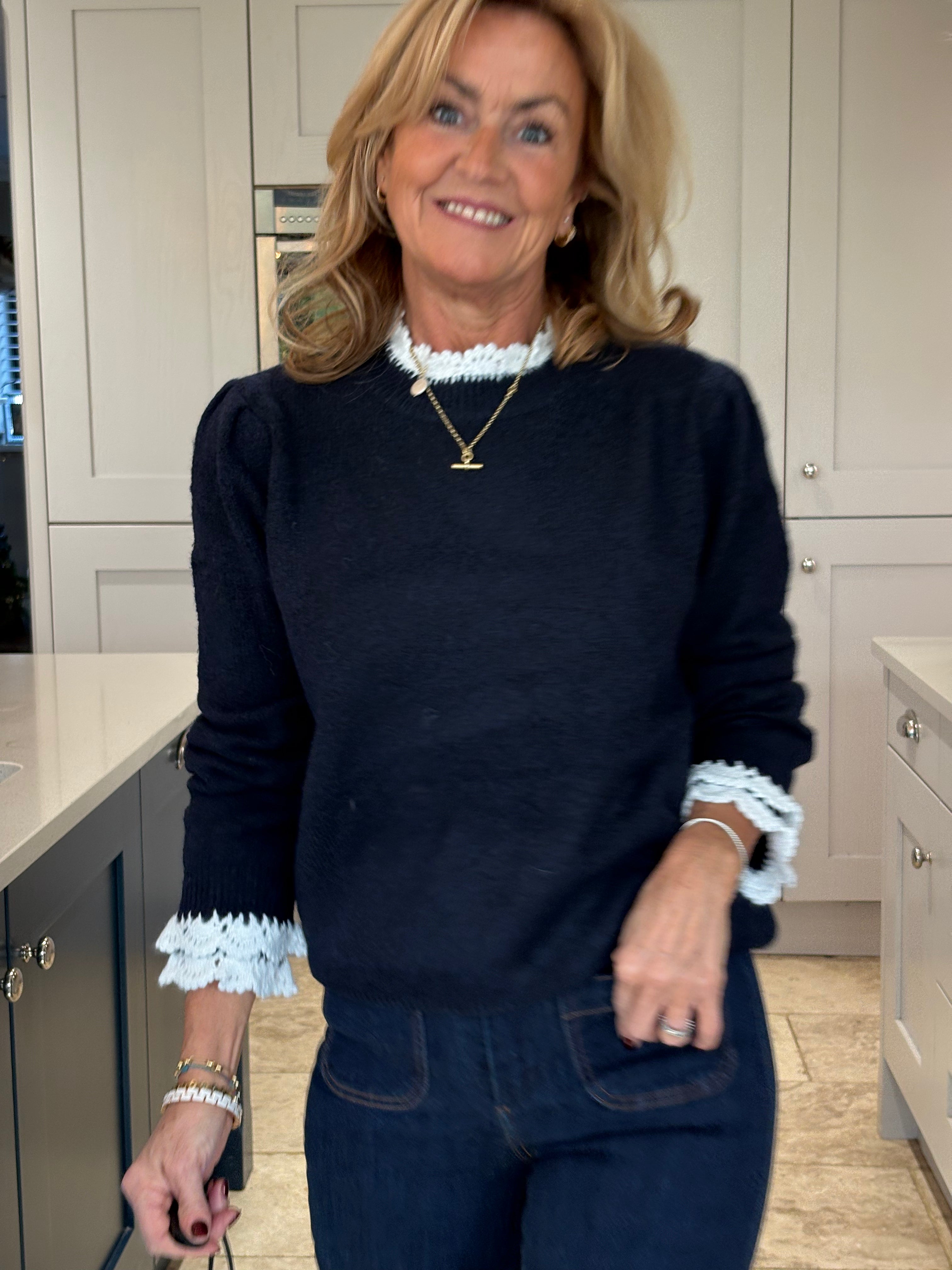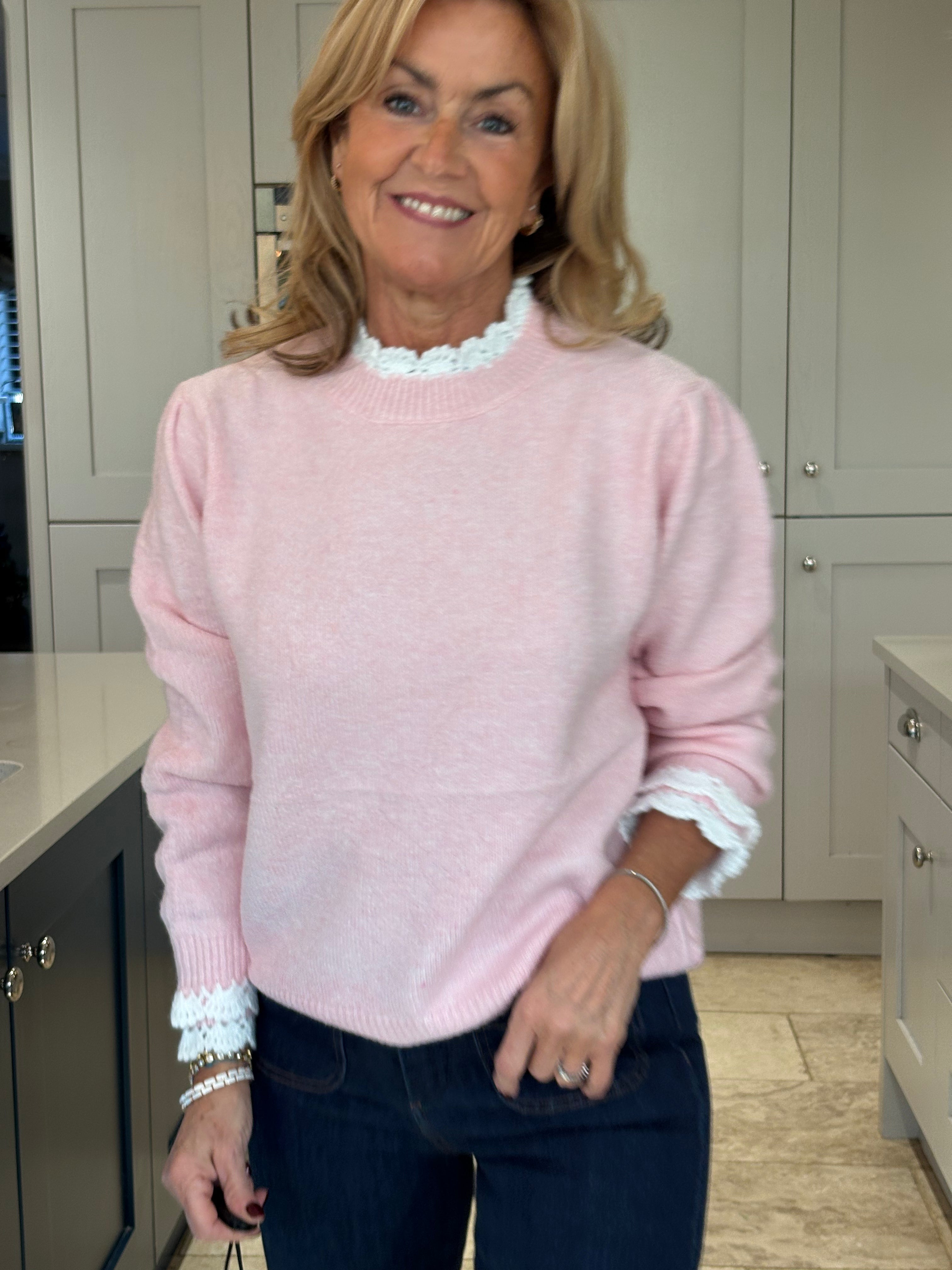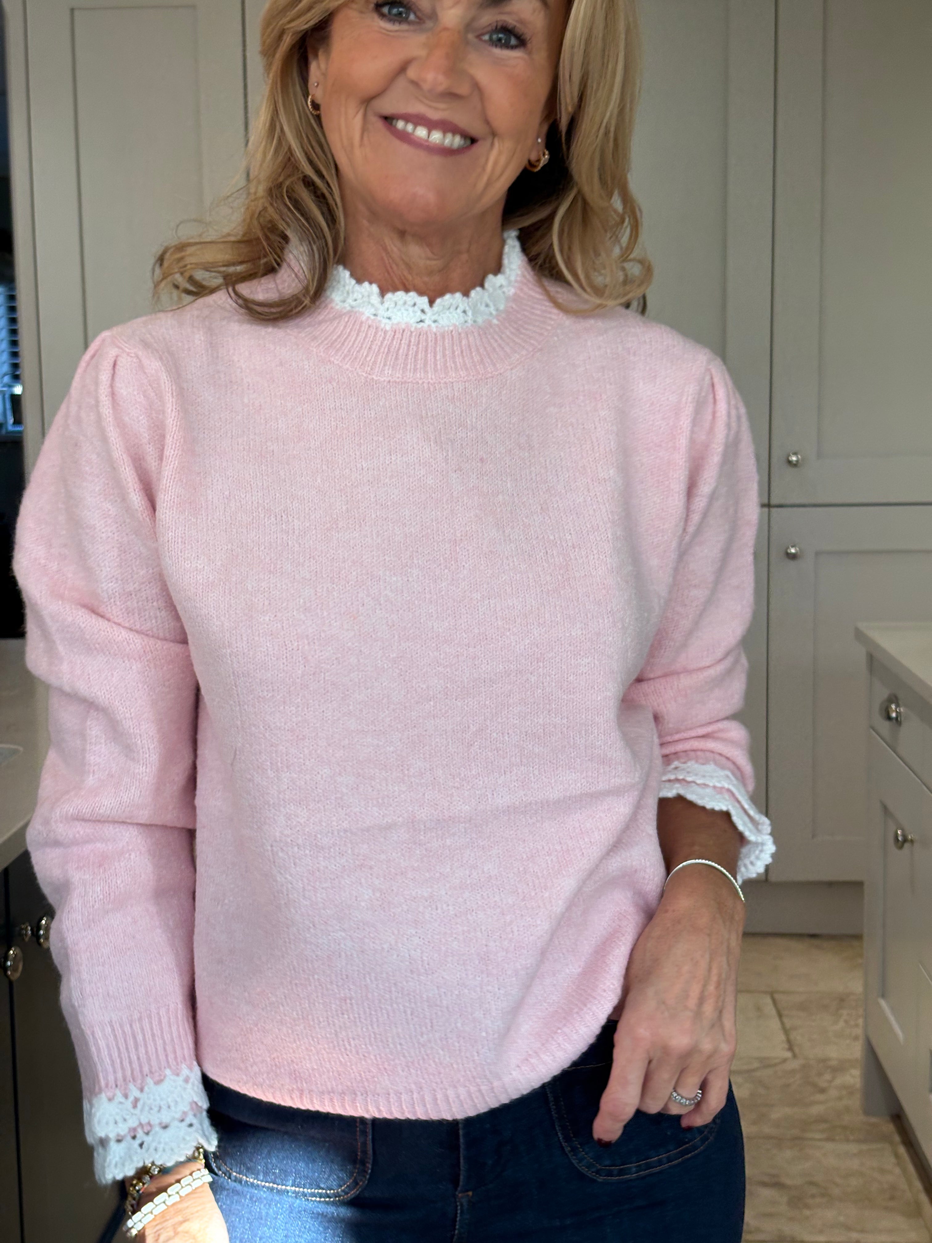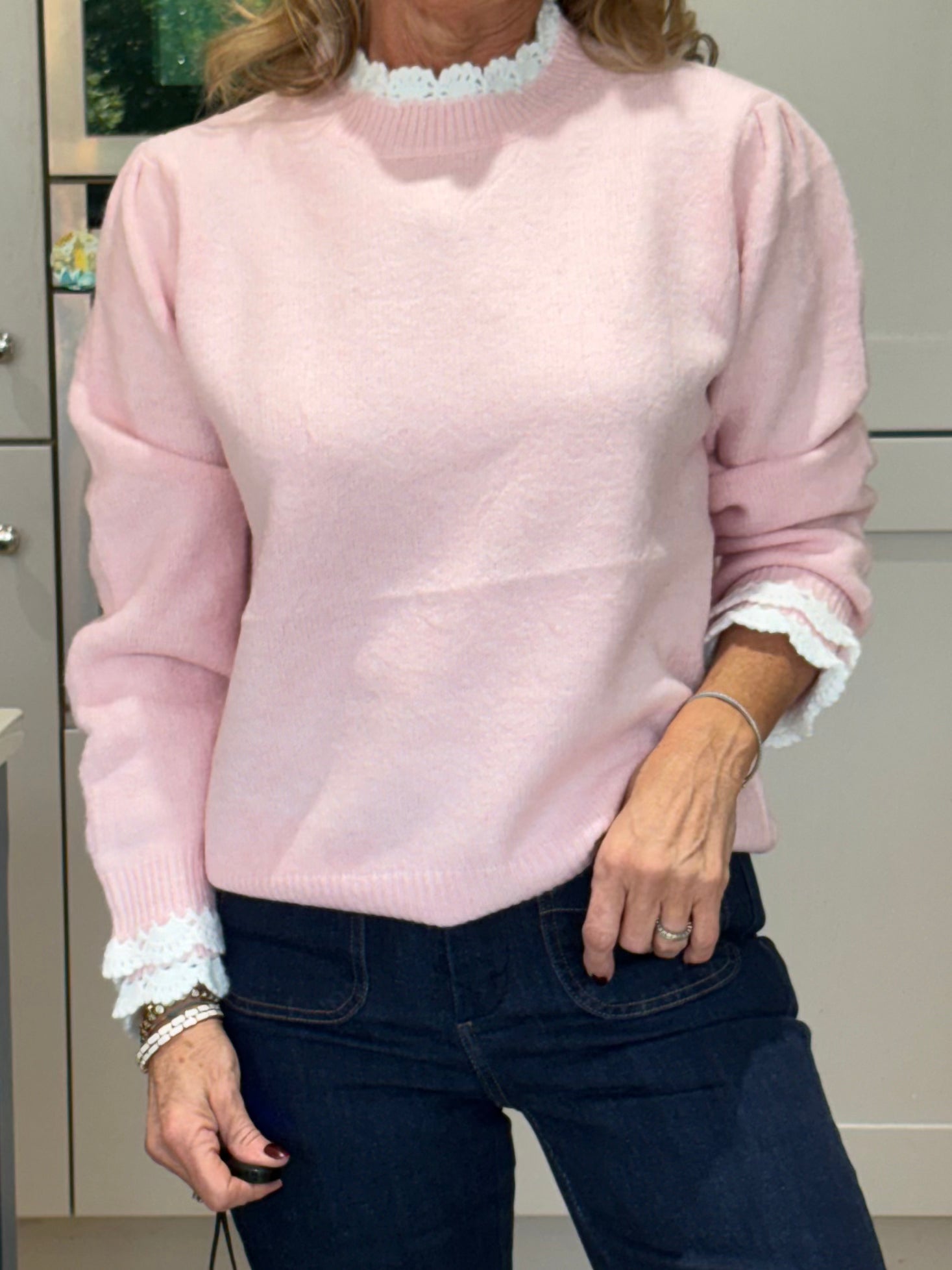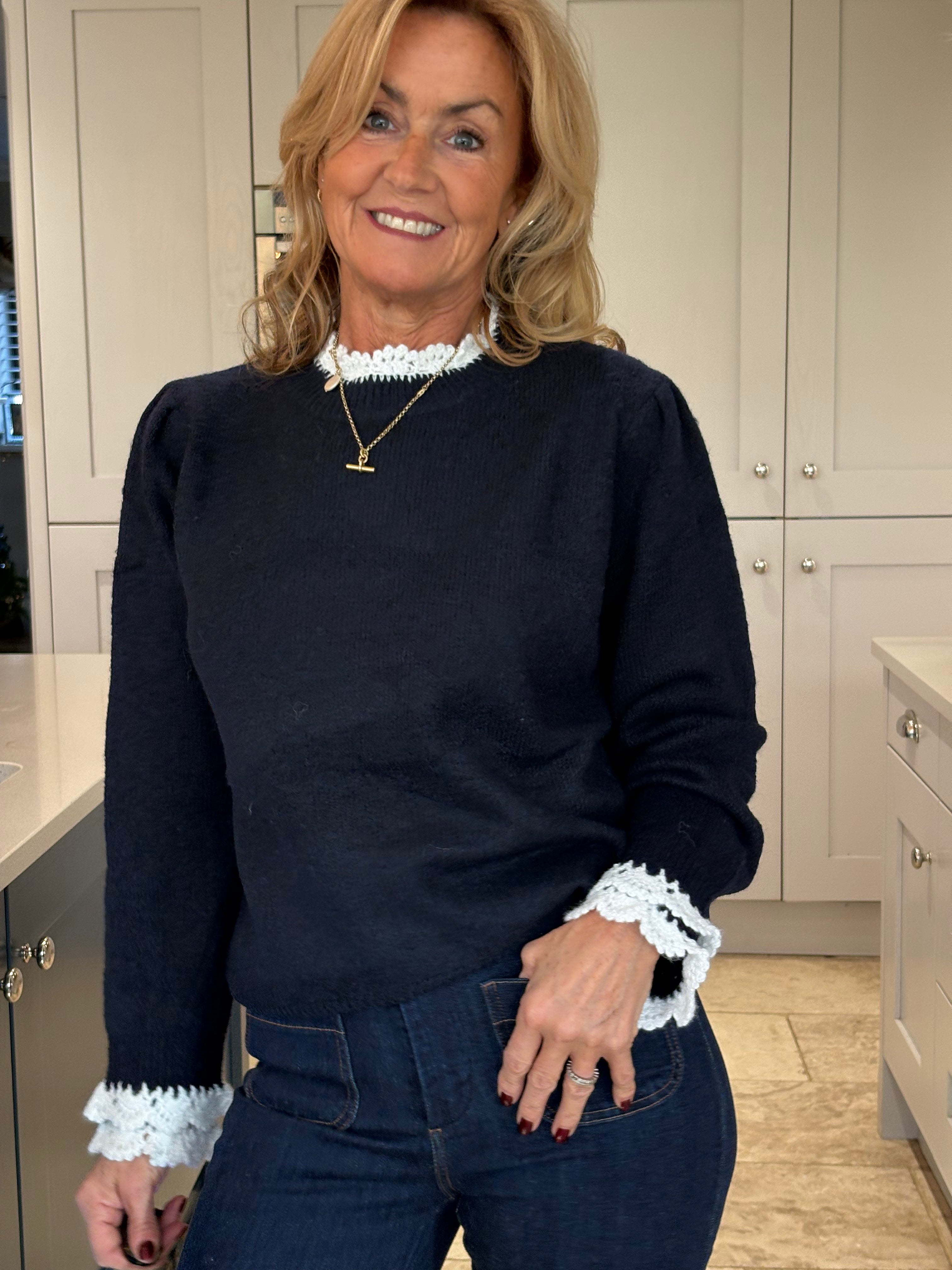 A super cute traditional style crew neck jumper with a gorgeous white crochet trim at the collar and on the cuffs giving the illusion of wearing a shirt underneath. Puff, stylish shoulders. Easy to wear and really soft and comfortable. In baby pink and navy blue.
