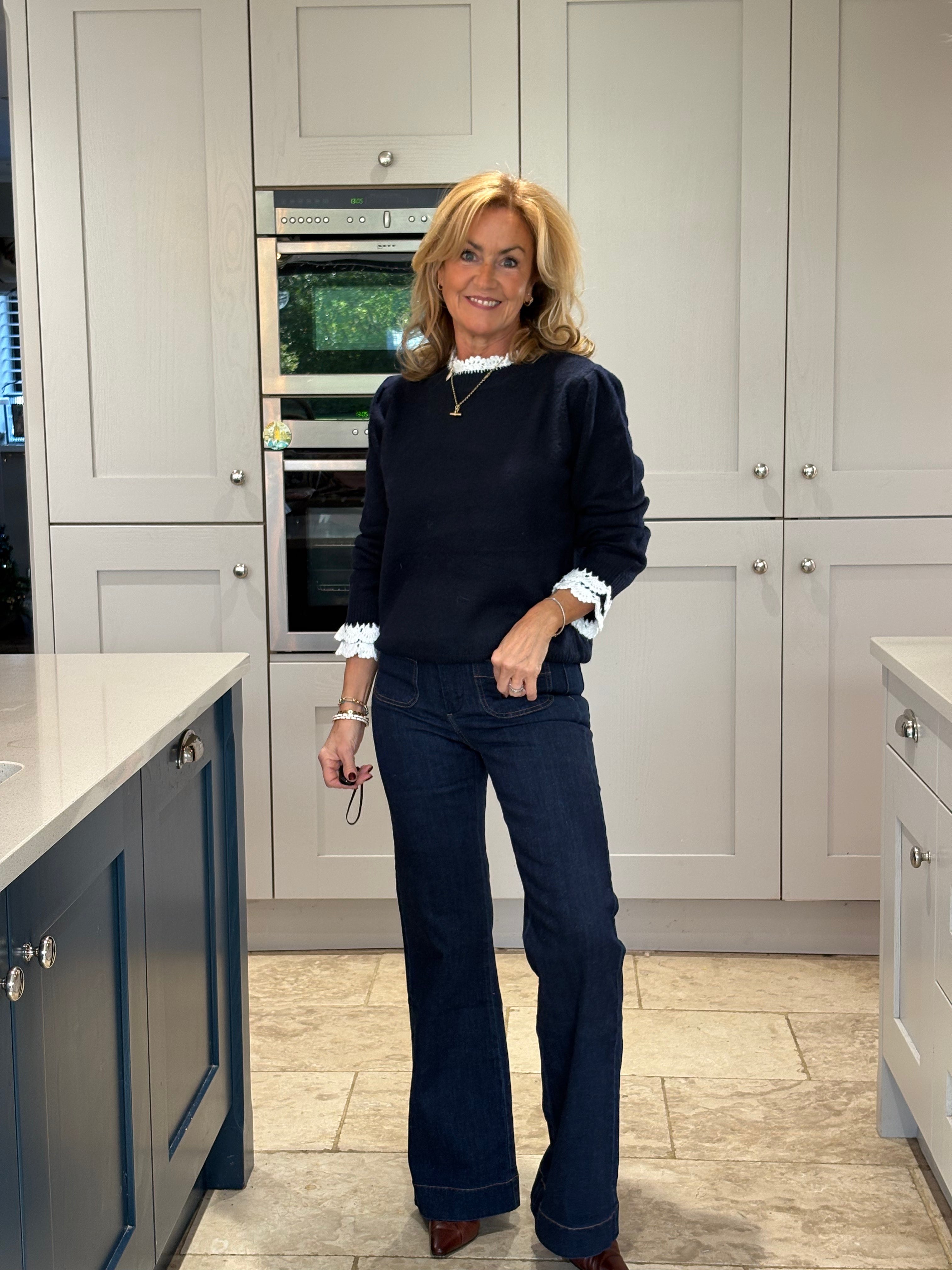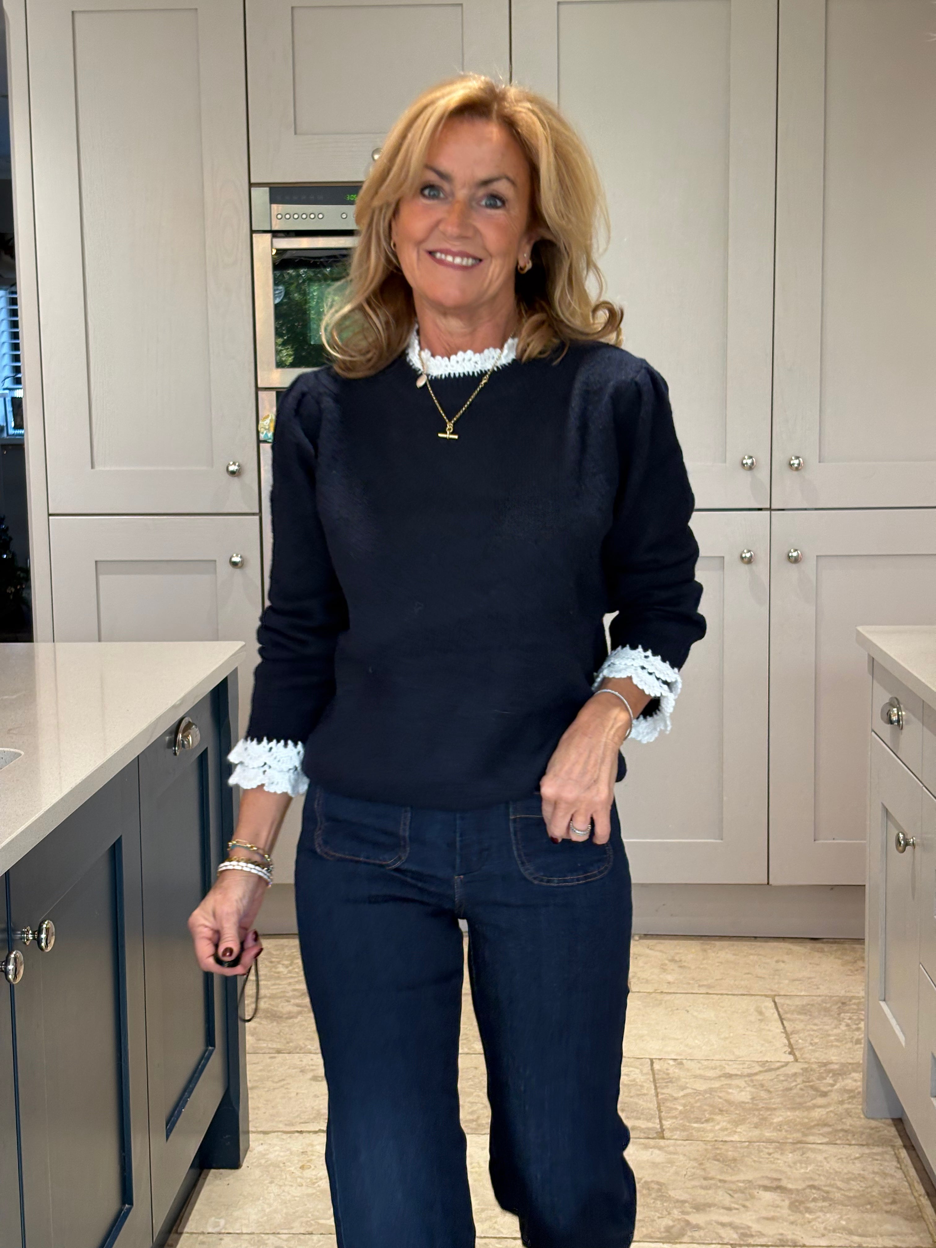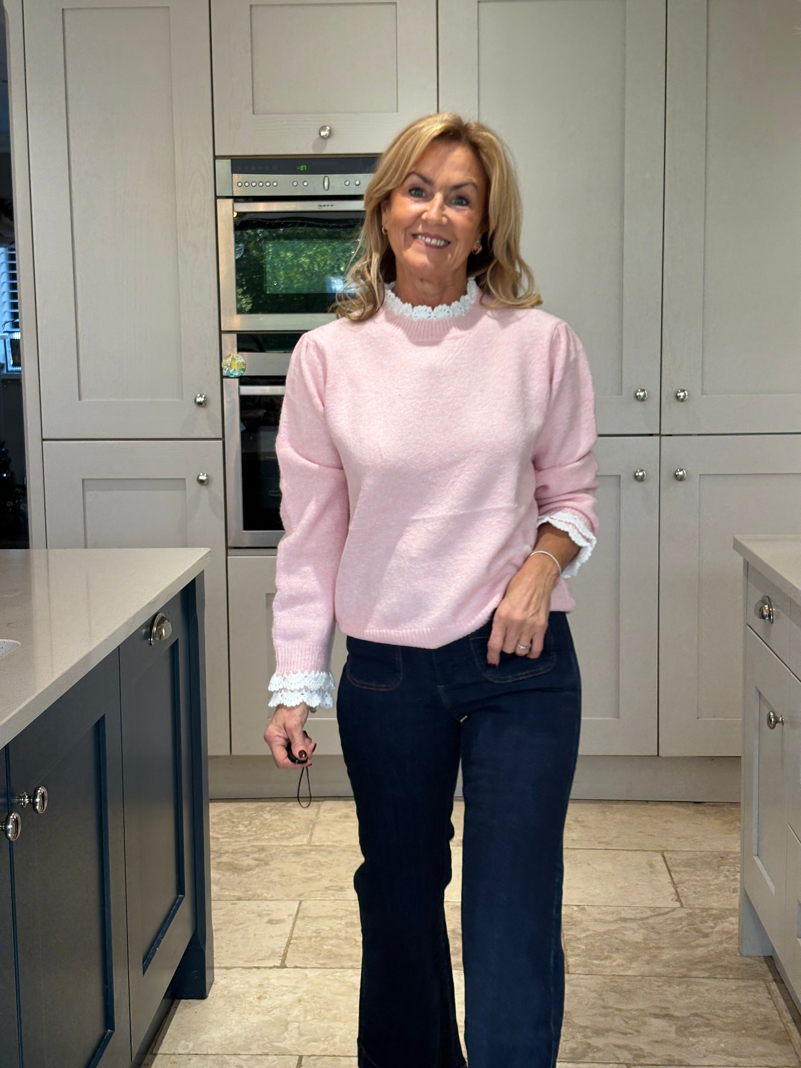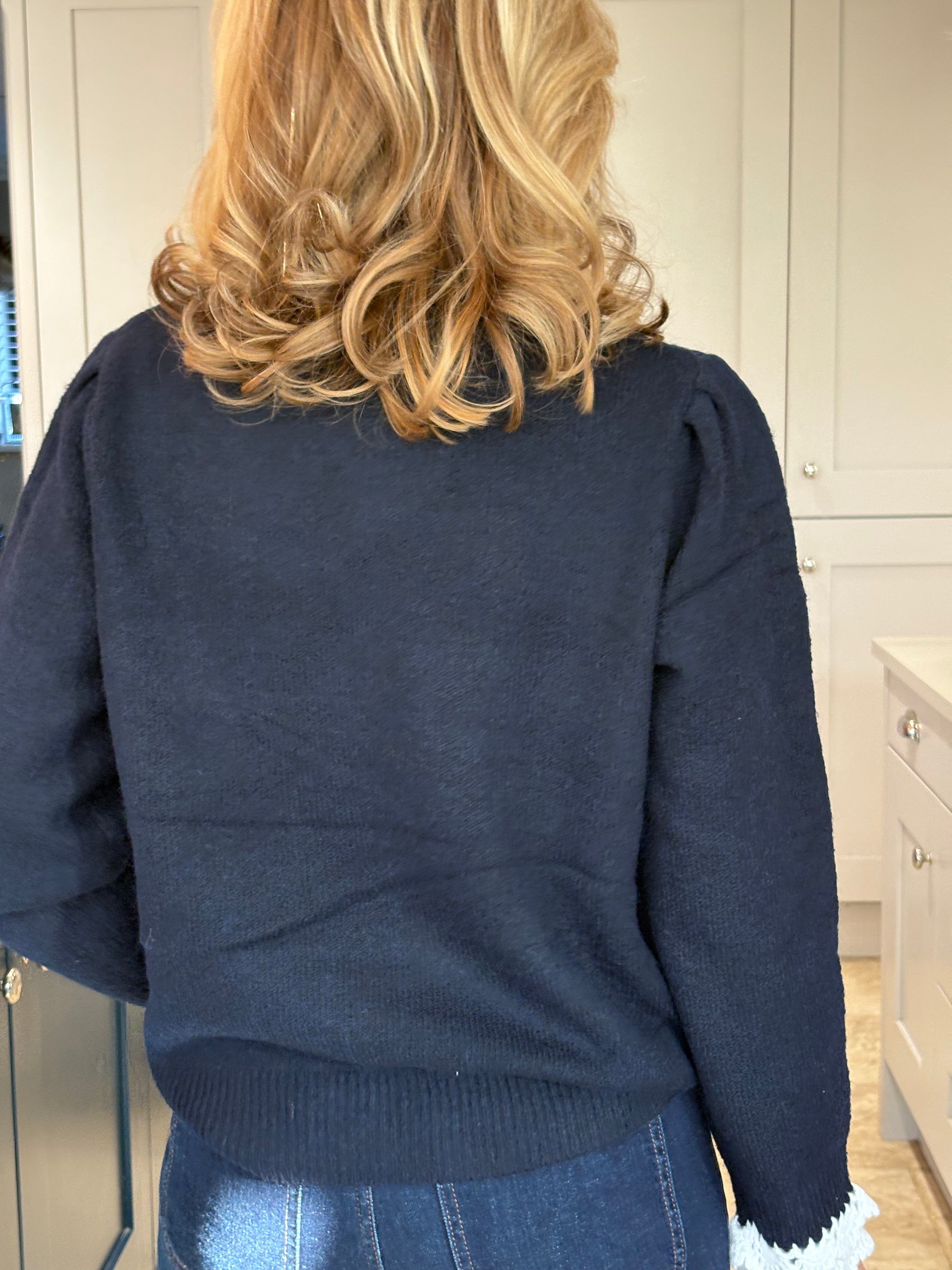 A super cute traditional style crew neck jumper with a gorgeous white crochet trim at the collar and on the cuffs giving the illusion of wearing a shirt underneath. Puff, stylish shoulders. Easy to wear and really soft and comfortable. In baby pink and navy blue.