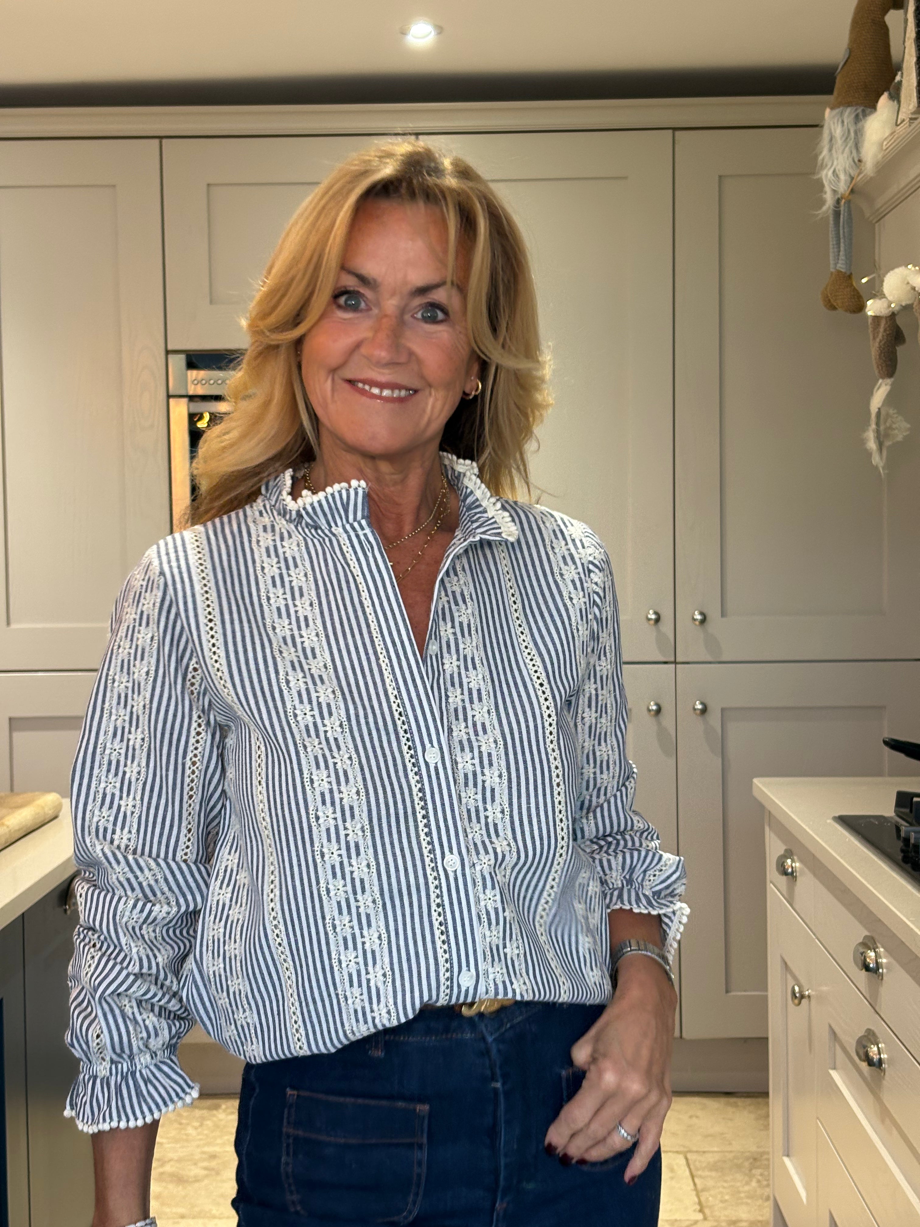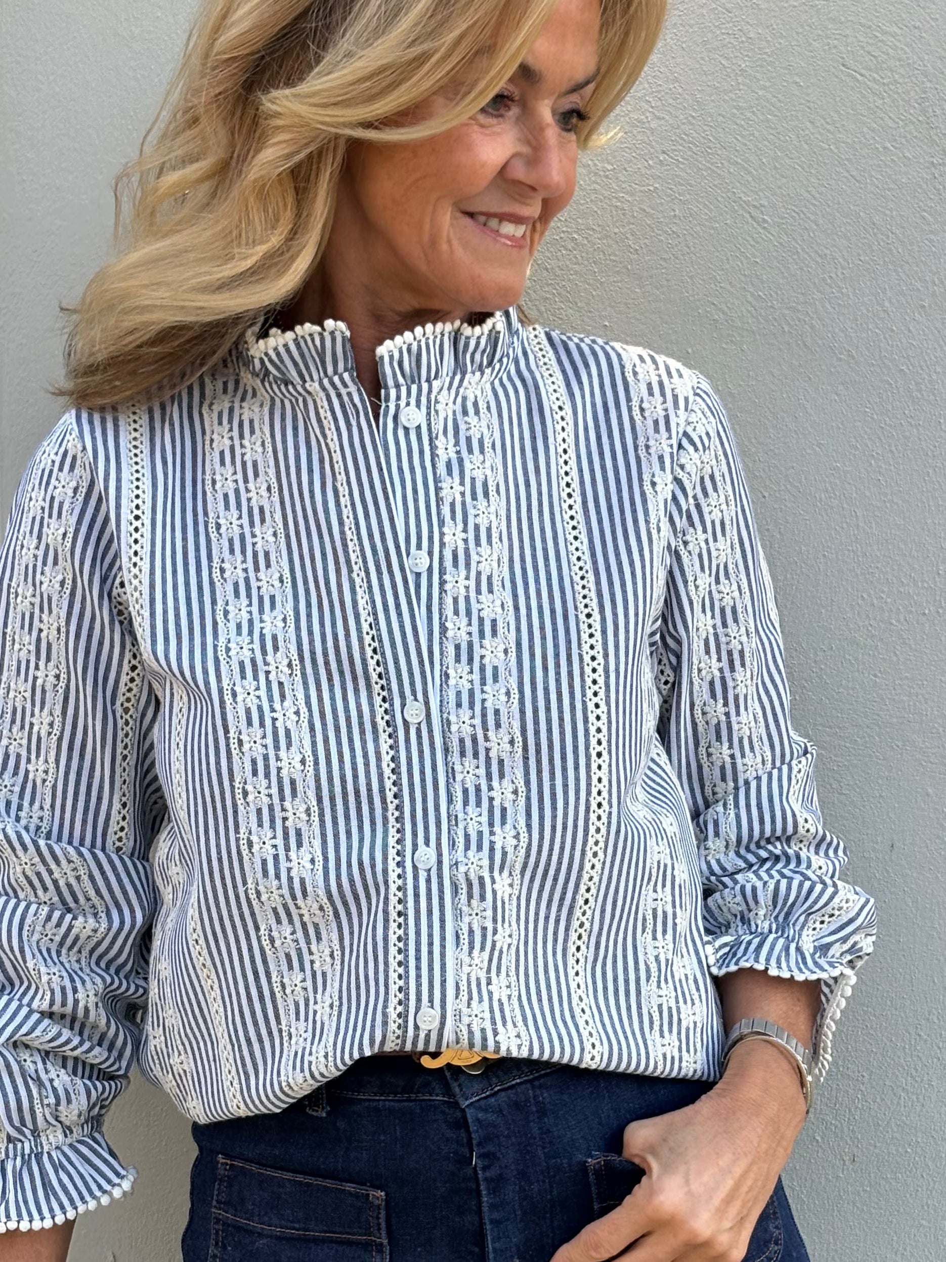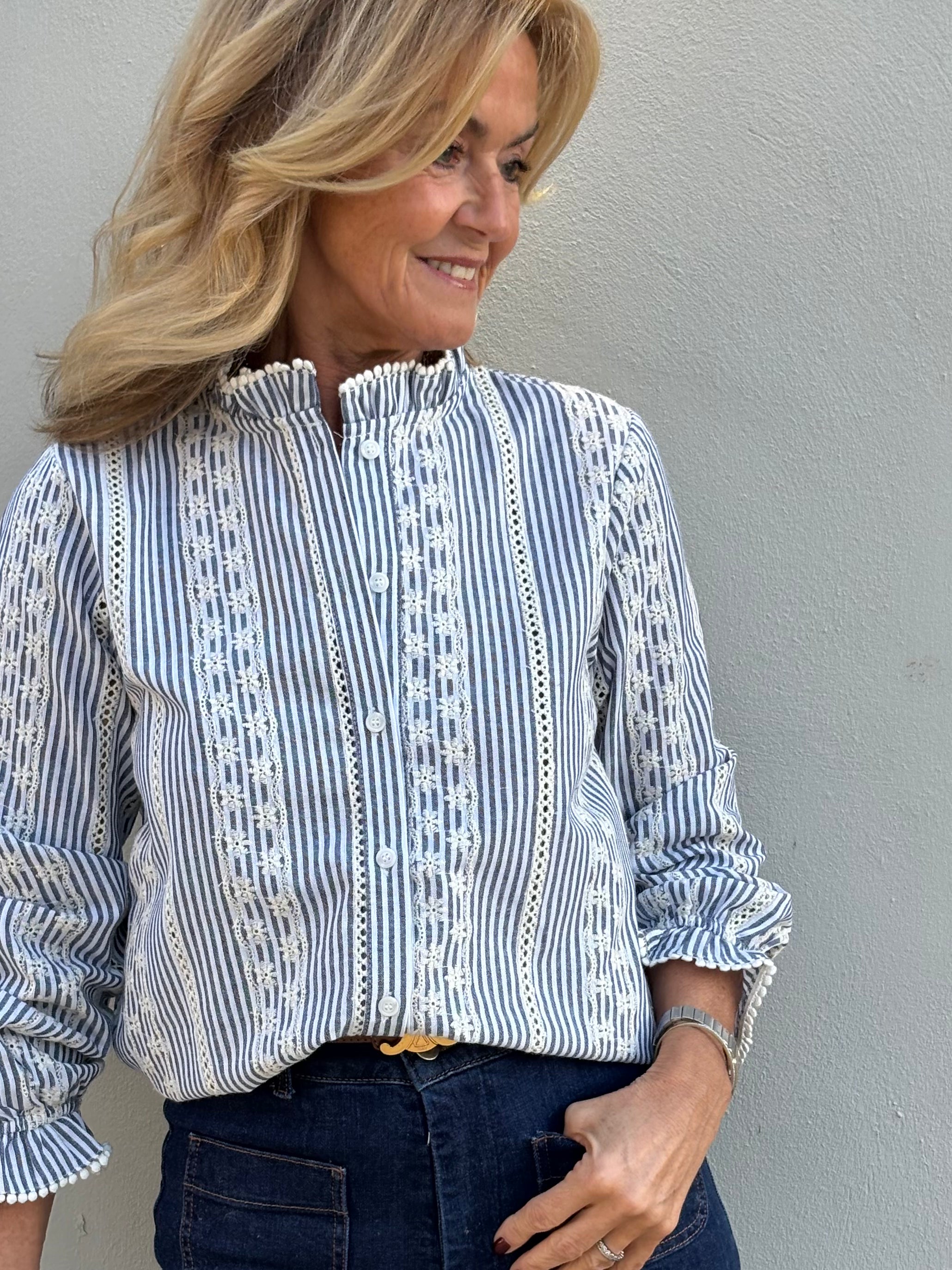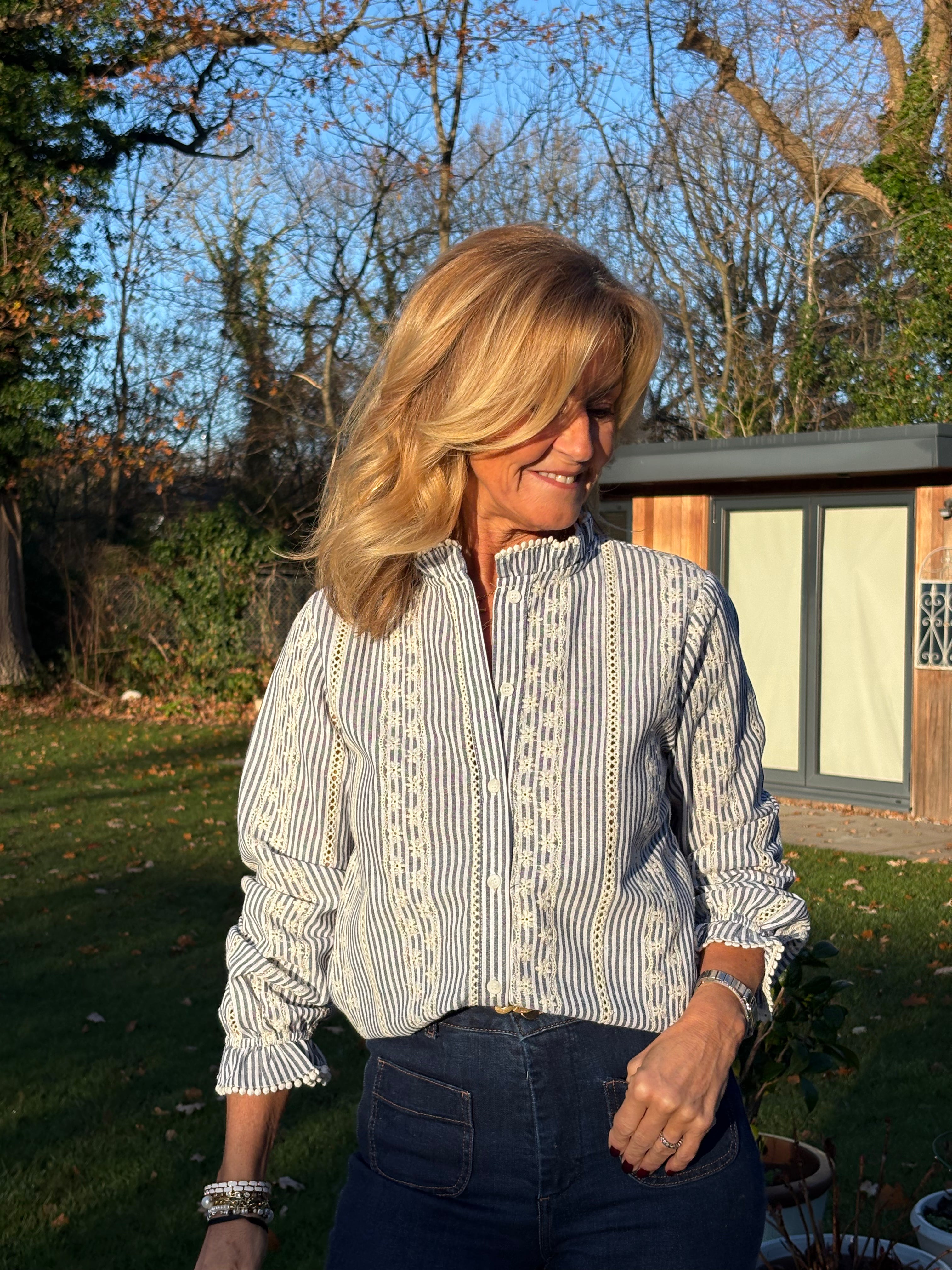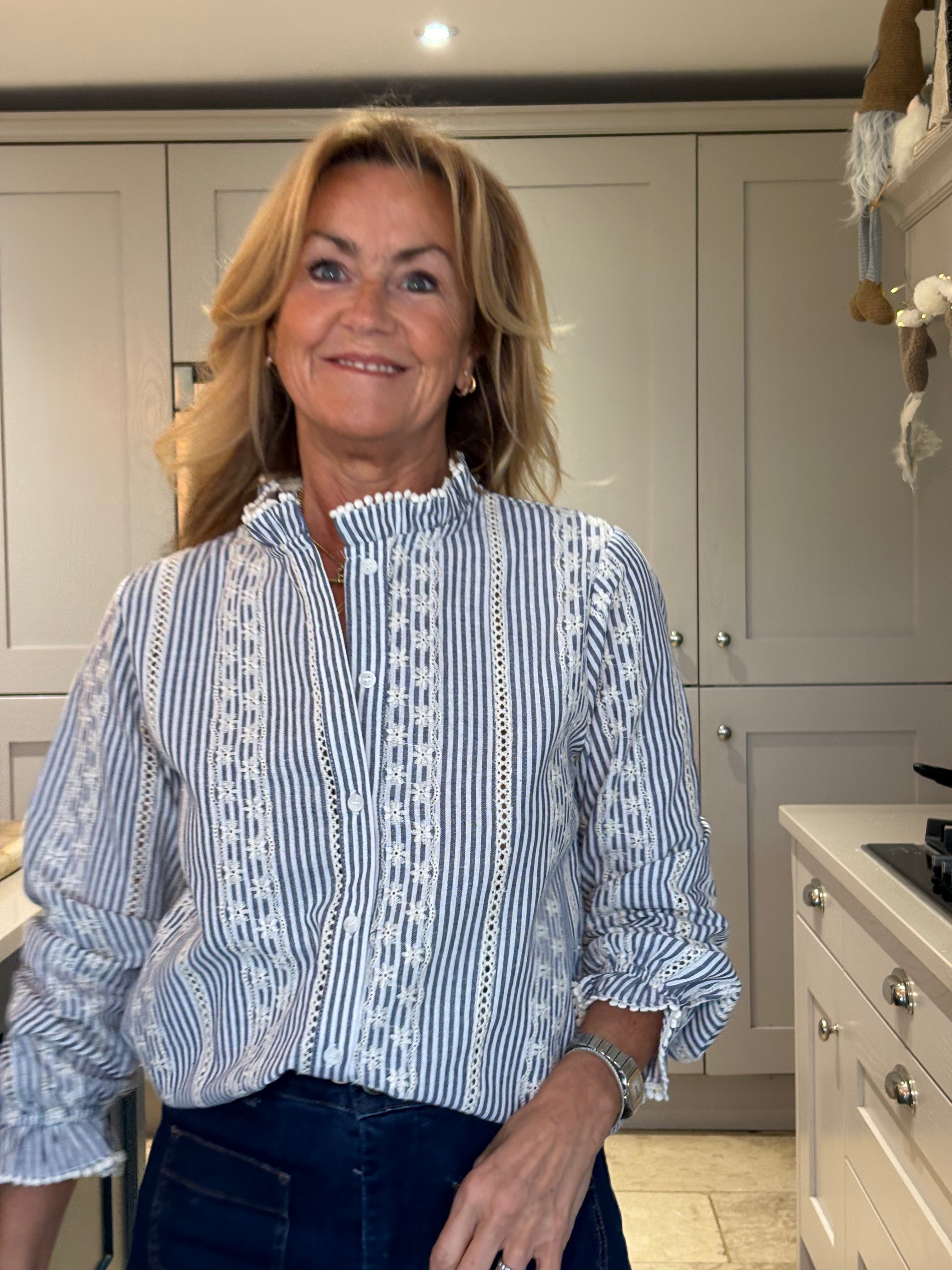 This gorgeous cotton blouse is a delightful blend of detail and style, featuring a charming blue and white striped pattern that adds a fresh, vibrant touch. The blouse is adorned with intricate embroidery throughout, enhancing its visual appeal. A stand-up frill collar, trimmed with tiny white pompoms, adds a playful element, while the elasticated cuffs also feature the same whimsical trim.