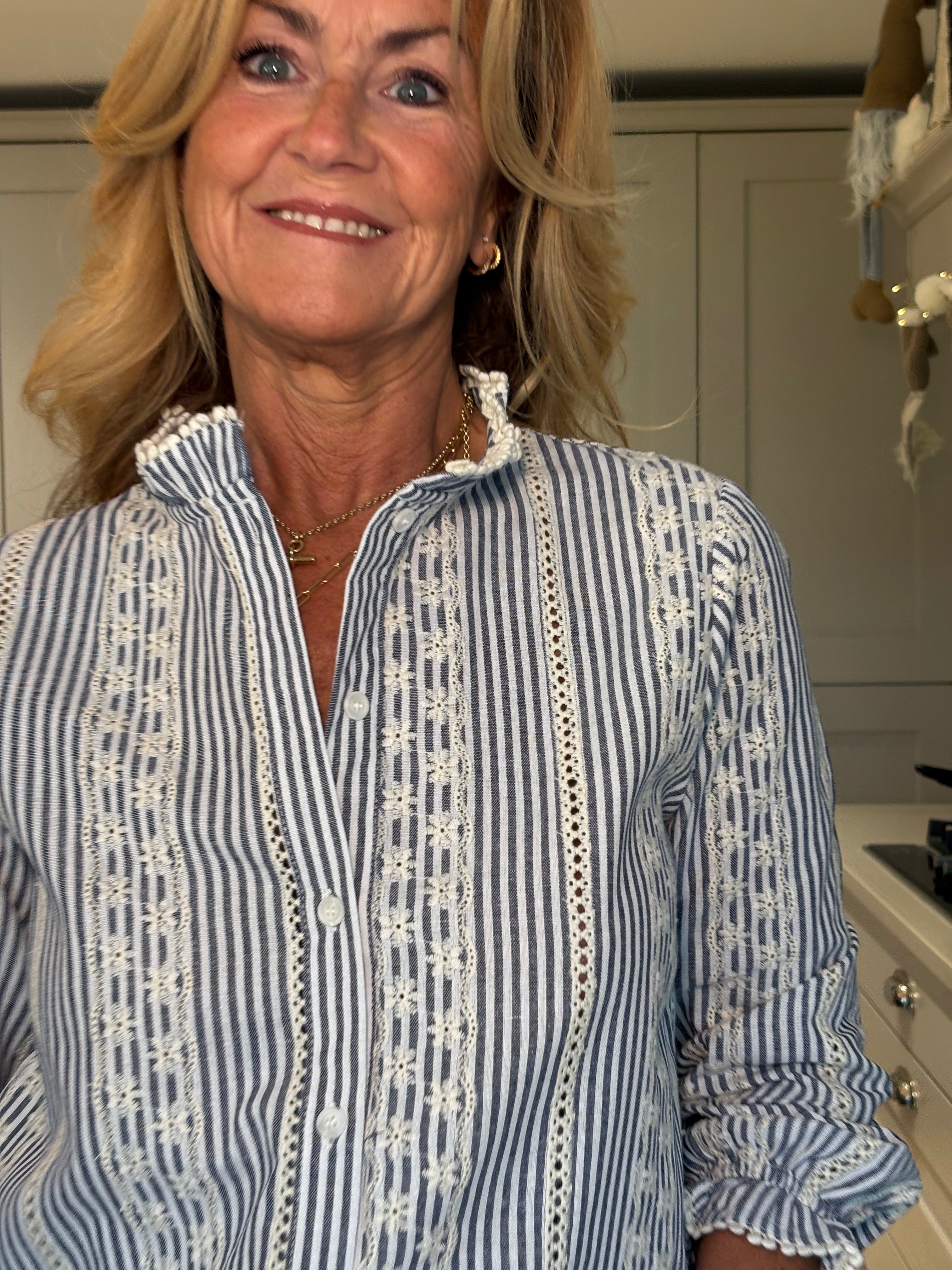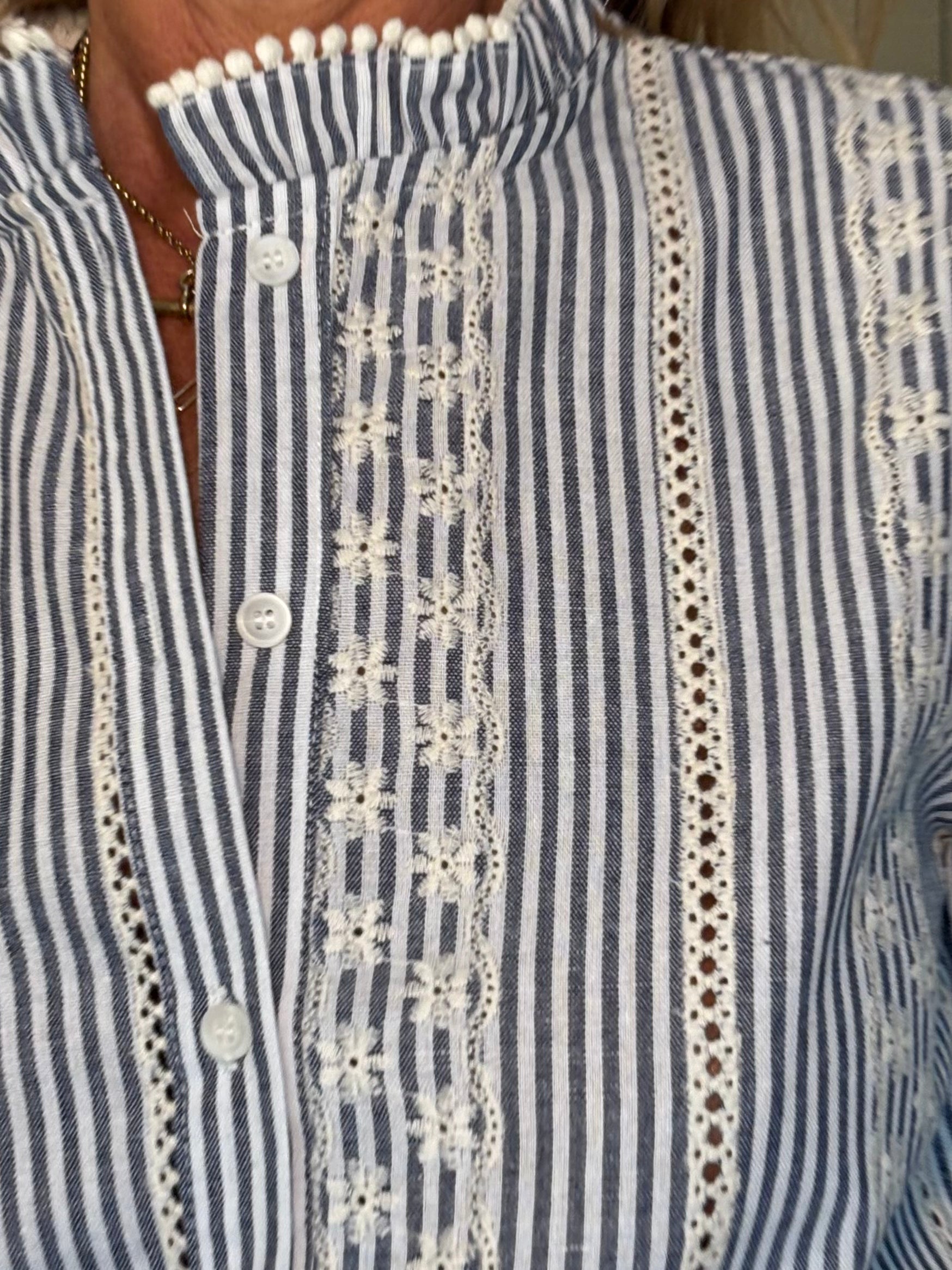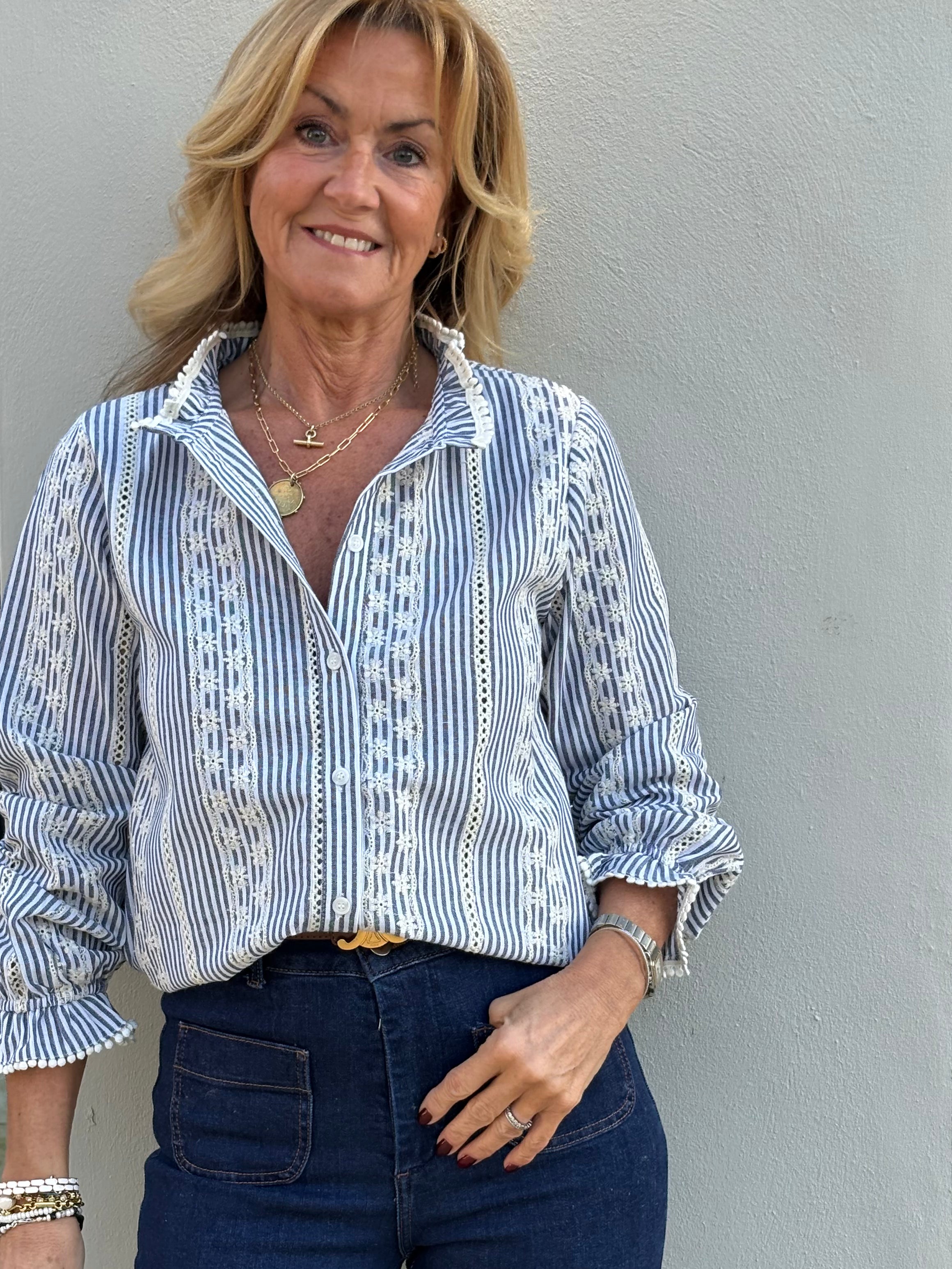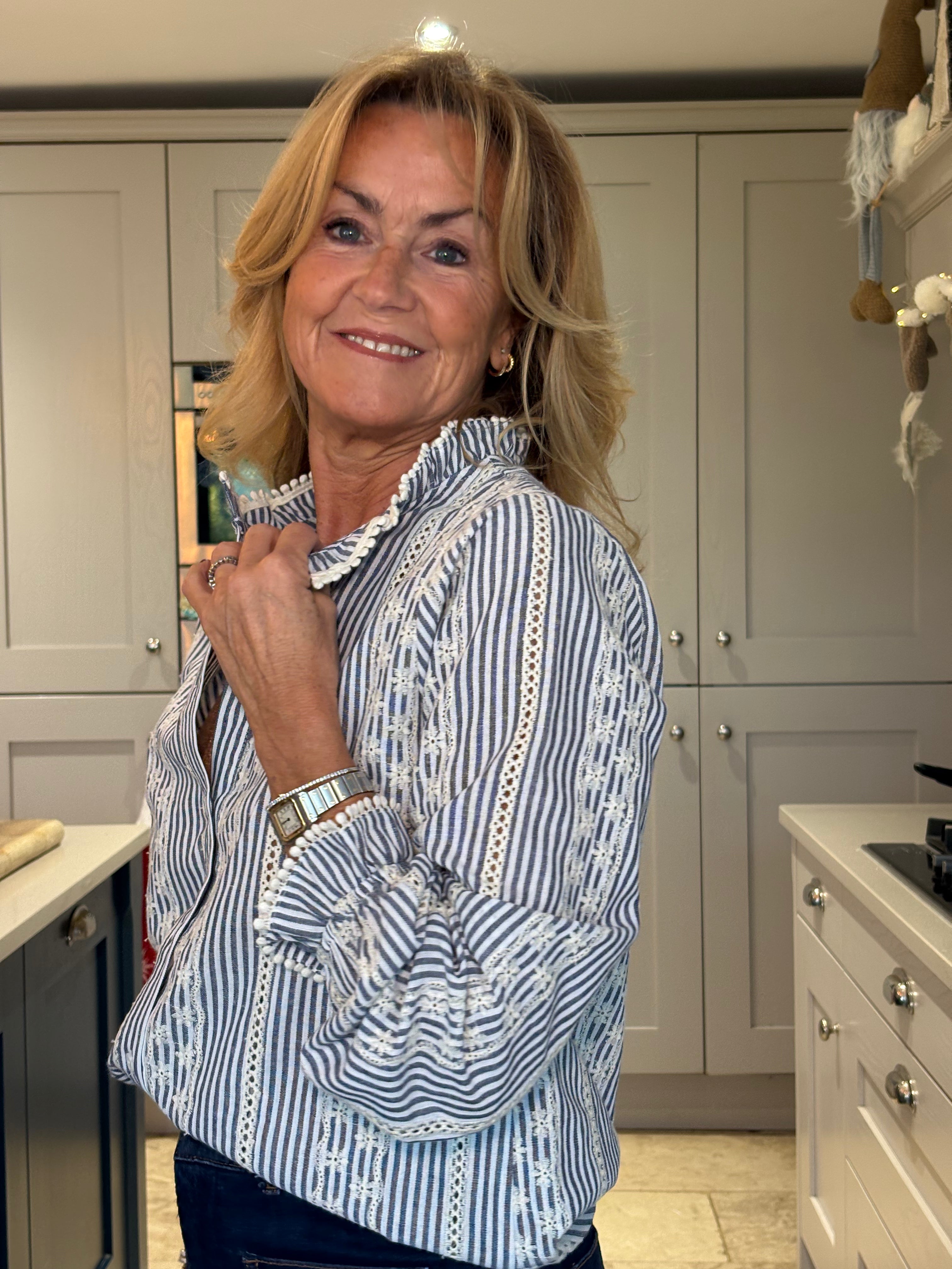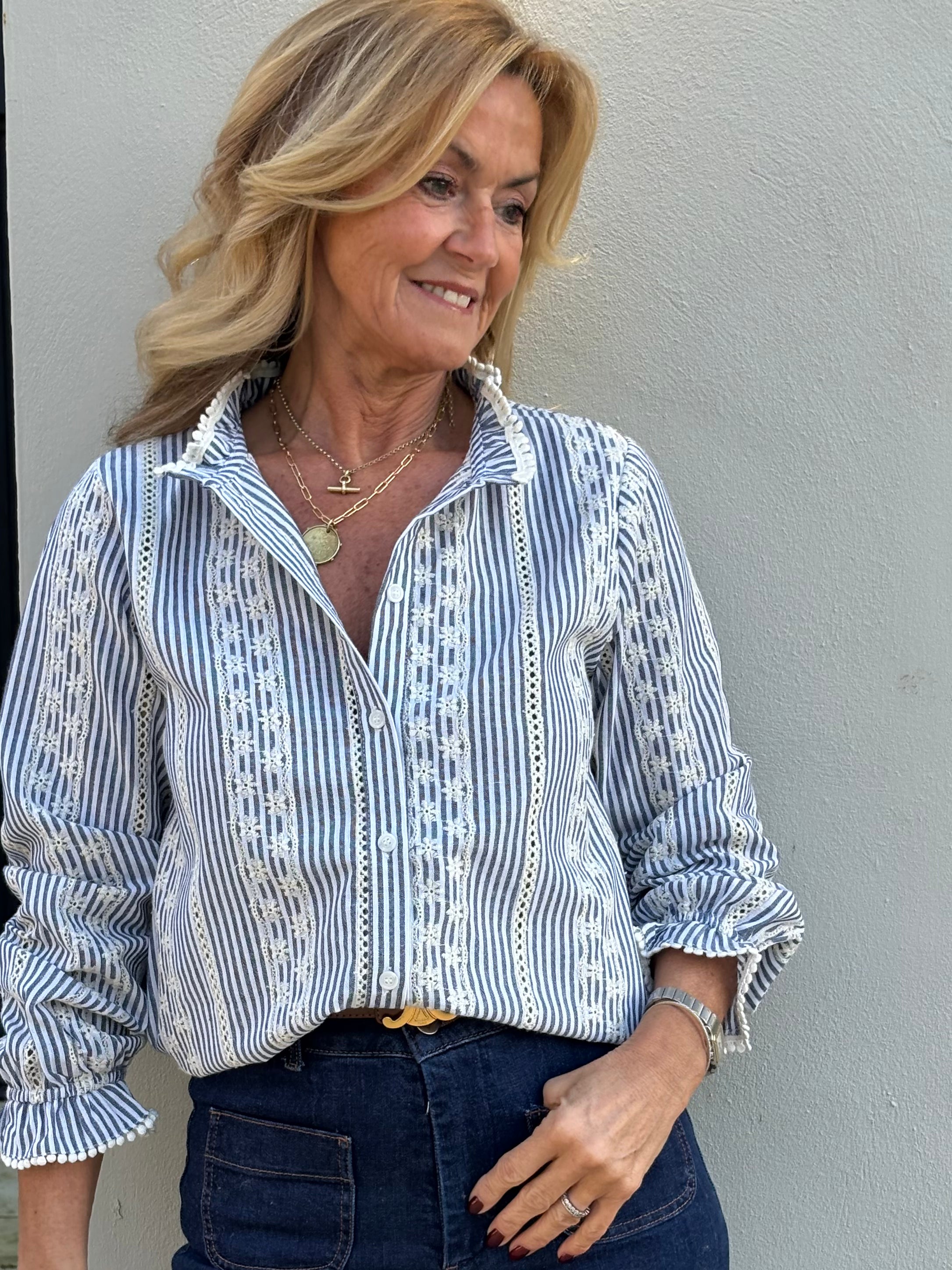 This gorgeous cotton blouse is a delightful blend of detail and style, featuring a charming blue and white striped pattern that adds a fresh, vibrant touch. The blouse is adorned with intricate embroidery throughout, enhancing its visual appeal. A stand-up frill collar, trimmed with tiny white pompoms, adds a playful element, while the elasticated cuffs also feature the same whimsical trim.