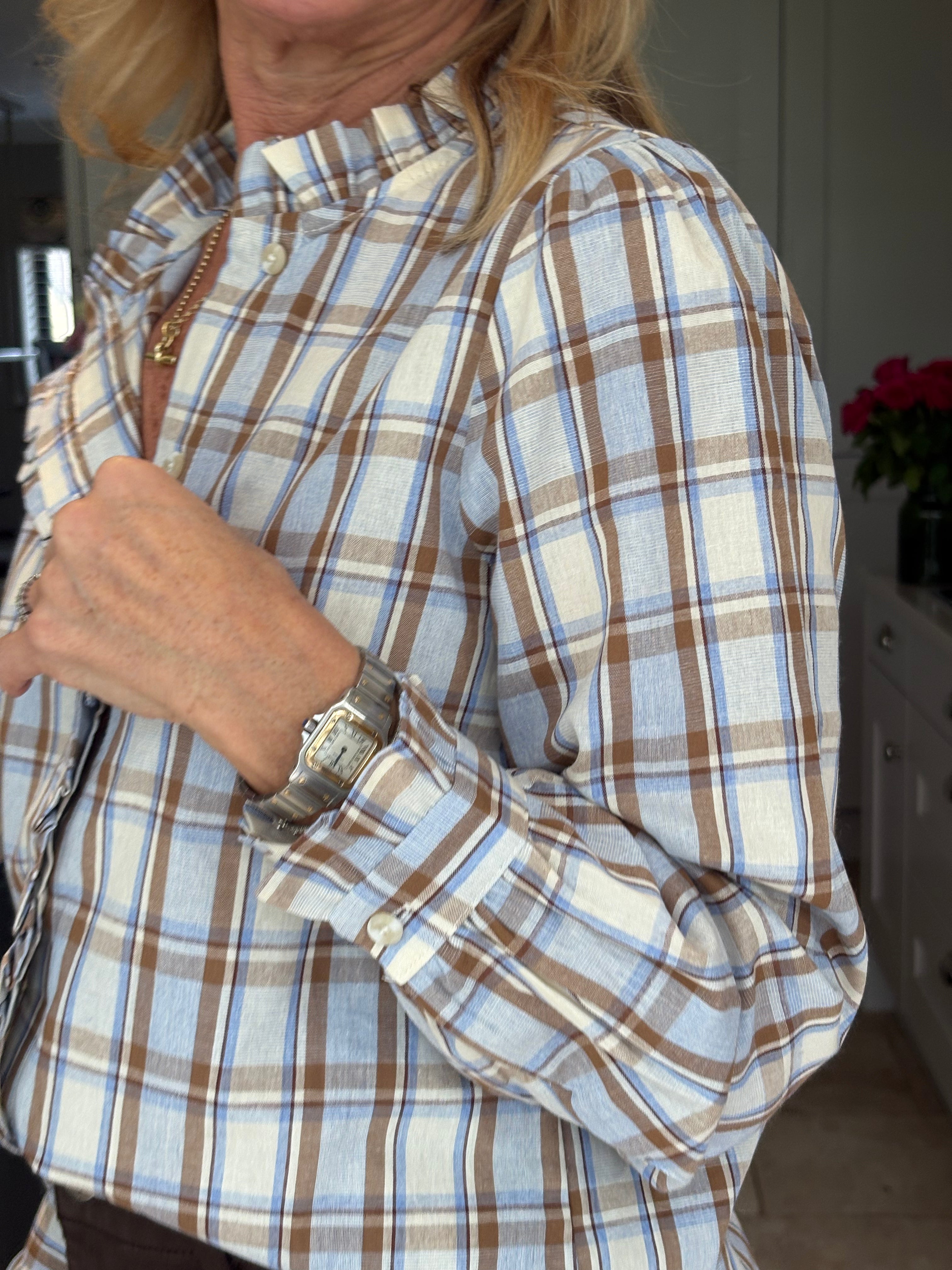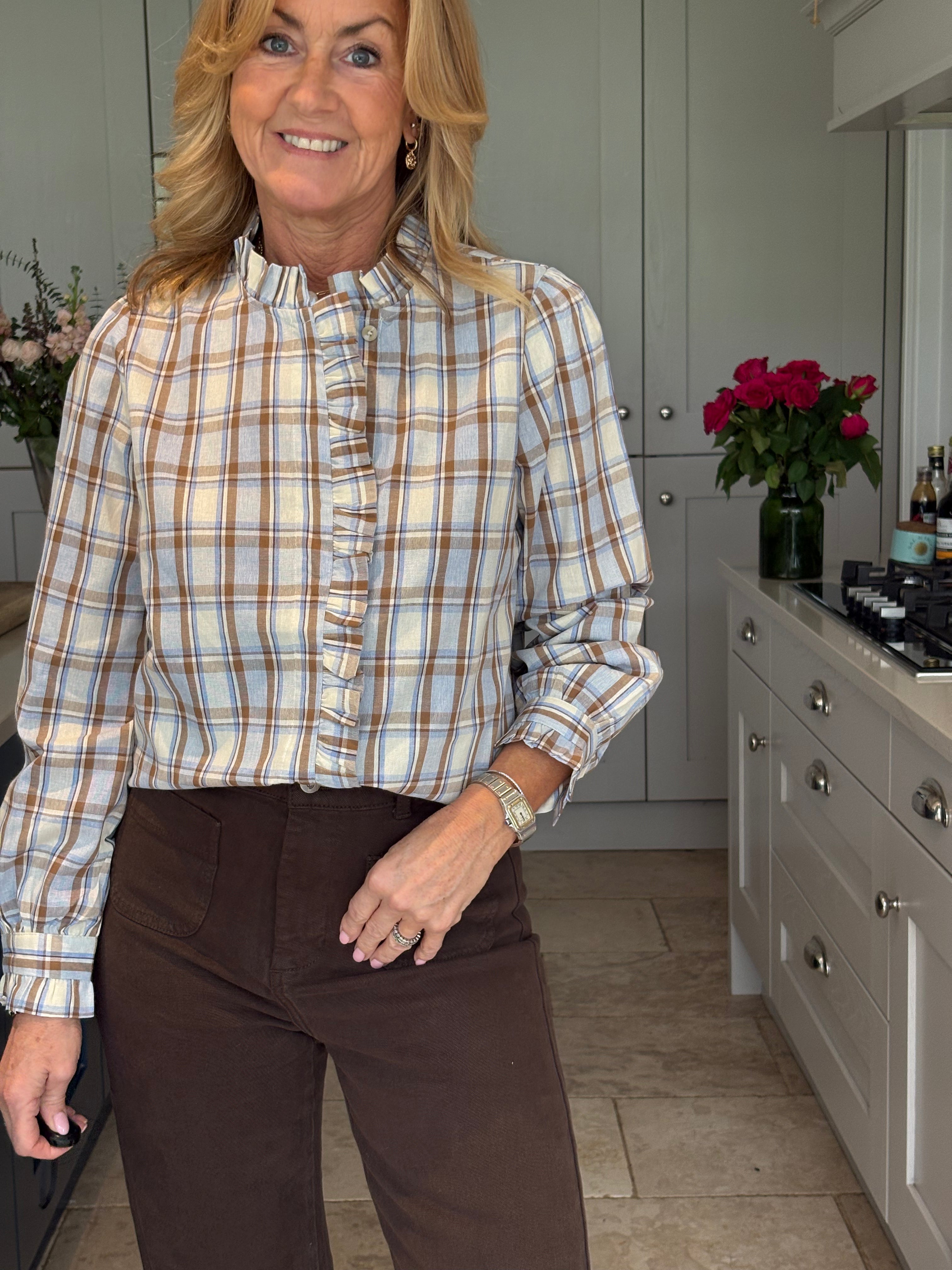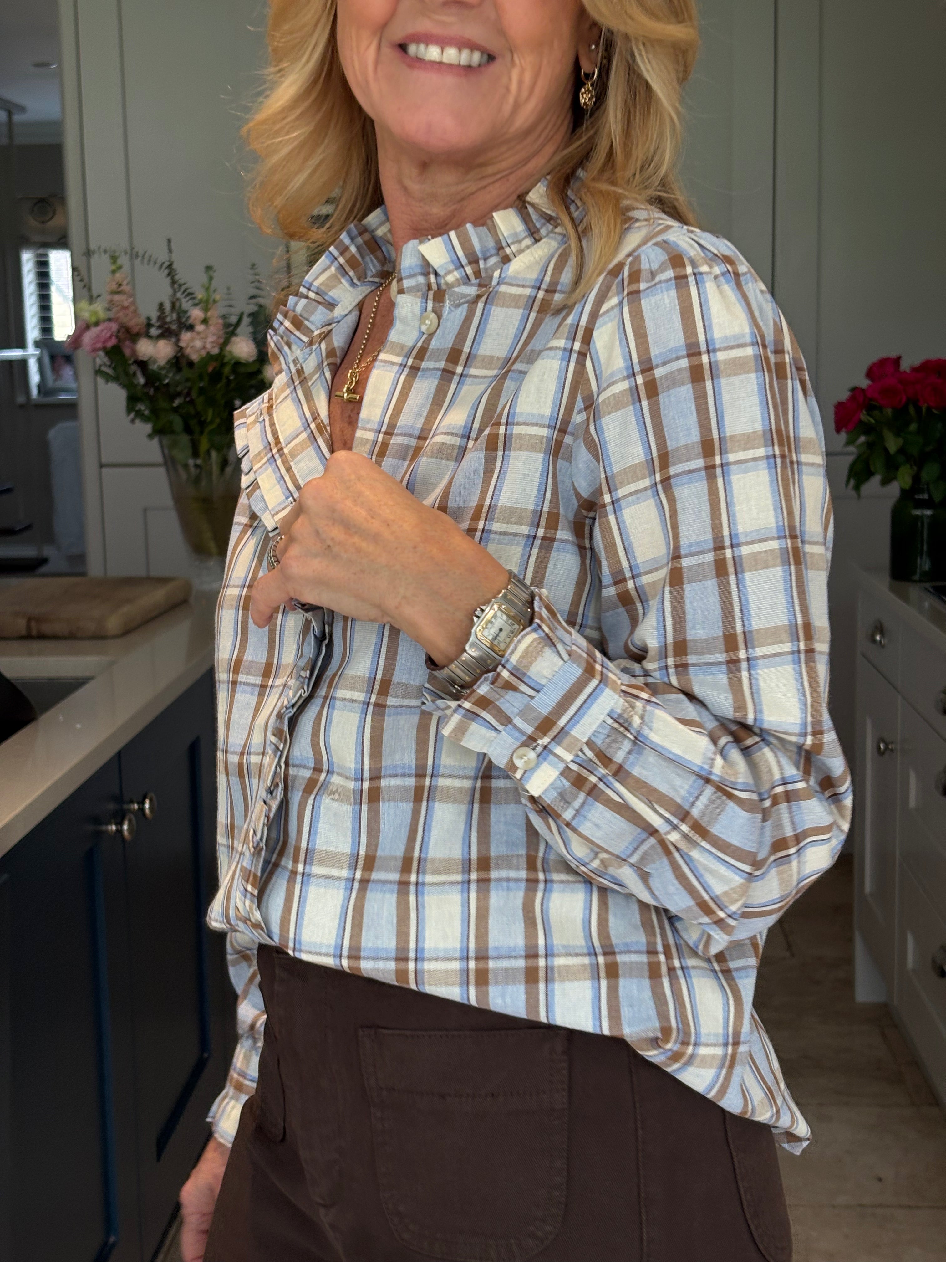A beautiful cotton blouse in tones of blue, cream and brown in a checked pattern. Soft and pretty, the Aria has a stand up pleated collar and a frill all the way down the front closure. The sleeves are gently puffed and the cuff has the same frill. The Aria is a regular fit blouse which comes in 3 sizes, S, M and L.