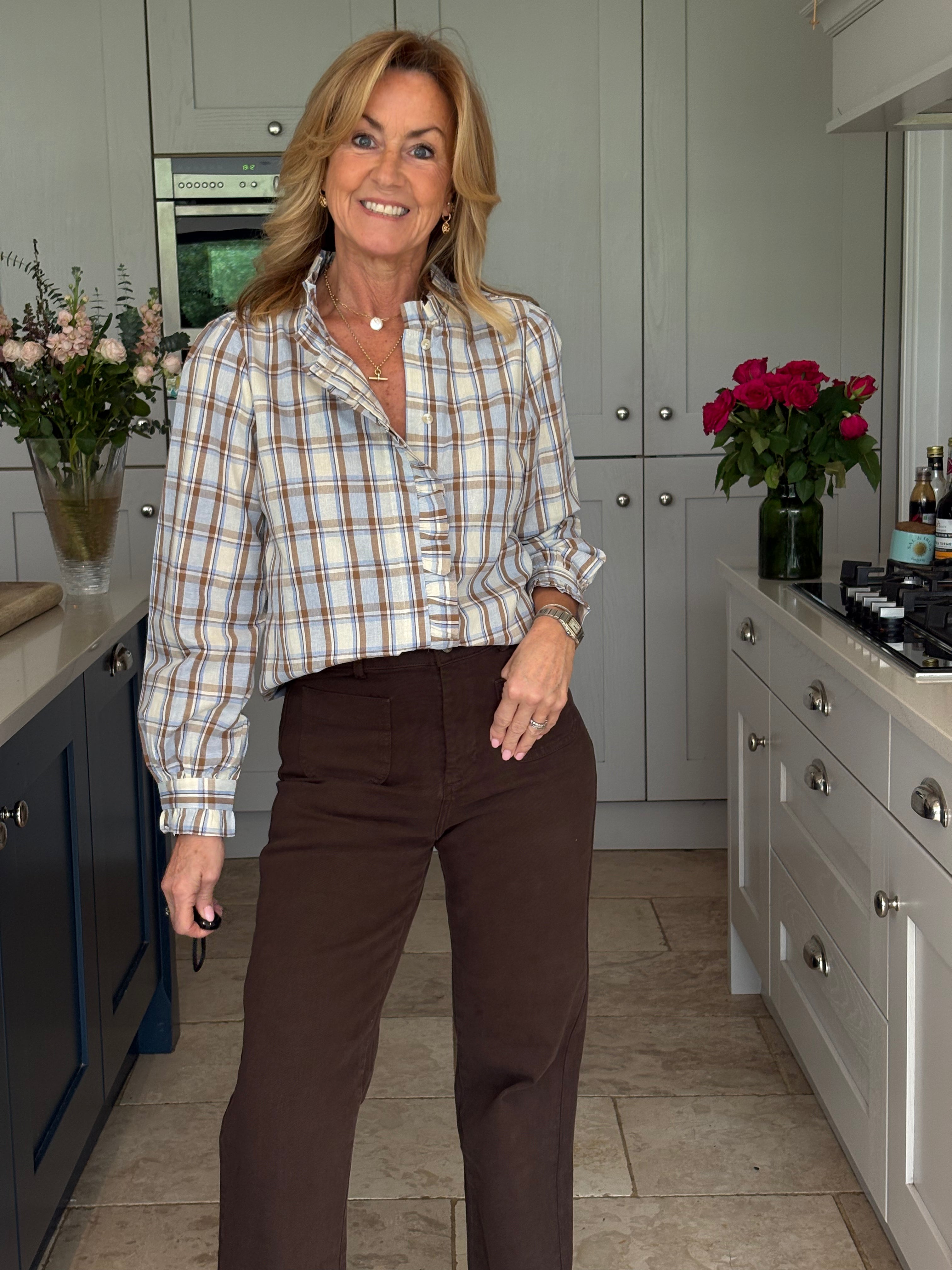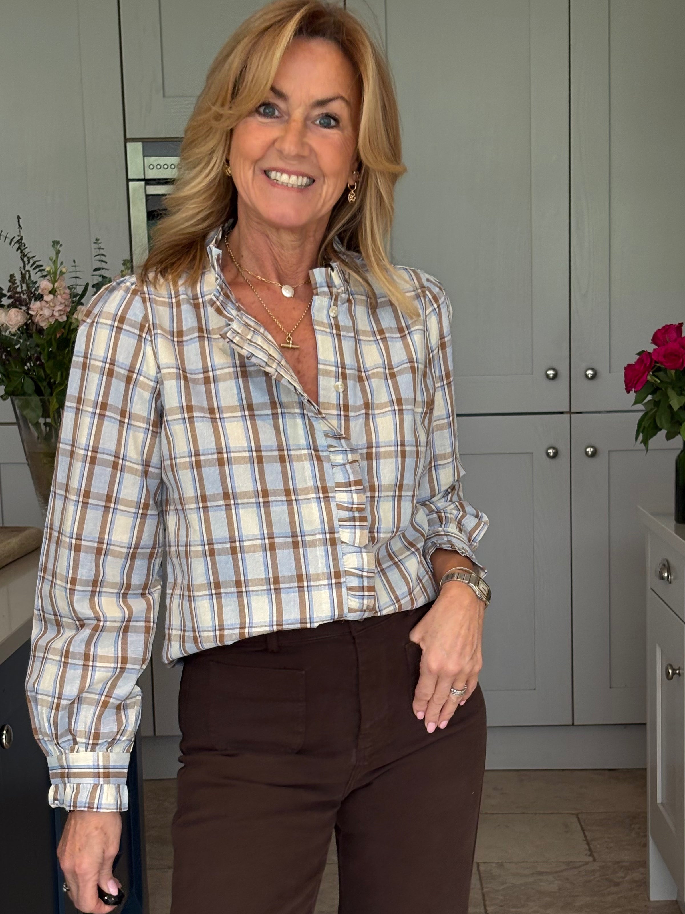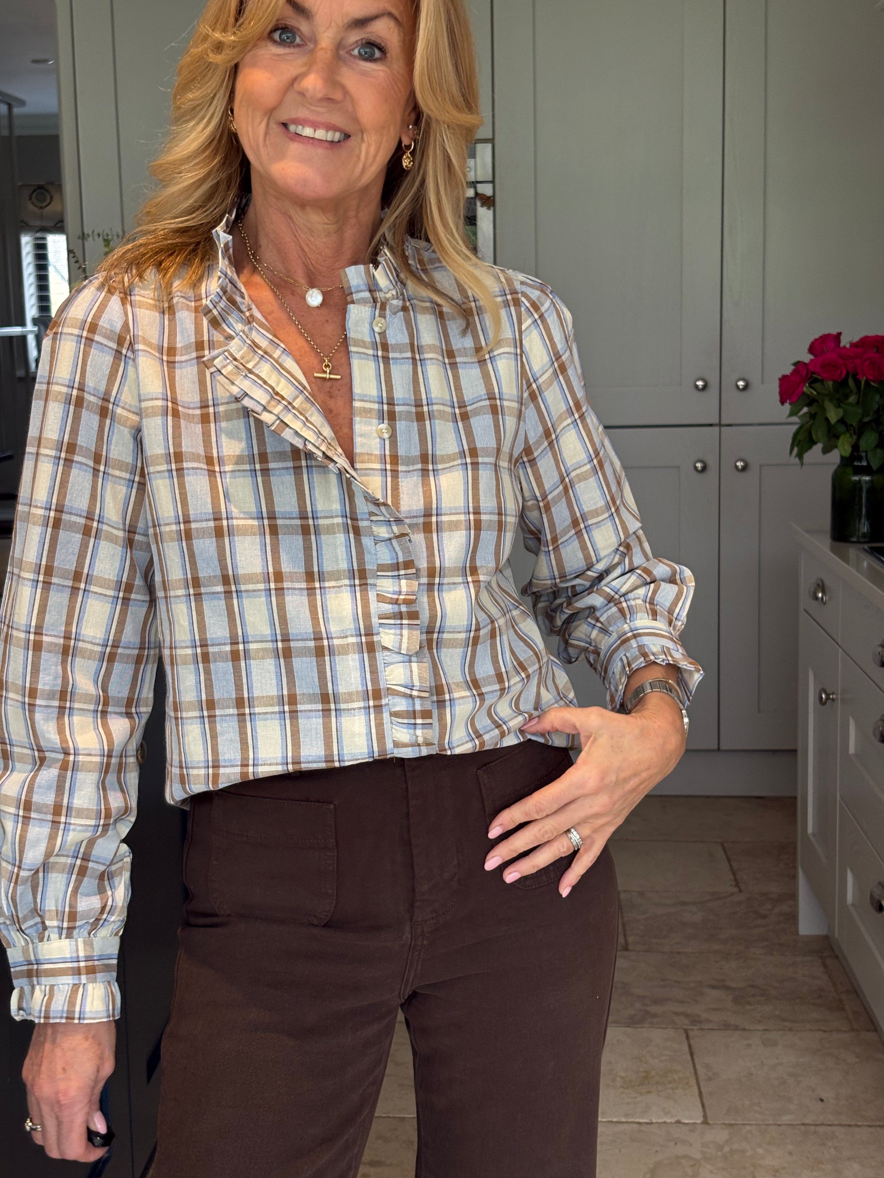 A beautiful cotton blouse in tones of blue, cream and brown in a checked pattern. Soft and pretty, the Aria has a stand up pleated collar and a frill all the way down the front closure. The sleeves are gently puffed and the cuff has the same frill. The Aria is a regular fit blouse which comes in 3 sizes, S, M and L.