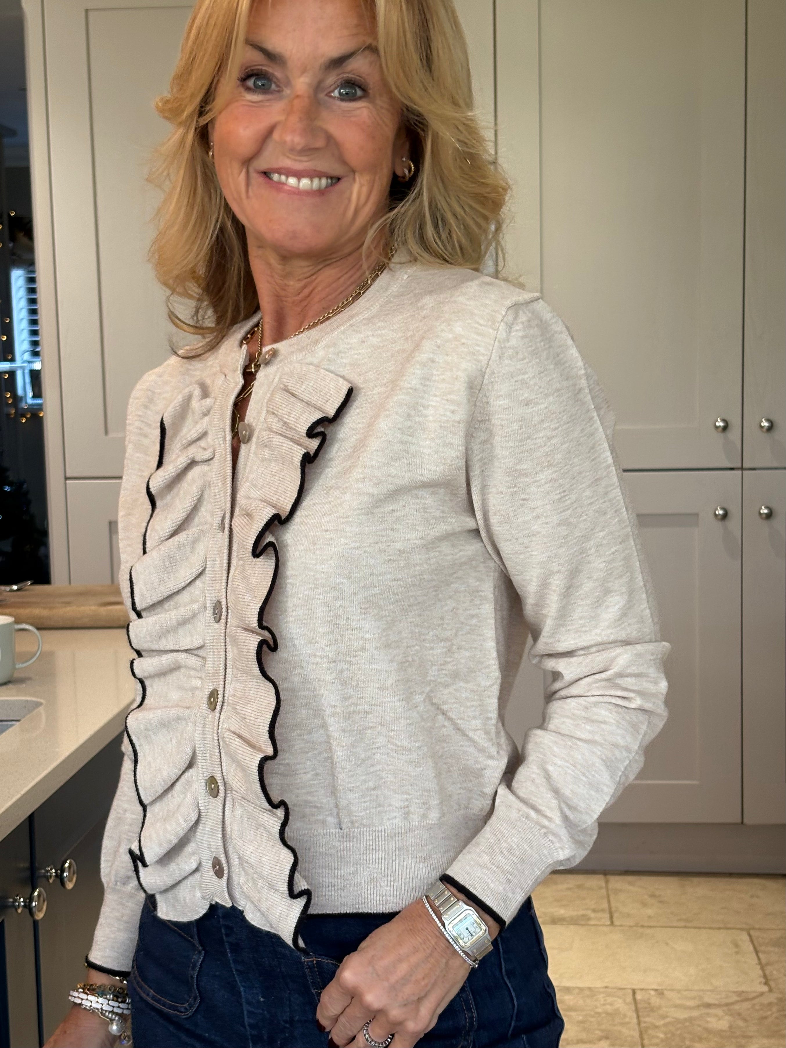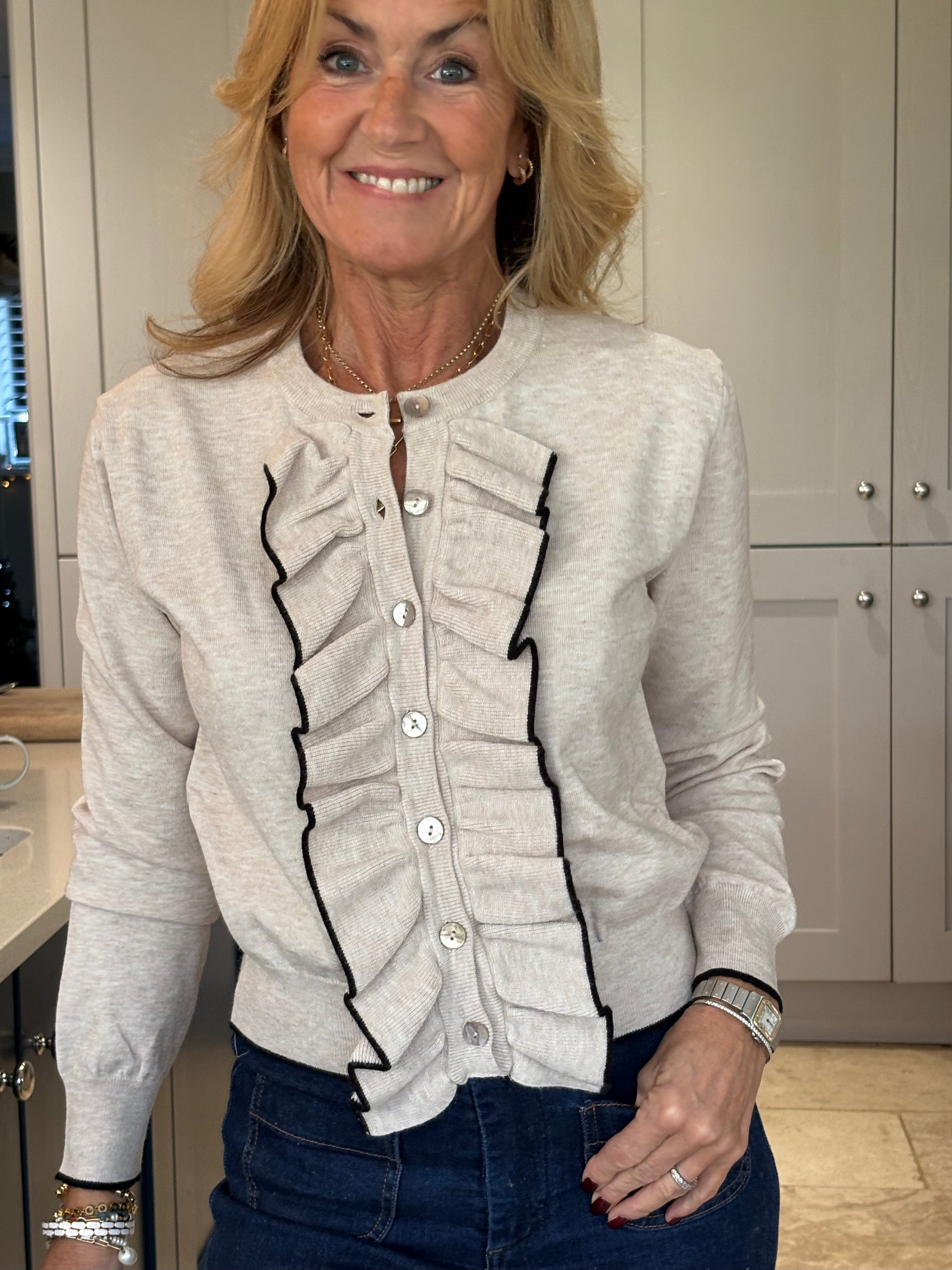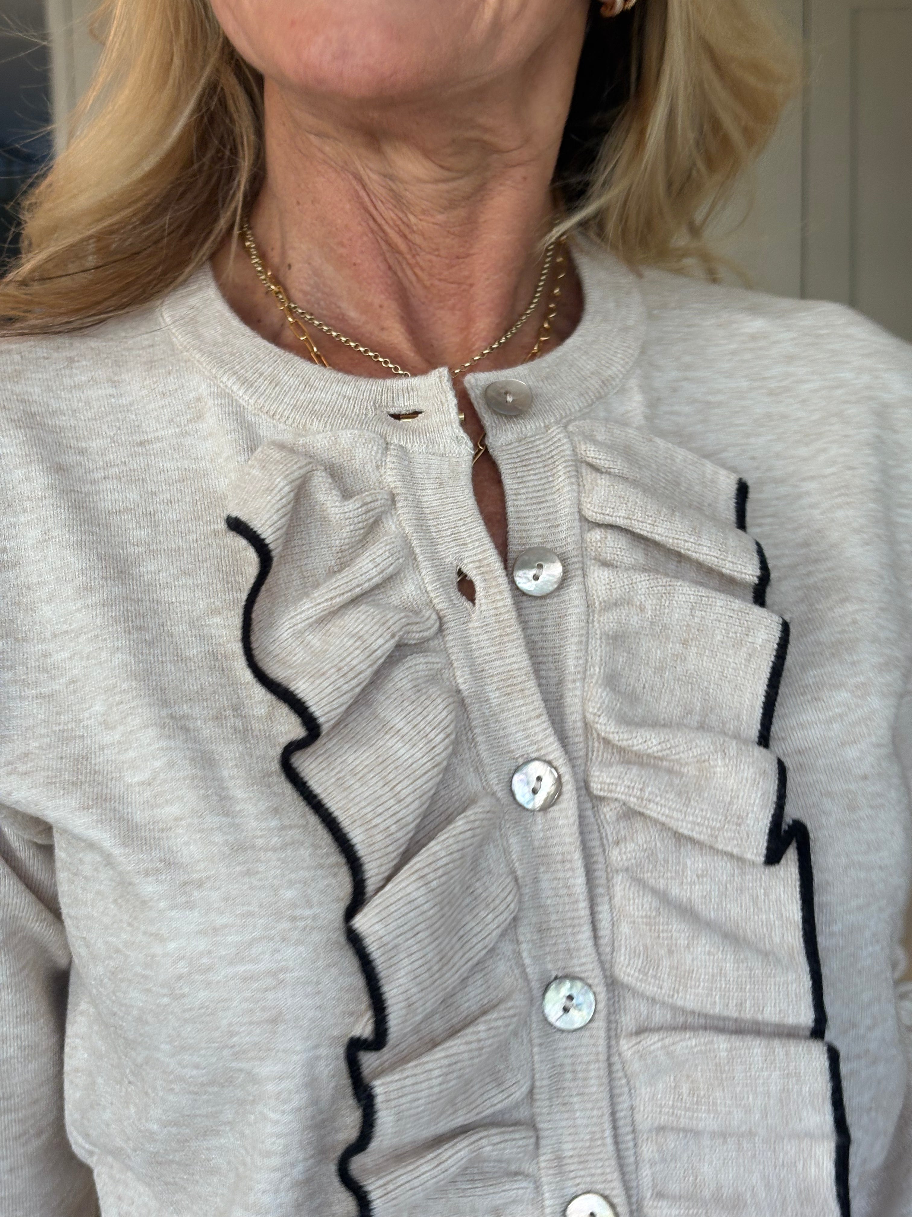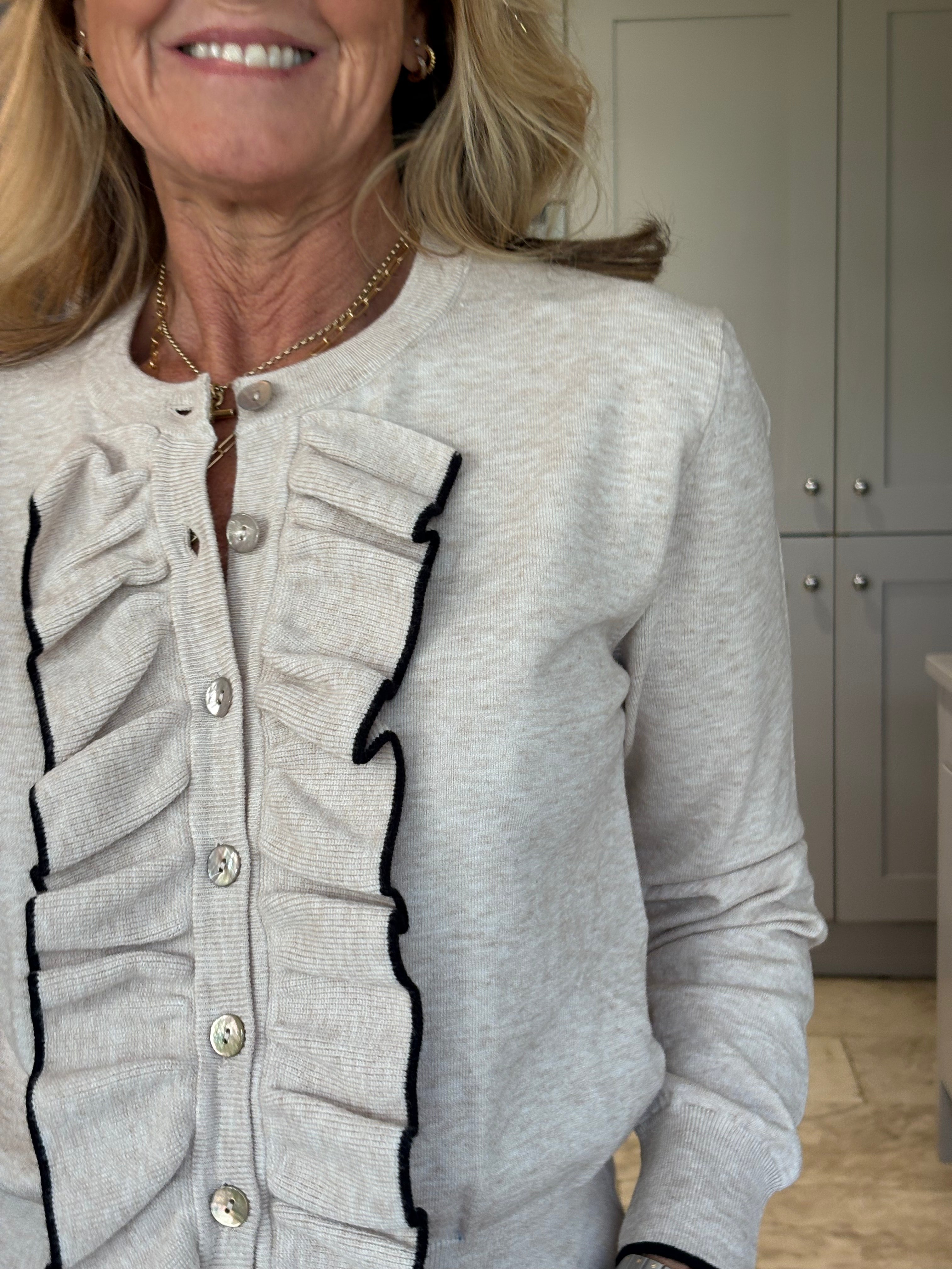 This stunning oatmeal-colored short cardigan features a classic crew neckline that offers a timeless appeal. The buttoned-down front is beautifully accentuated by a gorgeous frill trim, which is elegantly outlined in black, adding a striking contrast and a touch of sophistication. The design strikes the perfect balance between dressy and casual, making it an ideal layering piece for various occasions. Whether paired with a simple tee and jeans for a relaxed look or layered over a dress for a more polished ensemble, this cardigan is versatile and stylish, making it a must-have addition to your wardrobe.