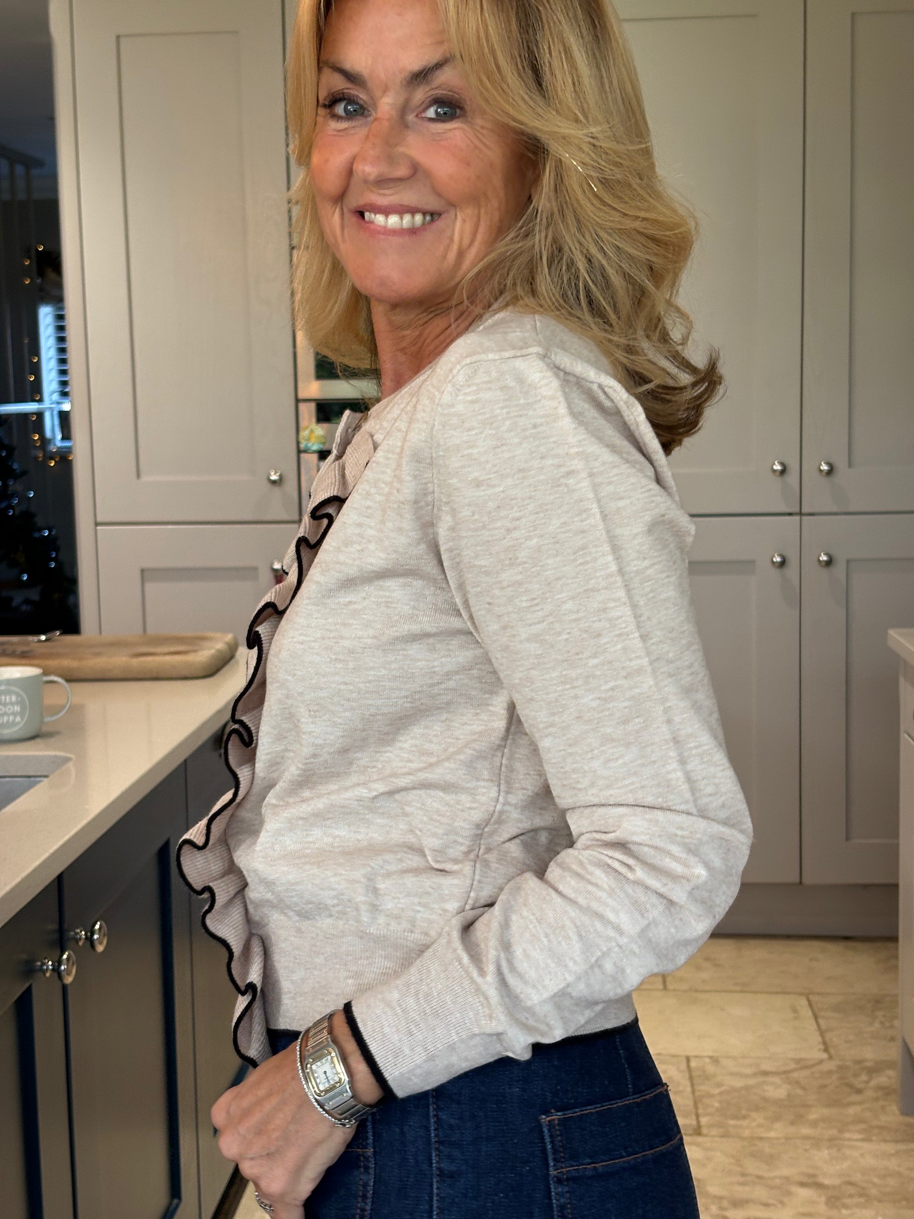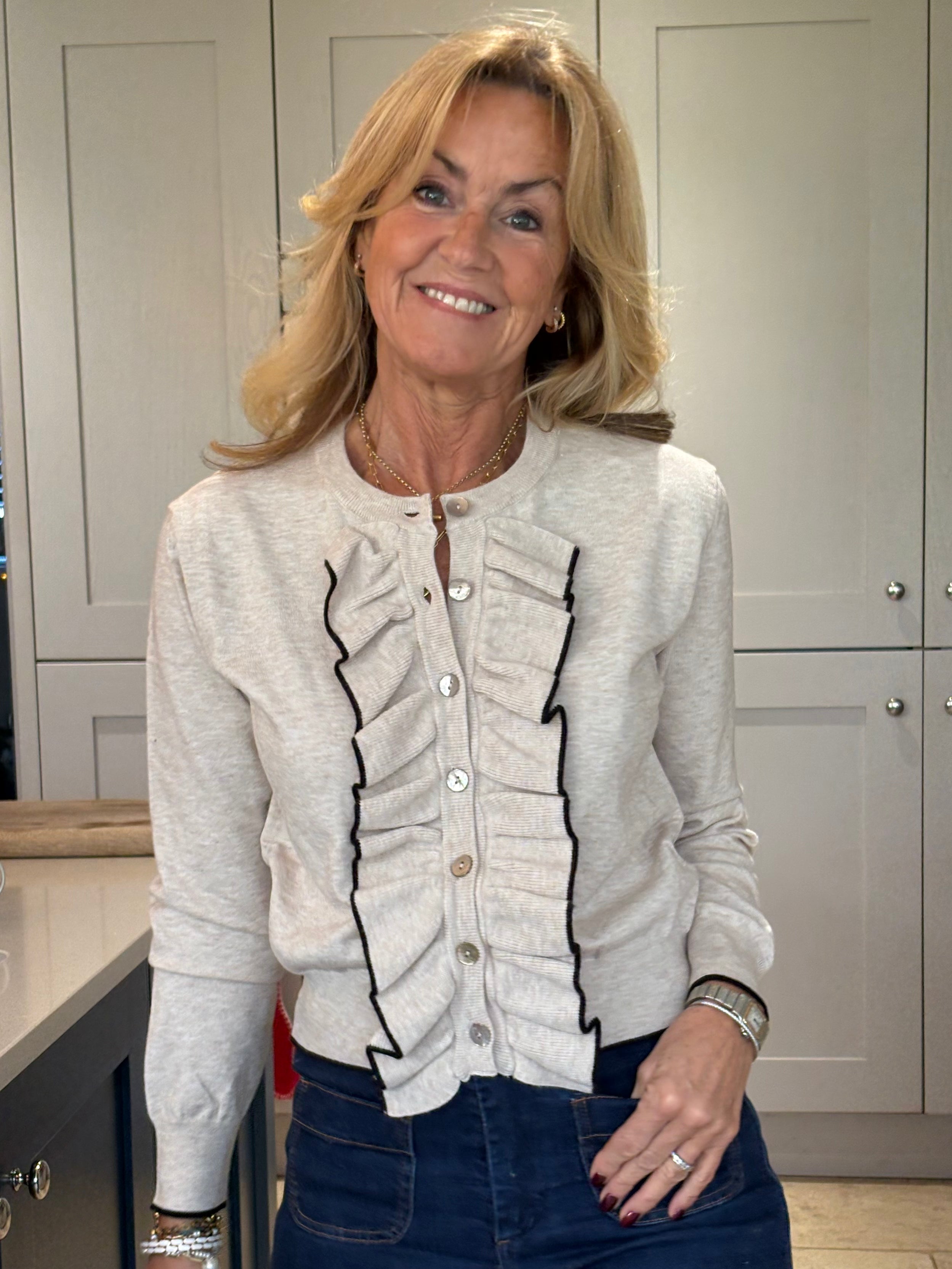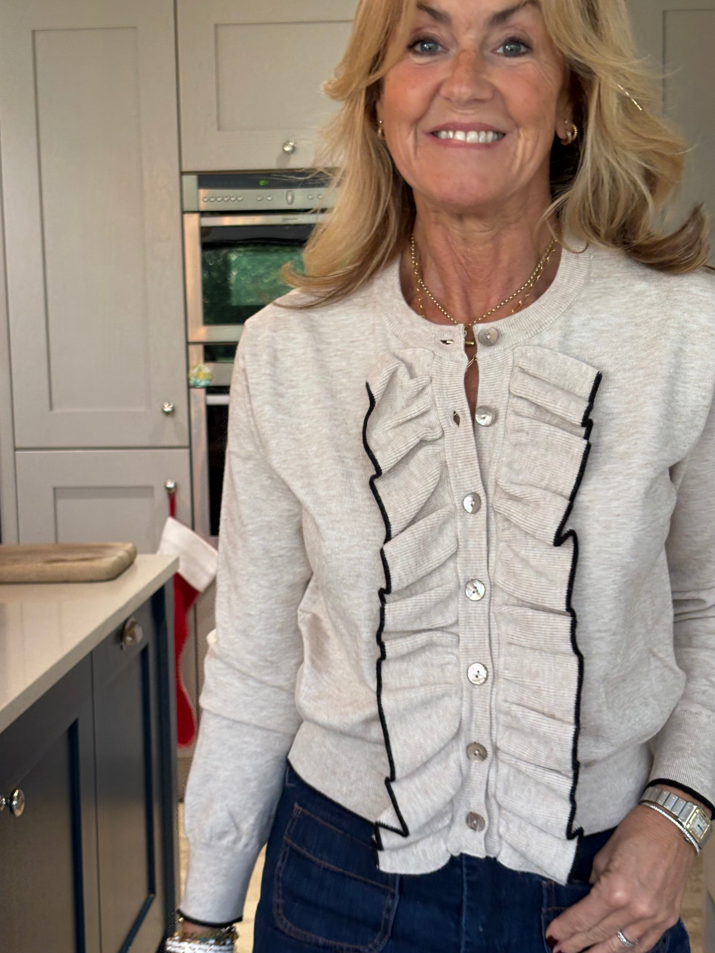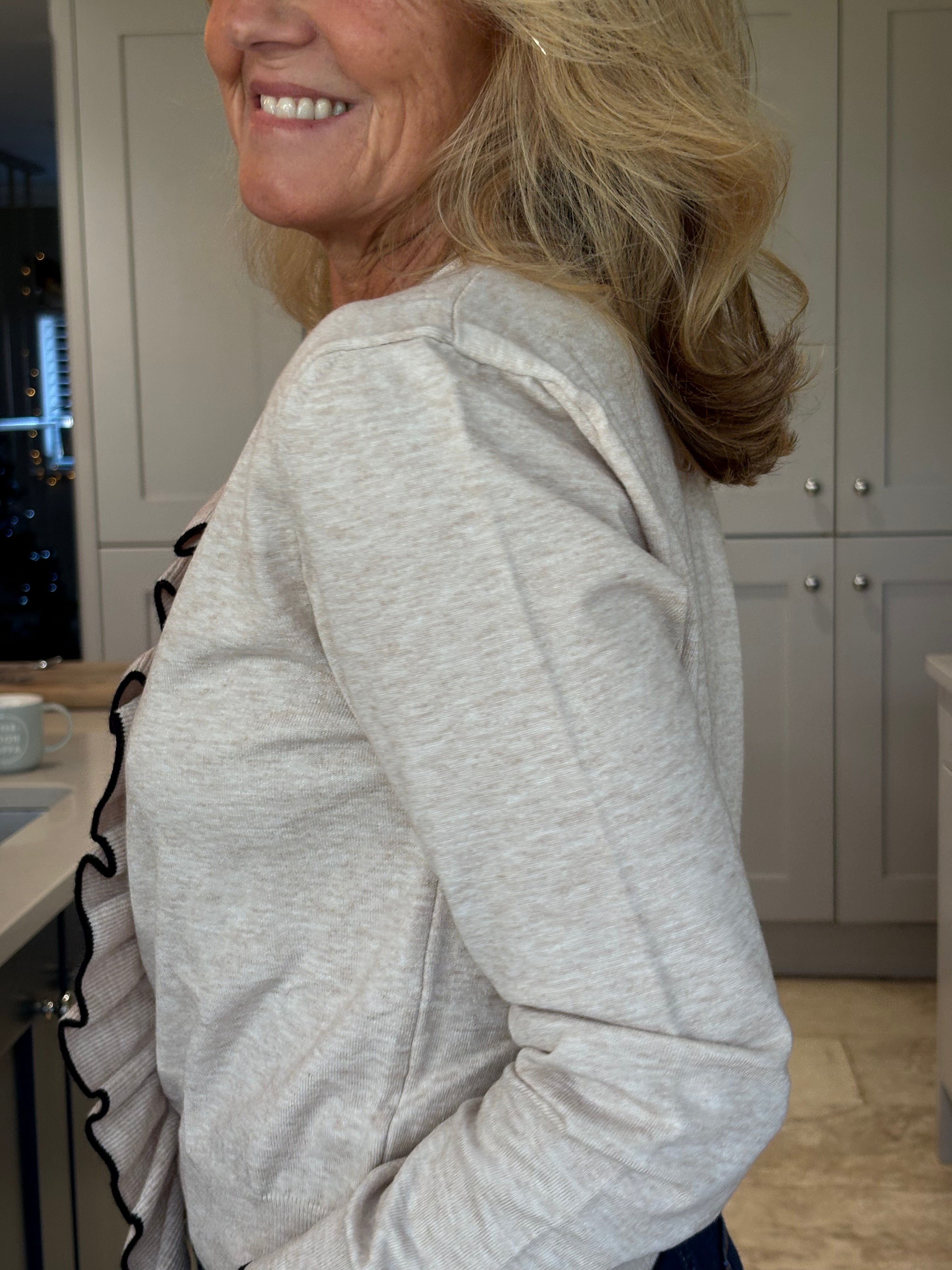 This stunning oatmeal-colored short cardigan features a classic crew neckline that offers a timeless appeal. The buttoned-down front is beautifully accentuated by a gorgeous frill trim, which is elegantly outlined in black, adding a striking contrast and a touch of sophistication. The design strikes the perfect balance between dressy and casual, making it an ideal layering piece for various occasions. Whether paired with a simple tee and jeans for a relaxed look or layered over a dress for a more polished ensemble, this cardigan is versatile and stylish, making it a must-have addition to your wardrobe.