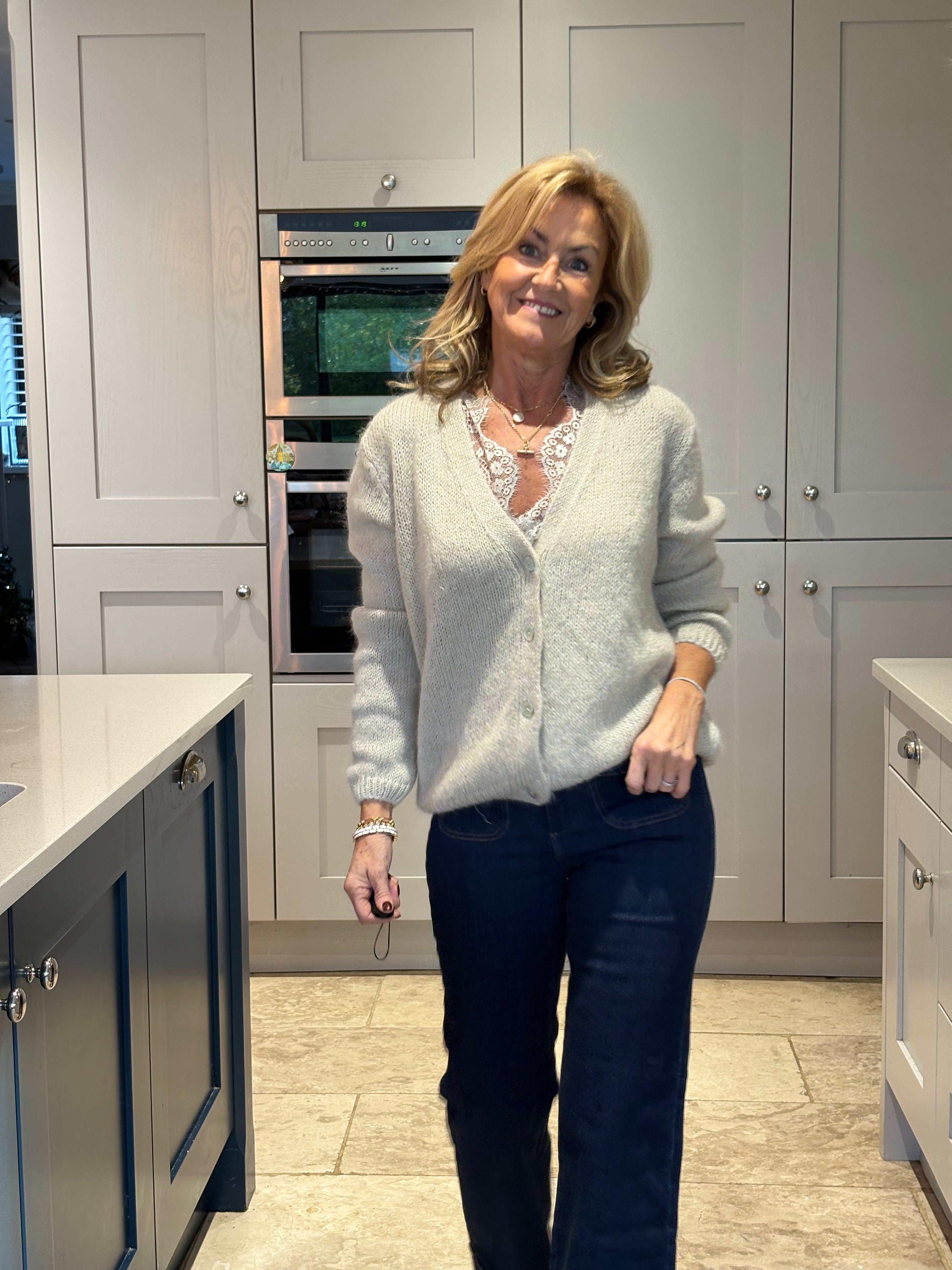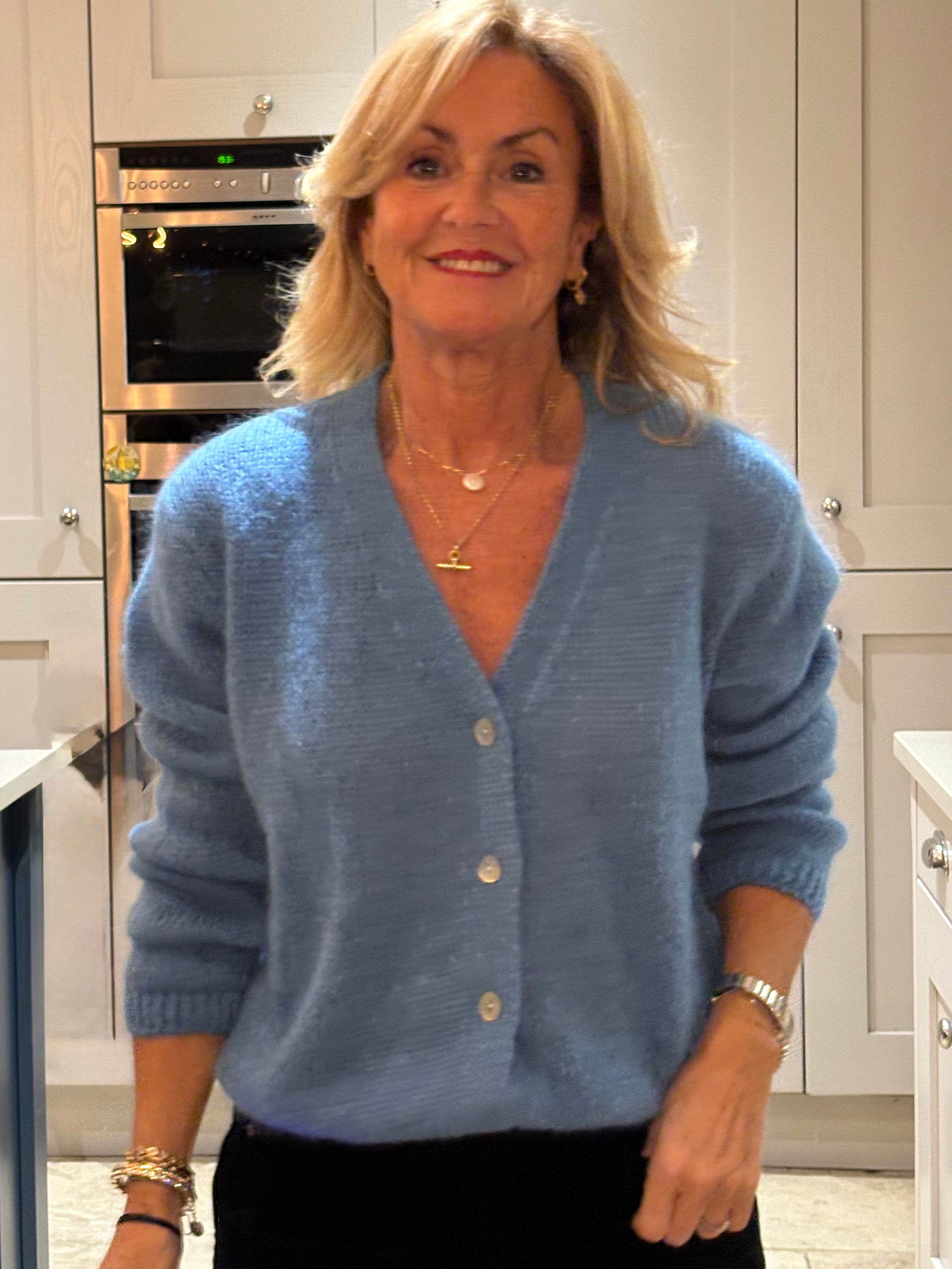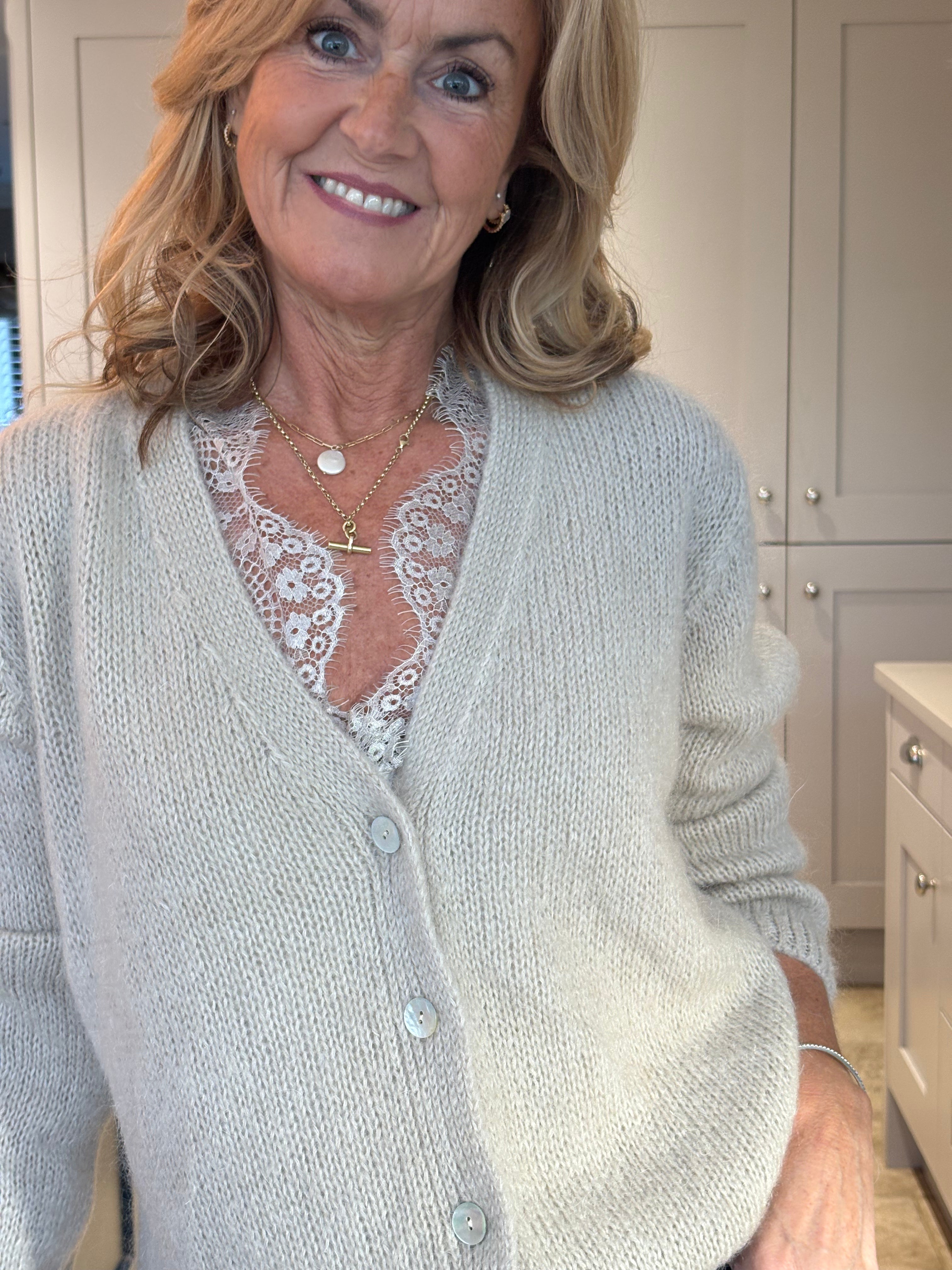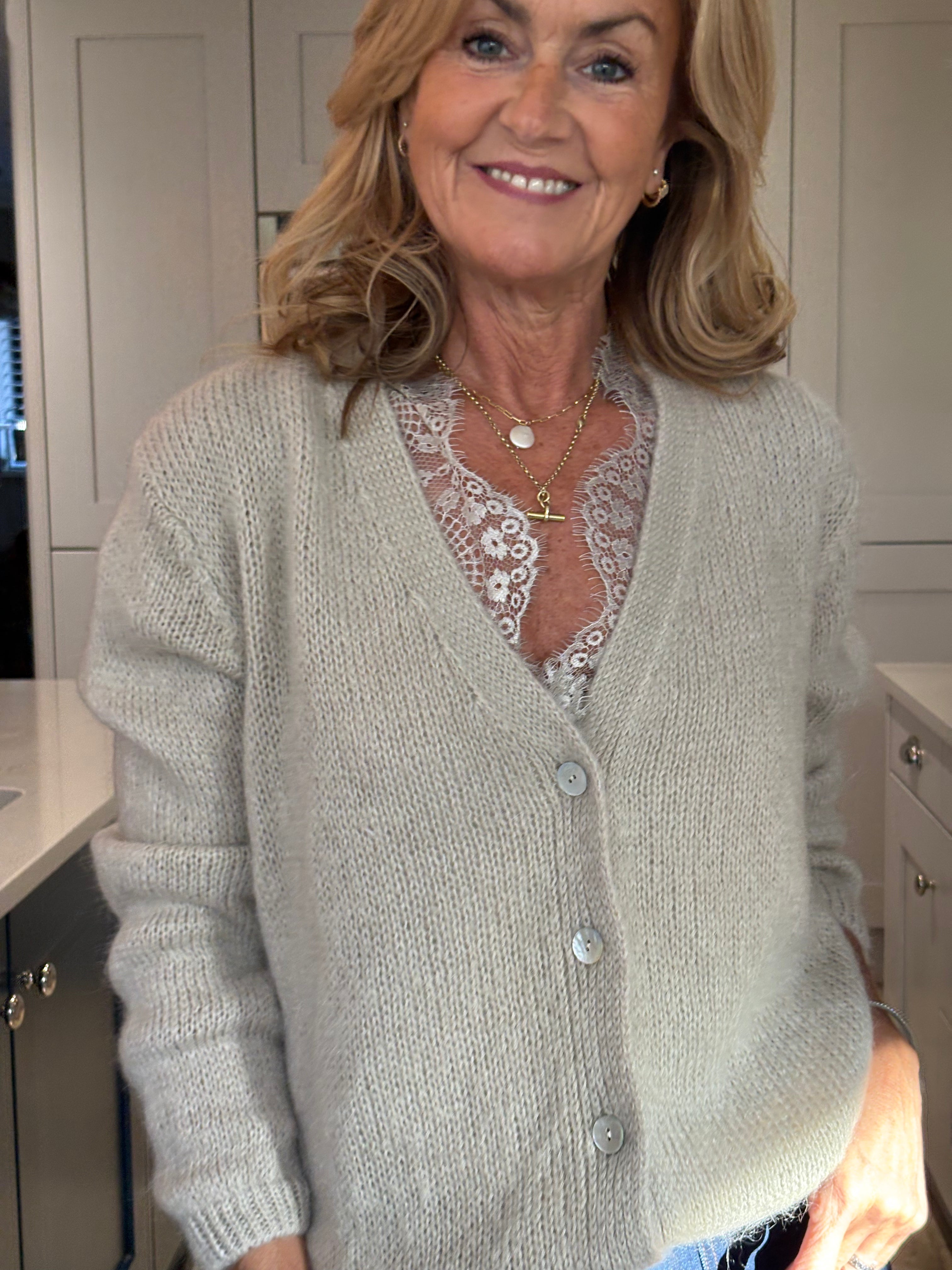 A gorgeous soft and slouchy, loose knit mohair mix cardigan with a deep V neckline, making it veratile.  Pair it wirh the Charli cami with the lace trim to dress it up with a skirt or smart trousers,  Wear it with a pair of jeans and a shirt or on it's own with a pair of leggings.  Versatile and useful.  In 2 pretty colours, blue and tuape.  The Betsy is a one size piece (8-14).
