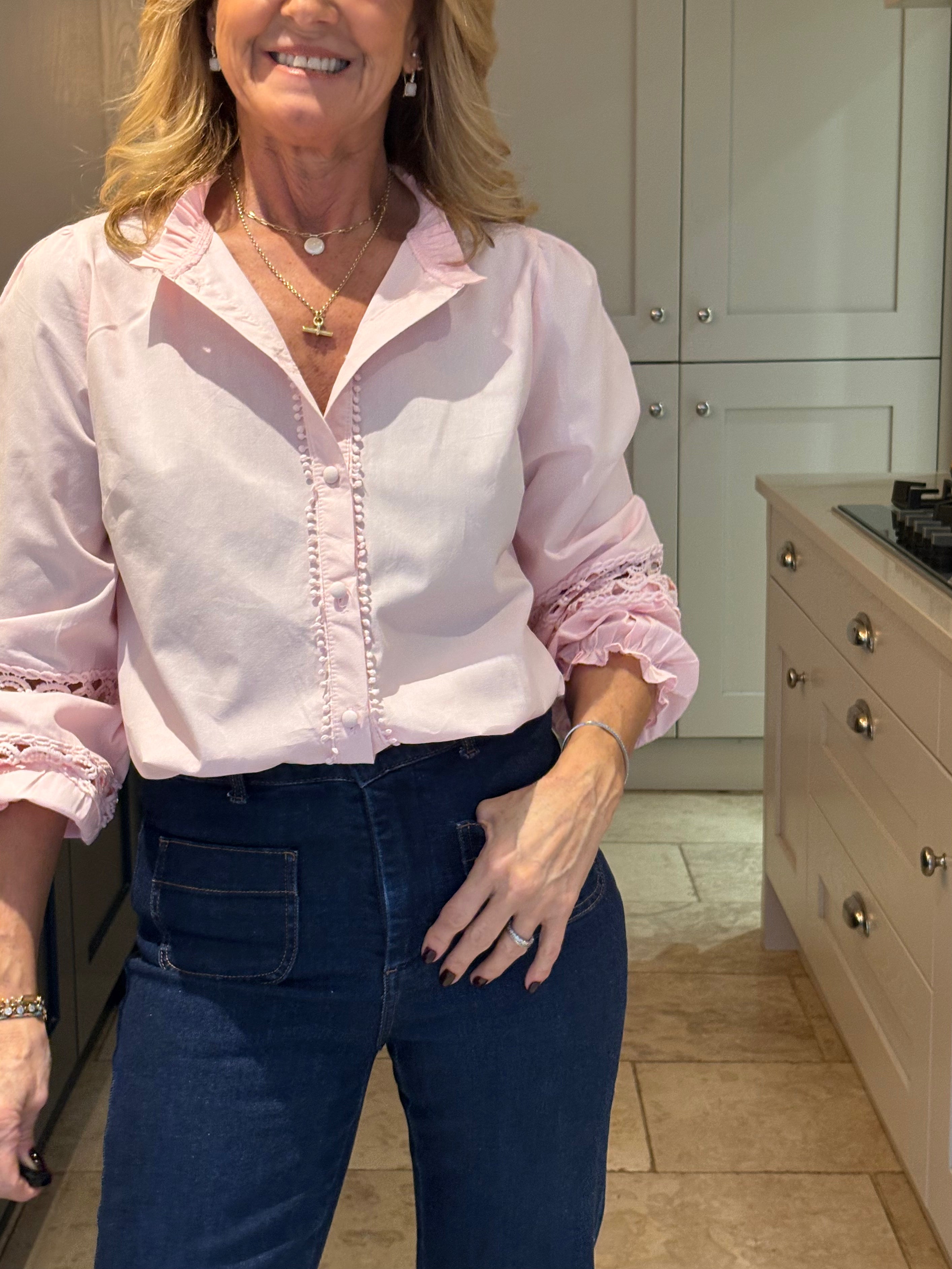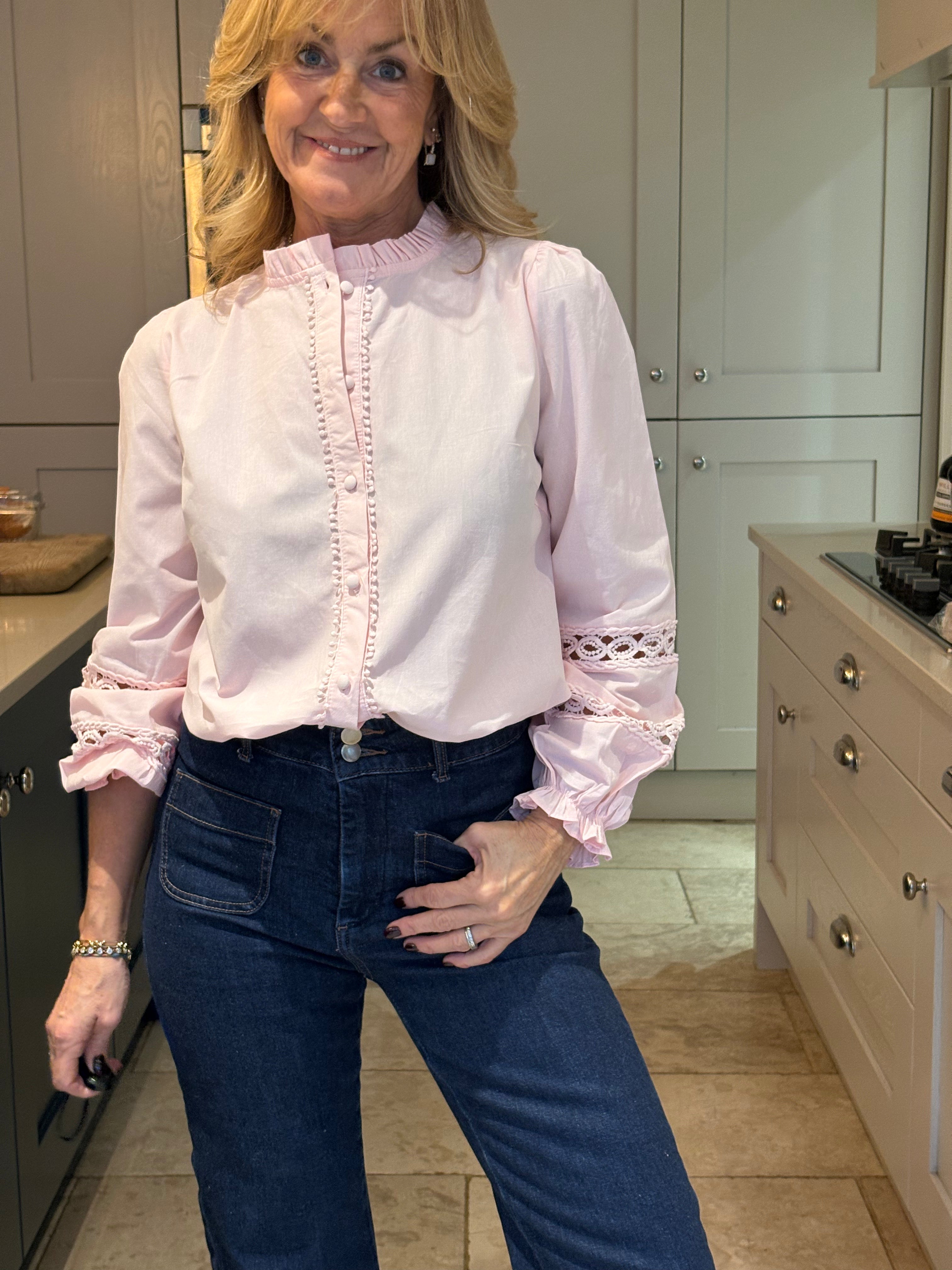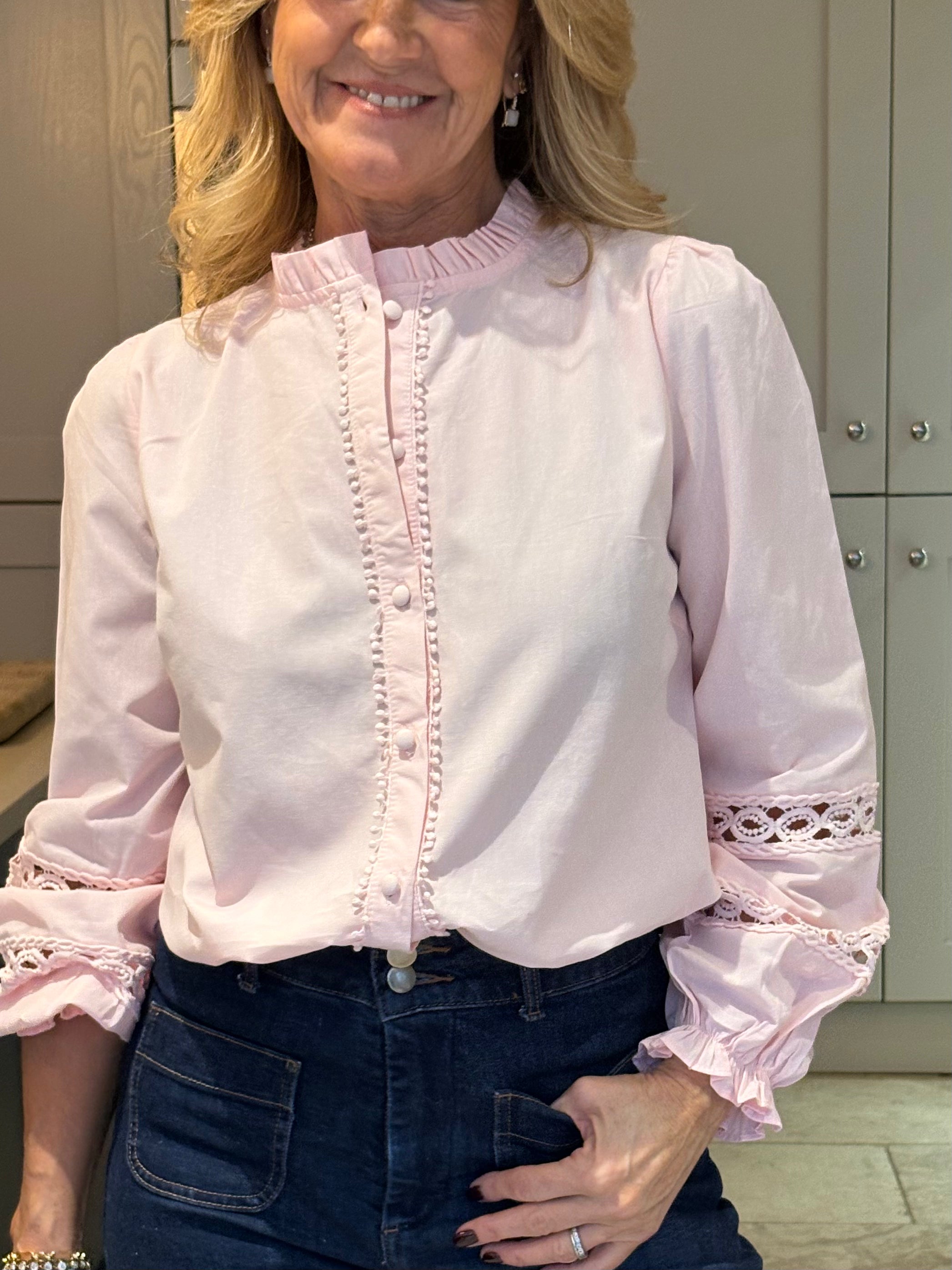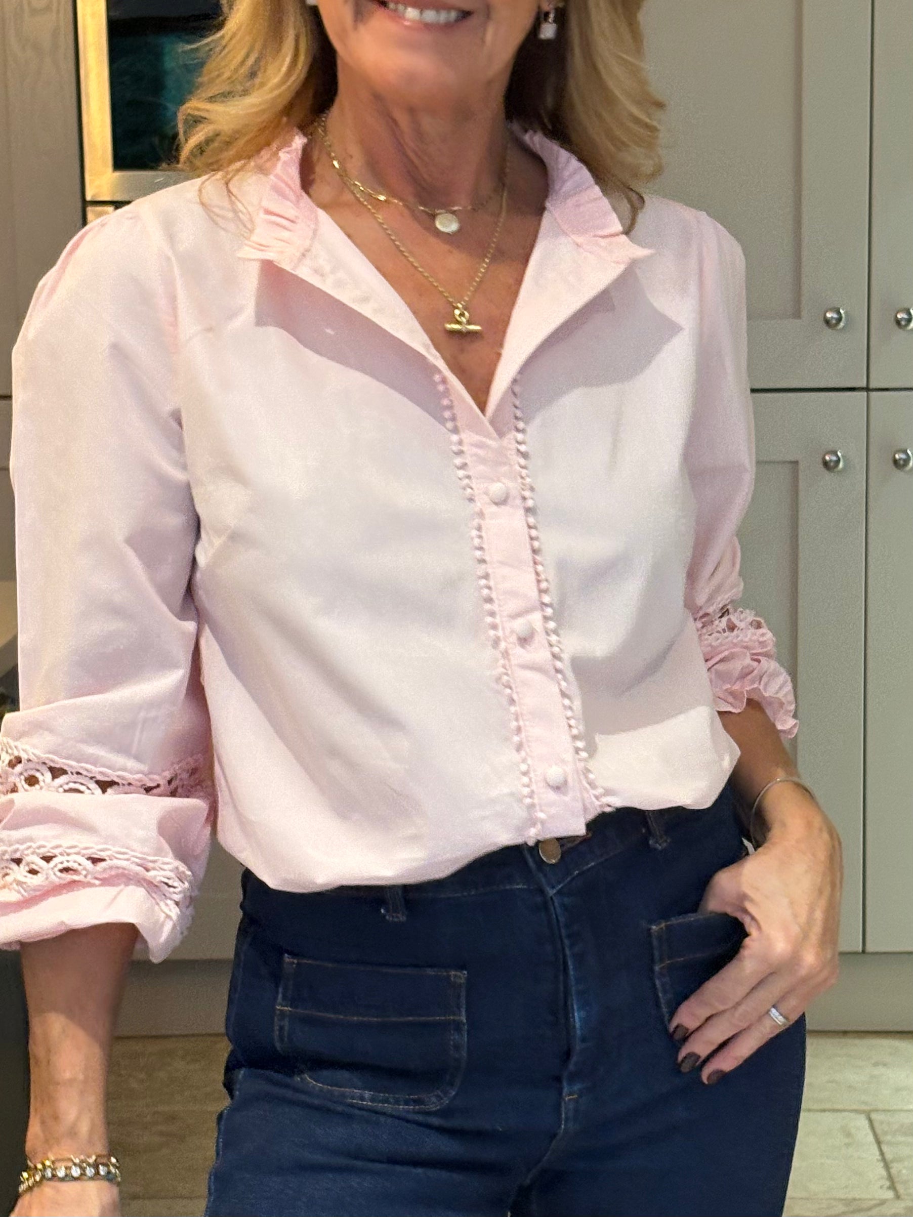 A really frsh and pretty pale pink cotton blouse with a small ruffle stand up collar and buttoned all the way down the front. Gently puffed sleeves with an elasticated frill cuff and detailing on the sleeves. The button down front are bordered with a small pom pom detail giving it a really girlie vibe. The Dalia comes in 2 sizes S/M and M/L.