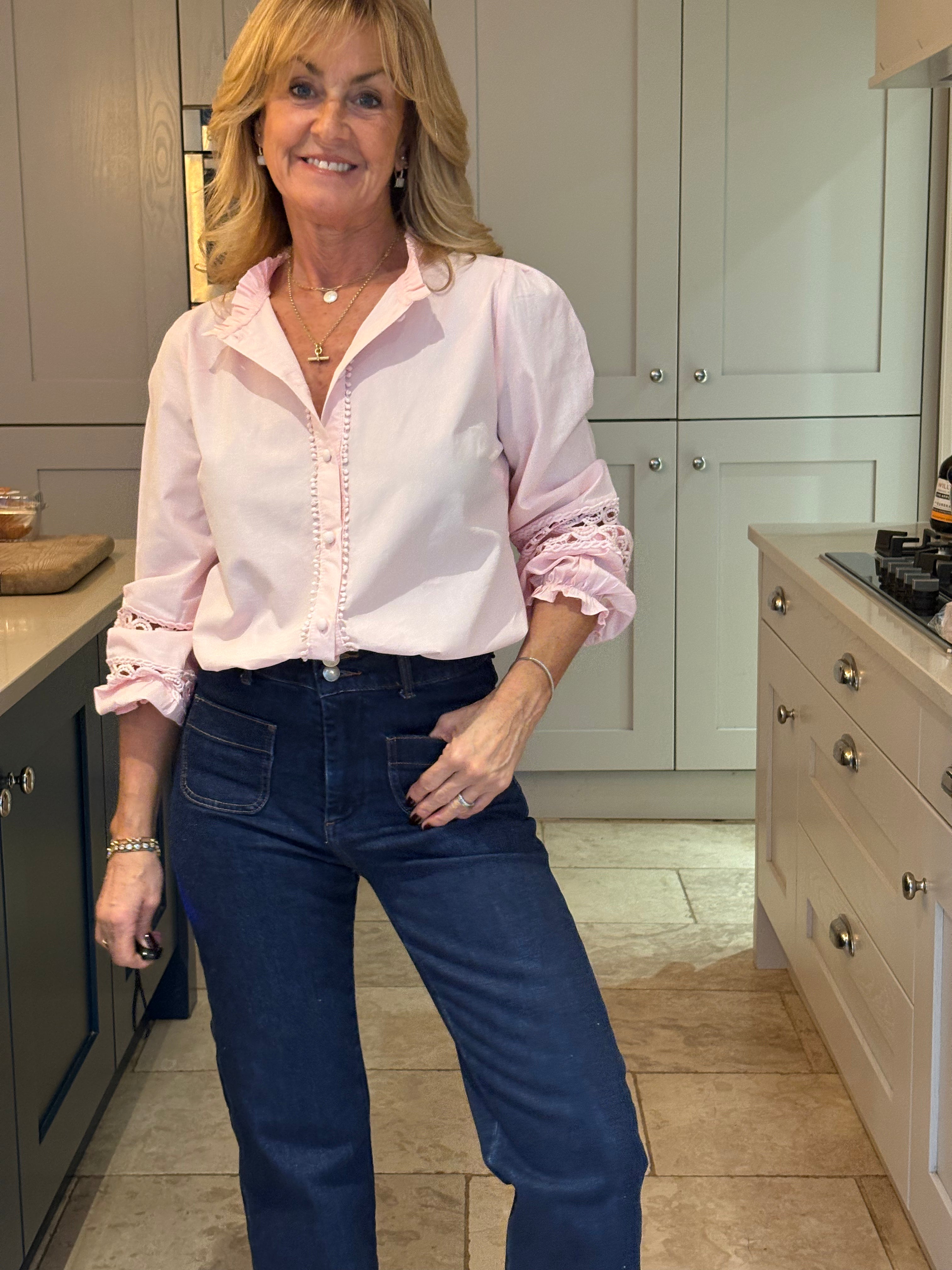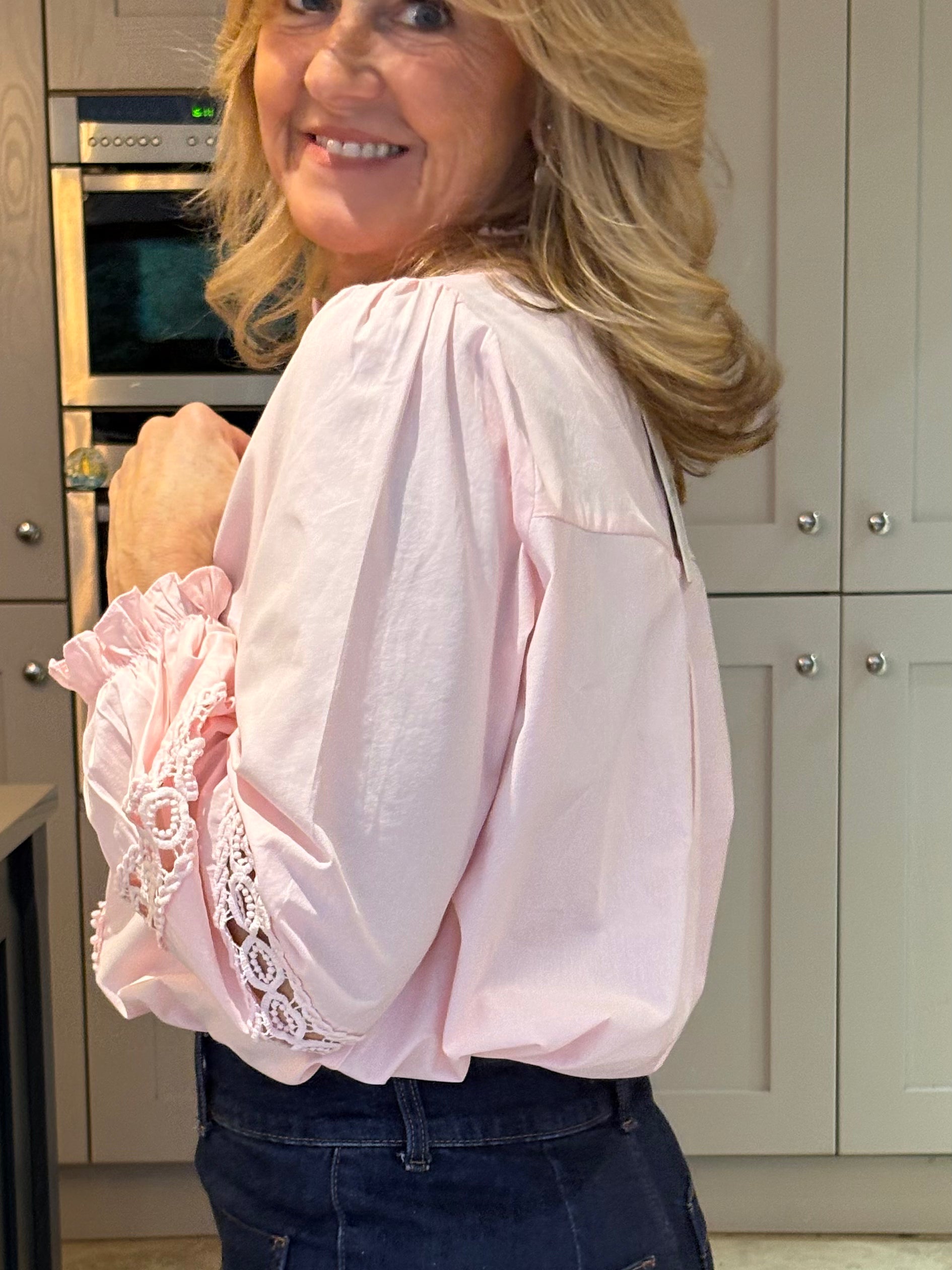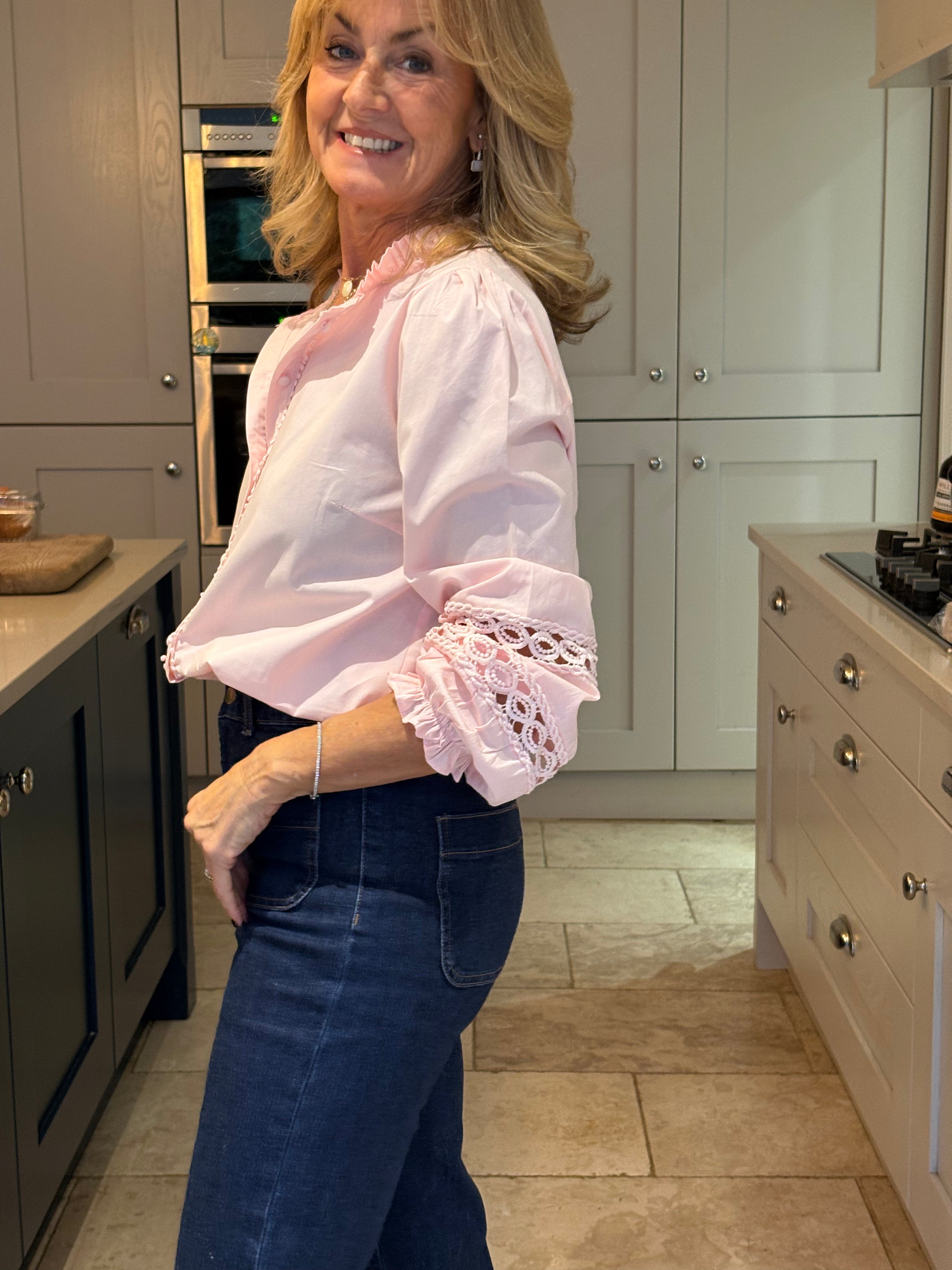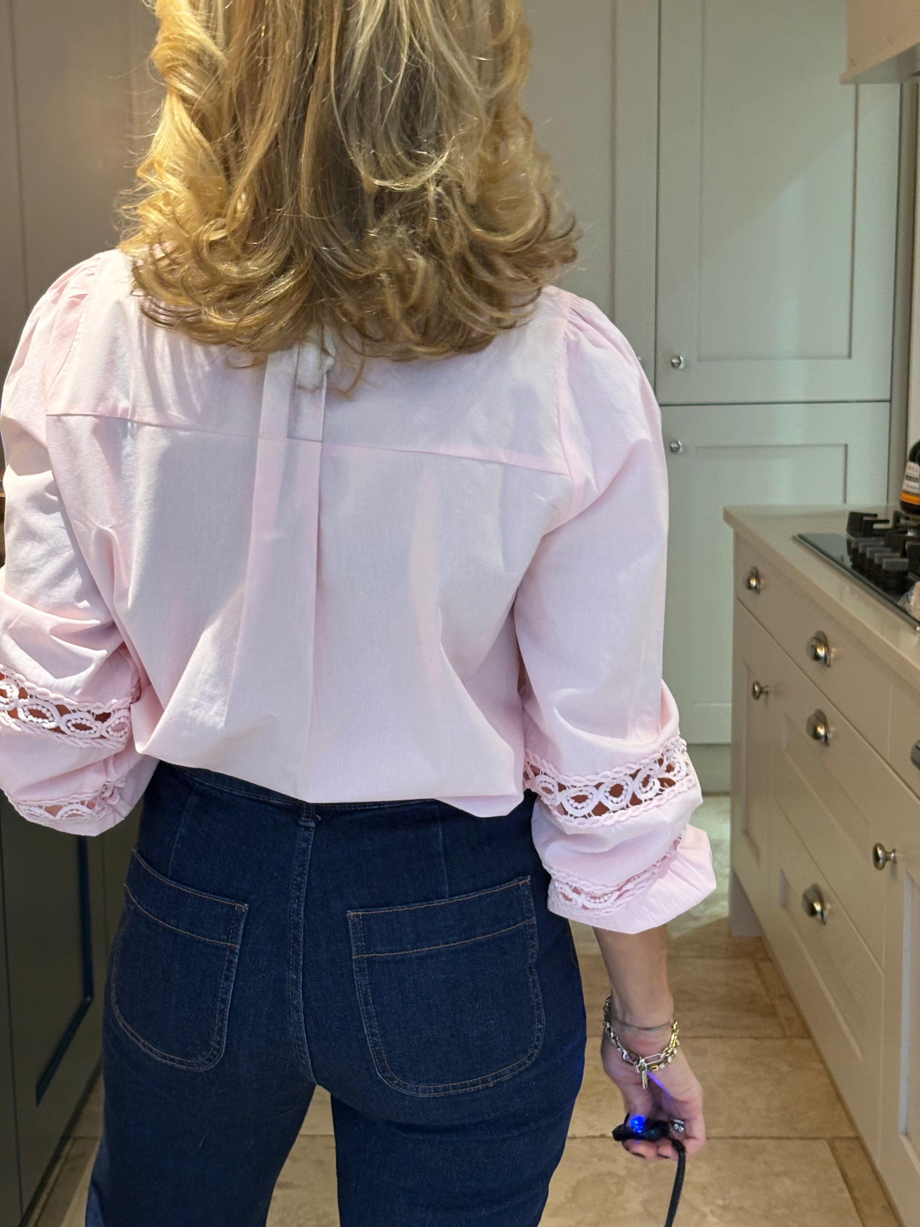 A really frsh and pretty pale pink cotton blouse with a small ruffle stand up collar and buttoned all the way down the front. Gently puffed sleeves with an elasticated frill cuff and detailing on the sleeves. The button down front are bordered with a small pom pom detail giving it a really girlie vibe. The Dalia comes in 2 sizes S/M and M/L.