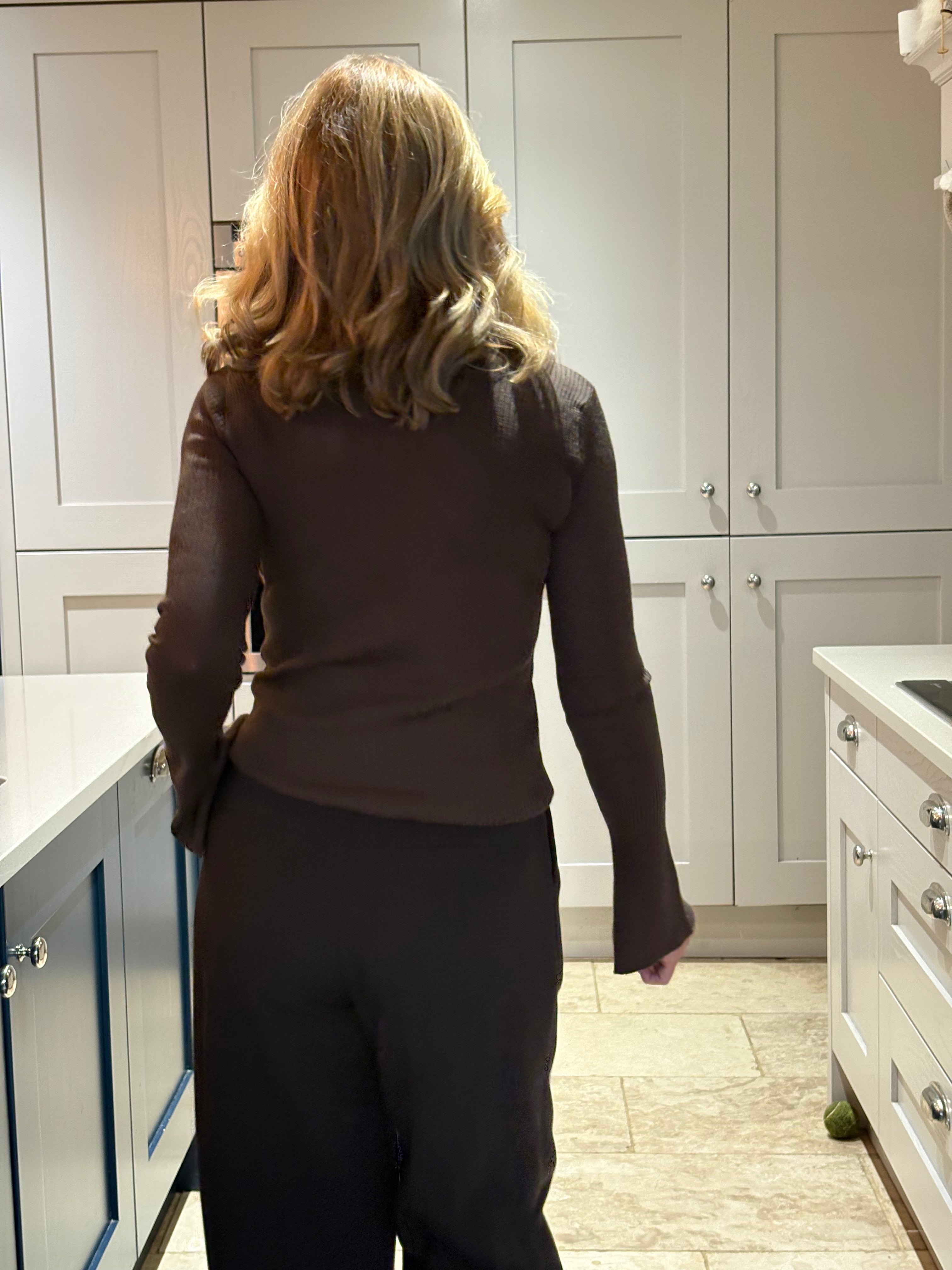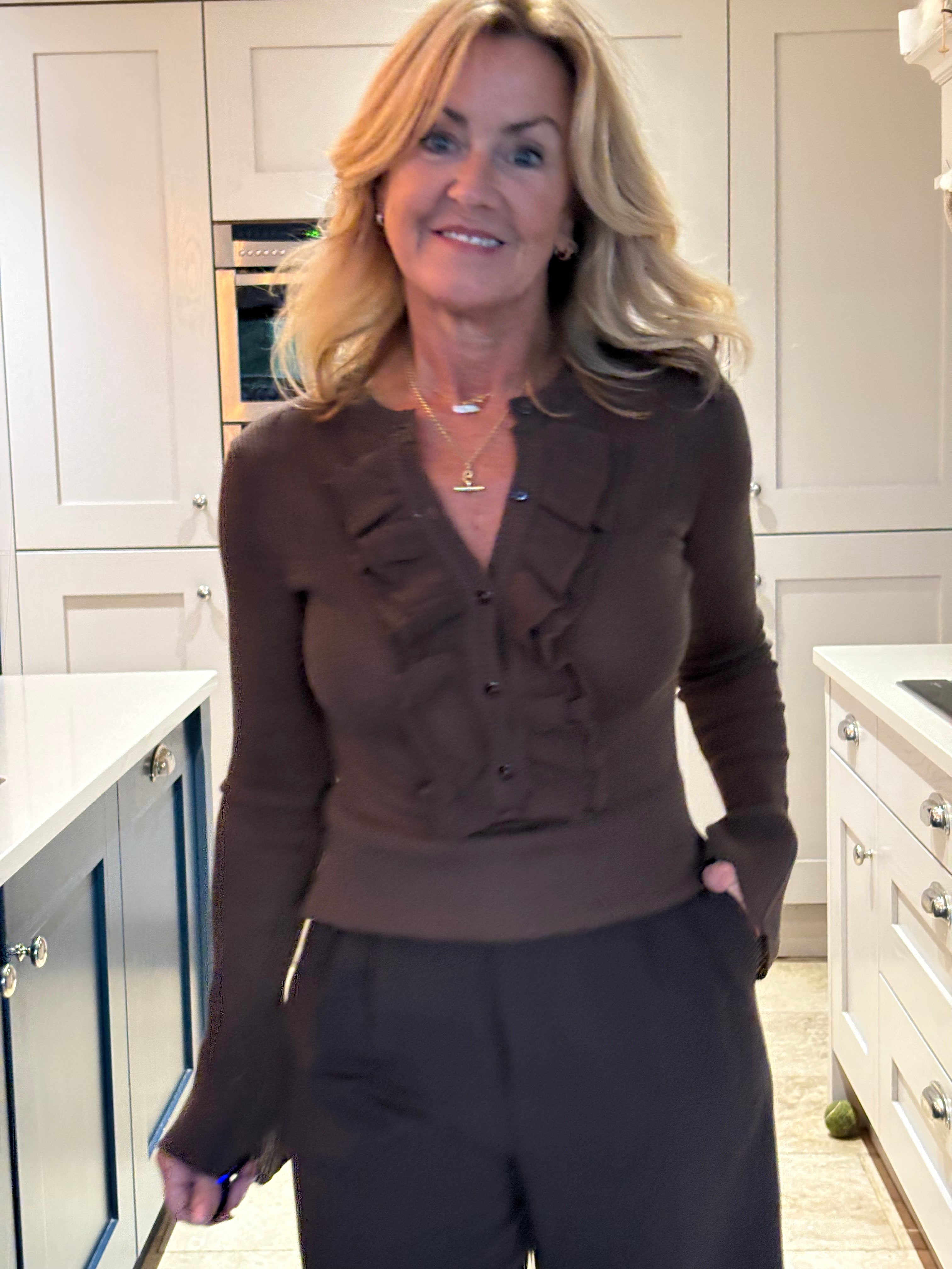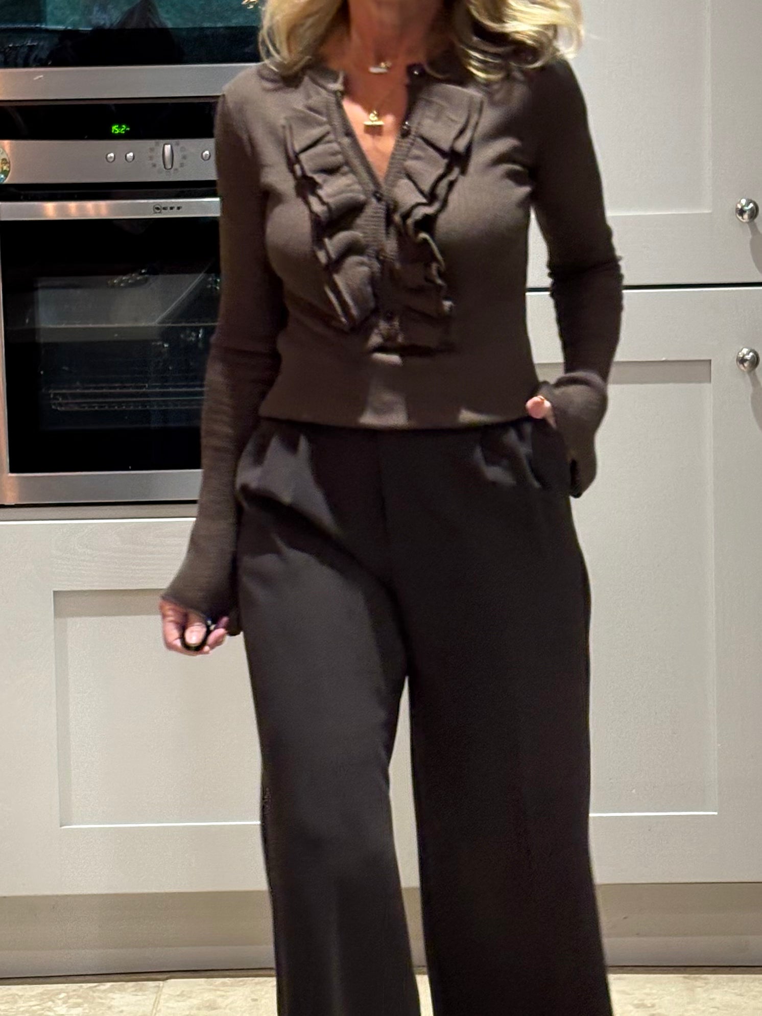 A stunning fine wool mix cardigan with a round neckline. The cardigan is ribbed throughout and is a fitted fit. It has very long fitted sleeves with a bell bottom cuff. It is buttoned down the front and has a gorgeous ruffle making it fun, elegant and very easy to dress up or down.