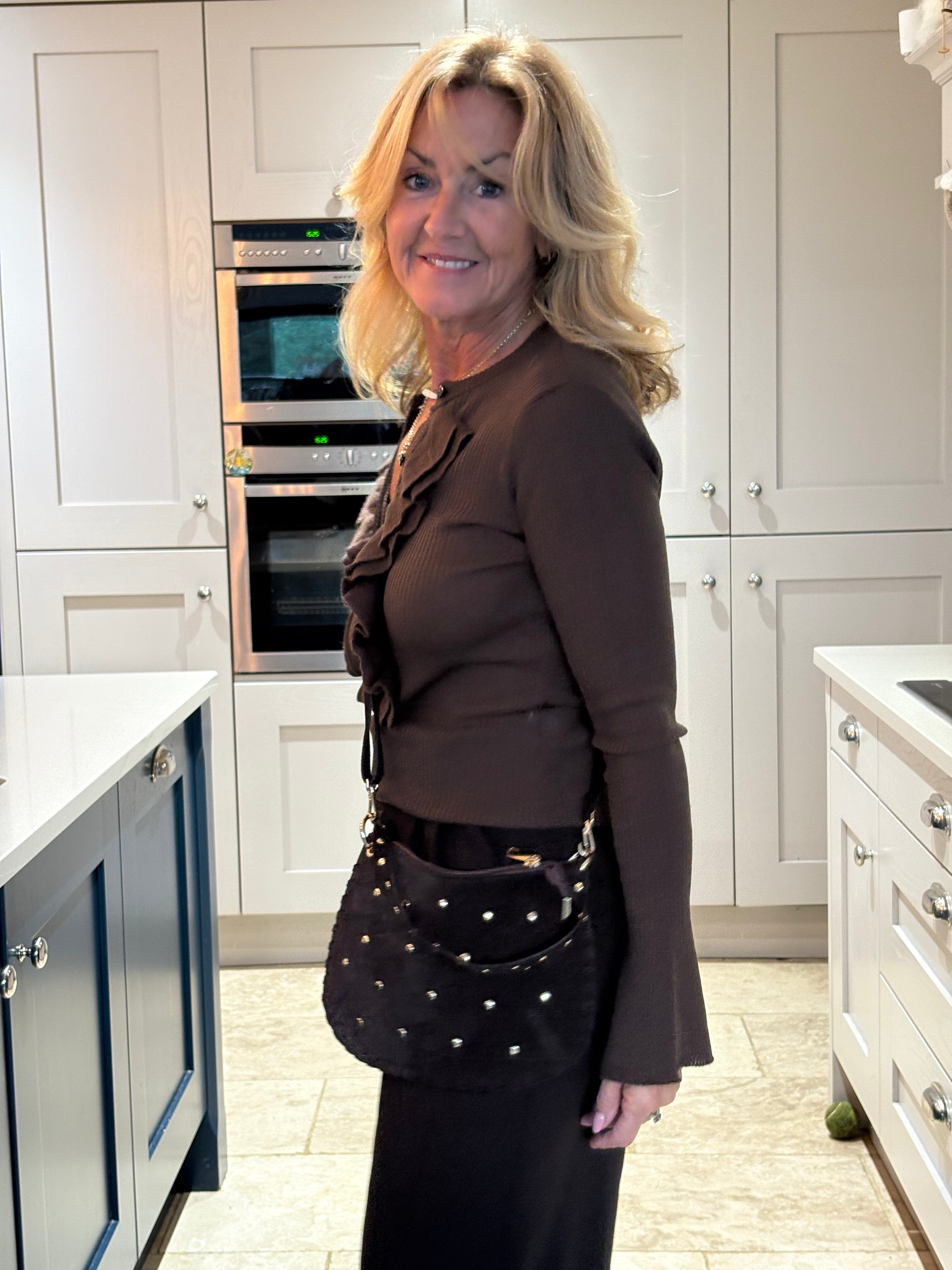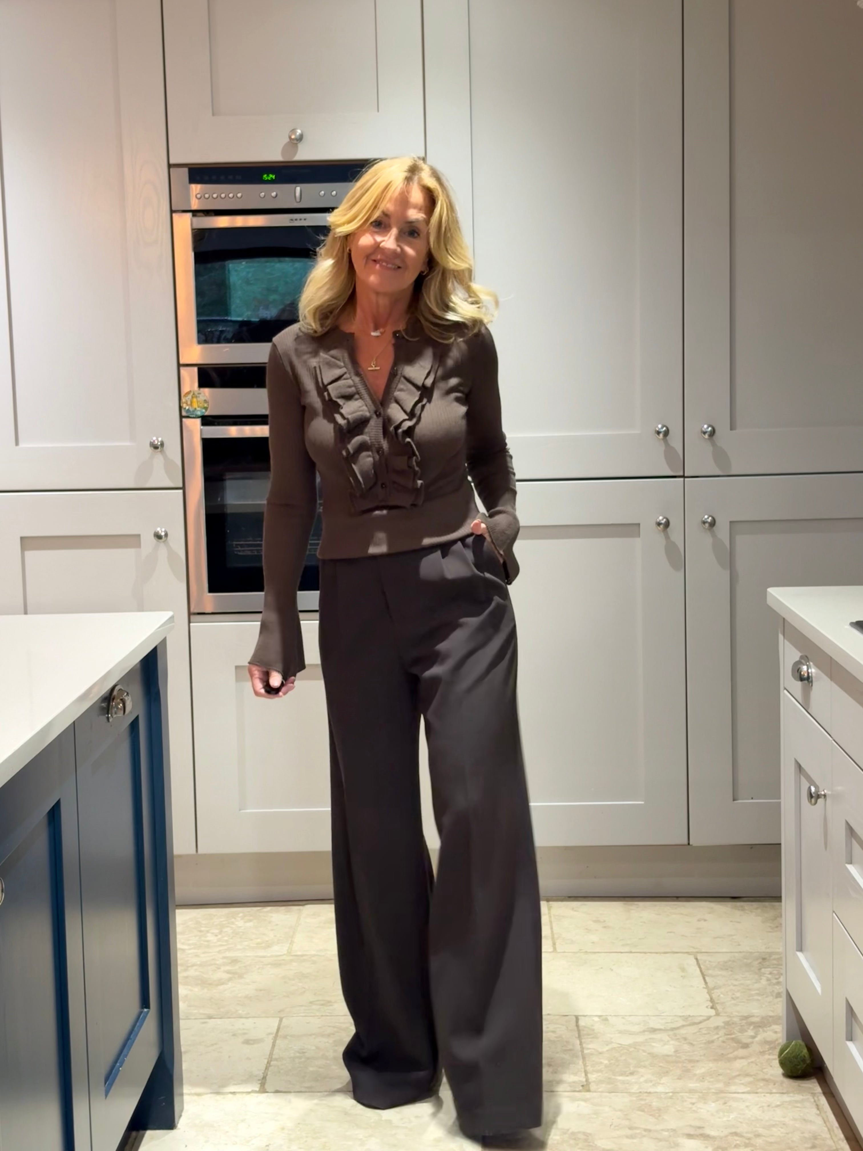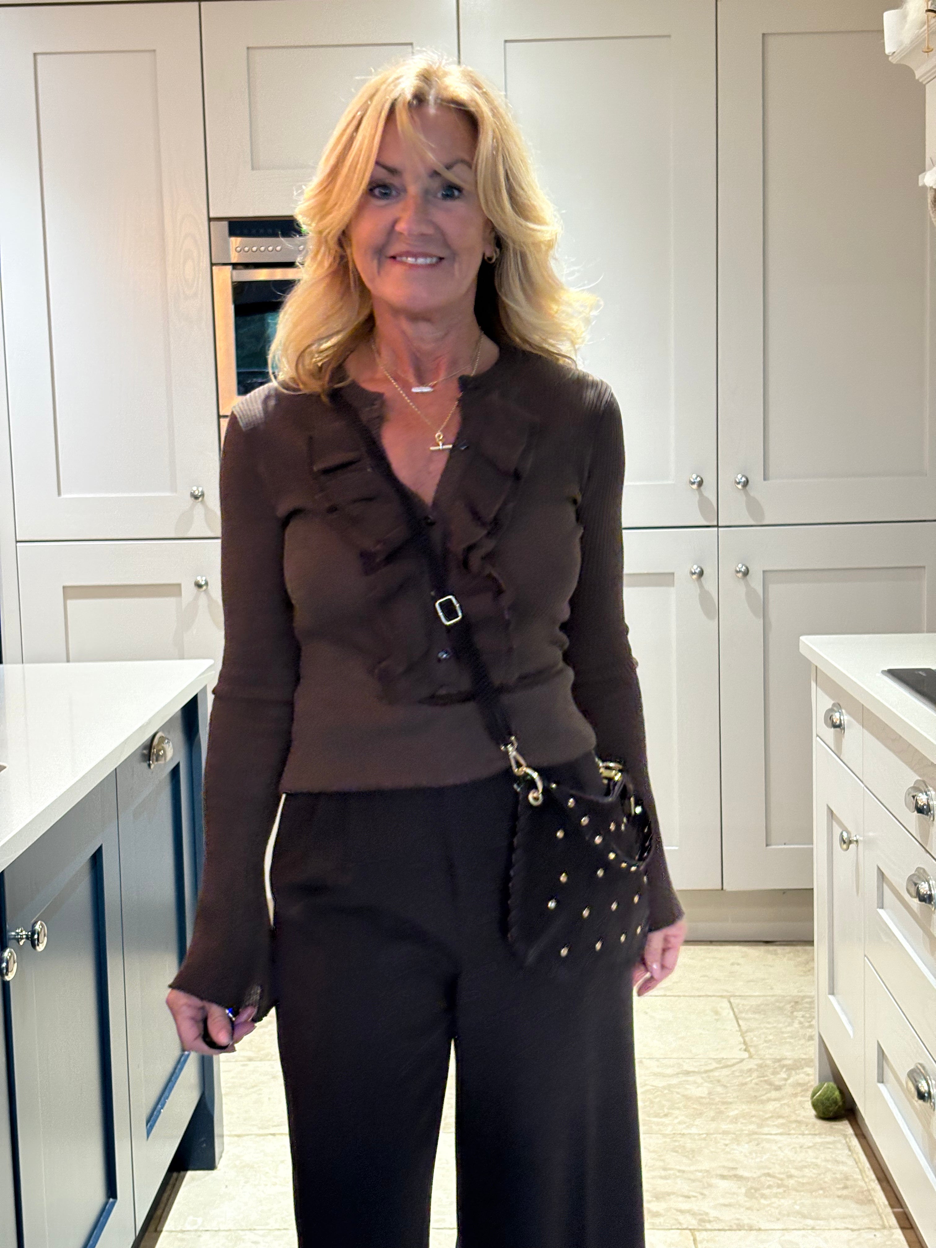 A stunning fine wool mix cardigan with a round neckline. The cardigan is ribbed throughout and is a fitted fit. It has very long fitted sleeves with a bell bottom cuff. It is buttoned down the front and has a gorgeous ruffle making it fun, elegant and very easy to dress up or down.