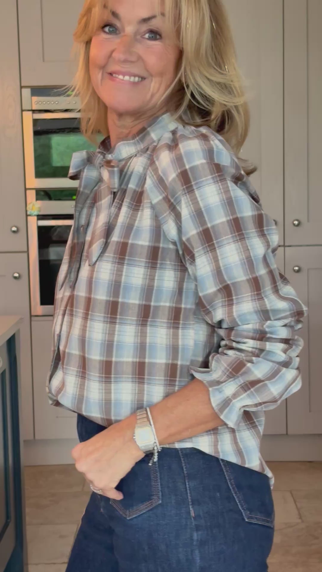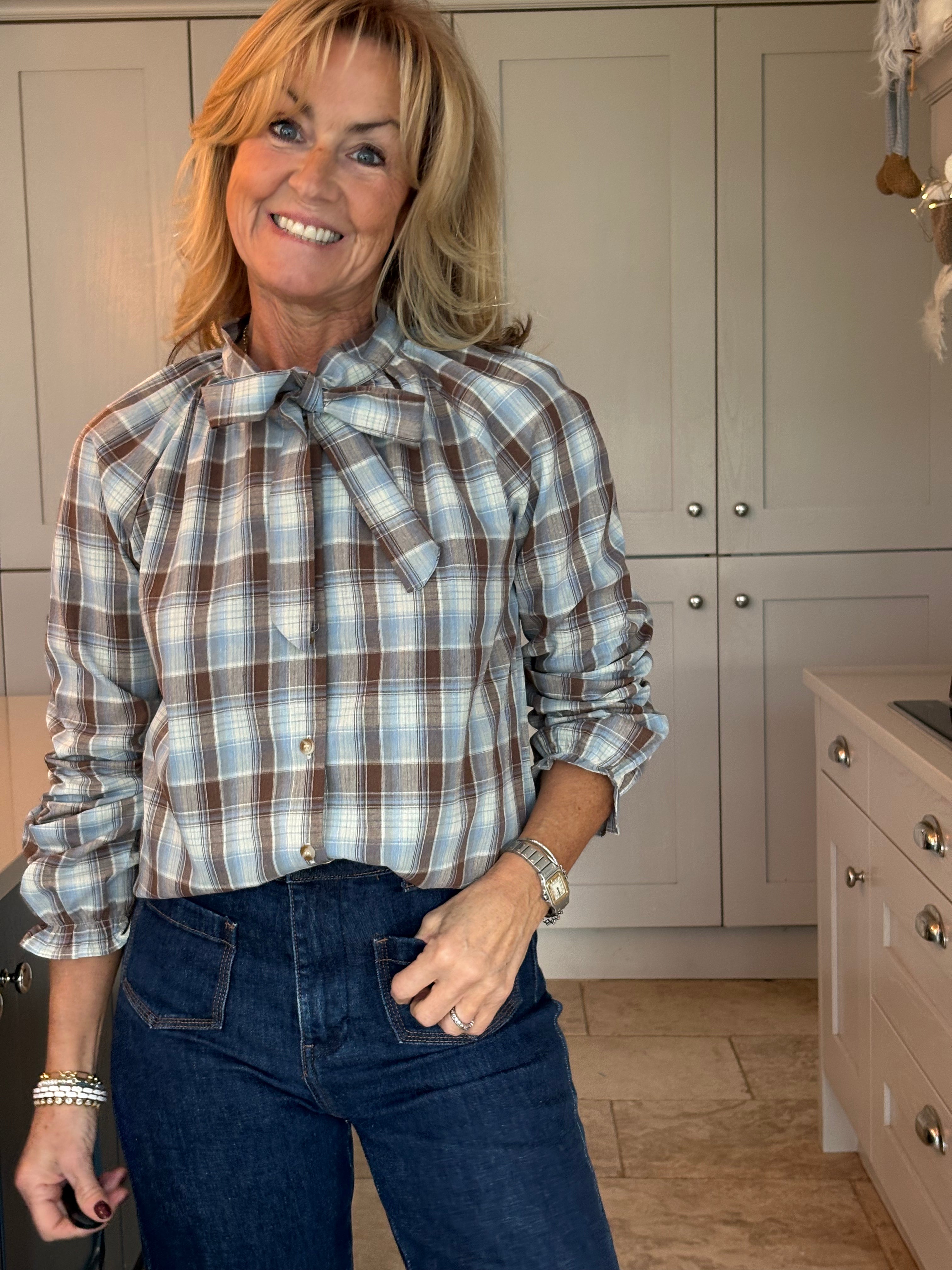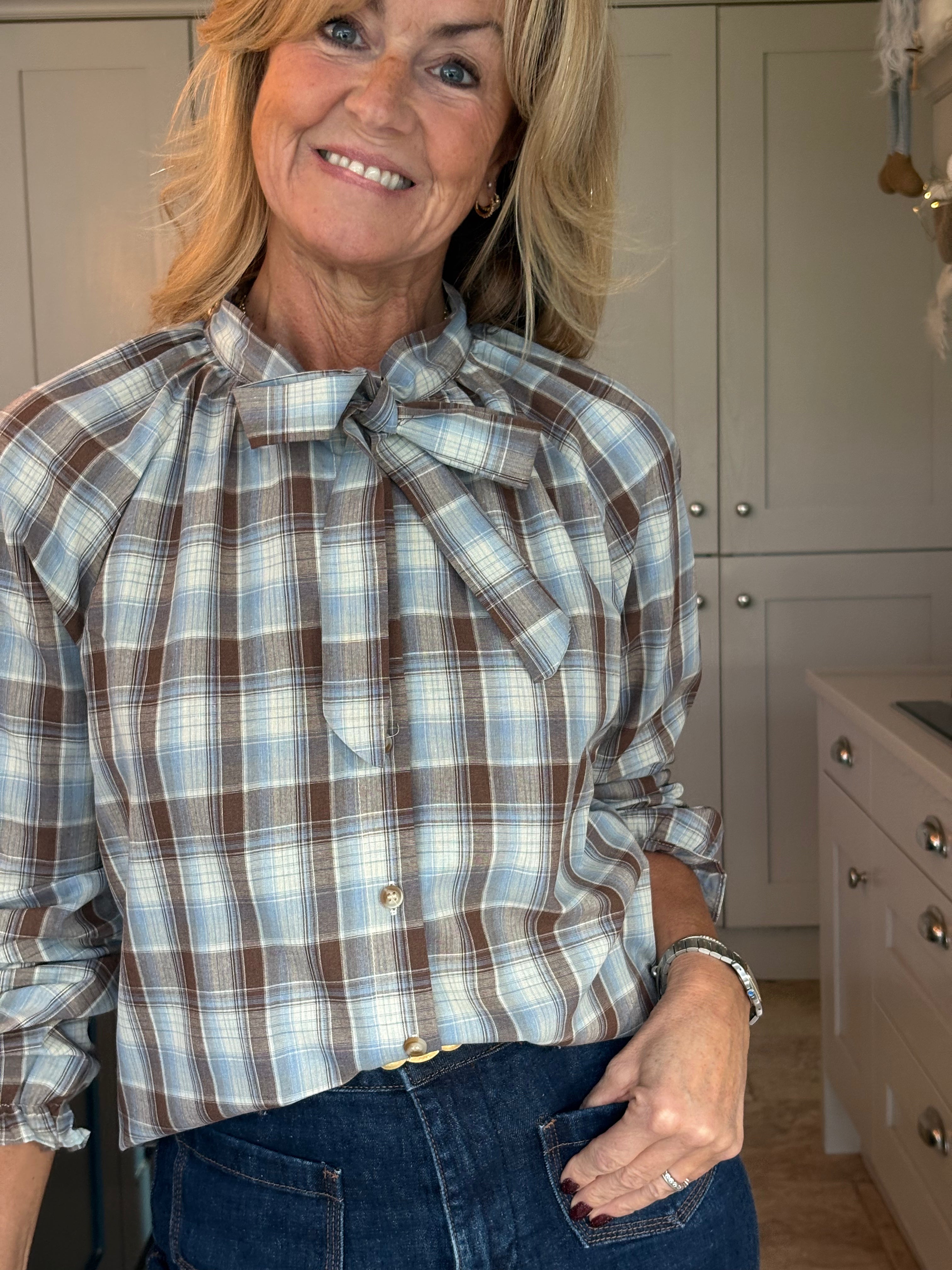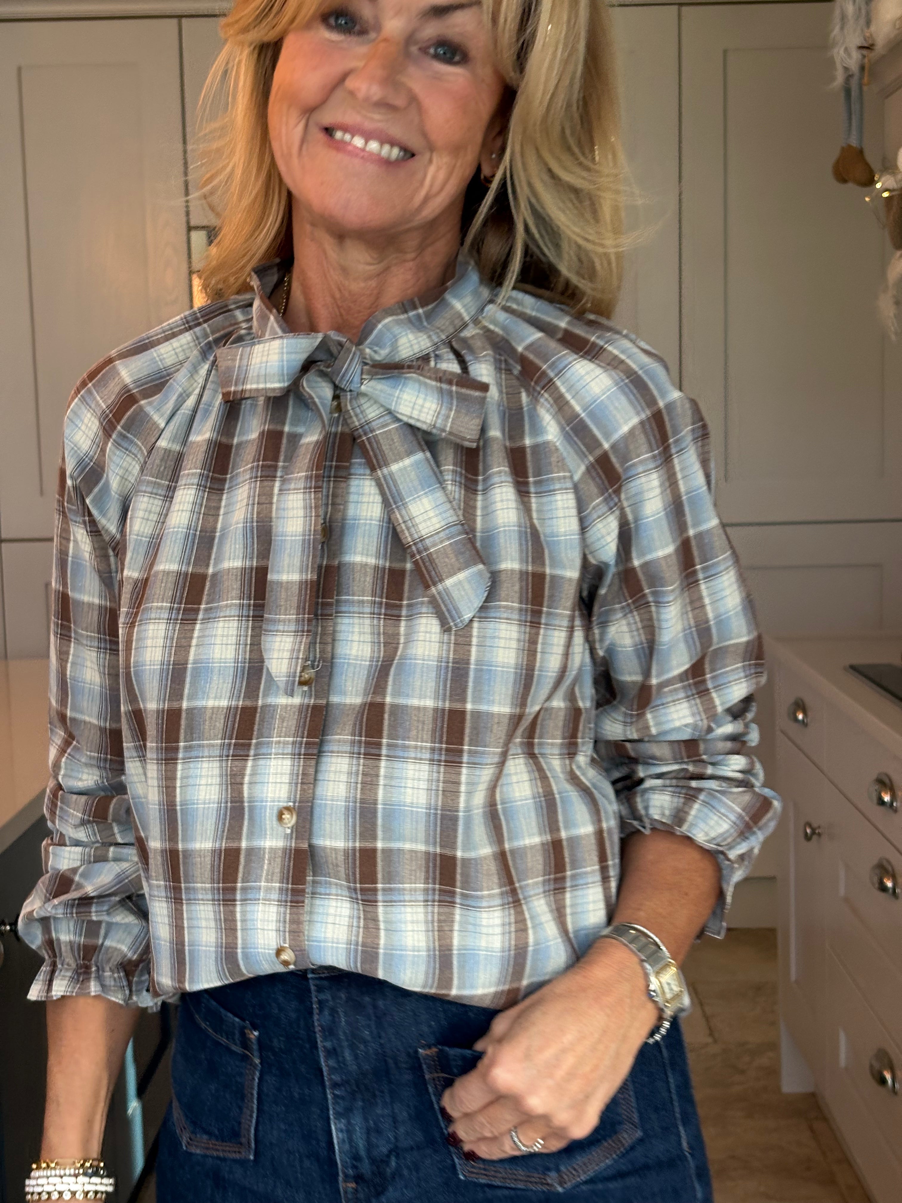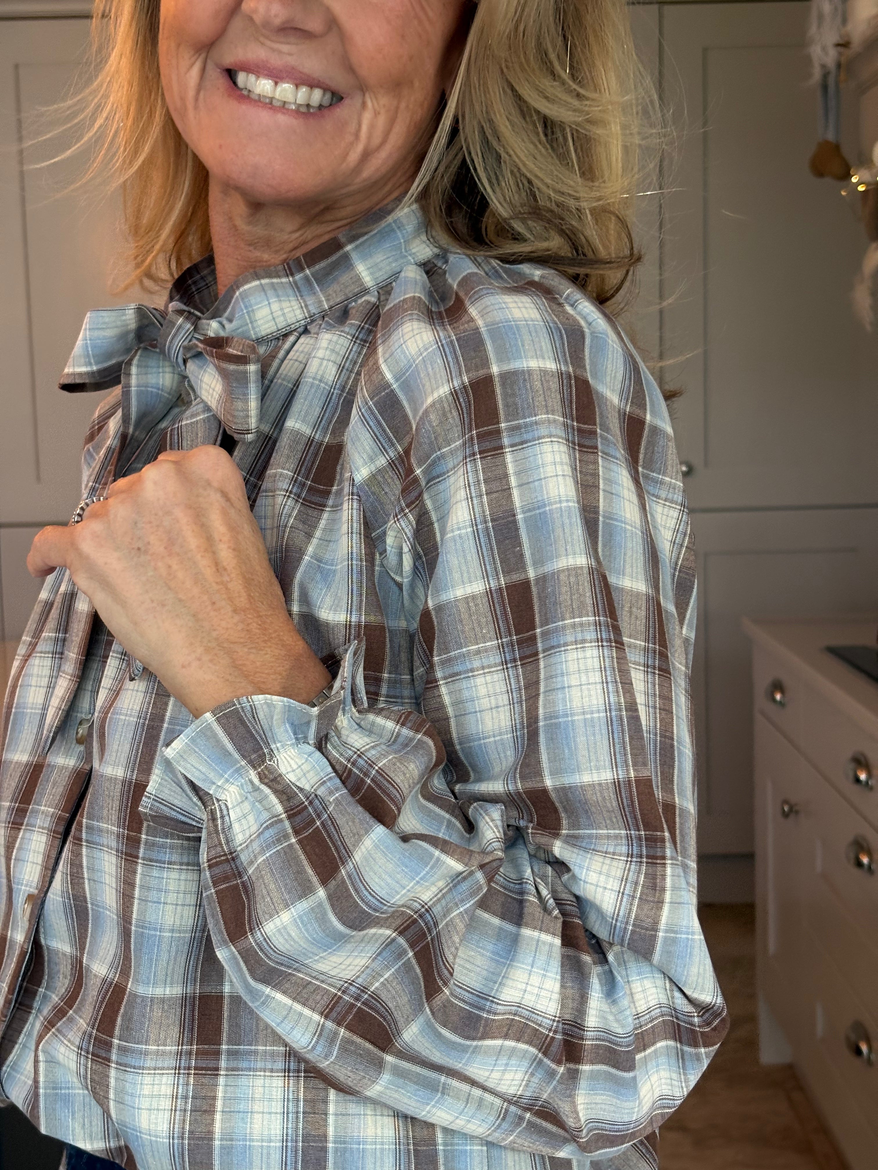 This lovely cotton mix blouse features a charming check pattern in shades of brown, pale blue, and cream, creating a delightful and versatile piece. The mock neck design, complemented by a feminine pussy bow, adds a touch of sophistication while maintaining a playful vibe. Long puffed sleeves with elasticated frill cuffs enhance its girly and frivolous appeal. This blouse is incredibly easy to wear, whether you choose to style it casually with jeans or dress it up with tailored trousers or a skirt for a more elegant look.