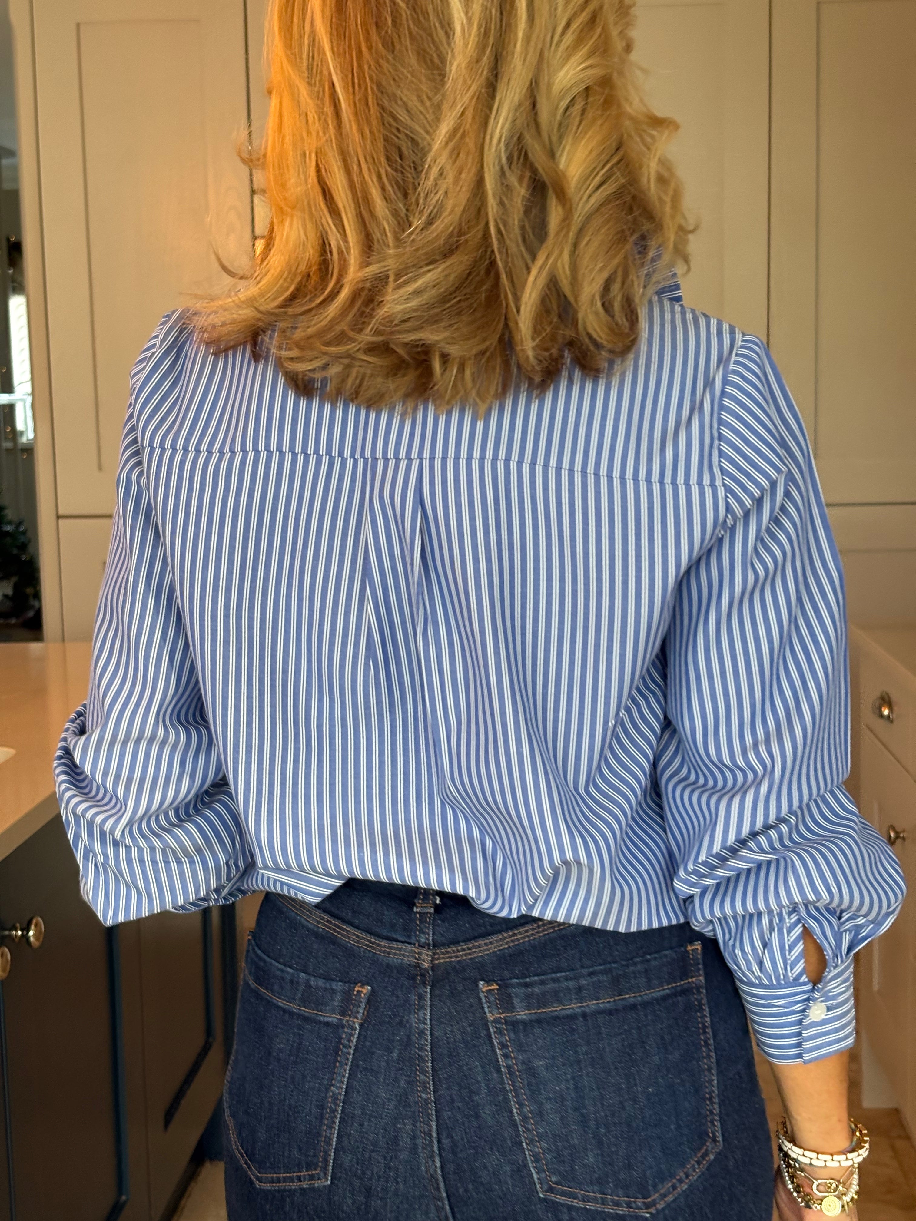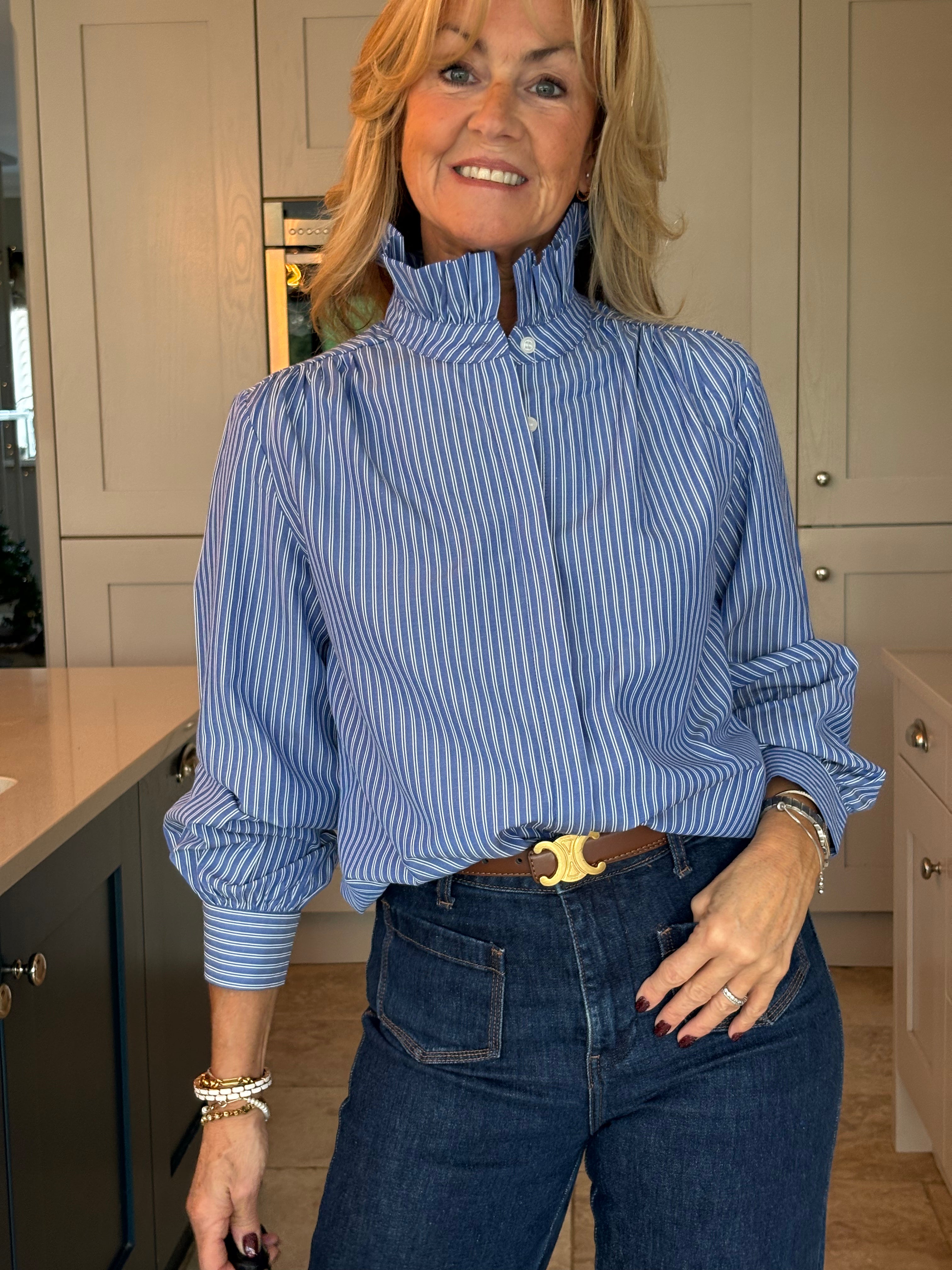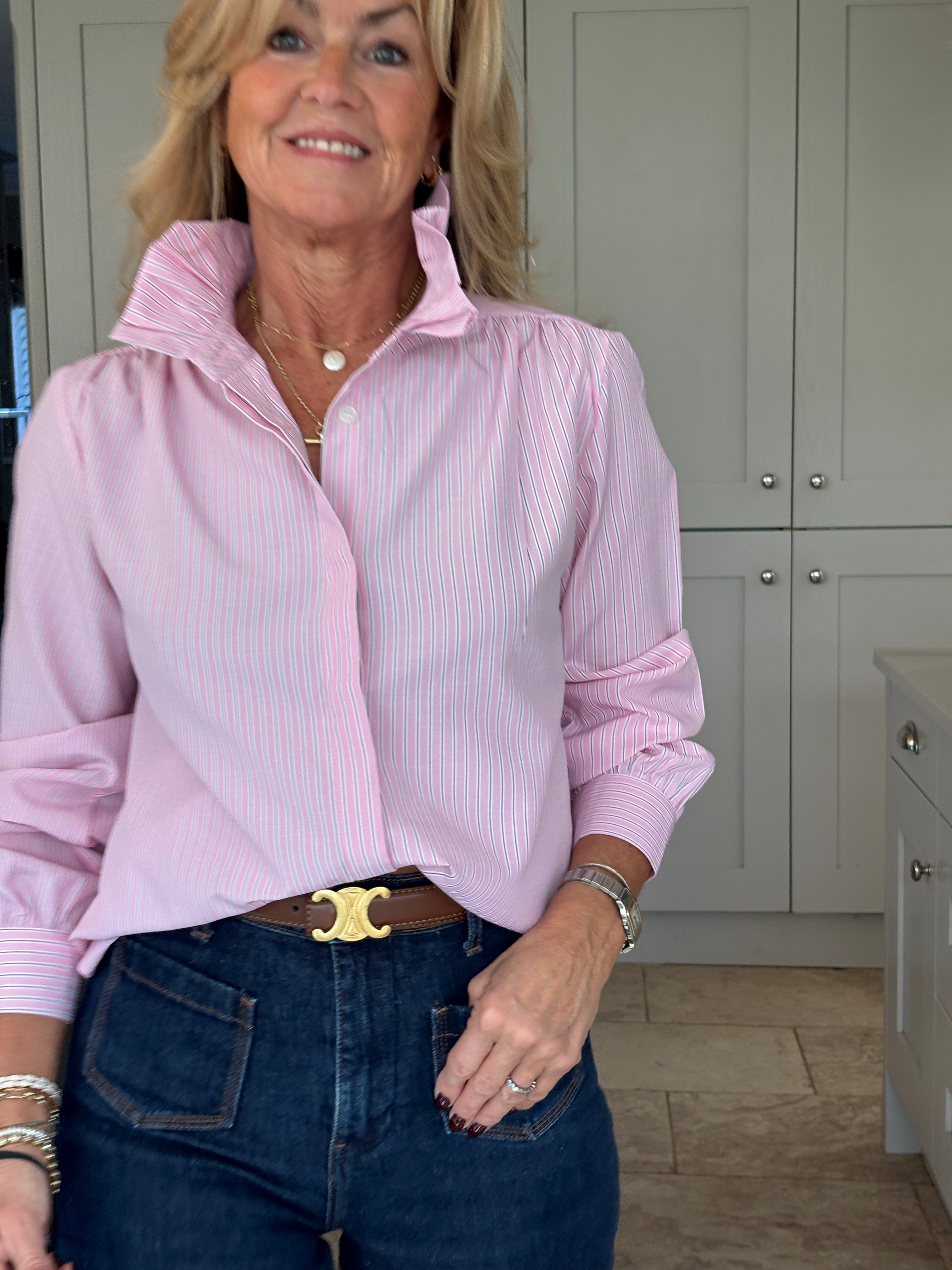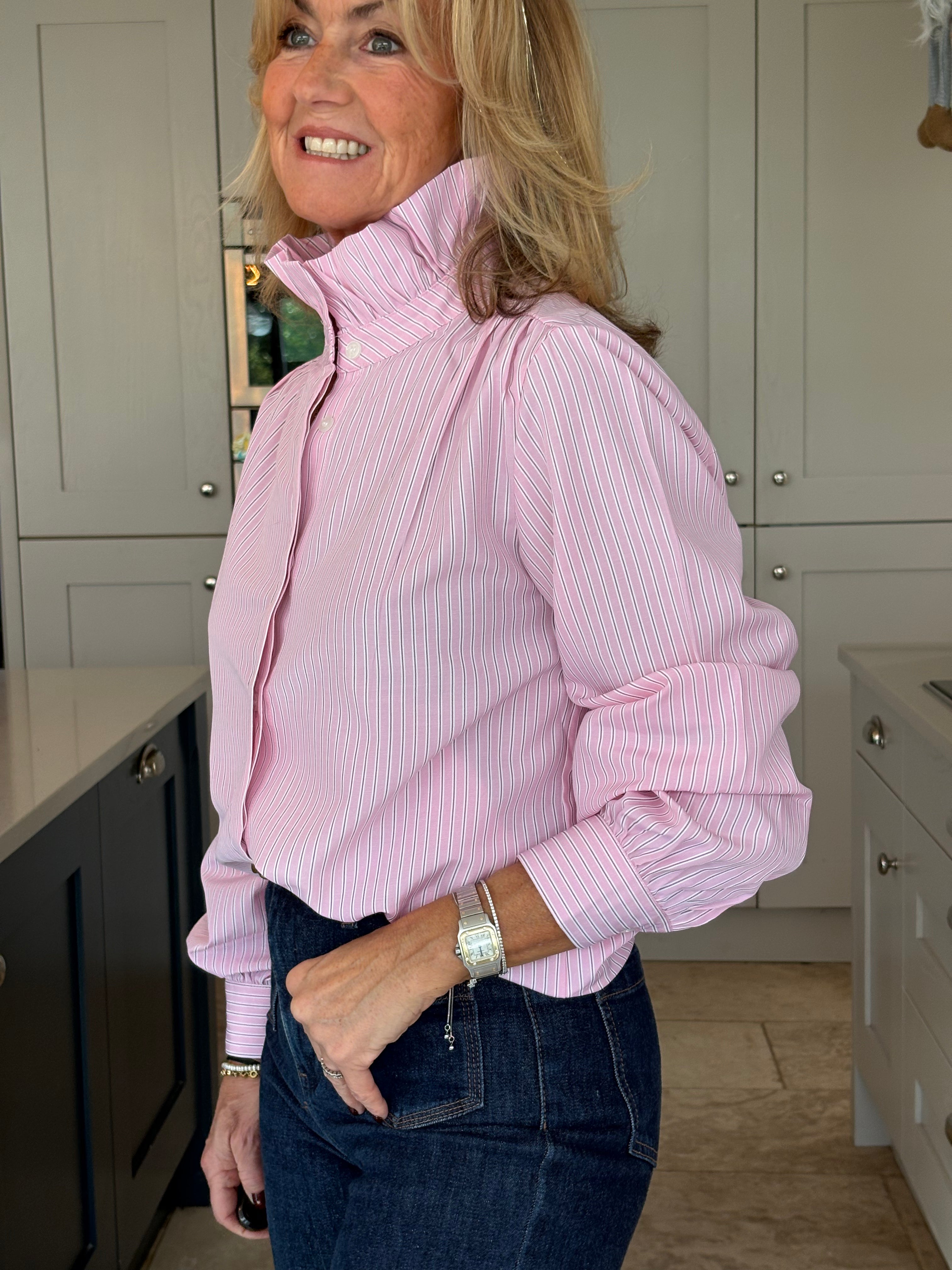 The Marin is a stunning pinstripe blouse with a high pleasted collar giving it a regal look.  Fabulous worn elegantly,  on its own or under a jacket, and casually under a jumper with the collar exposed.  The seeves are gently puffed with a cuff and there is a box pleat on the back.