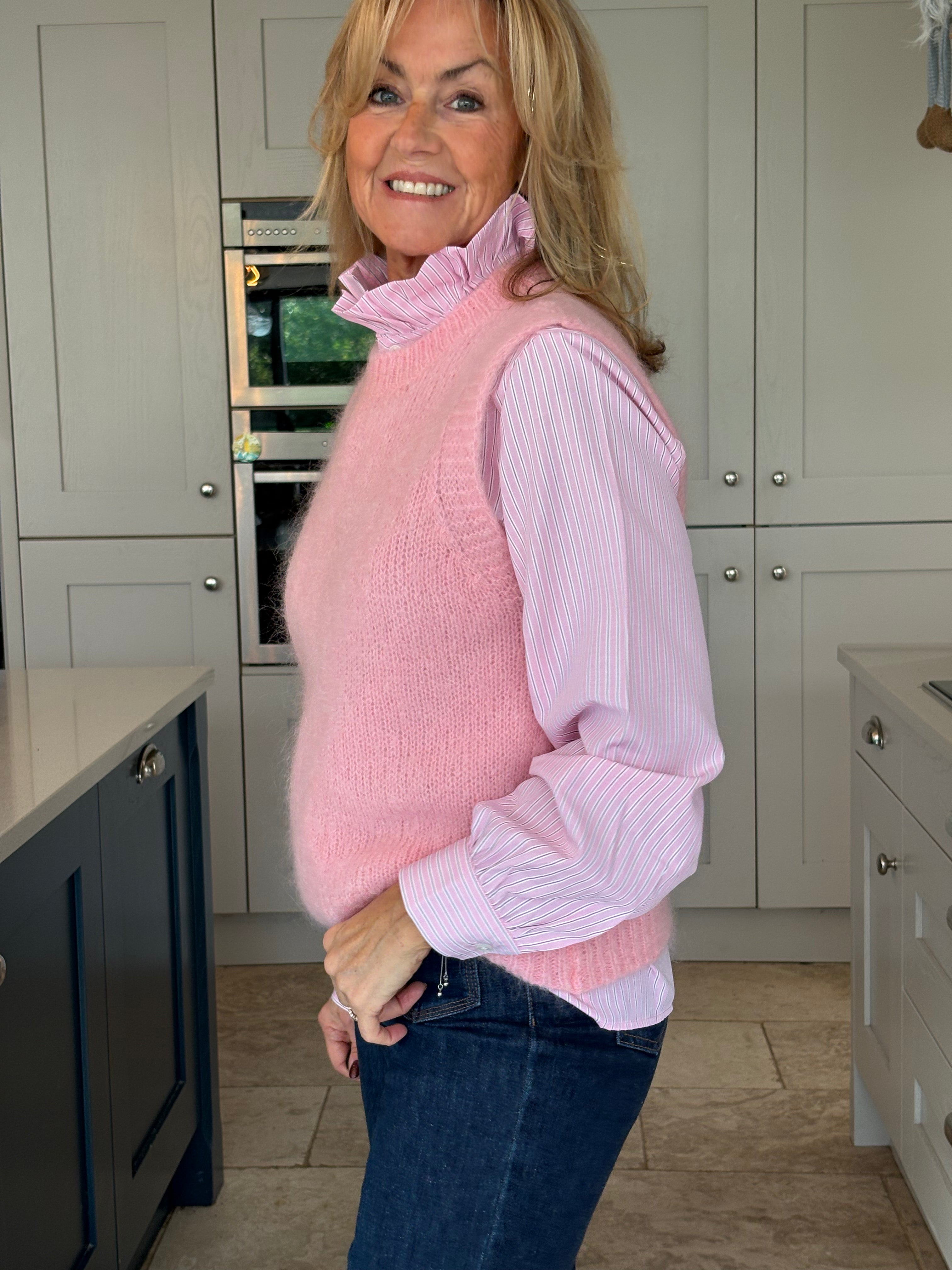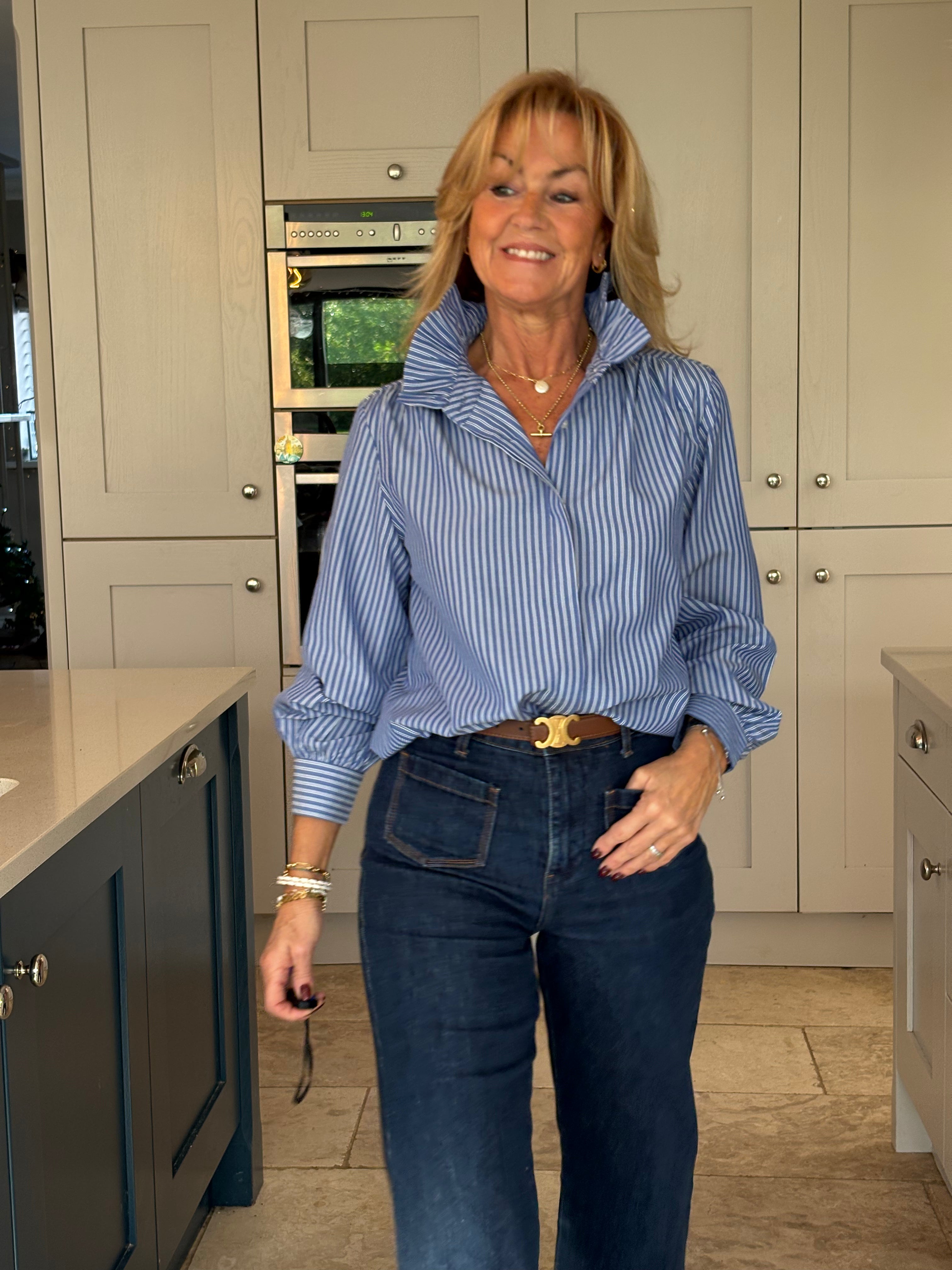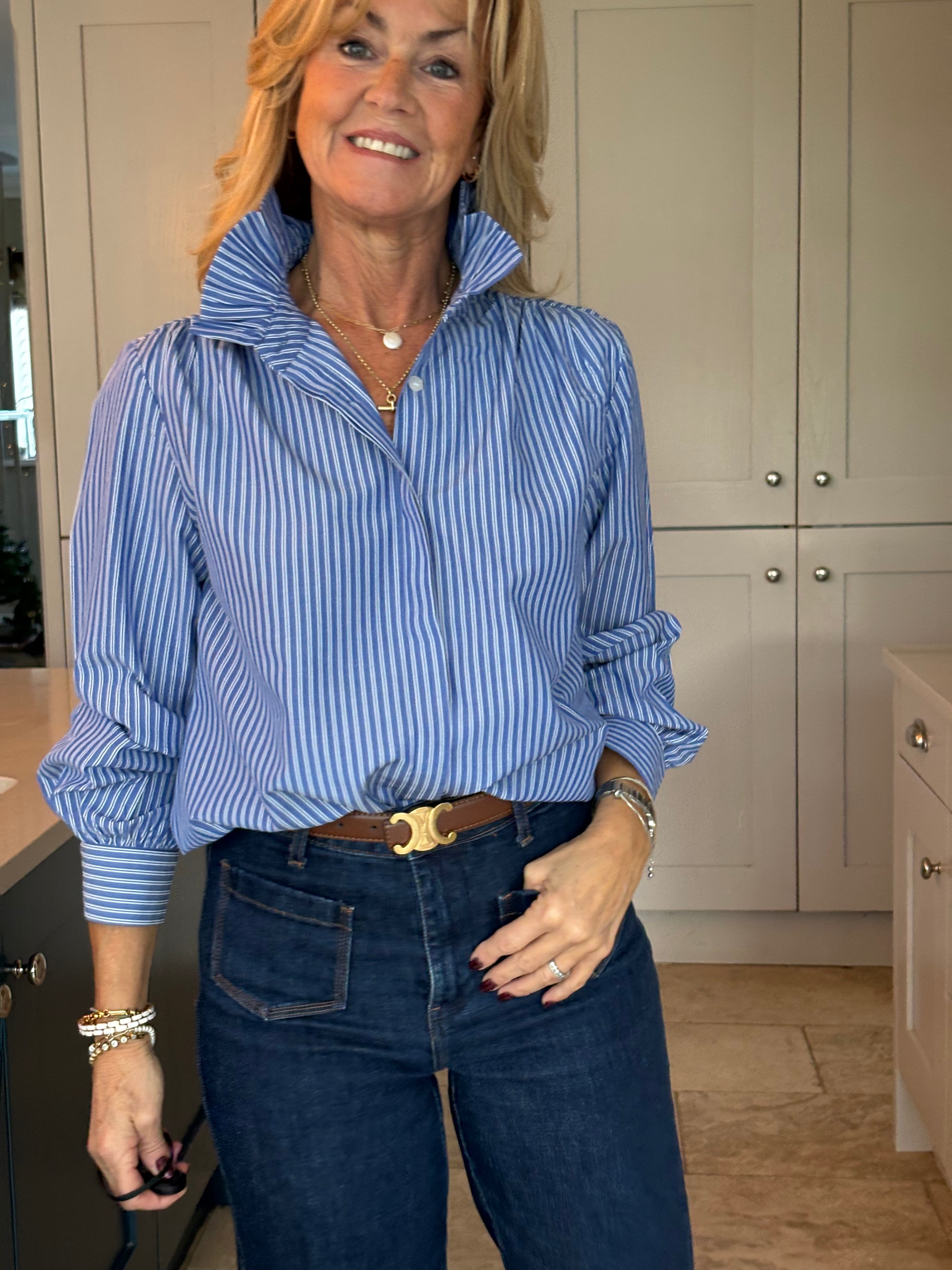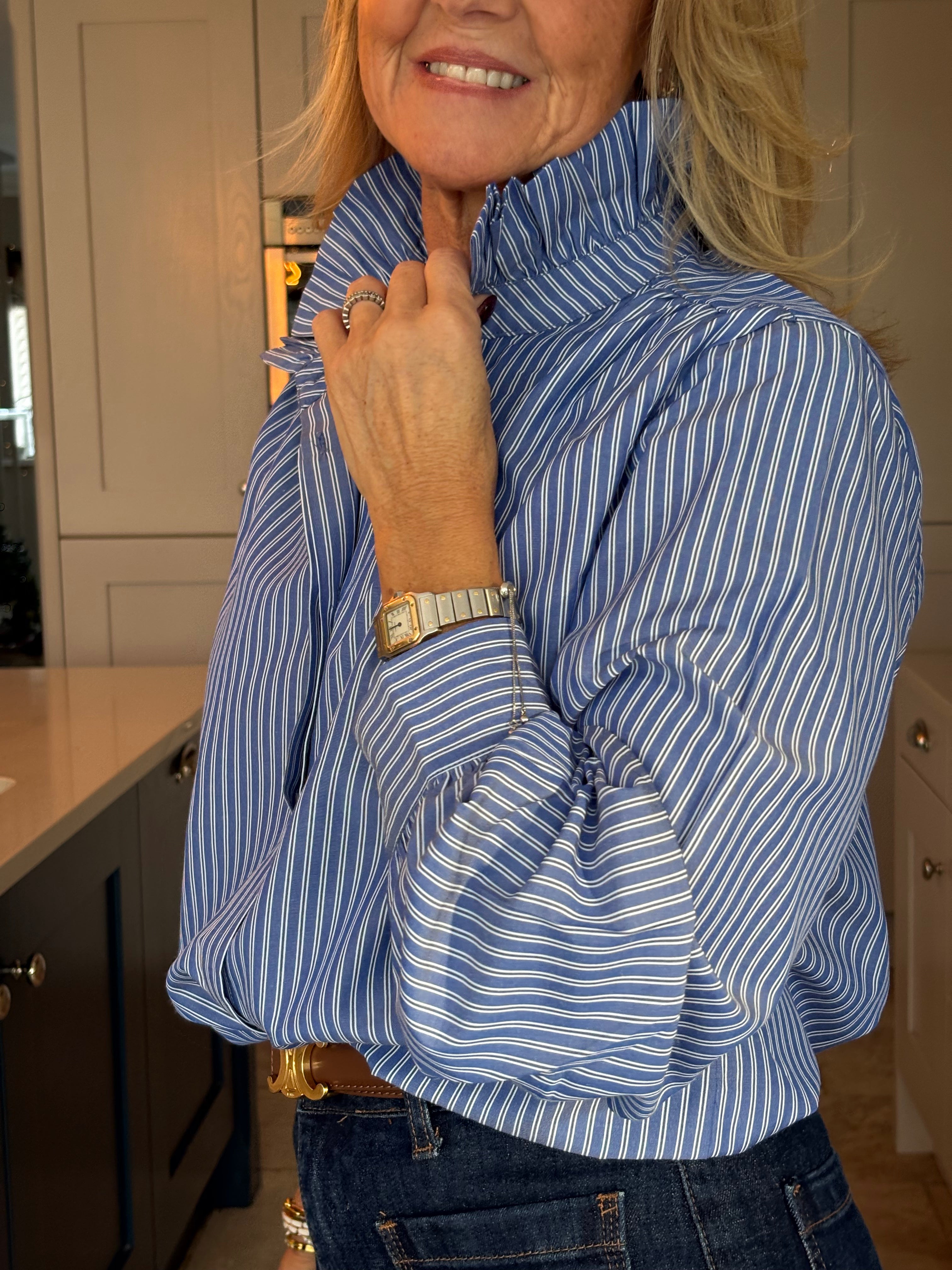 The Marin is a stunning pinstripe blouse with a high pleasted collar giving it a regal look.  Fabulous worn elegantly,  on its own or under a jacket, and casually under a jumper with the collar exposed.  The seeves are gently puffed with a cuff and there is a box pleat on the back.
