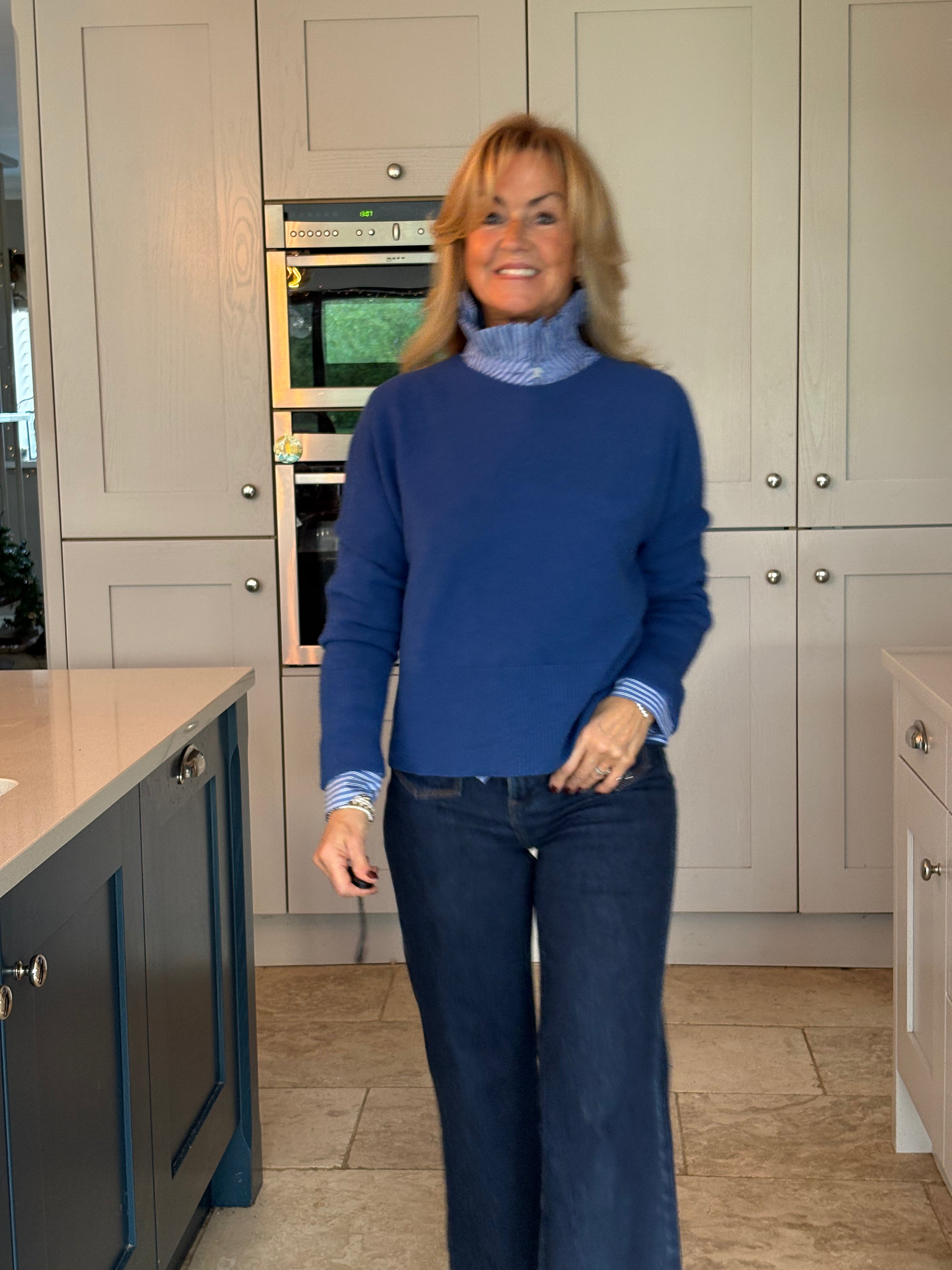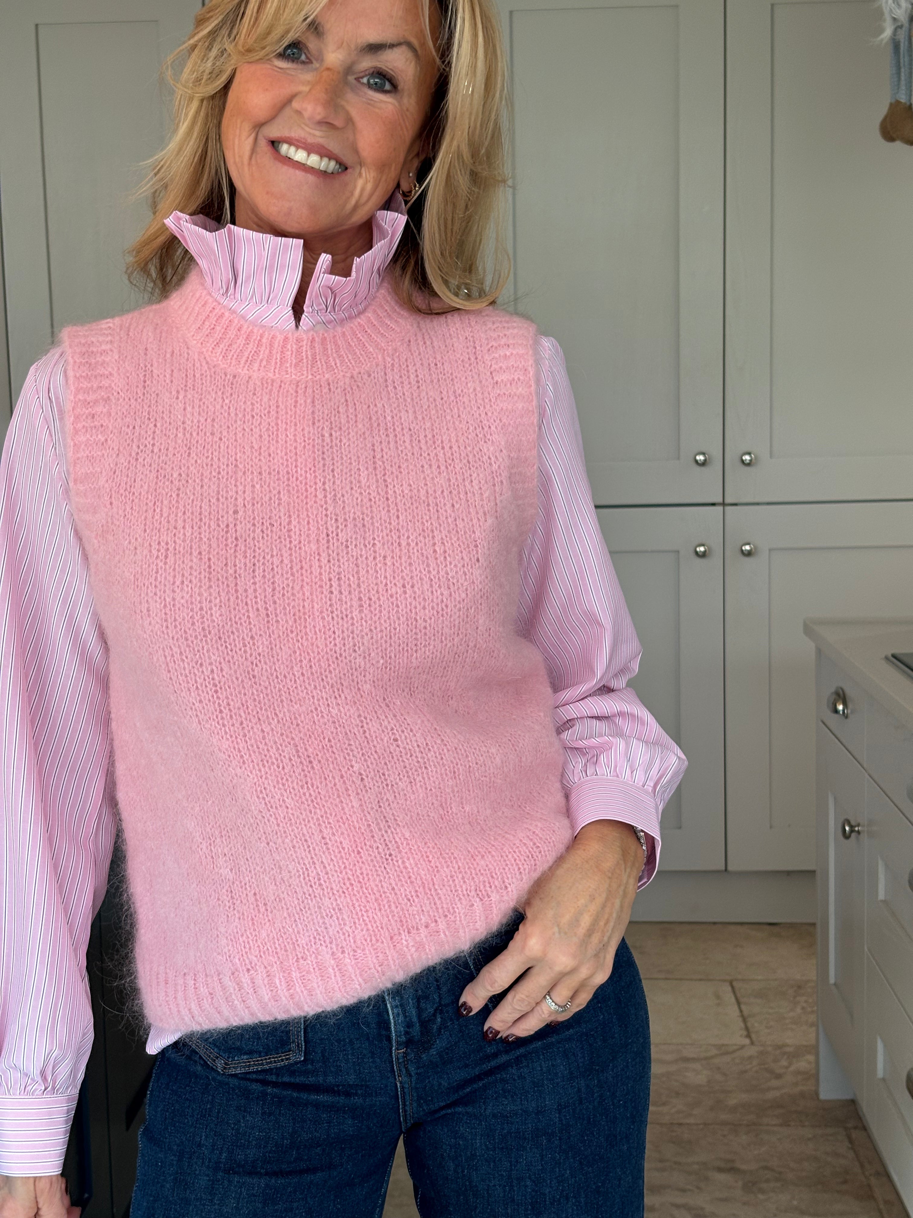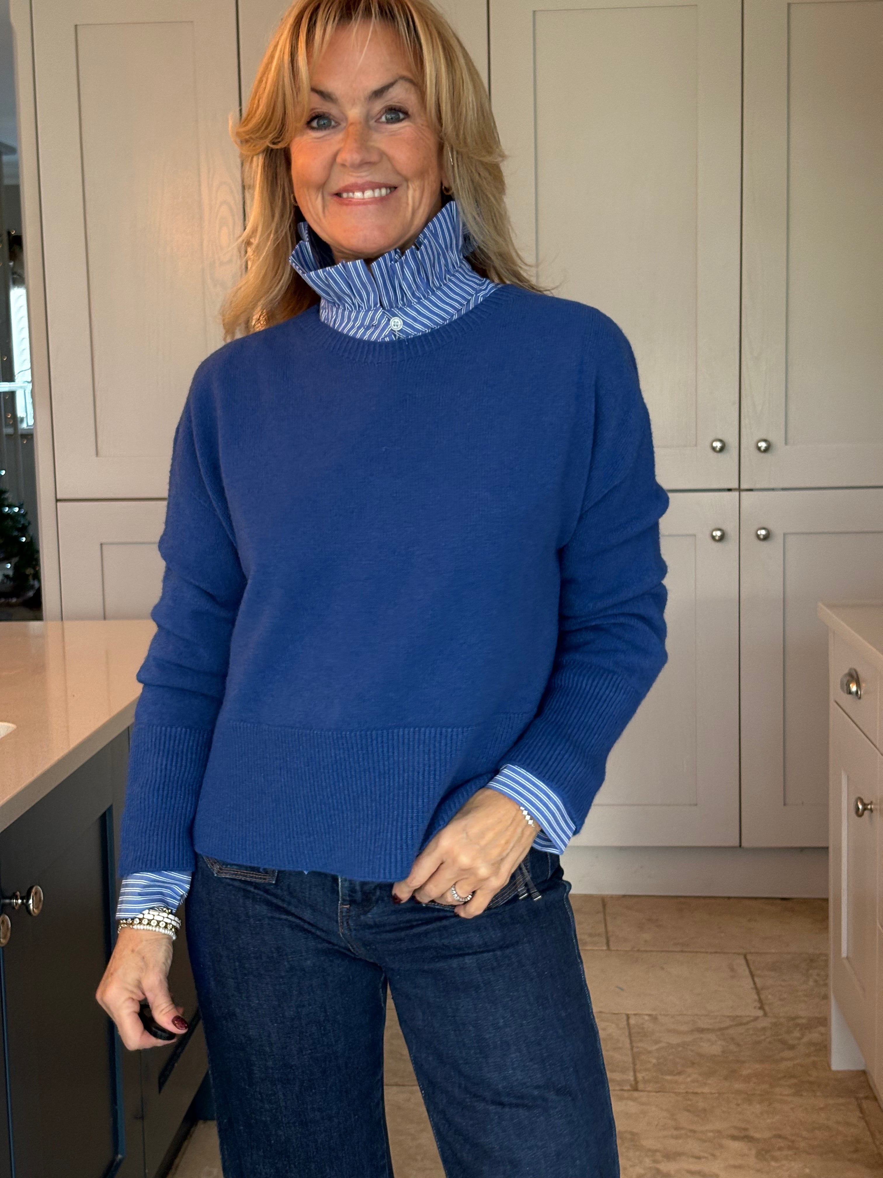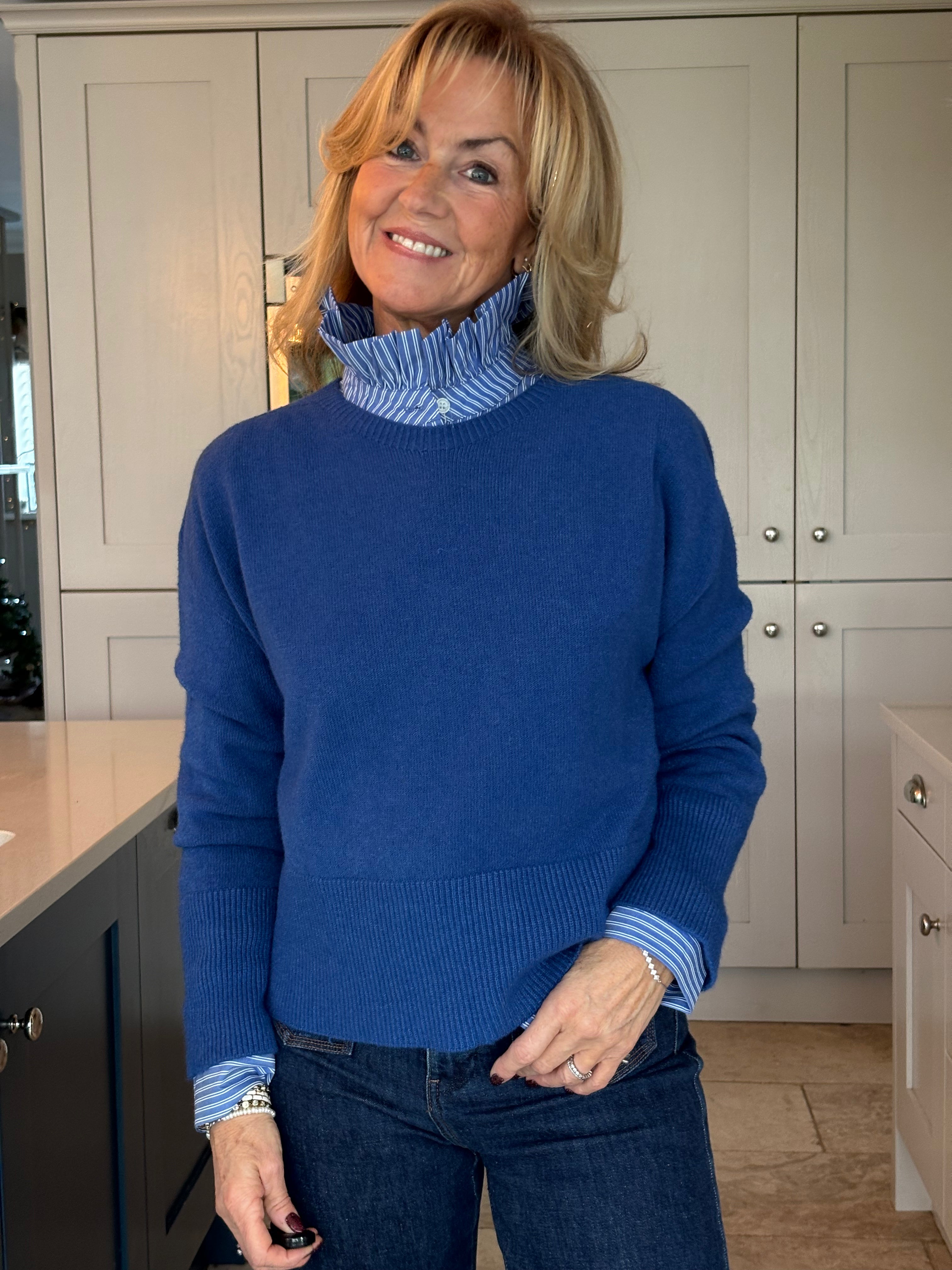 The Marin is a stunning pinstripe blouse with a high pleasted collar giving it a regal look.  Fabulous worn elegantly,  on its own or under a jacket, and casually under a jumper with the collar exposed.  The seeves are gently puffed with a cuff and there is a box pleat on the back.