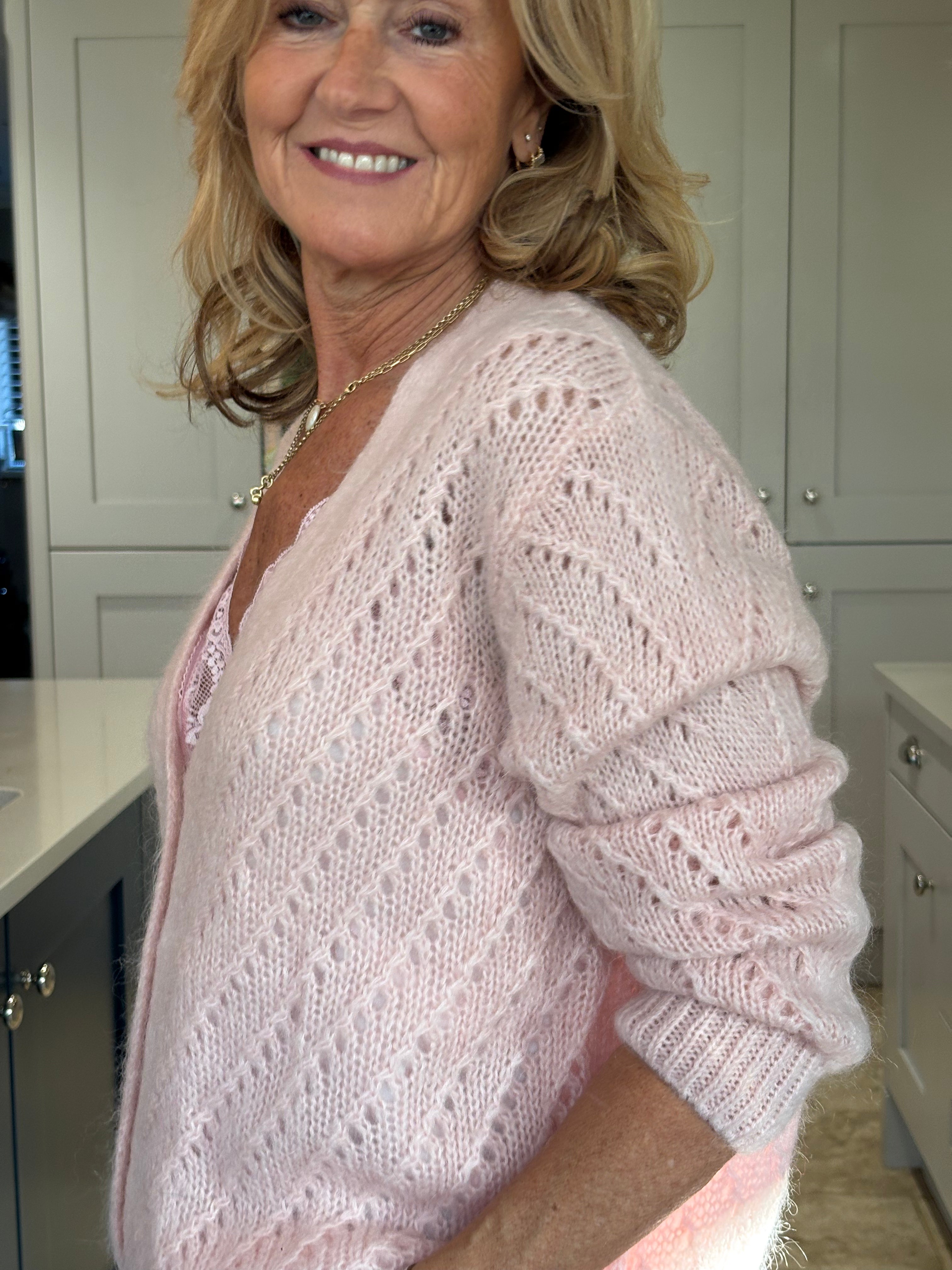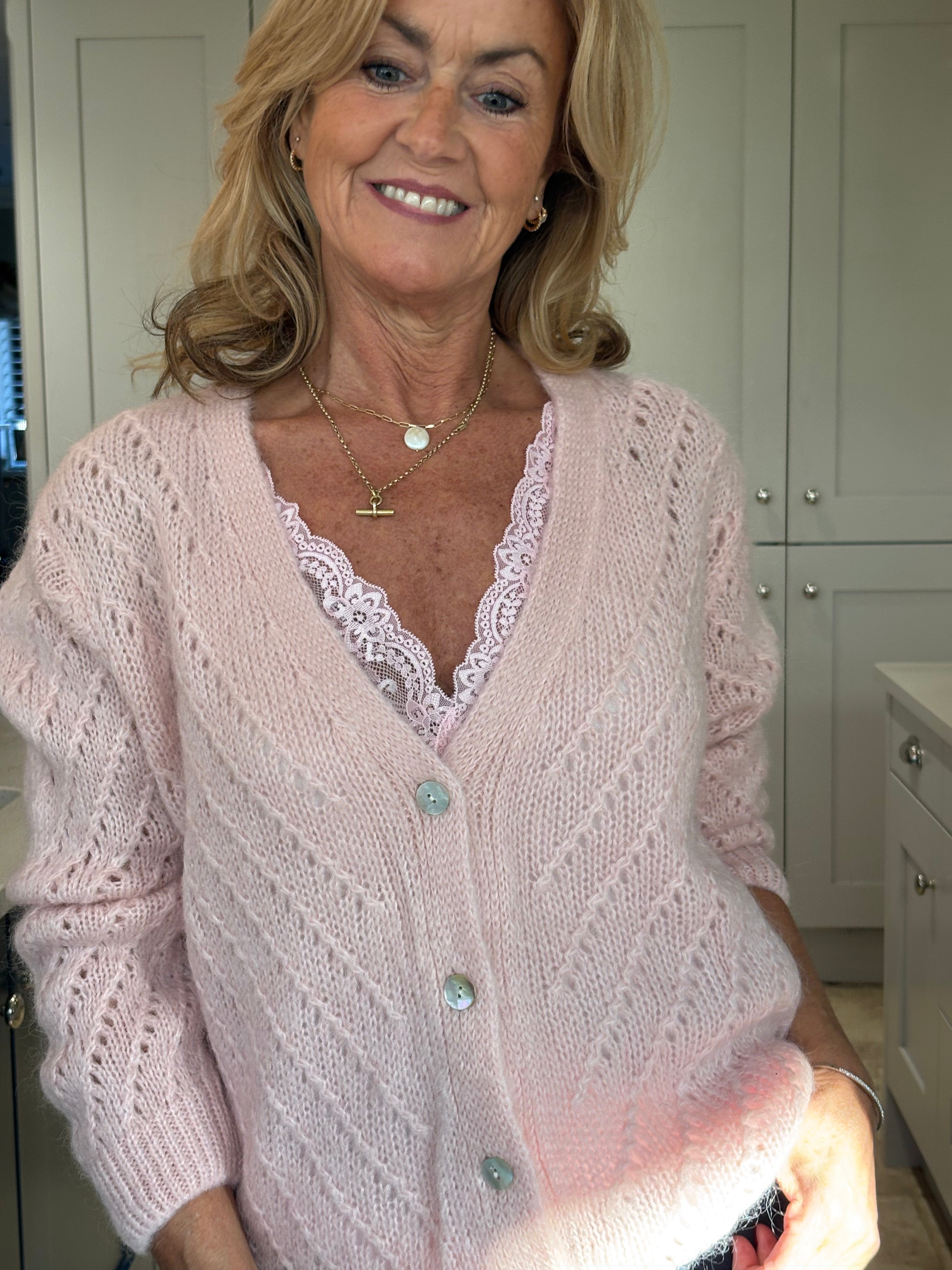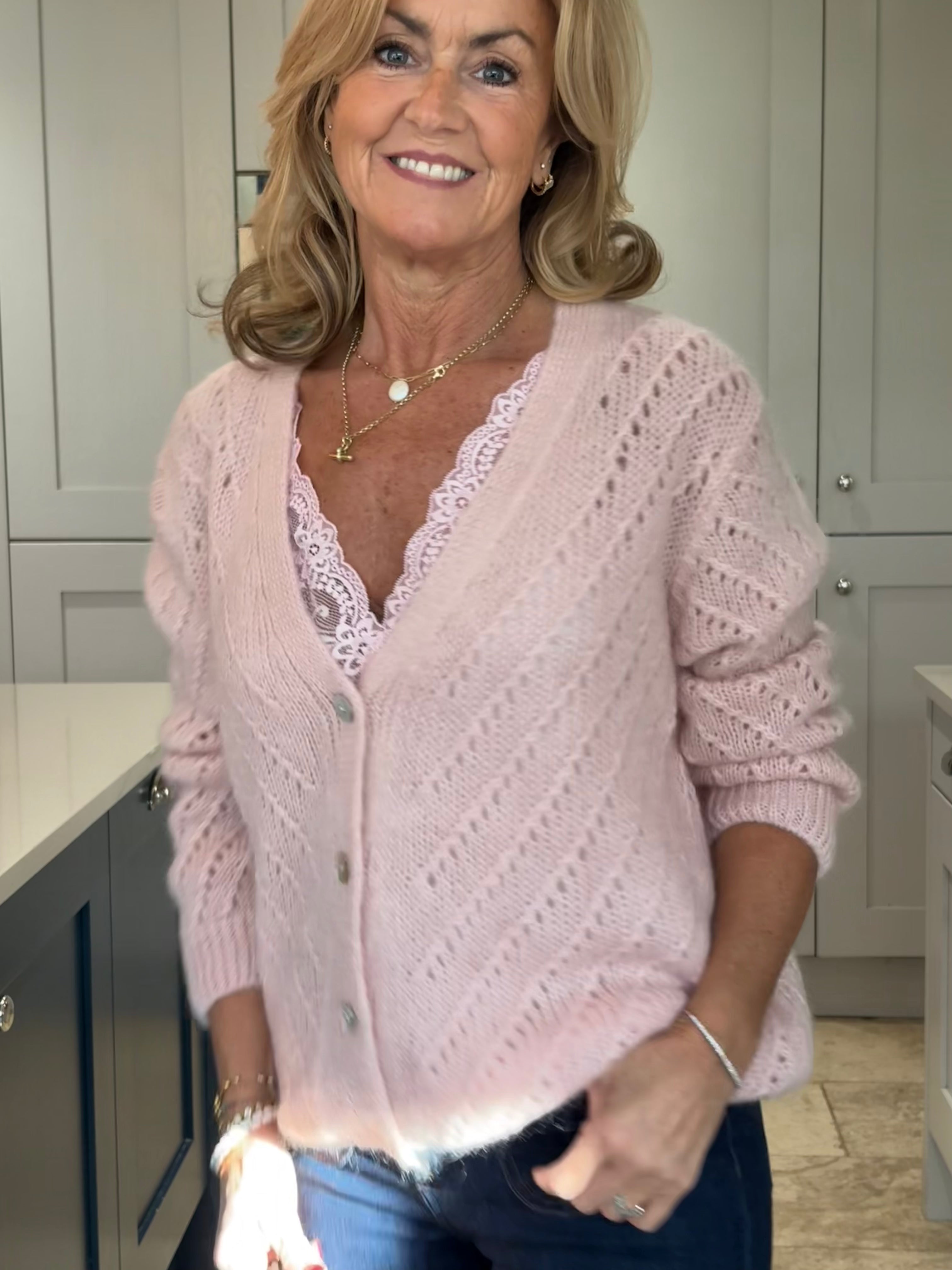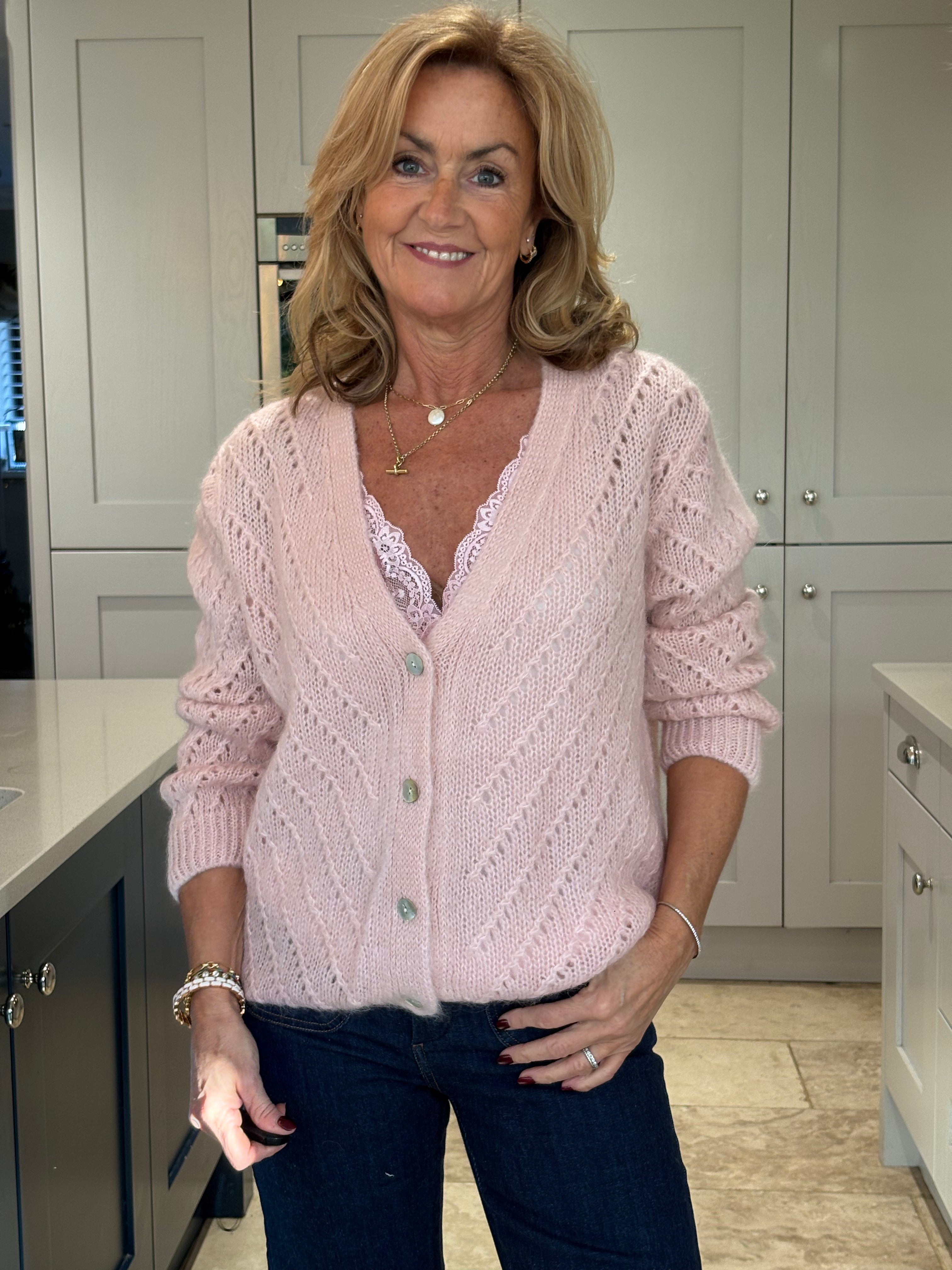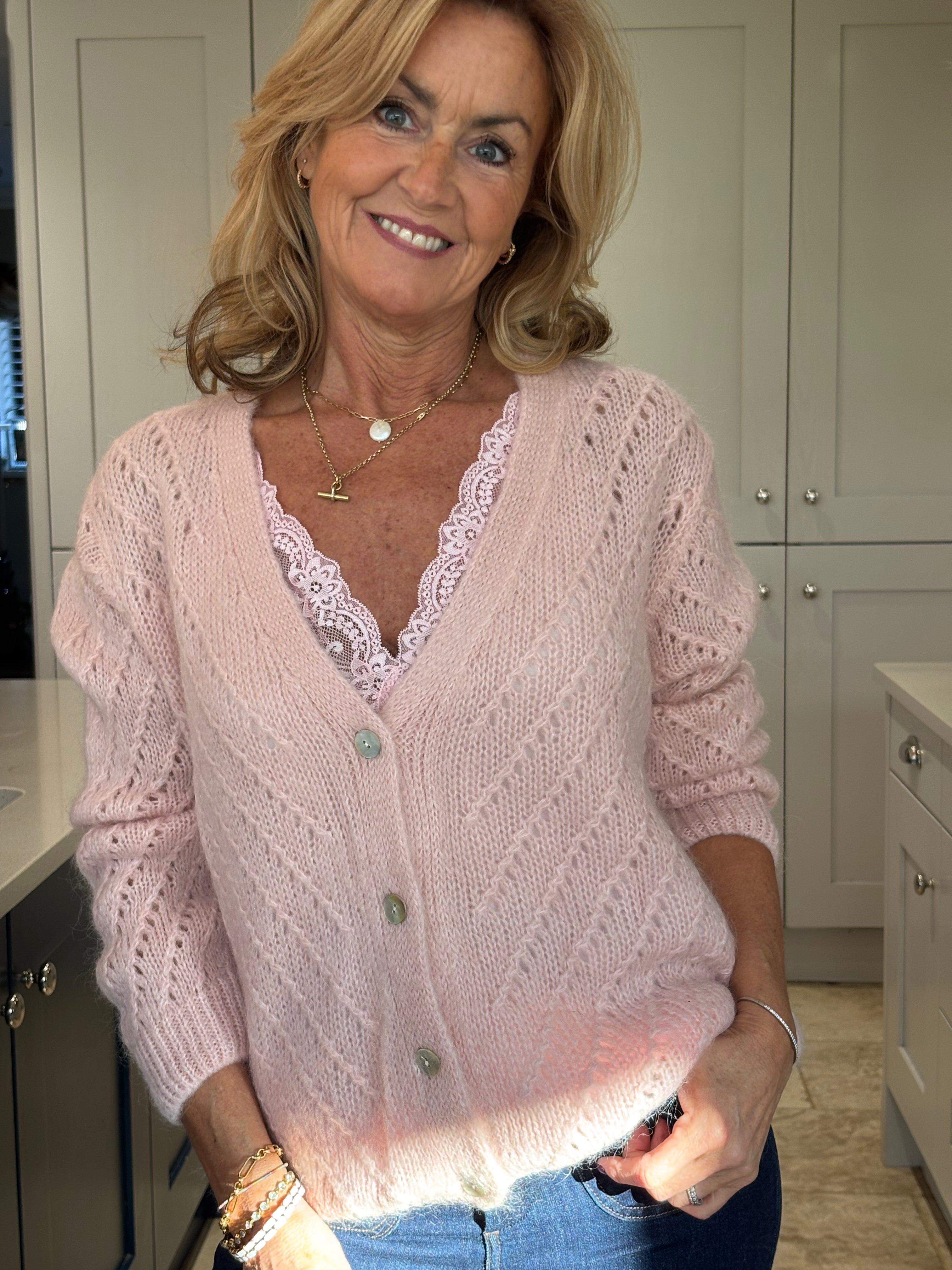 This lovely pastel pink cardigan is a delightful addition to any wardrobe, featuring a deep V neckline that adds a touch of sophistication. The intricate knitted pattern gives it a unique texture. Made from a soft mohair mix, it offers warmth without sacrificing comfort. Versatility is one of its standout qualities; you can easily dress it up by pairing it with a silk camisole and smart trousers or a chic skirt for a polished look. Alternatively, it can be effortlessly layered over a silk dress for a more elegant ensemble. For a casual outing, simply throw it on over a classic shirt and your favorite jeans, creating a relaxed yet stylish outfit.