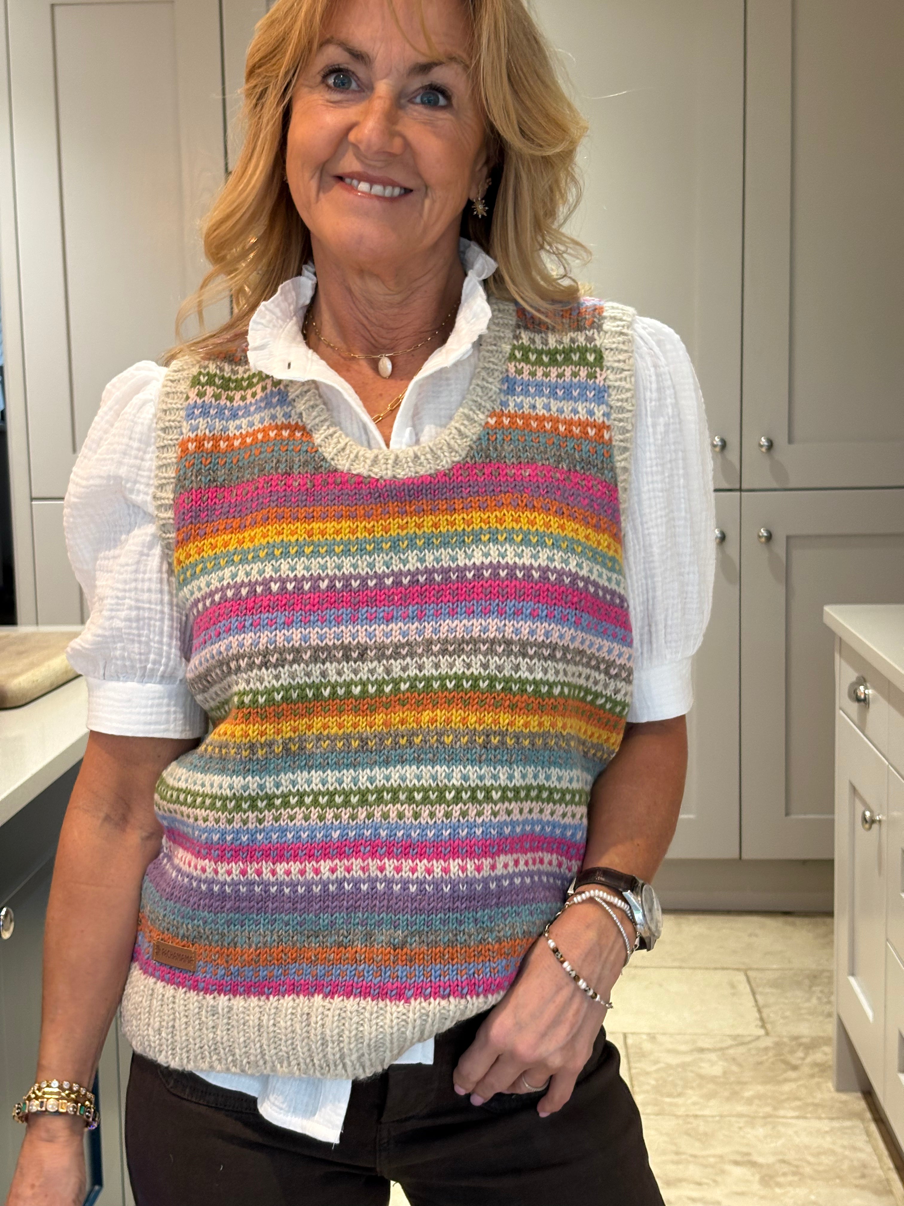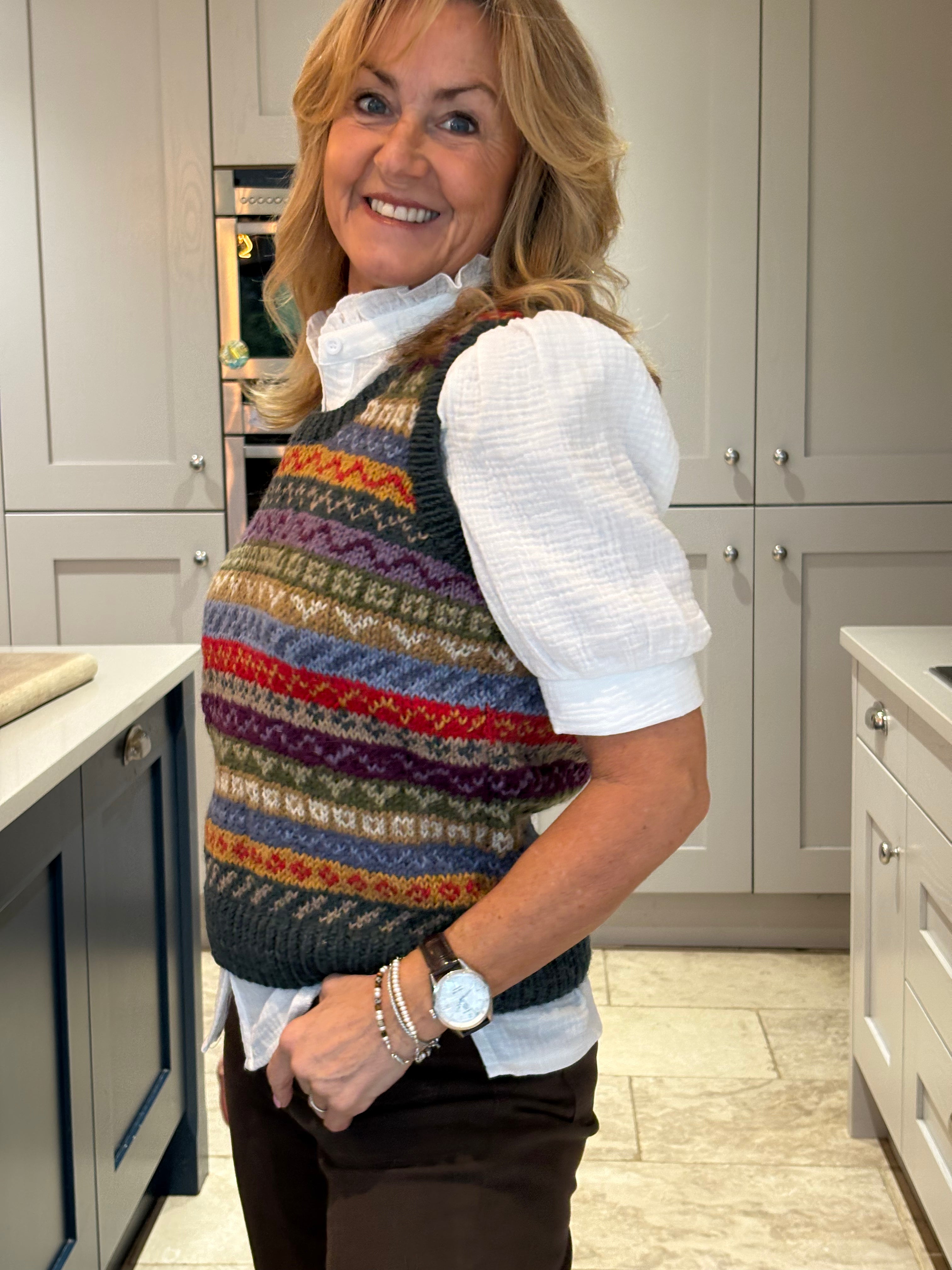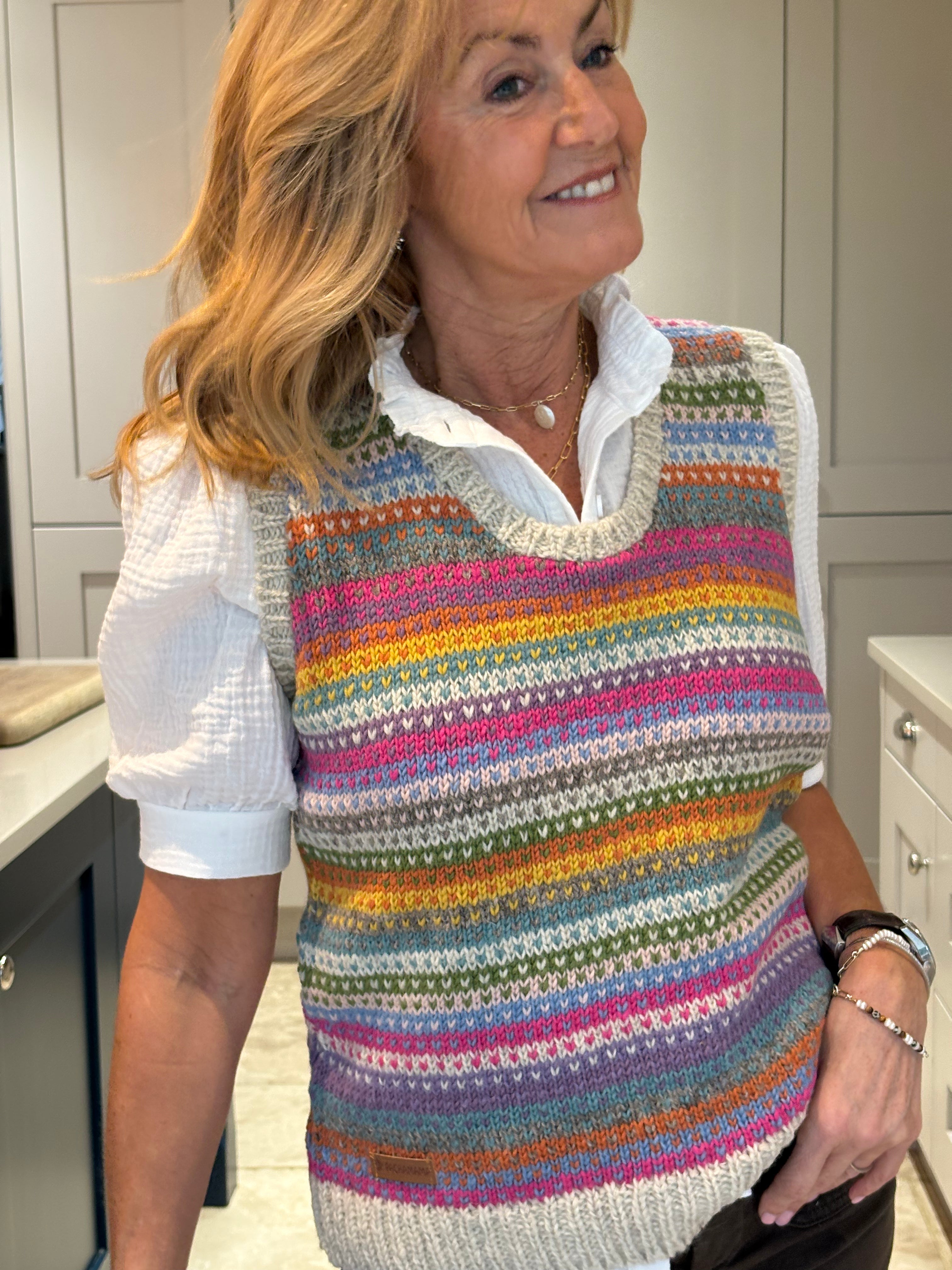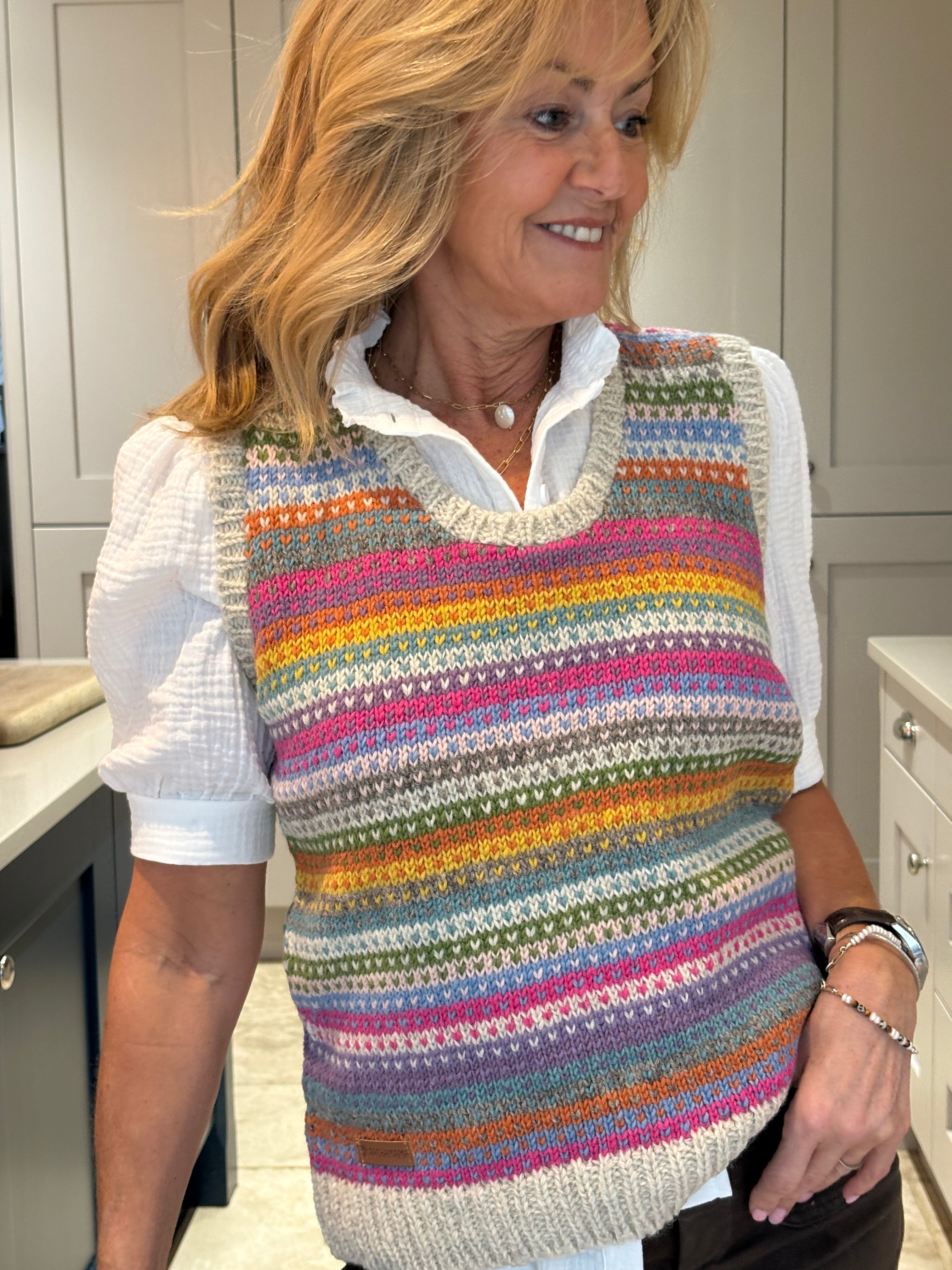 The Pink Patcha is made using traditional fair isle patterns mixed with modern colours. This timeless fair isle pattern has gorgeous bold colours perfect to keep you in style. This tank top is sure to keep you stylish and cosy in all seasons.