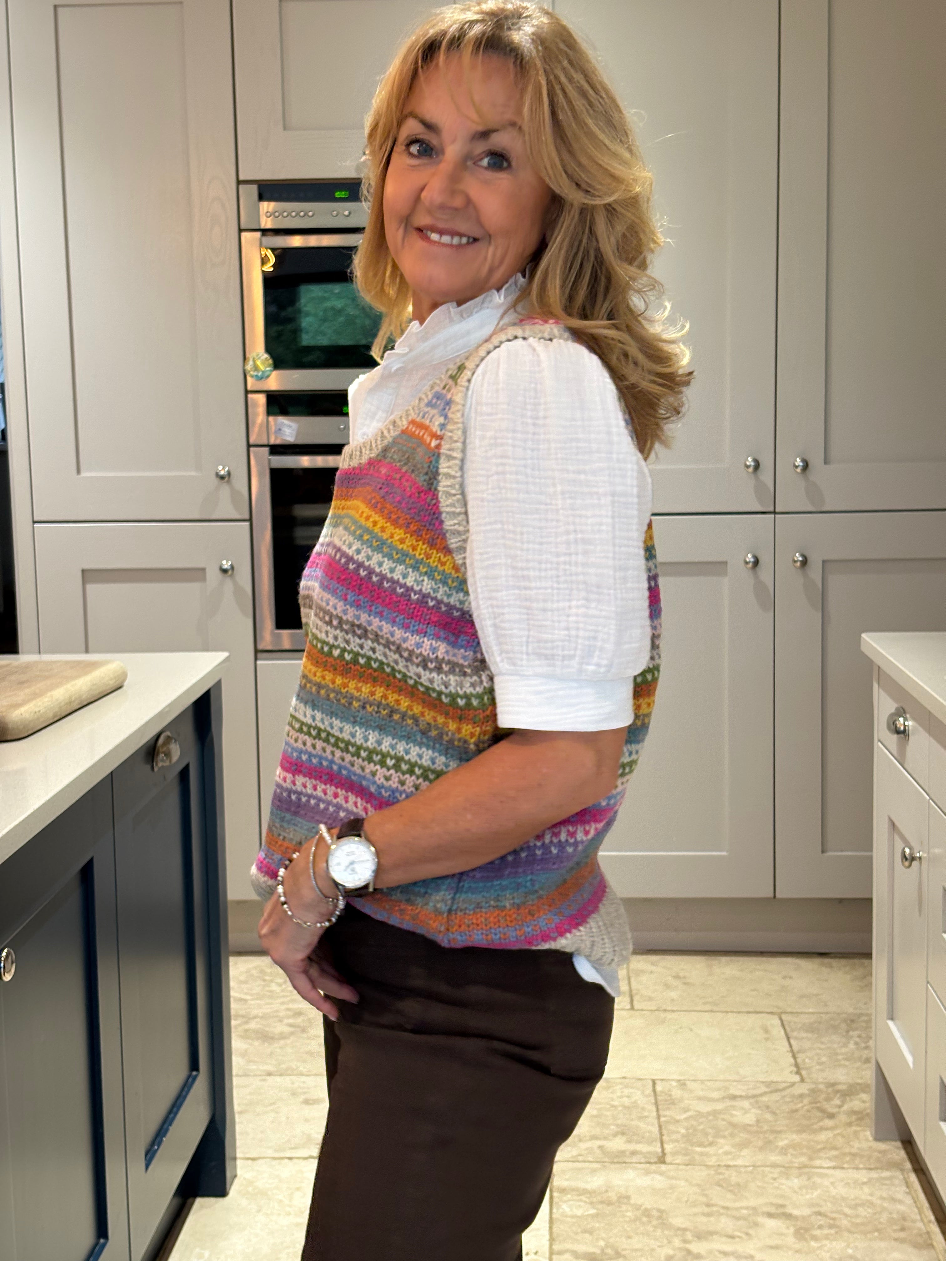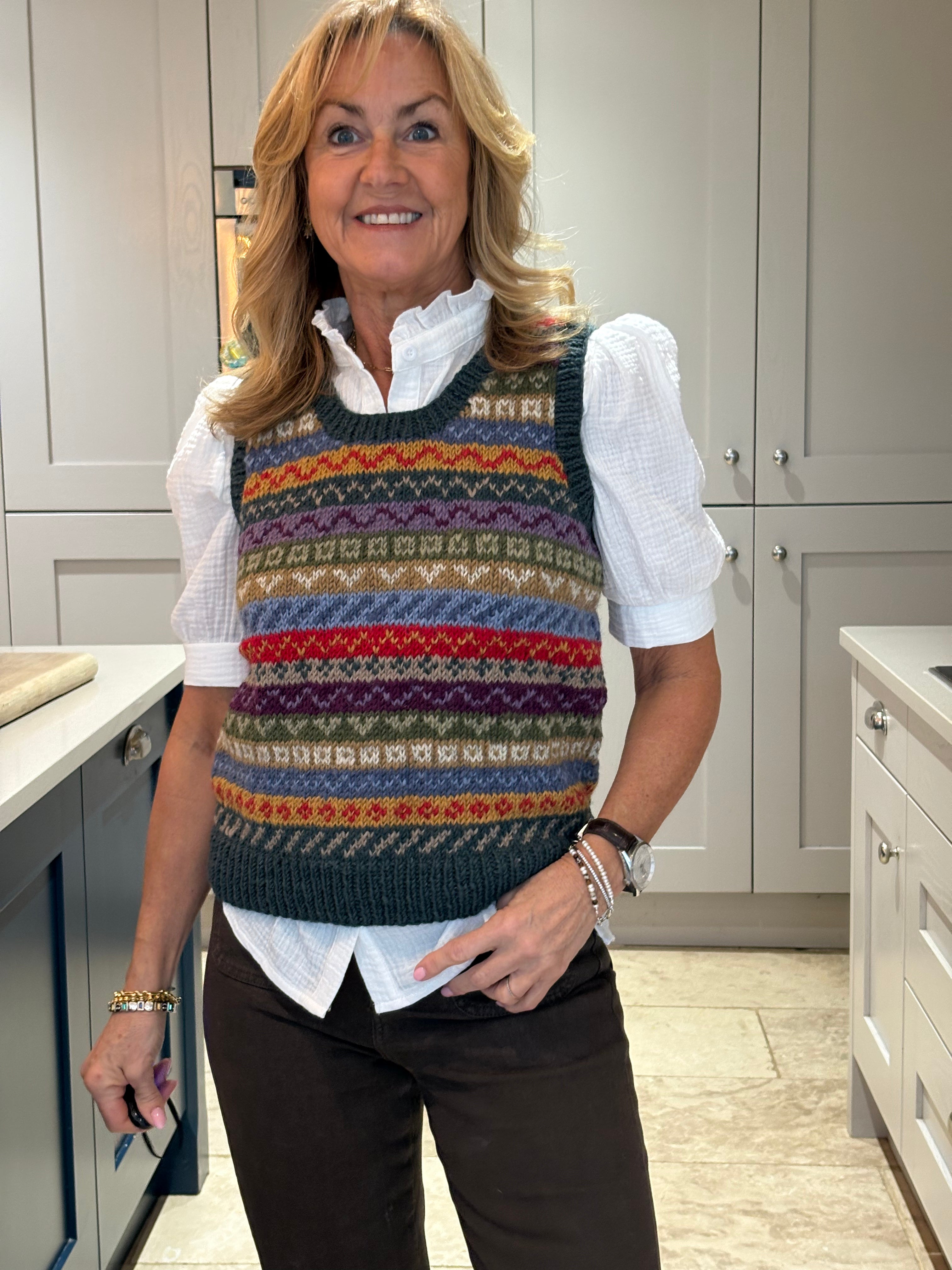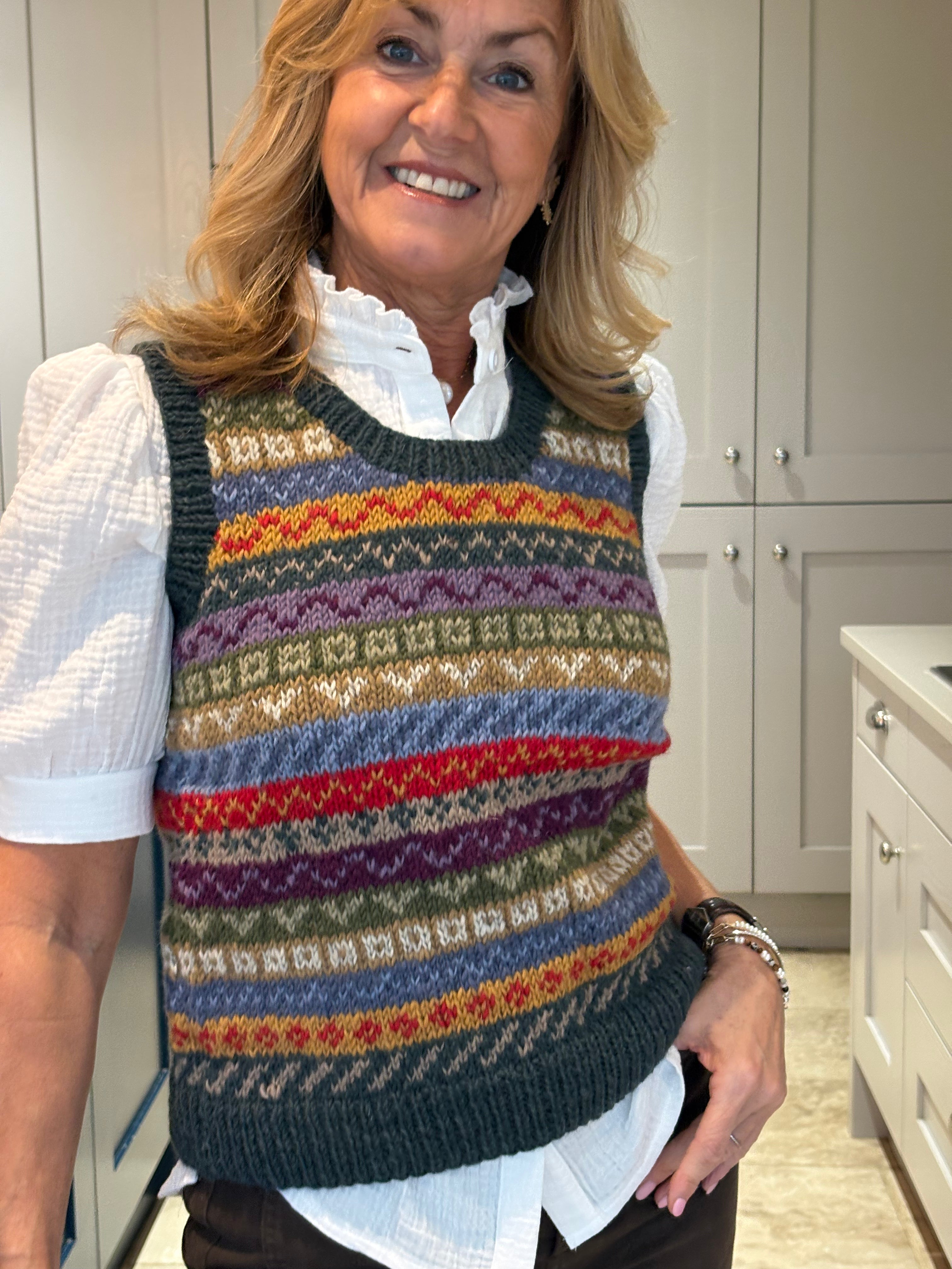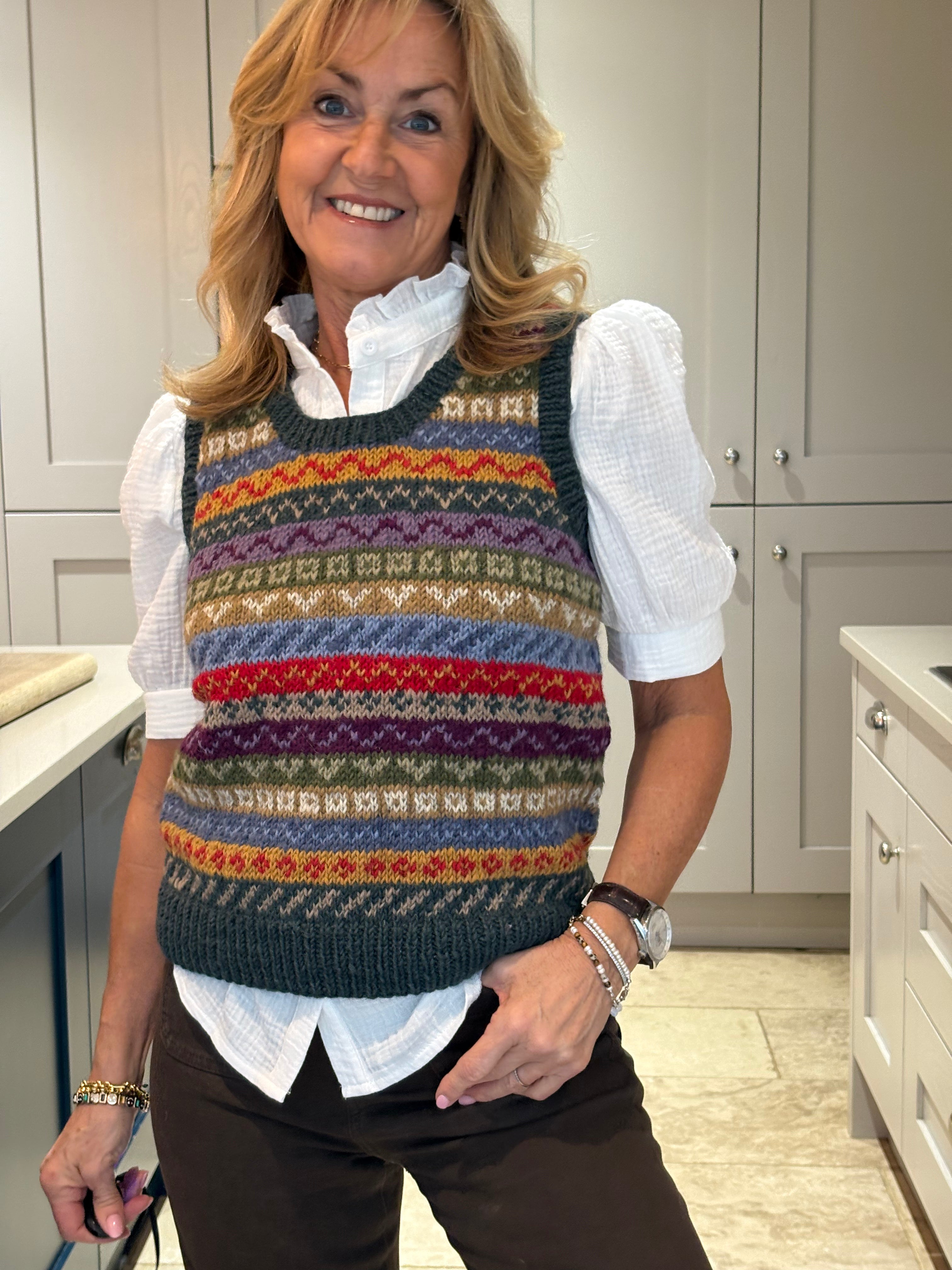 The Pink Patcha is made using traditional fair isle patterns mixed with modern colours. This timeless fair isle pattern has gorgeous bold colours perfect to keep you in style. This tank top is sure to keep you stylish and cosy in all seasons.