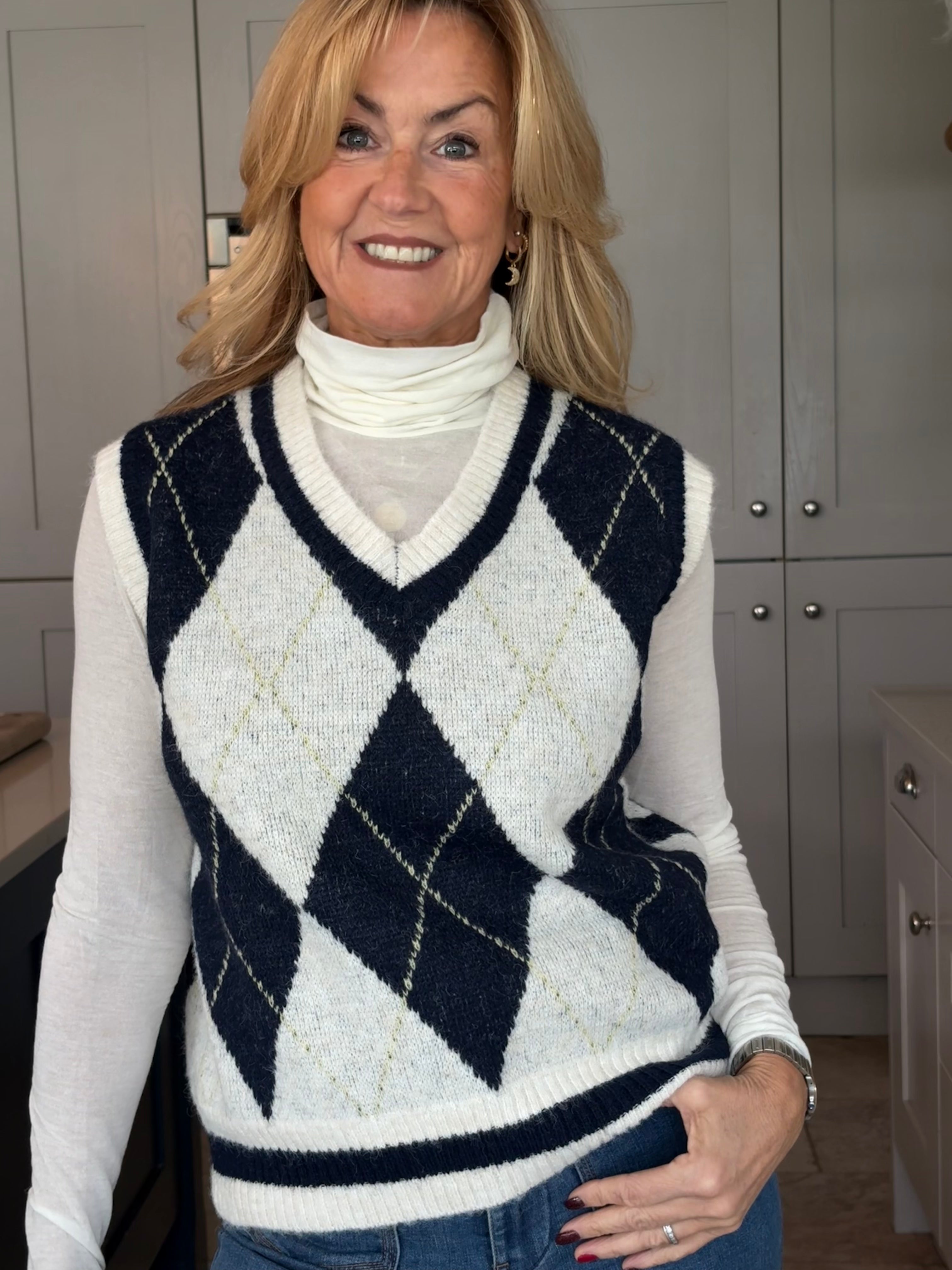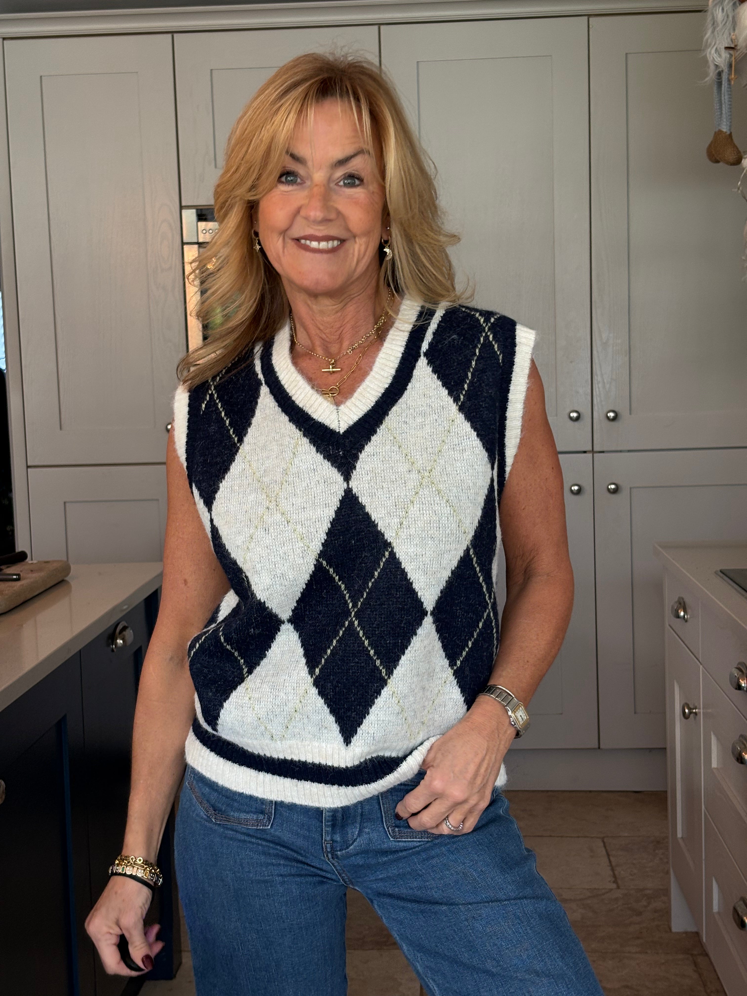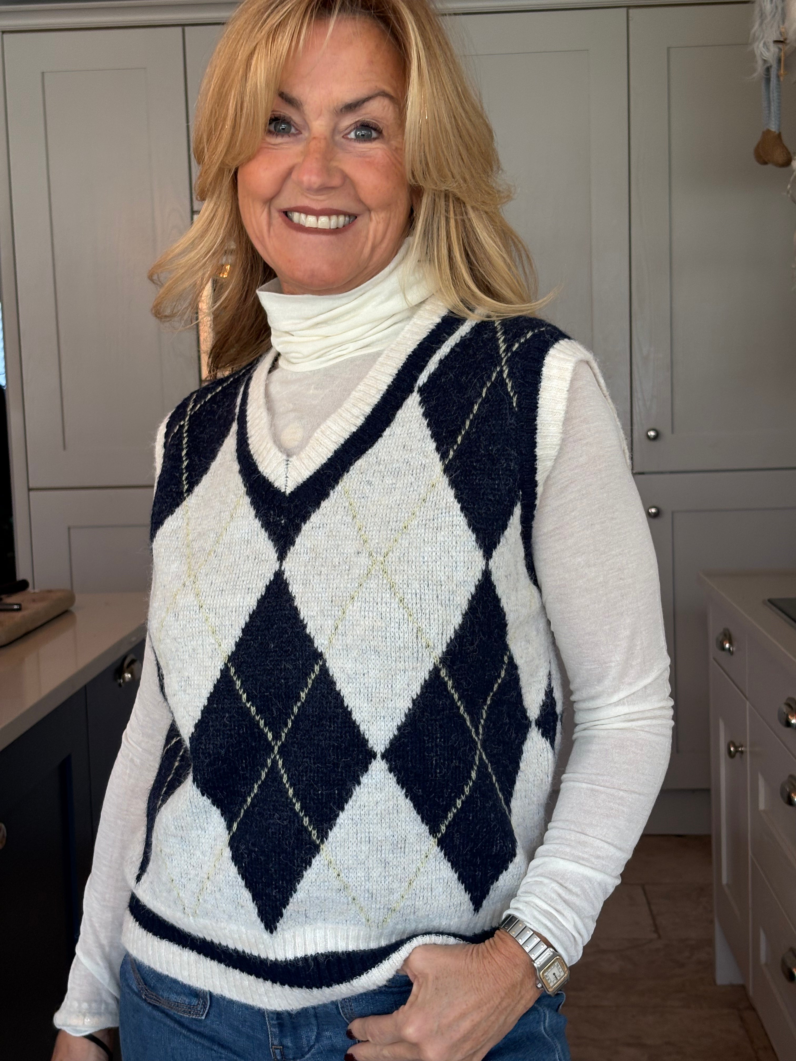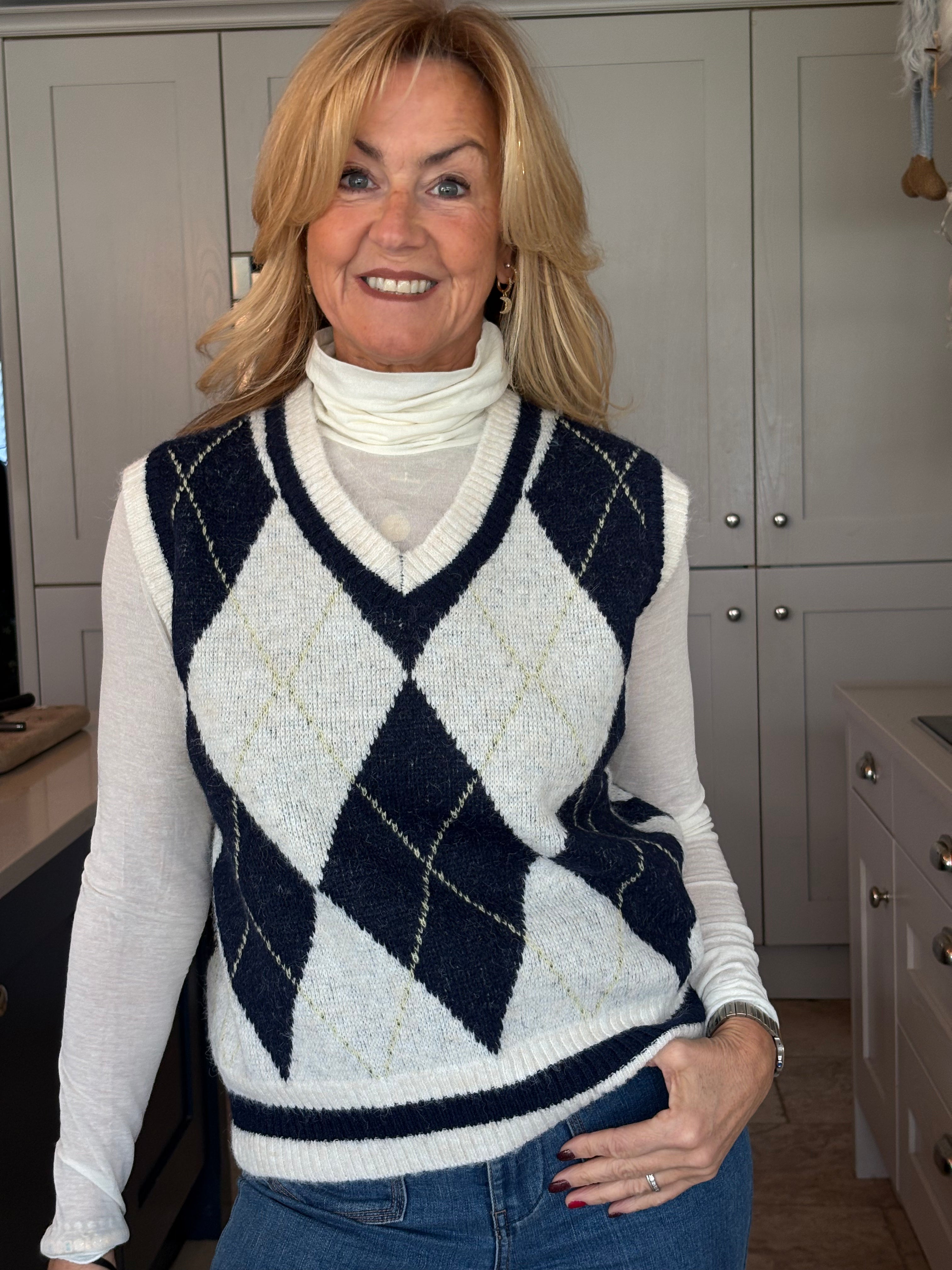 A sleeveless sweater with a chechered Argyle design in navy and ecru. A one size fitted jumper with a V neckline falling to hip length.
