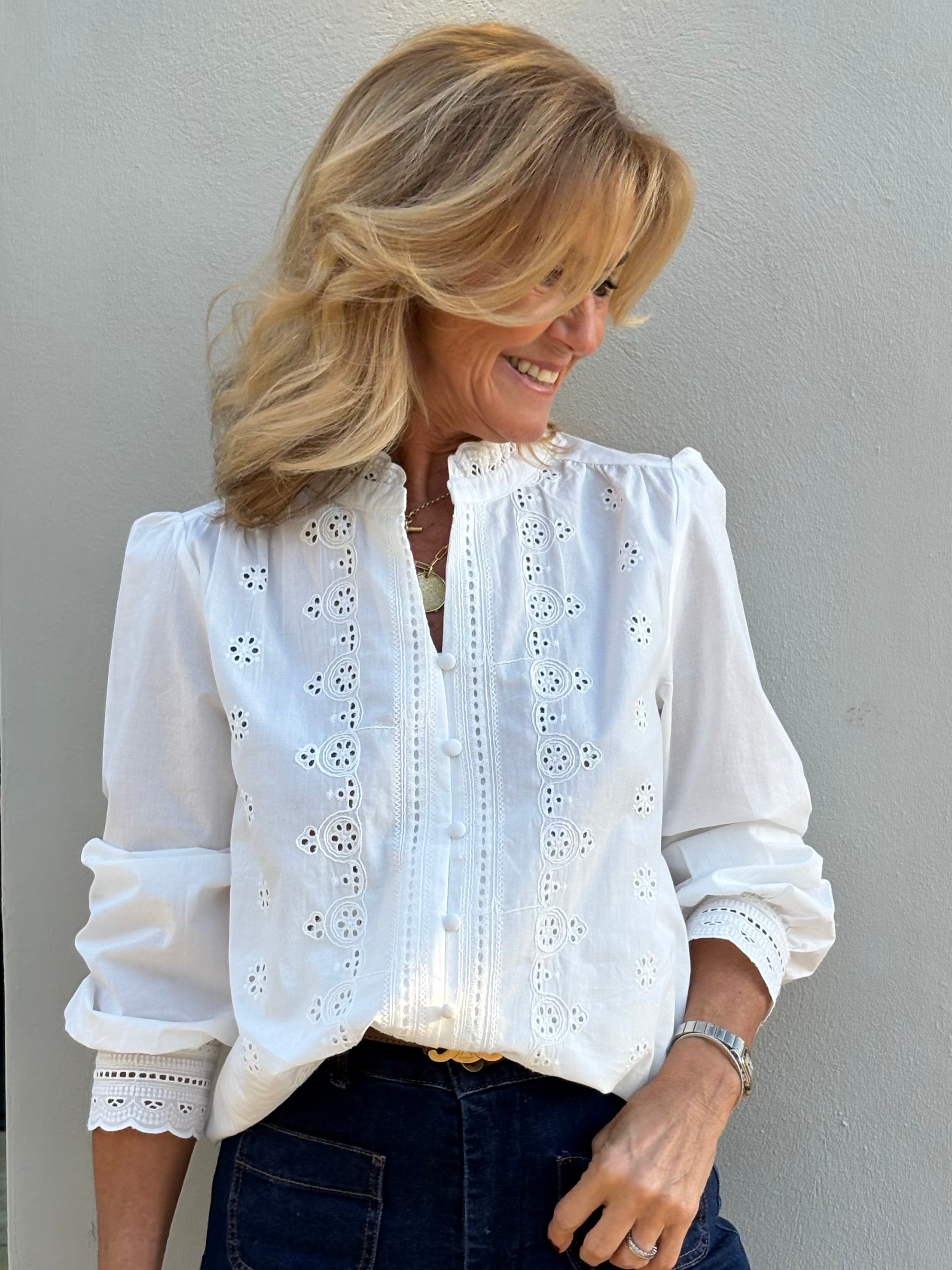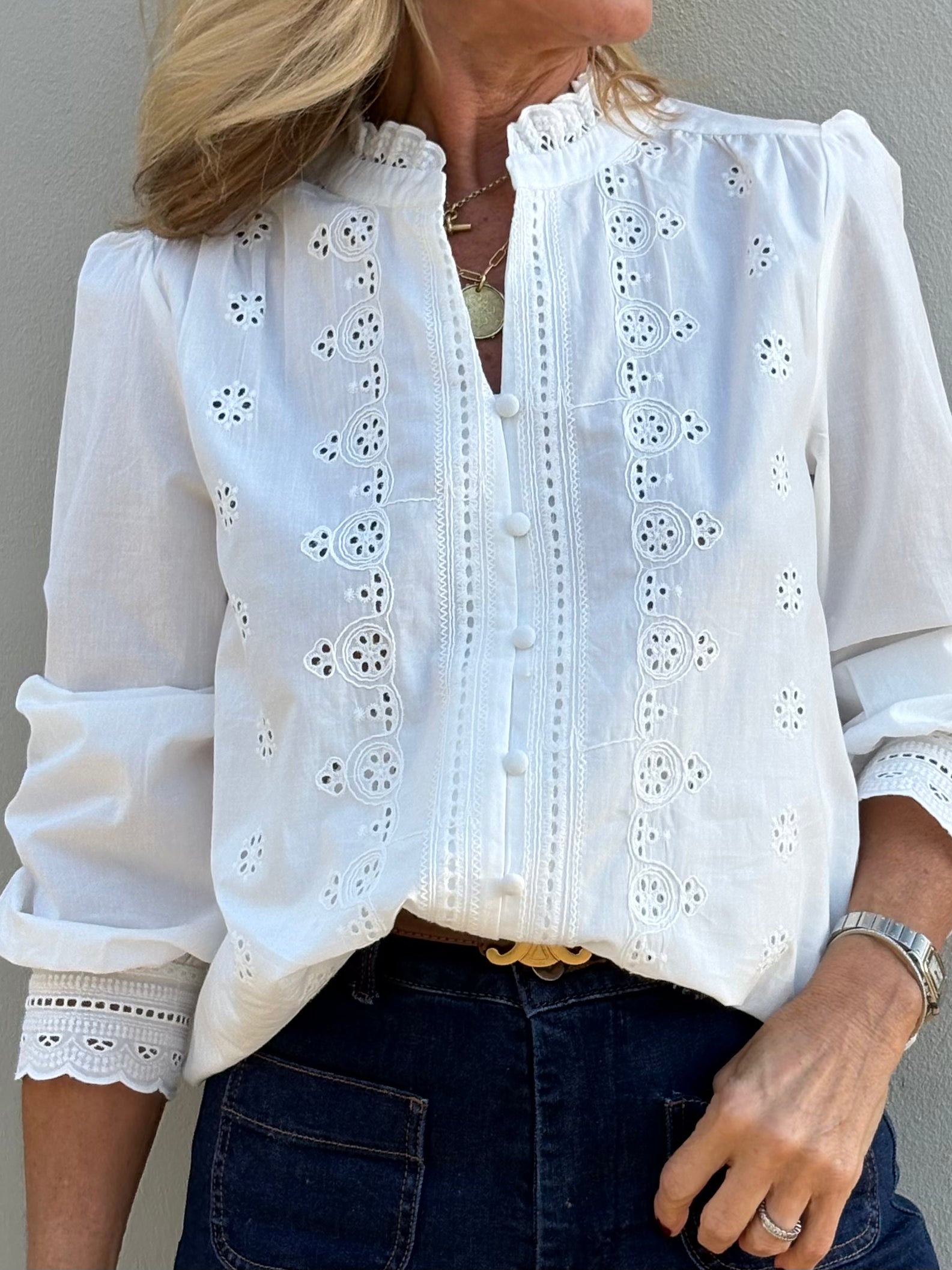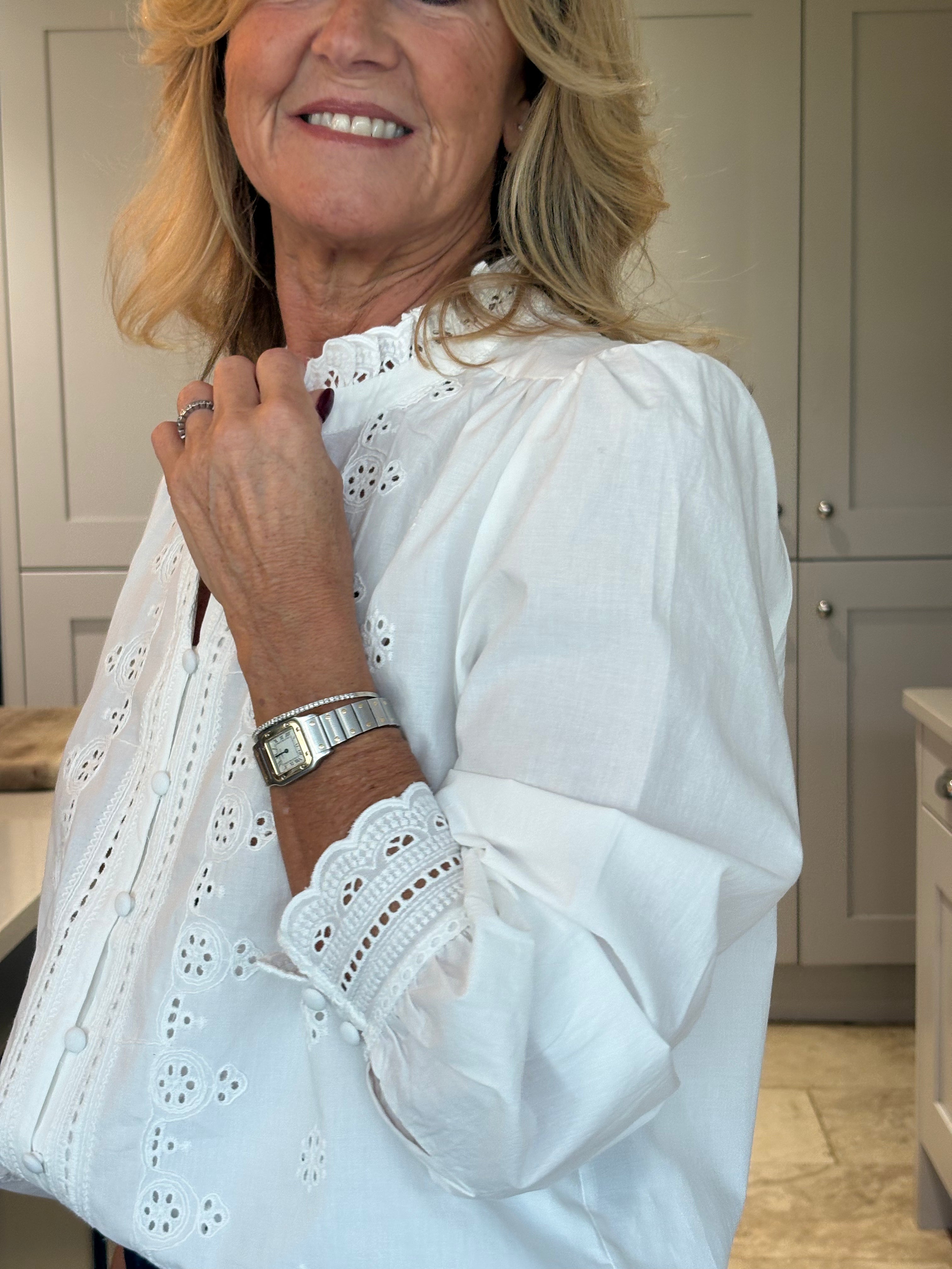 Nothing beats a classic white cotton blouse, and this one is truly exceptional. Crafted from a lovely weight fabric that feels rich and soft against the skin, it features a stand-up frill collar that adds a charming detail, complemented by a subtle V neckline for a touch of sophistication. The blouse is beautifully embroidered on the front and cuffs, enhancing its elegance and making it a standout piece. Versatile and fresh, this blouse can easily transition from a day at the office to an evening out, making it an essential addition to any wardrobe. Its timeless design ensures it will remain a favorite for years to come.