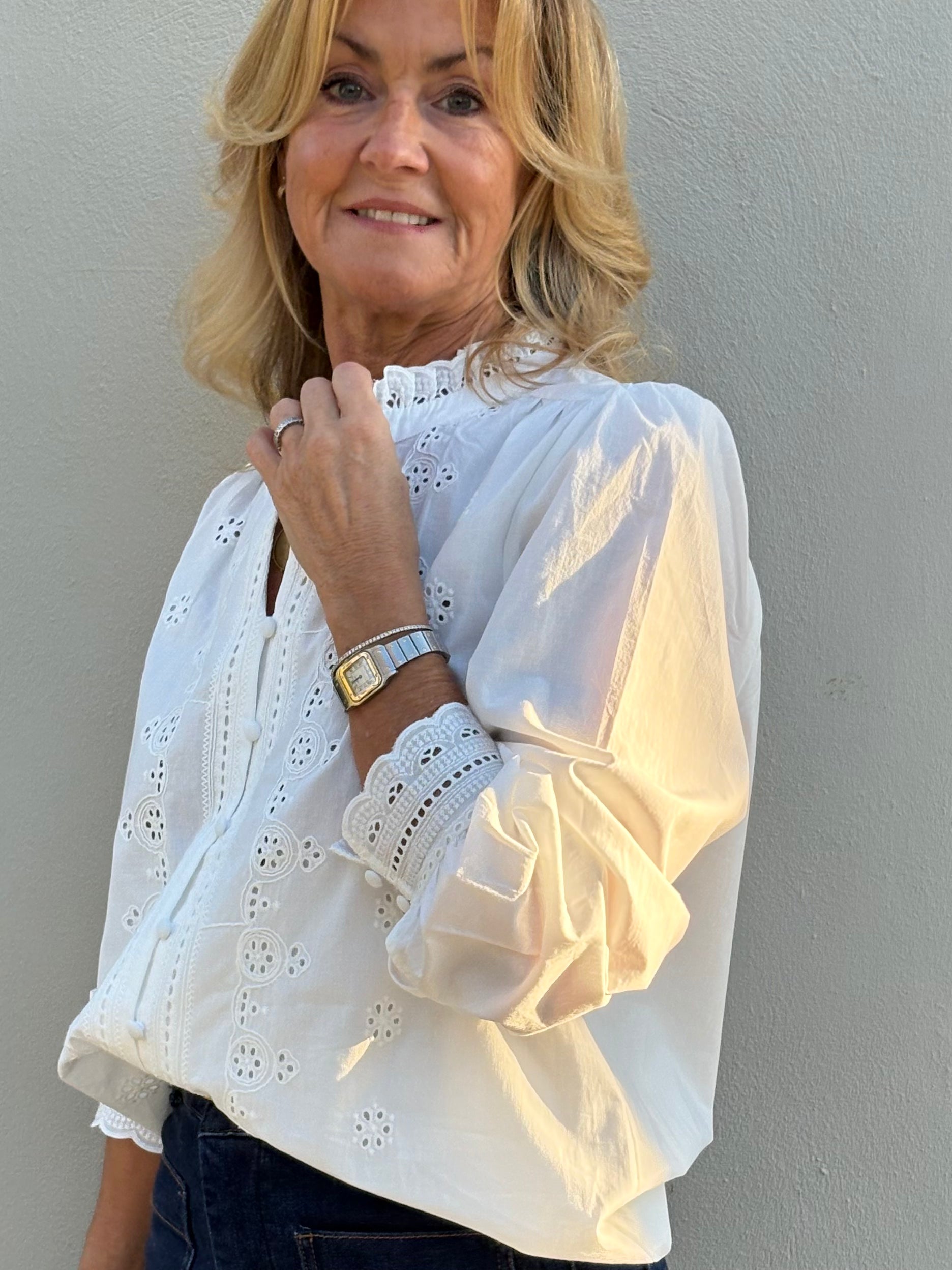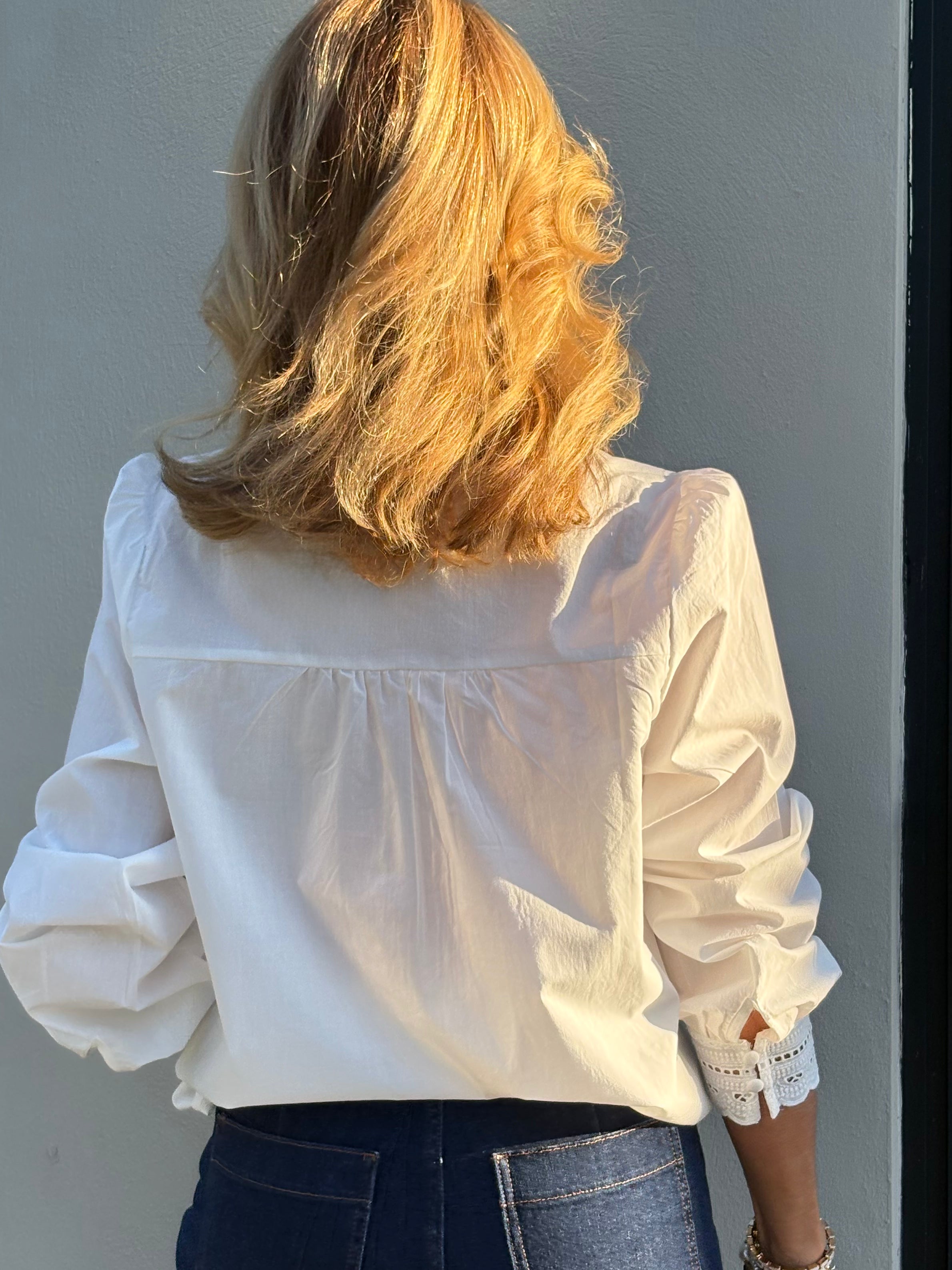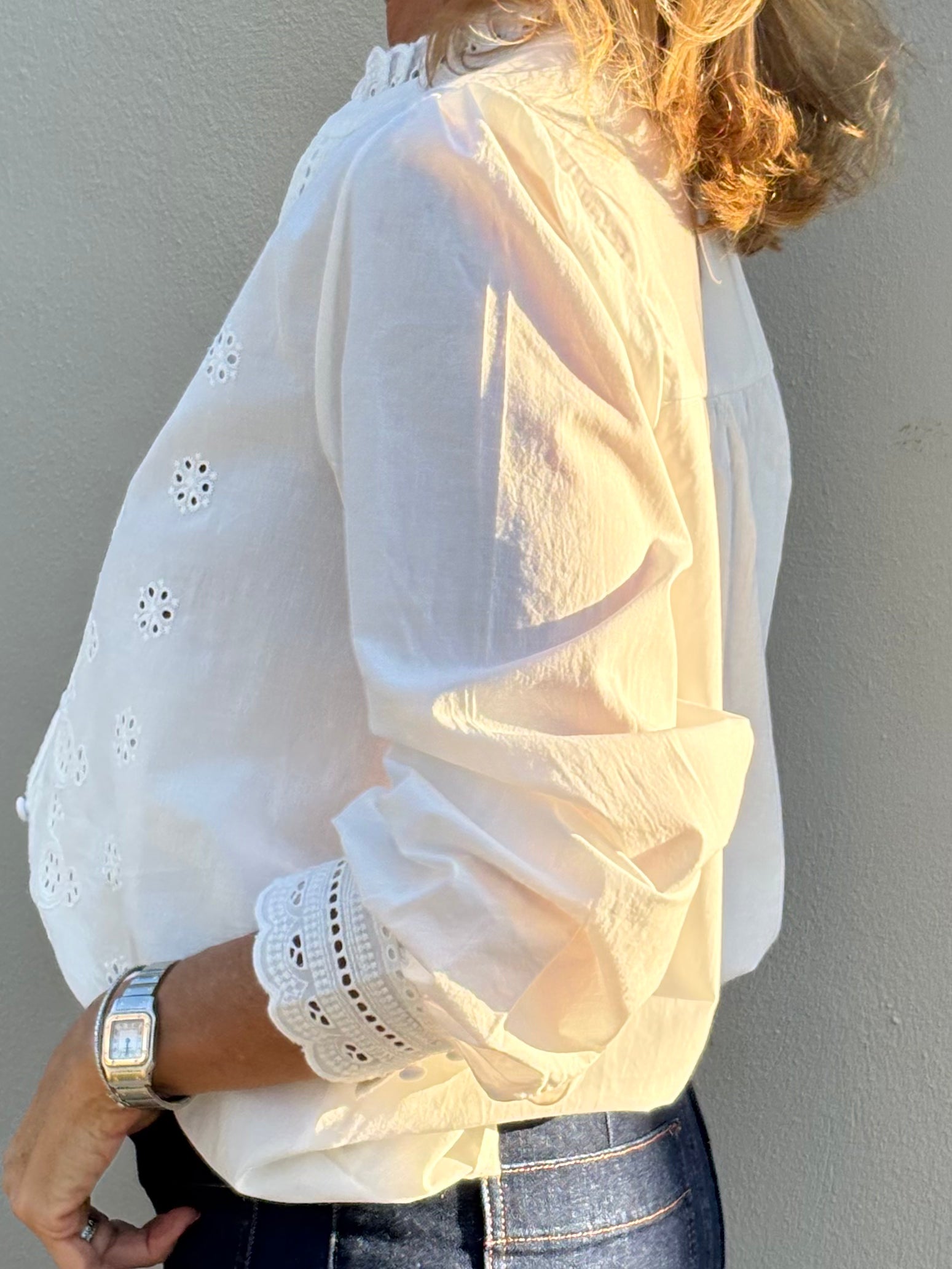 Nothing beats a classic white cotton blouse, and this one is truly exceptional. Crafted from a lovely weight fabric that feels rich and soft against the skin, it features a stand-up frill collar that adds a charming detail, complemented by a subtle V neckline for a touch of sophistication. The blouse is beautifully embroidered on the front and cuffs, enhancing its elegance and making it a standout piece. Versatile and fresh, this blouse can easily transition from a day at the office to an evening out, making it an essential addition to any wardrobe. Its timeless design ensures it will remain a favorite for years to come.