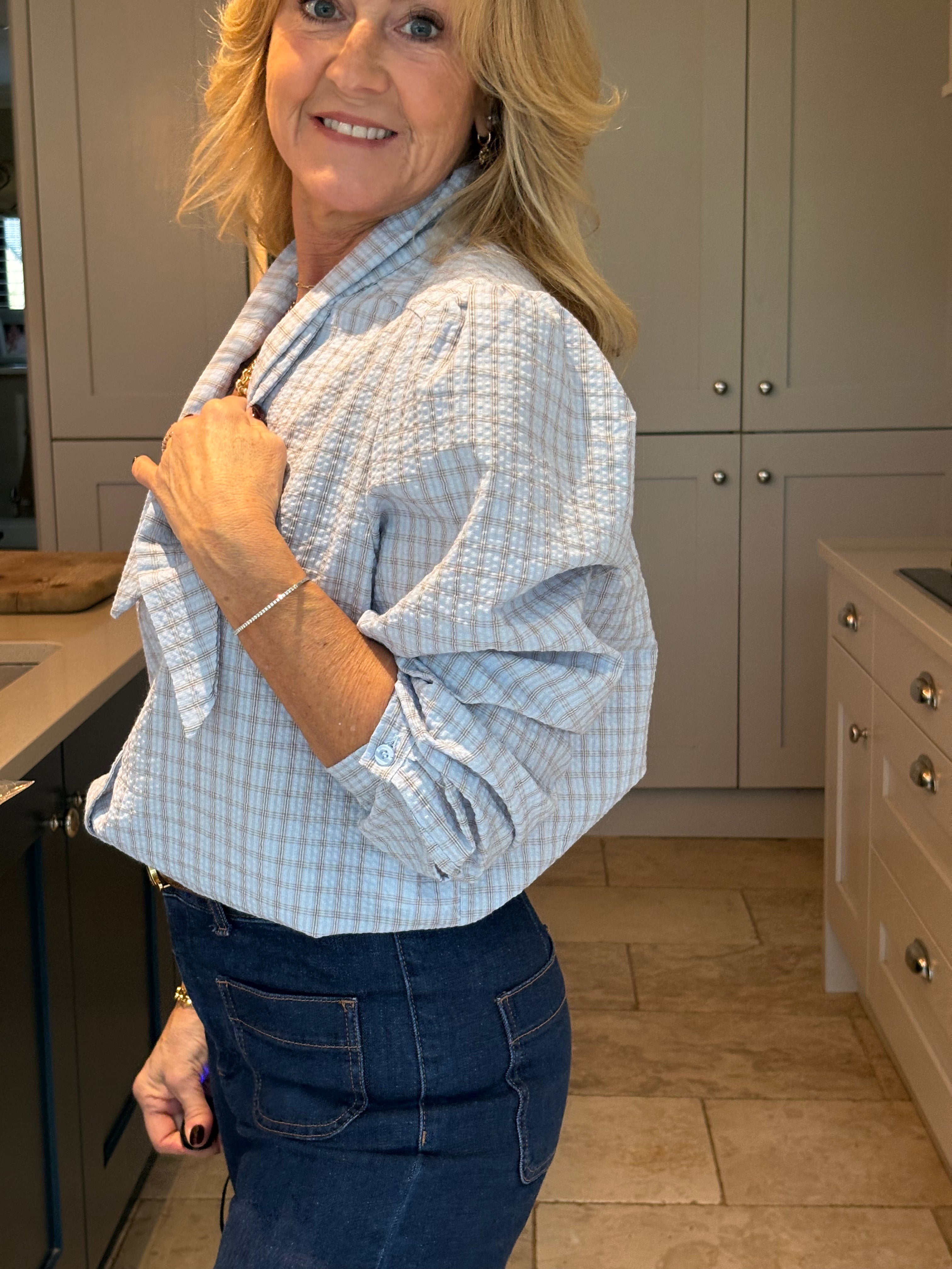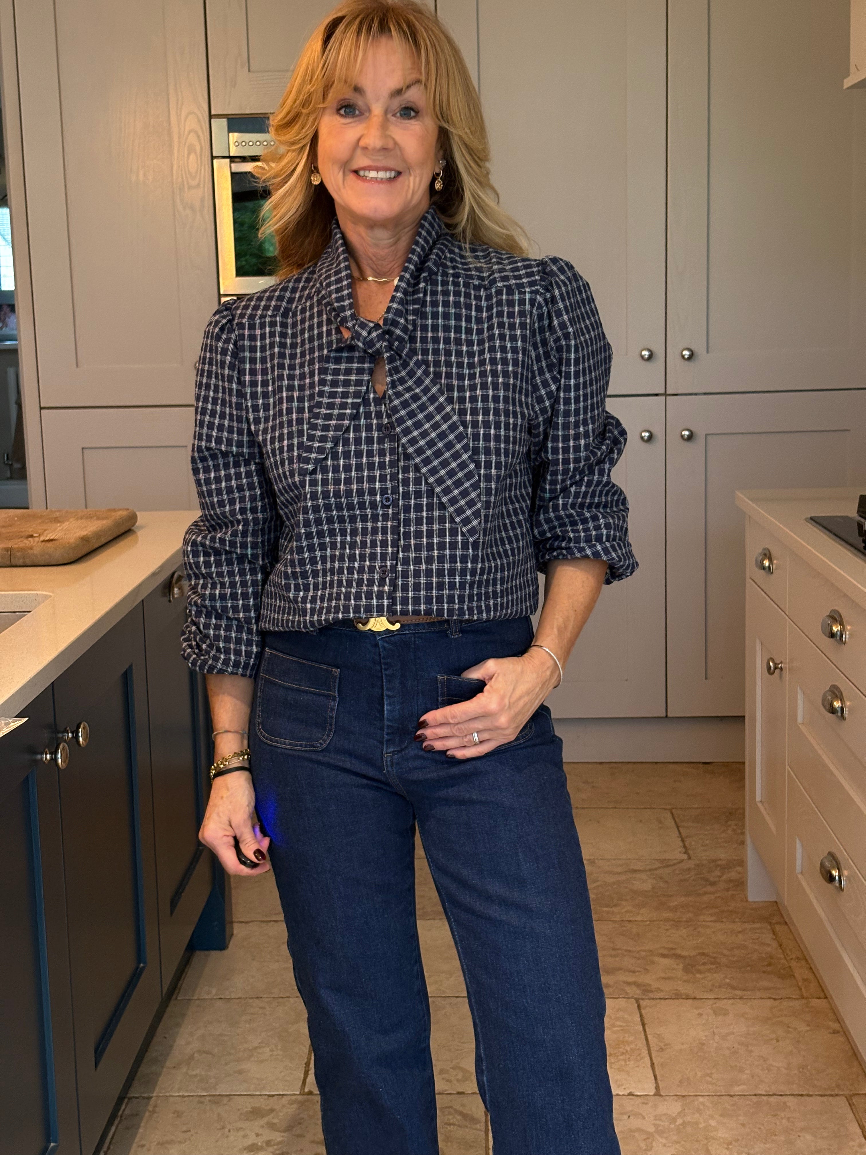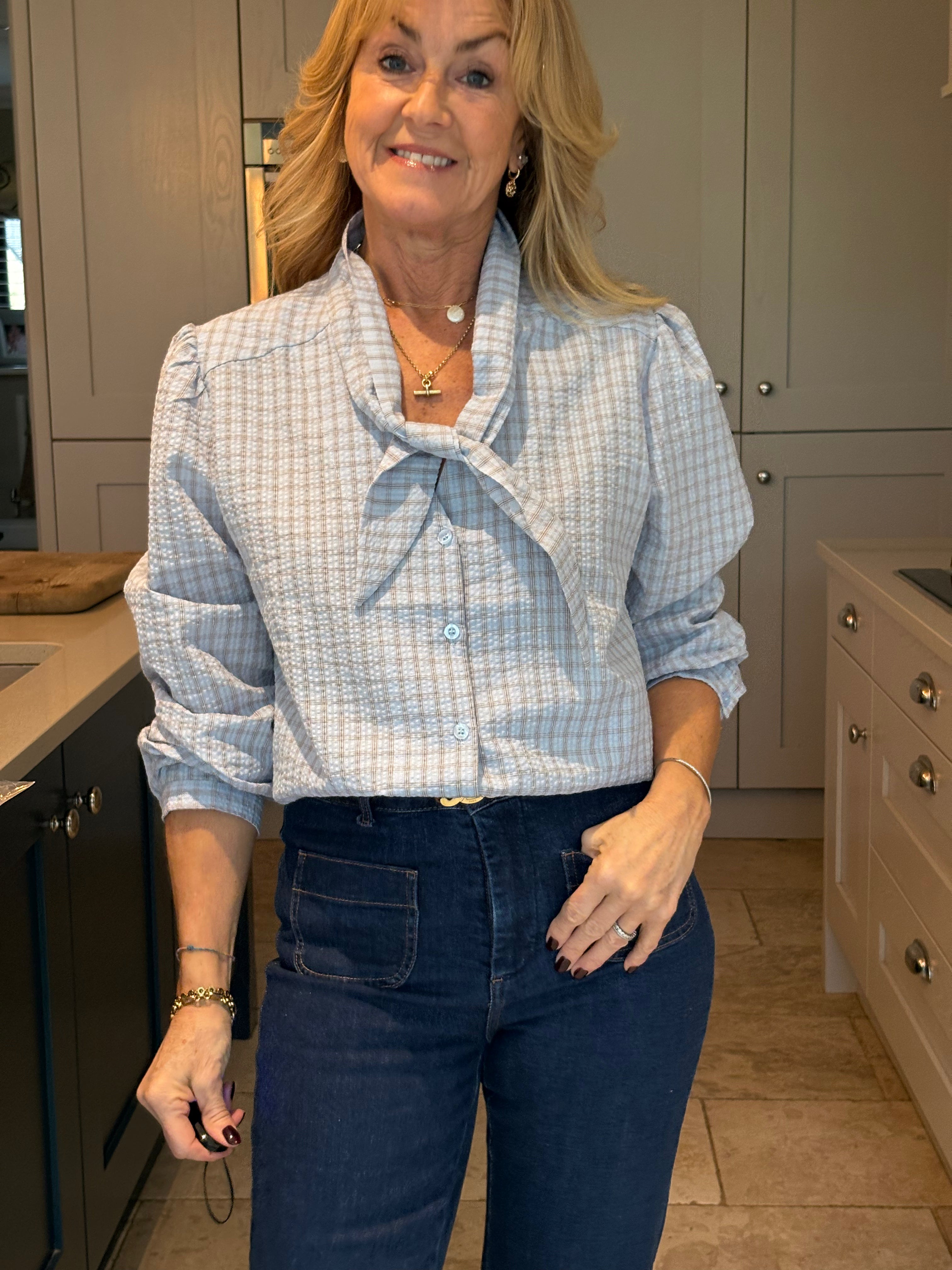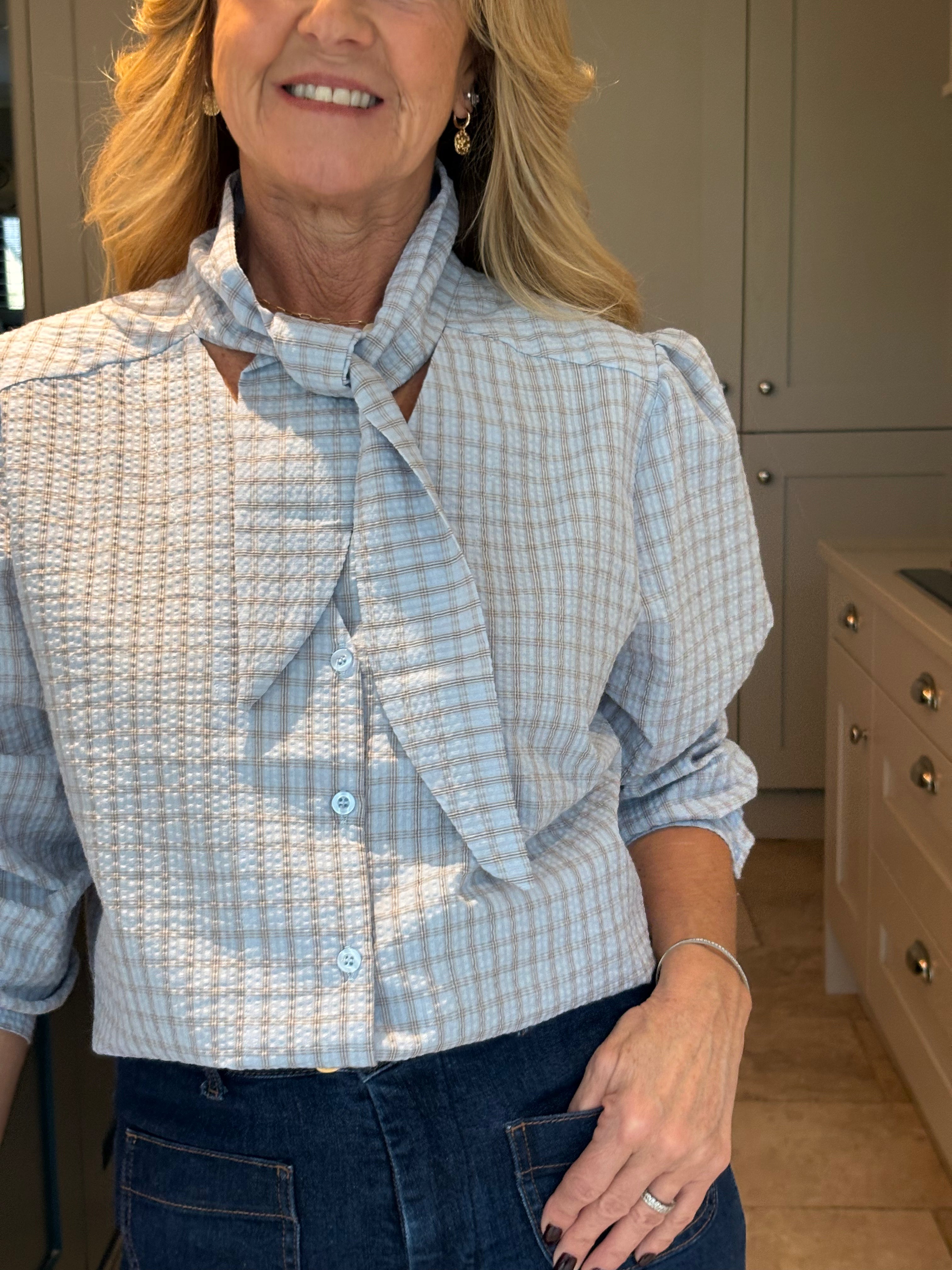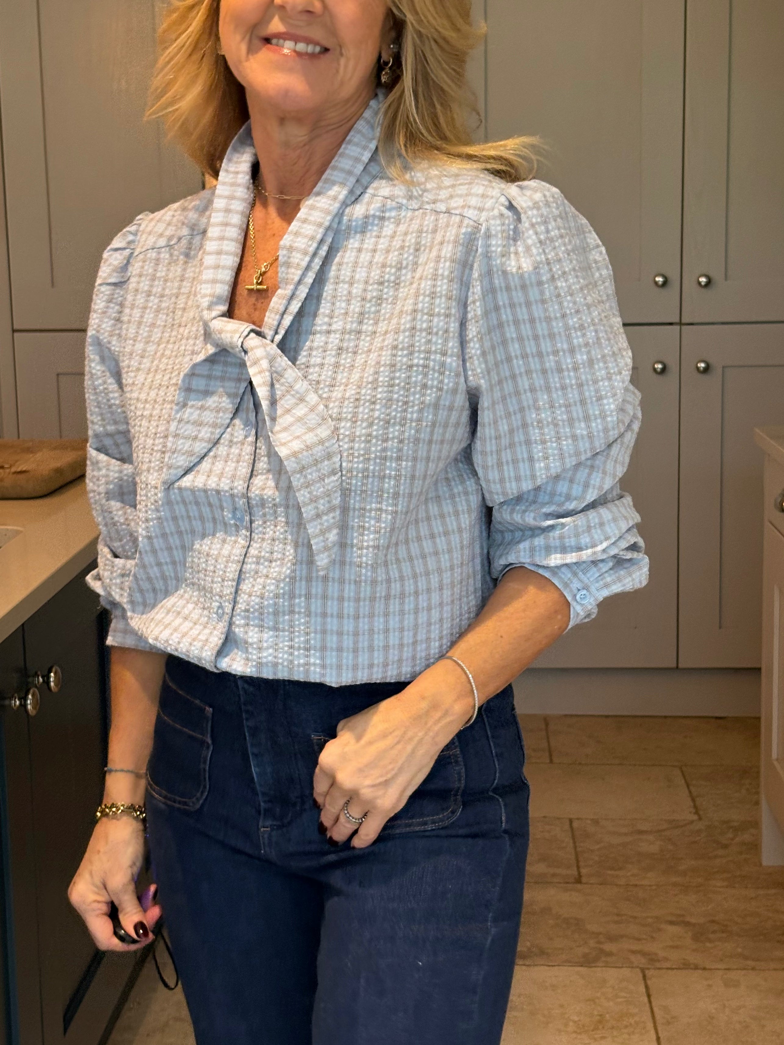 The Yara is a lovely checked blouse with a knotted neck tie. Slightly boxy with a classic shirt hemline allowing it to be worn tucked in or left loose. Gorgeous puffed sleeves and a small, subtle cuff. In two pretty shades of blue.