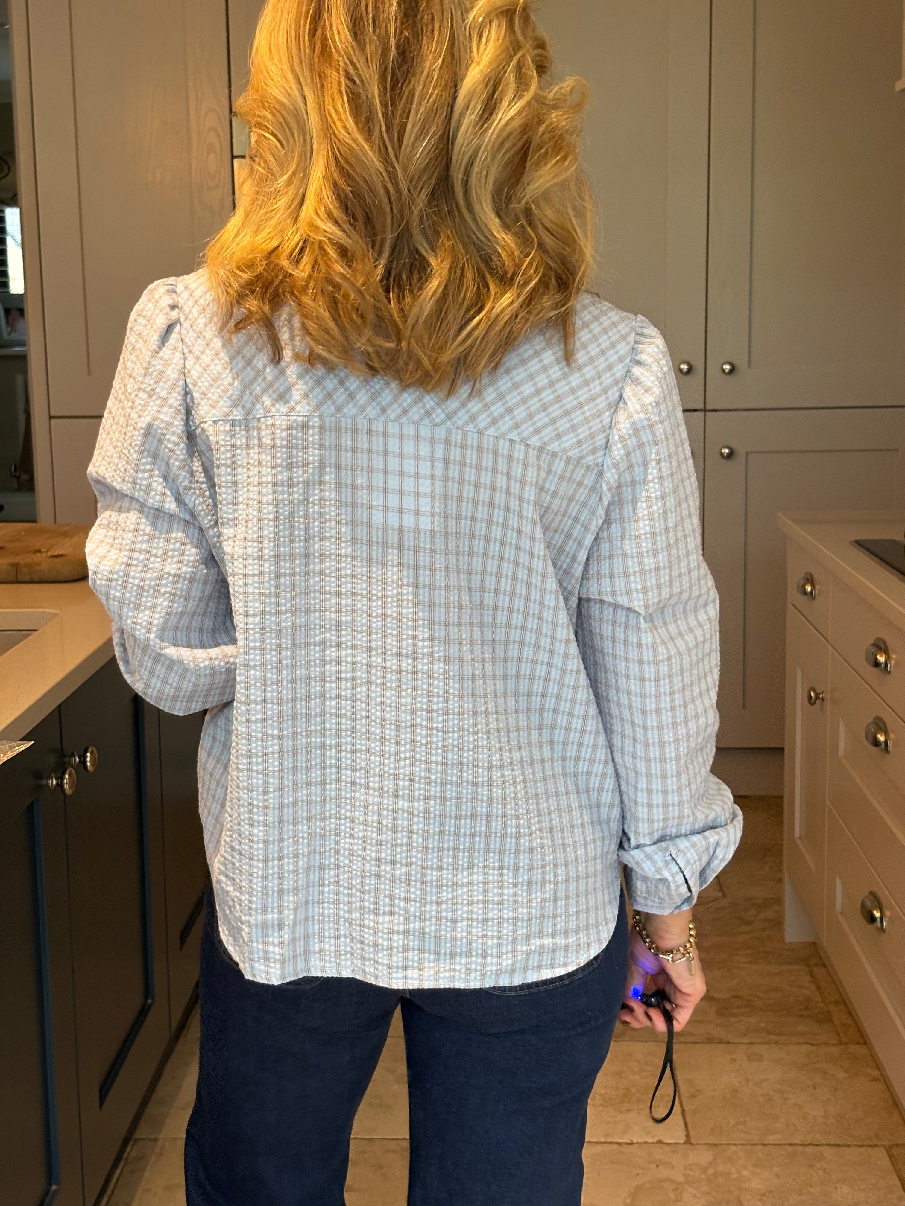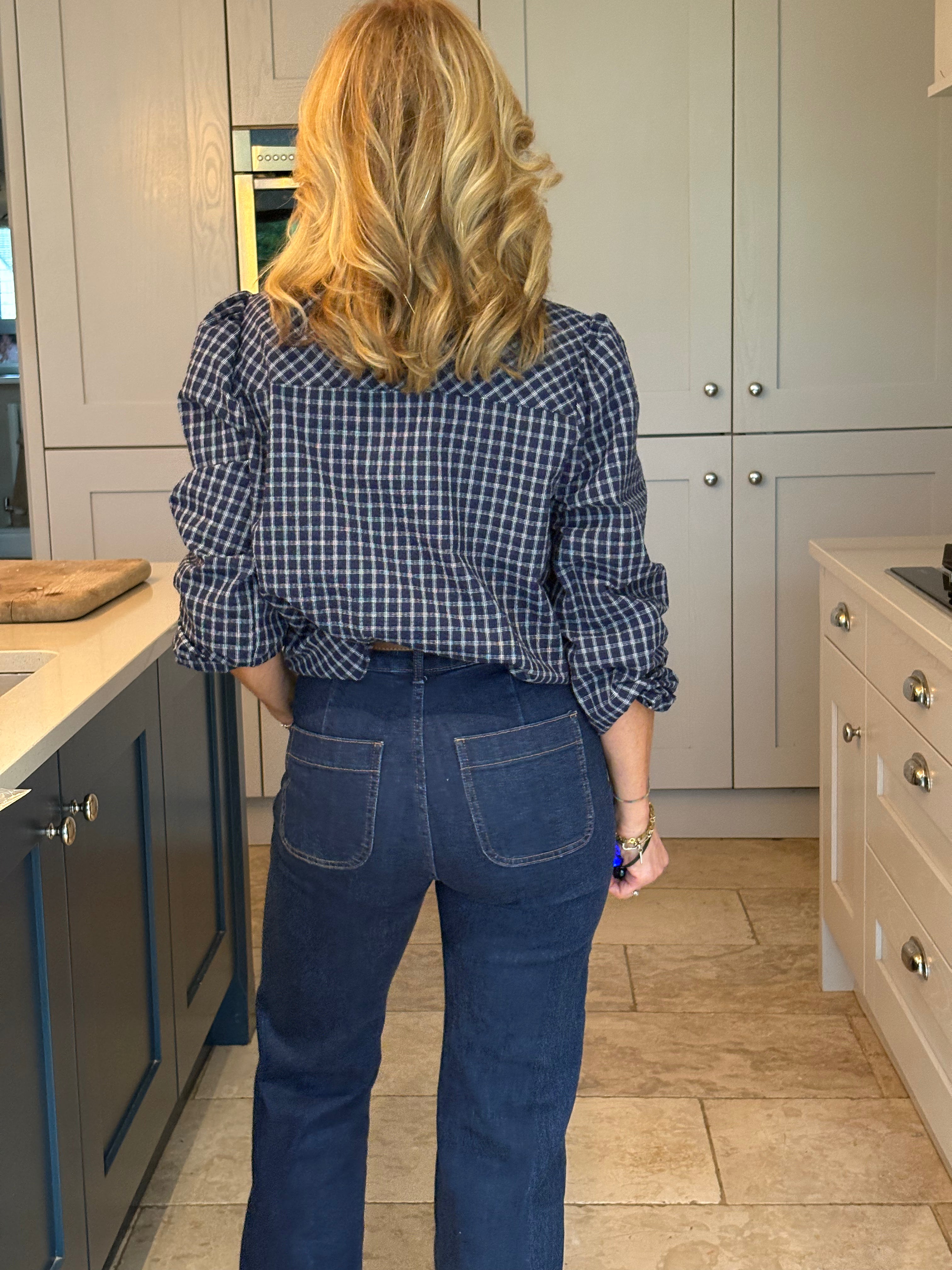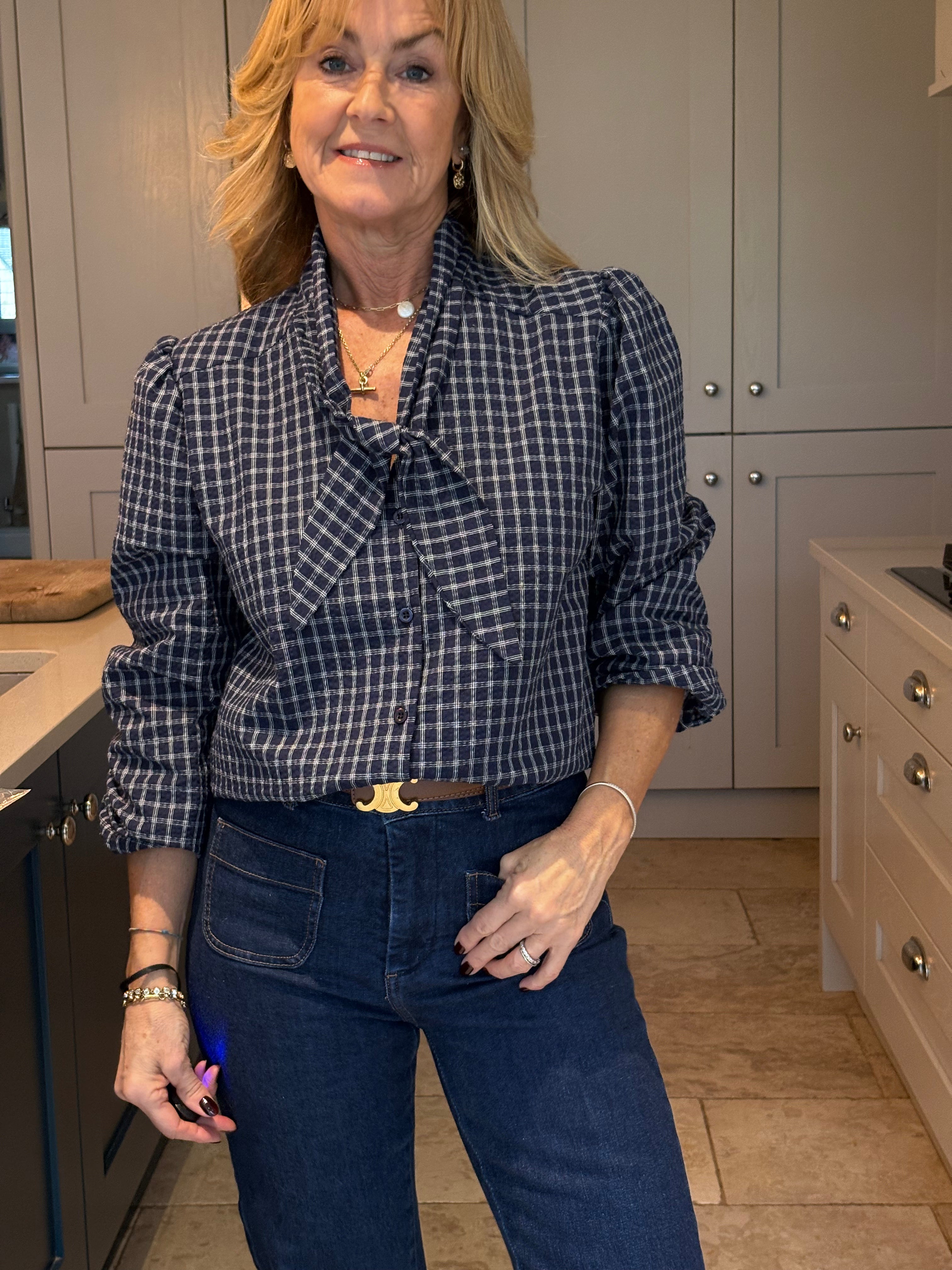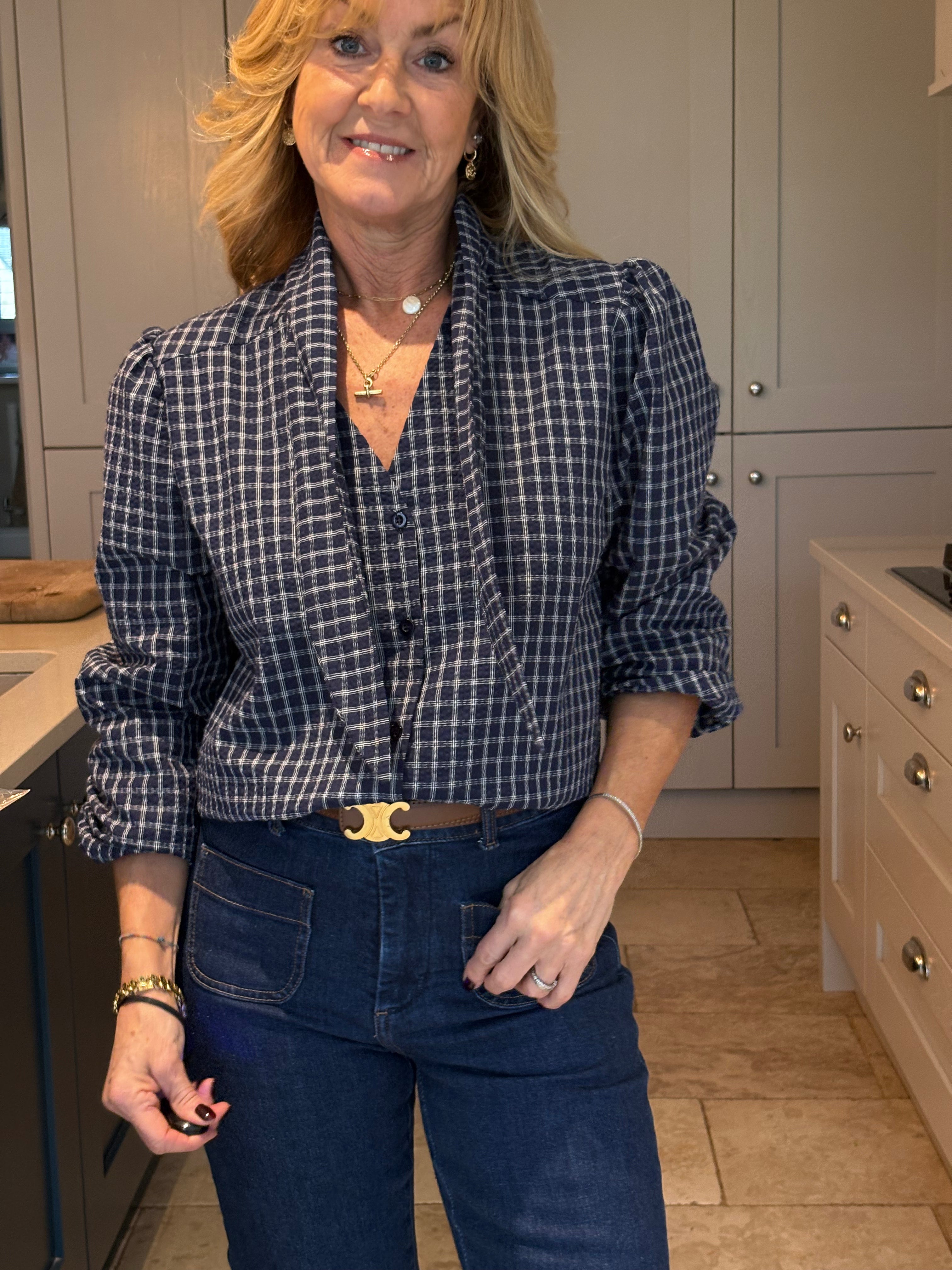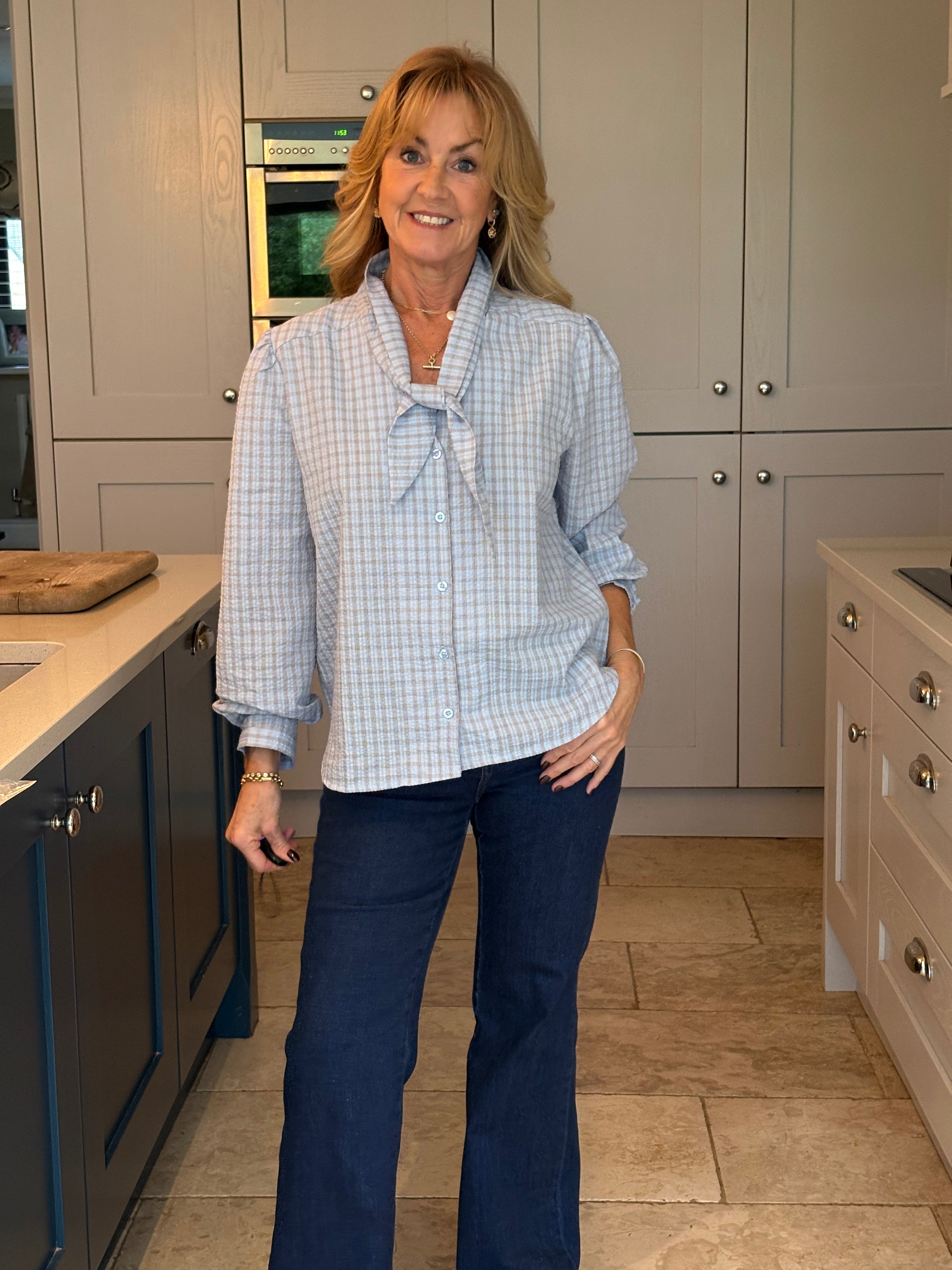 The Yara is a lovely checked blouse with a knotted neck tie. Slightly boxy with a classic shirt hemline allowing it to be worn tucked in or left loose. Gorgeous puffed sleeves and a small, subtle cuff. In two pretty shades of blue.