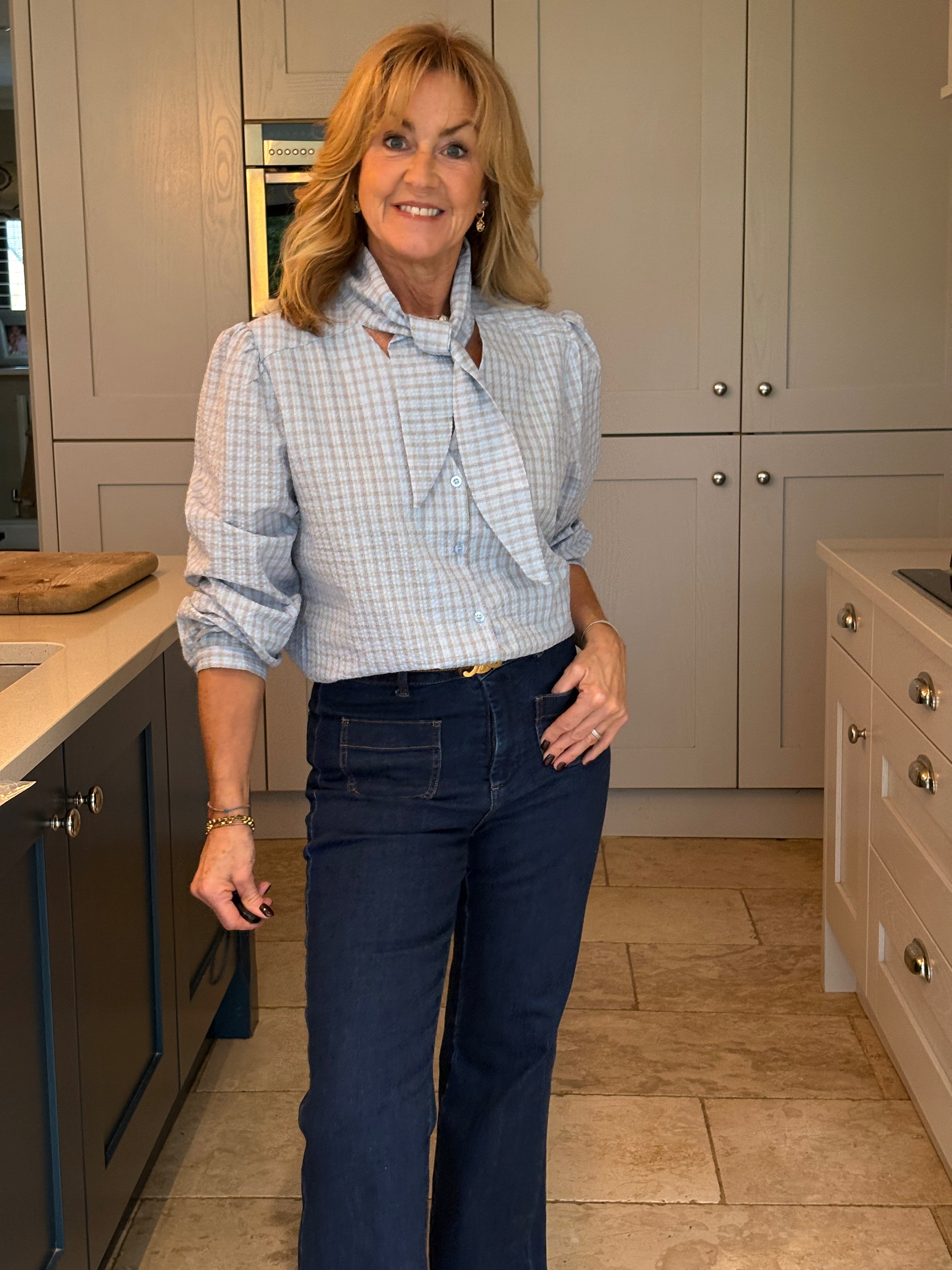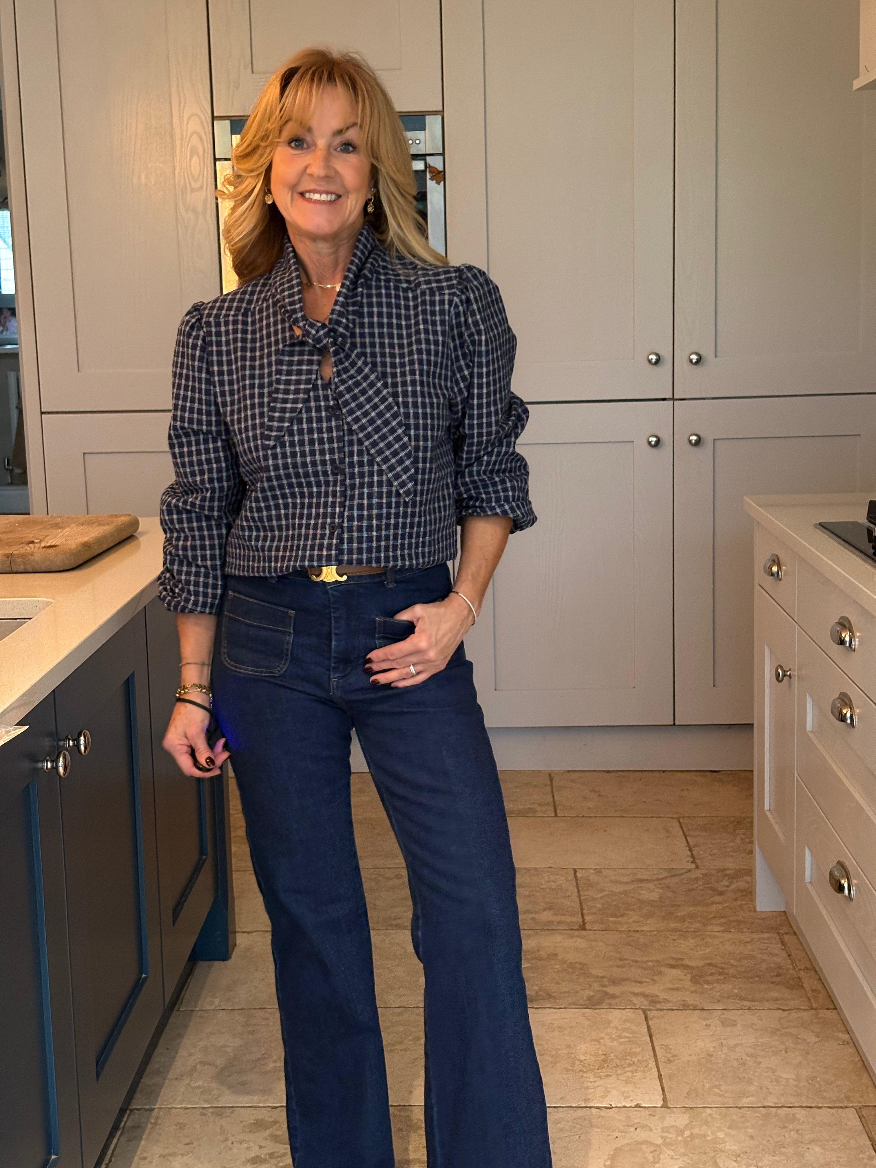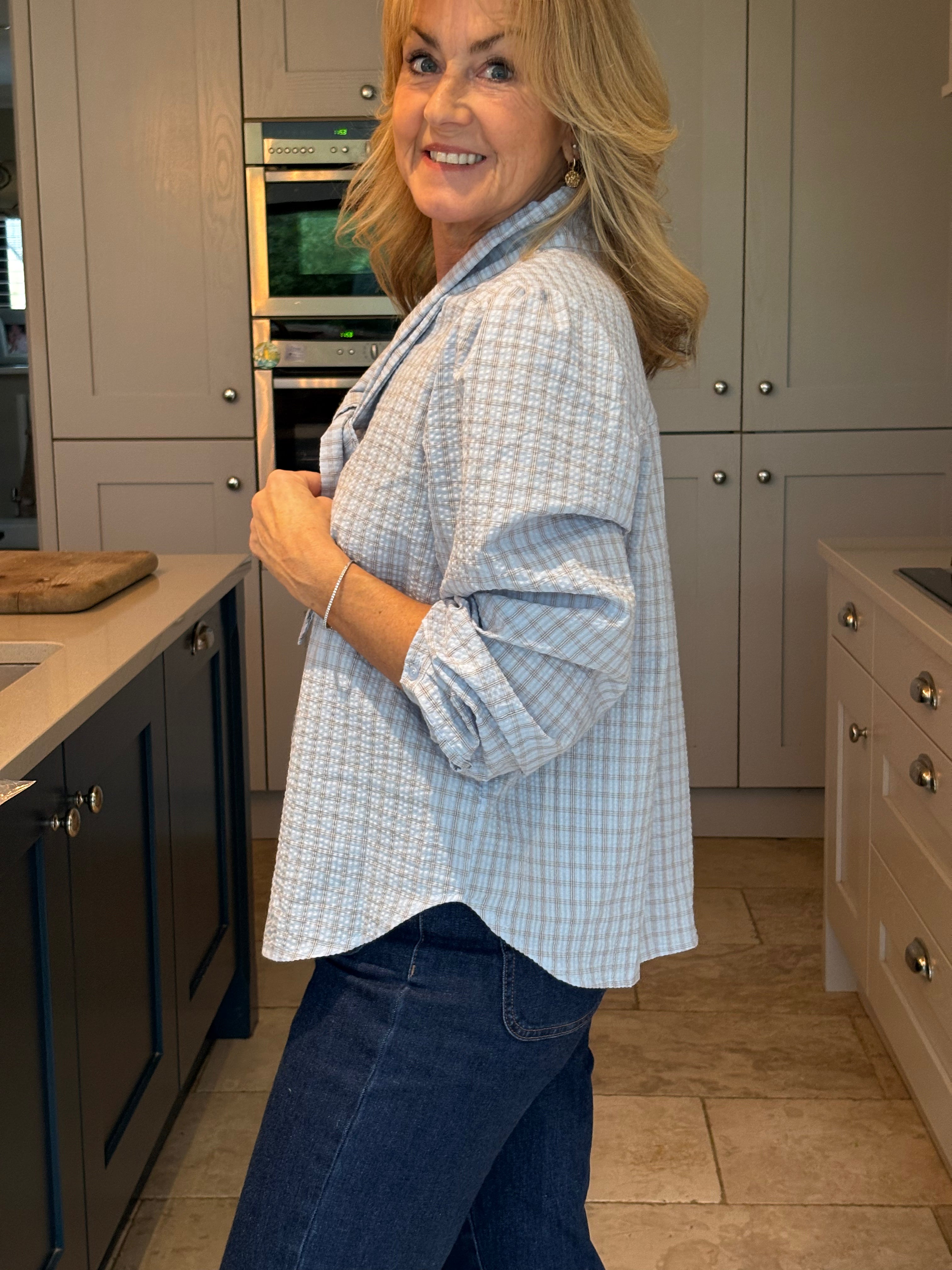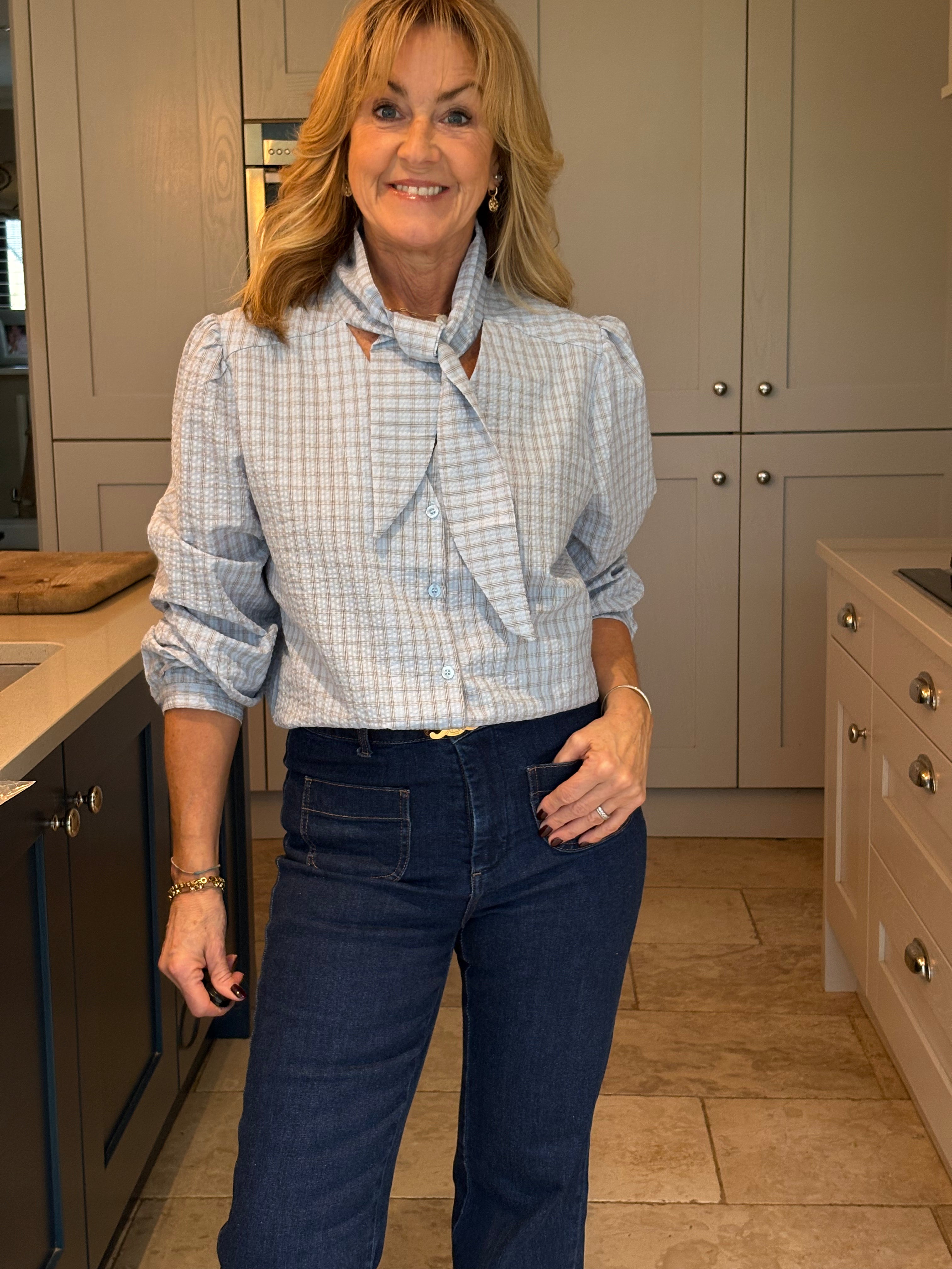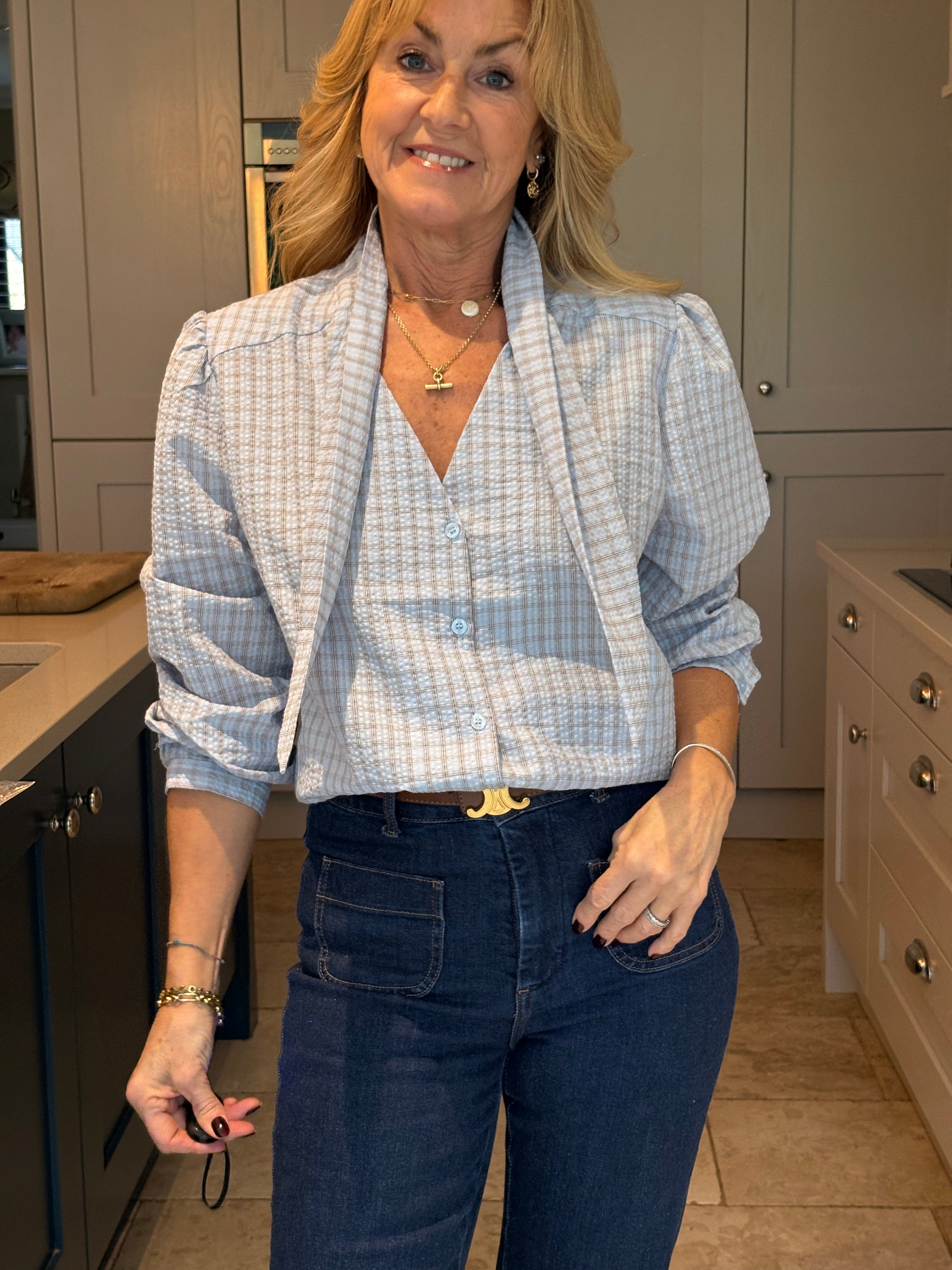 The Yara is a lovely checked blouse with a knotted neck tie. Slightly boxy with a classic shirt hemline allowing it to be worn tucked in or left loose. Gorgeous puffed sleeves and a small, subtle cuff. In two pretty shades of blue.