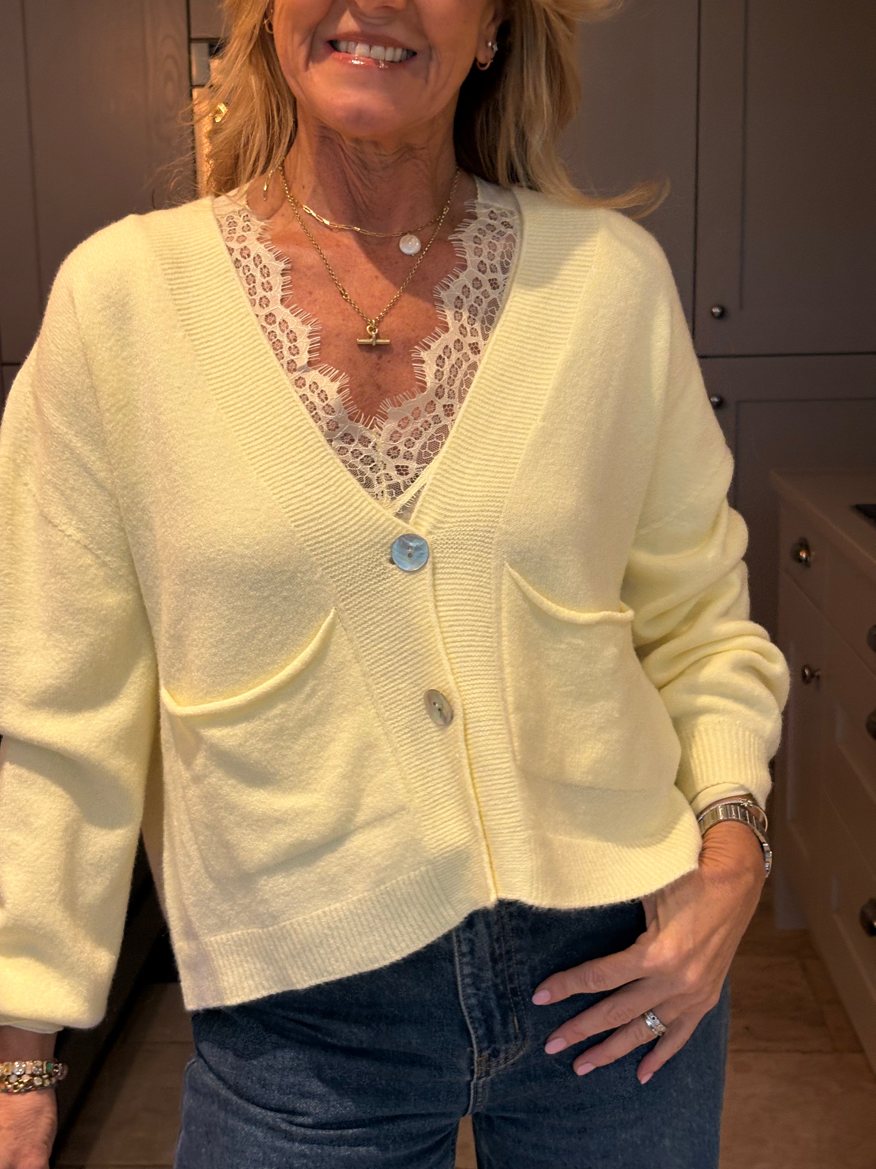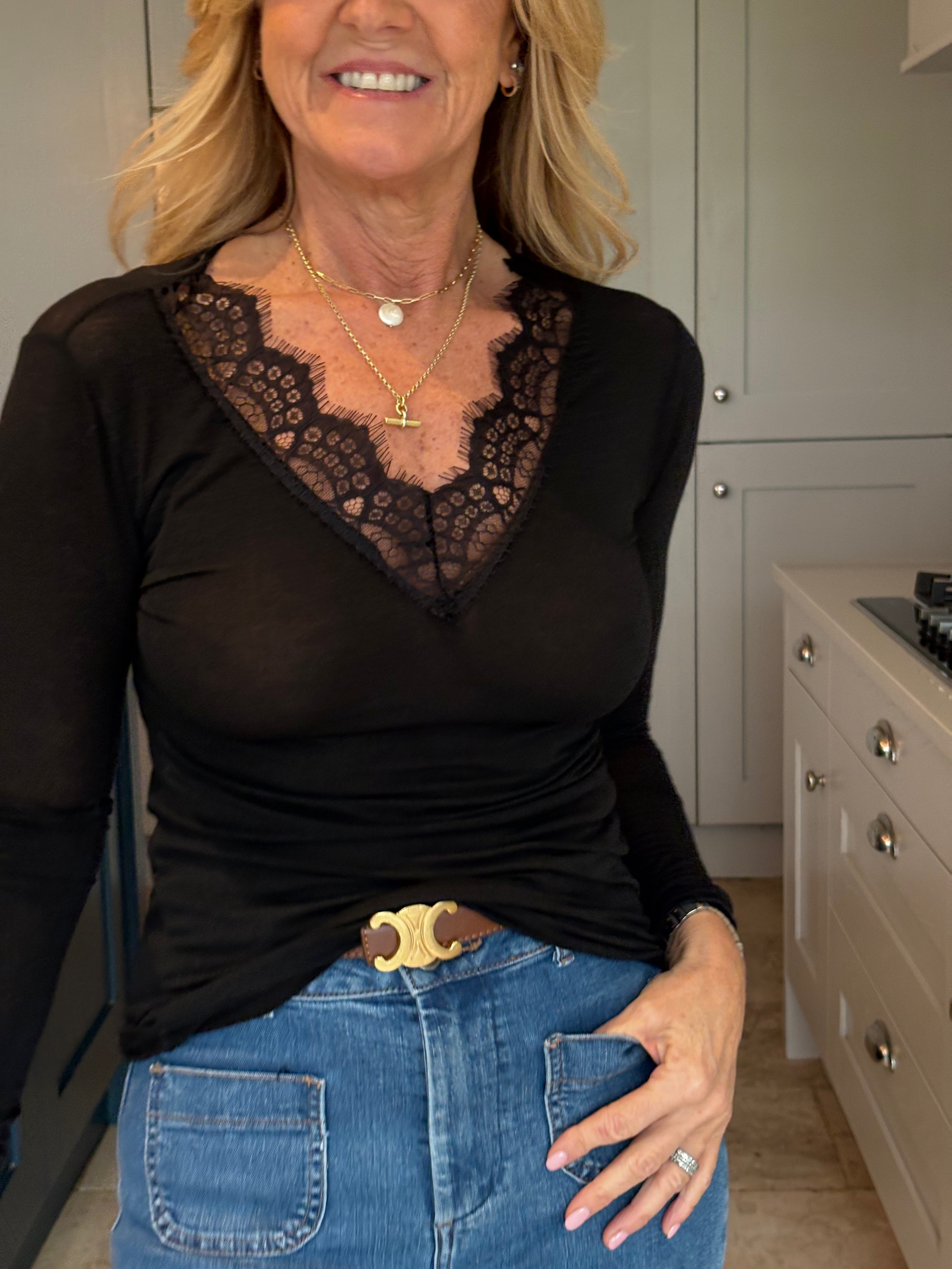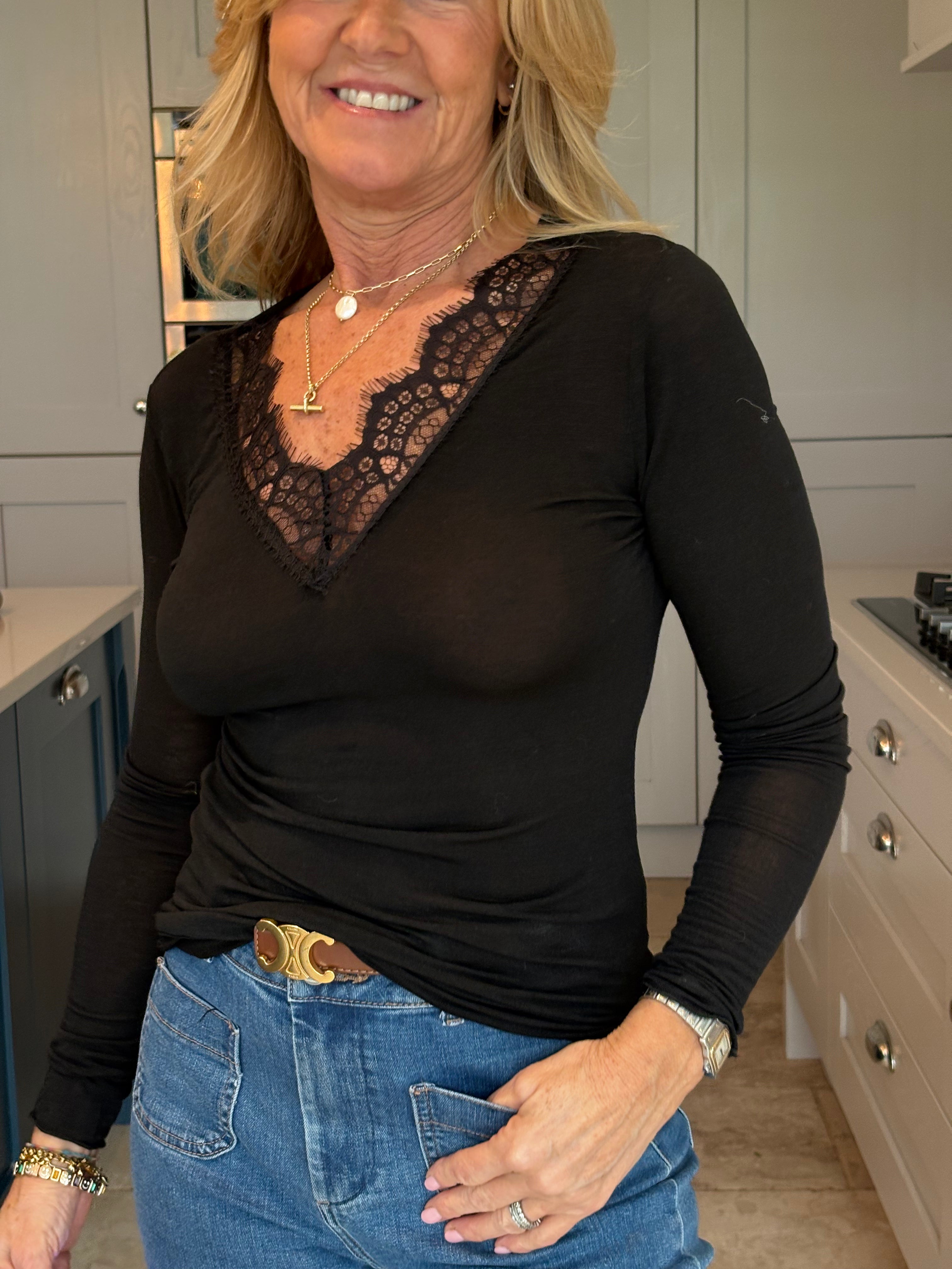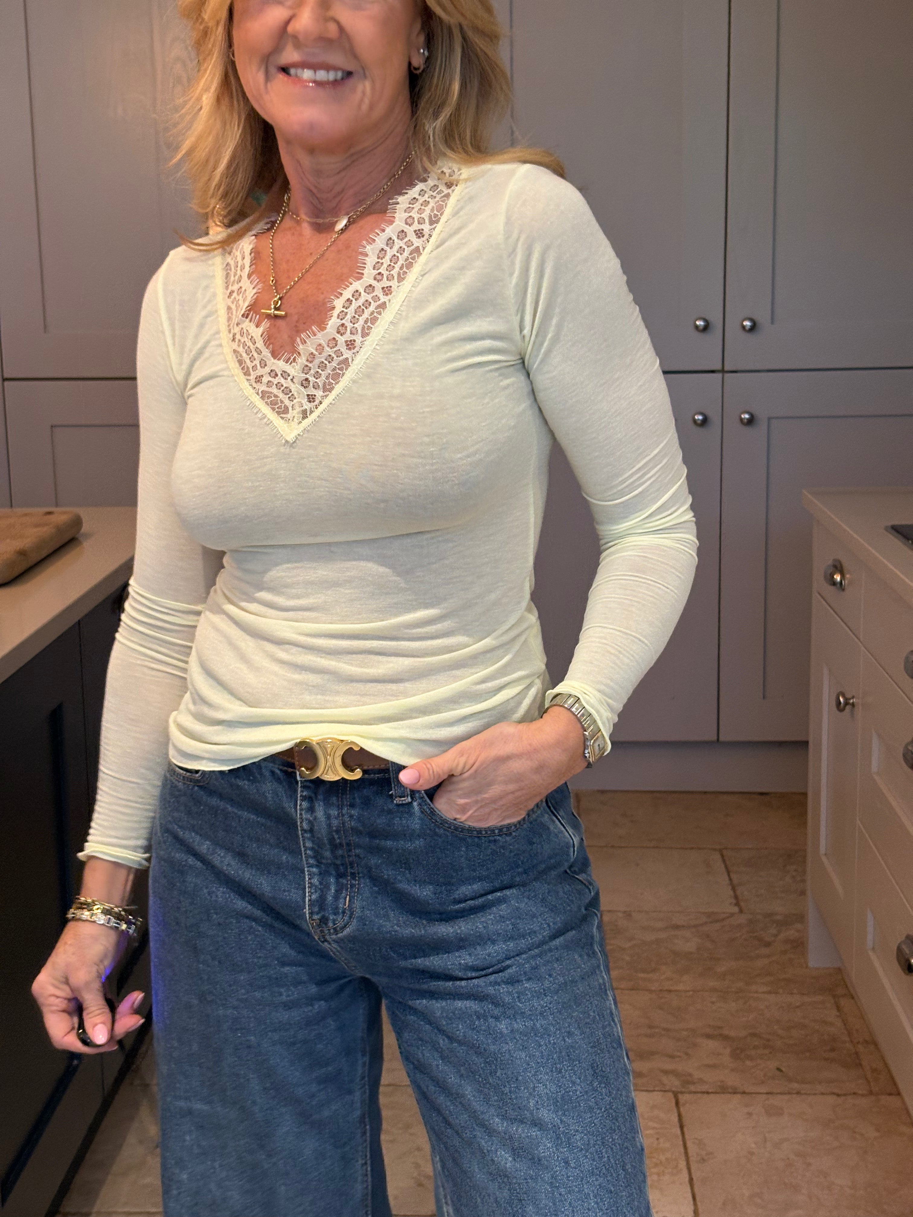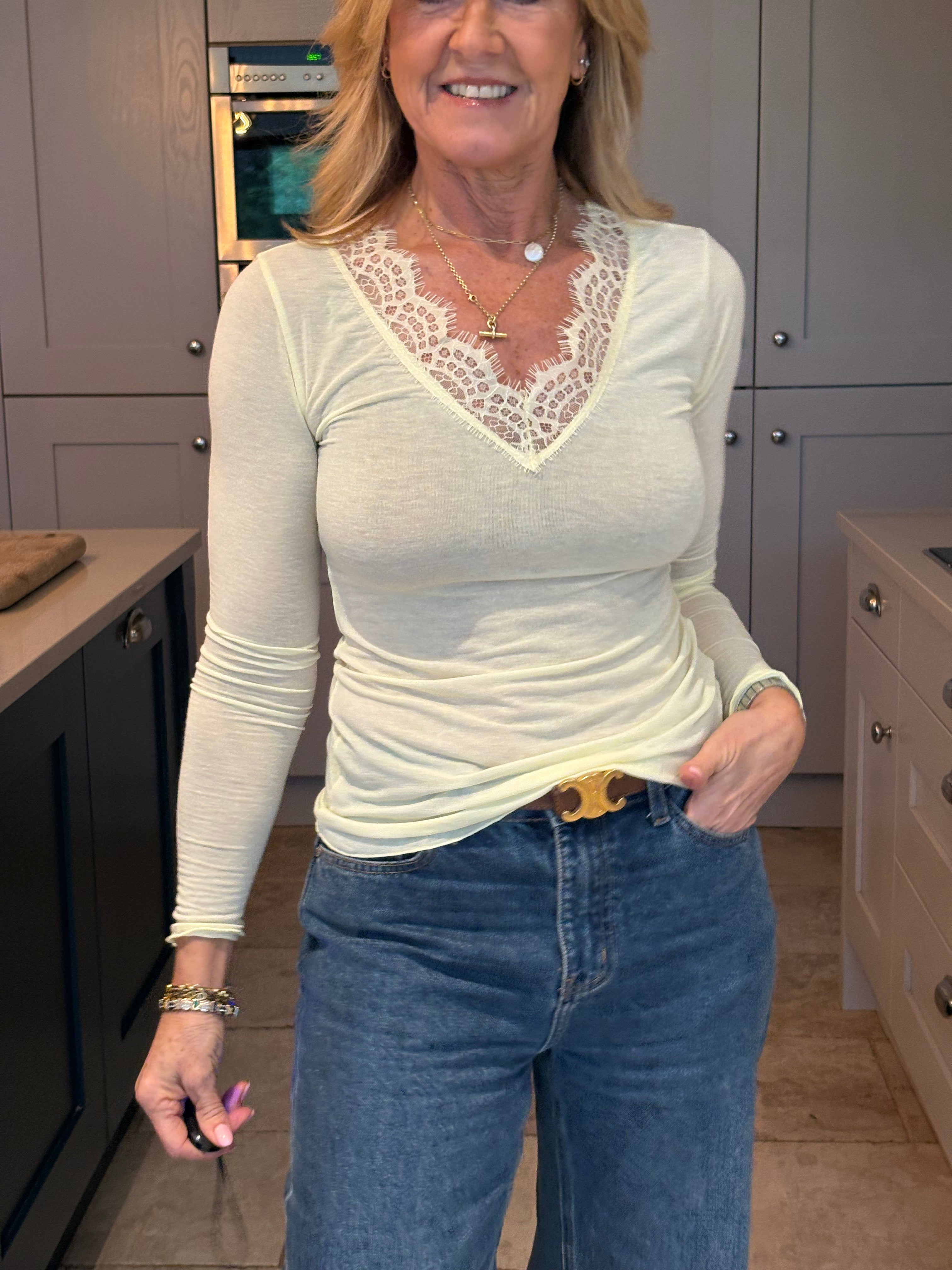A gorgeous and functional base layer top. Made in Italy with 10% cashmere, modal and elastane. The V neckline is trimmed in lace giving it a feminine touch. Great to wear under a jumper, dress or jacket. This is a one size piece (6 - 12). If you are after a slightly less fitted or bigger base layer, see the Ollie which is a size 8-16. It is very stretchy and soft to the skin. In colours of the season - Navy Blue, Brown, Denim blue, Grey, Pink, Taupe, yellow, black and Cream.