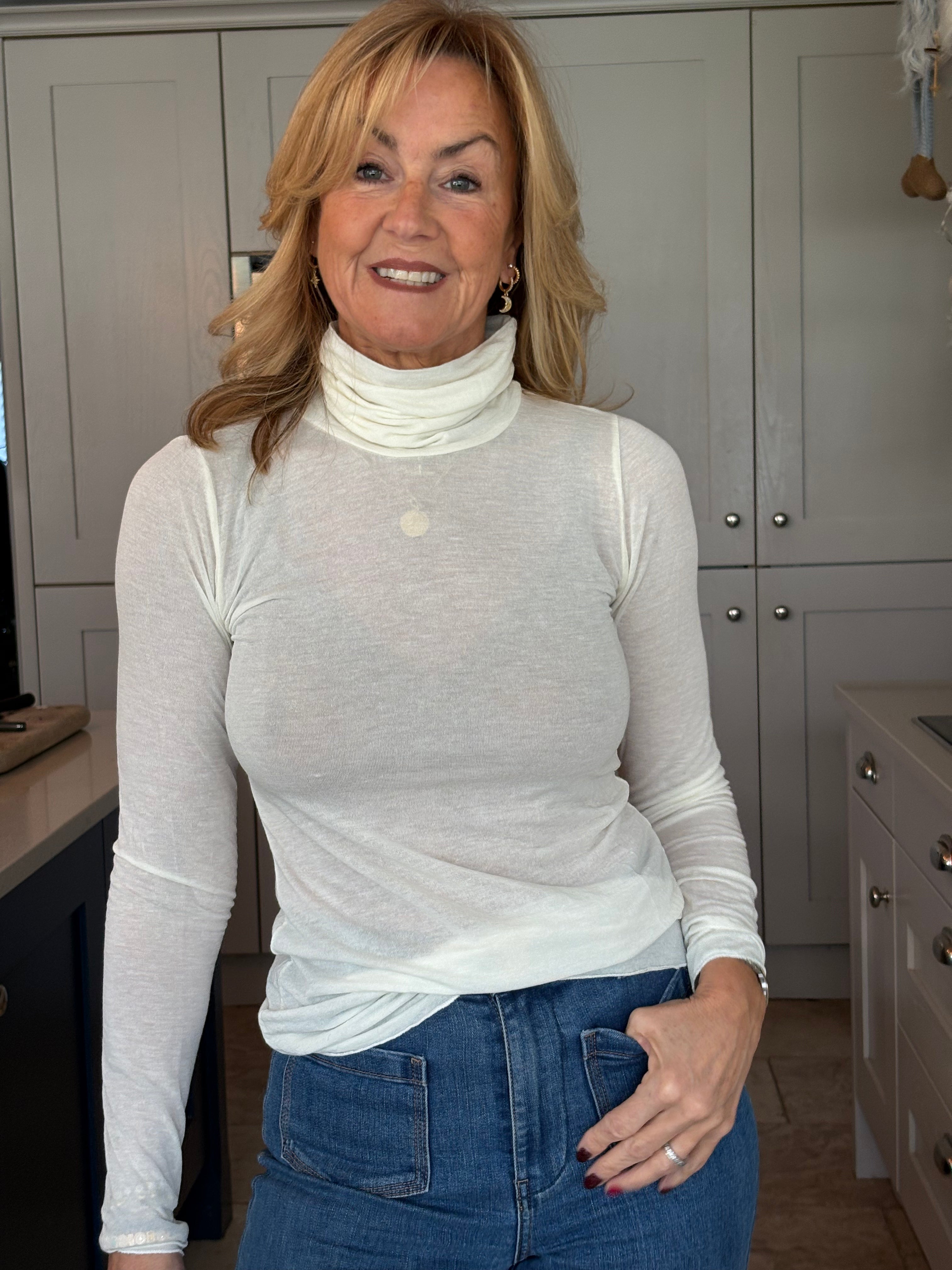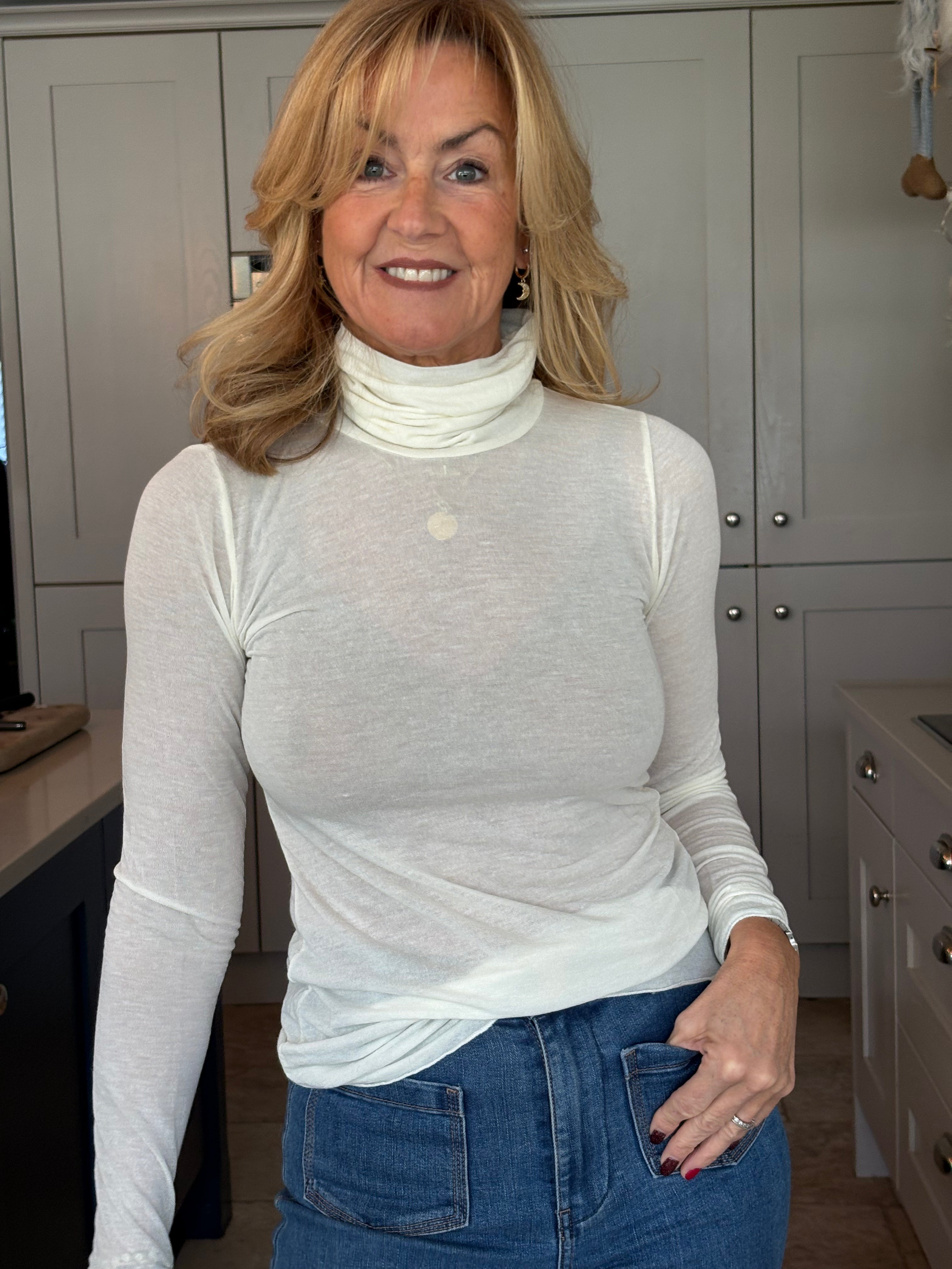A luxuriously soft cashmere-blend base layer in a rich wine tone, designed to feel like a second skin. Cut with a sleek, close fit and finished with a high polo neck, it’s the perfect foundation piece — lightweight, warm, and effortlessly elegant whether worn alone or layered.