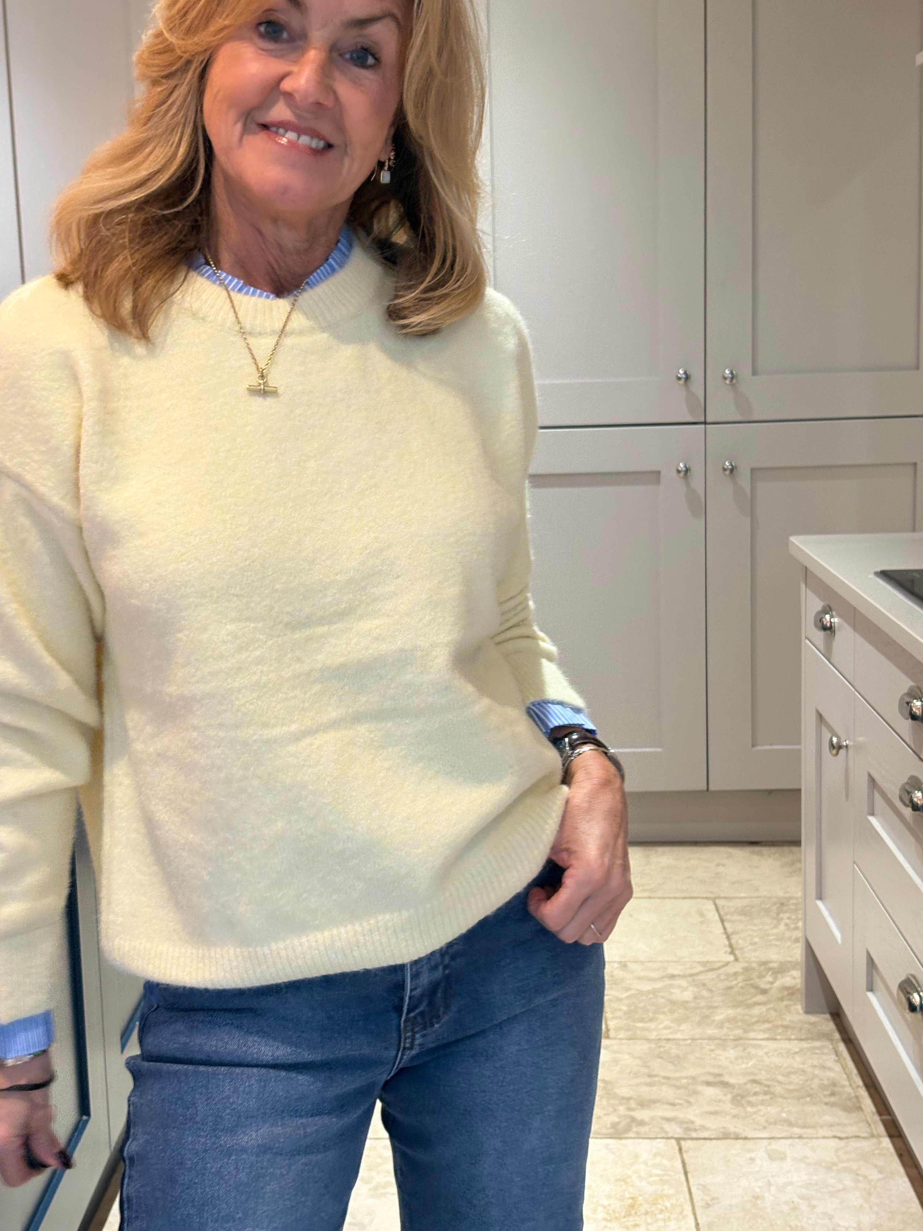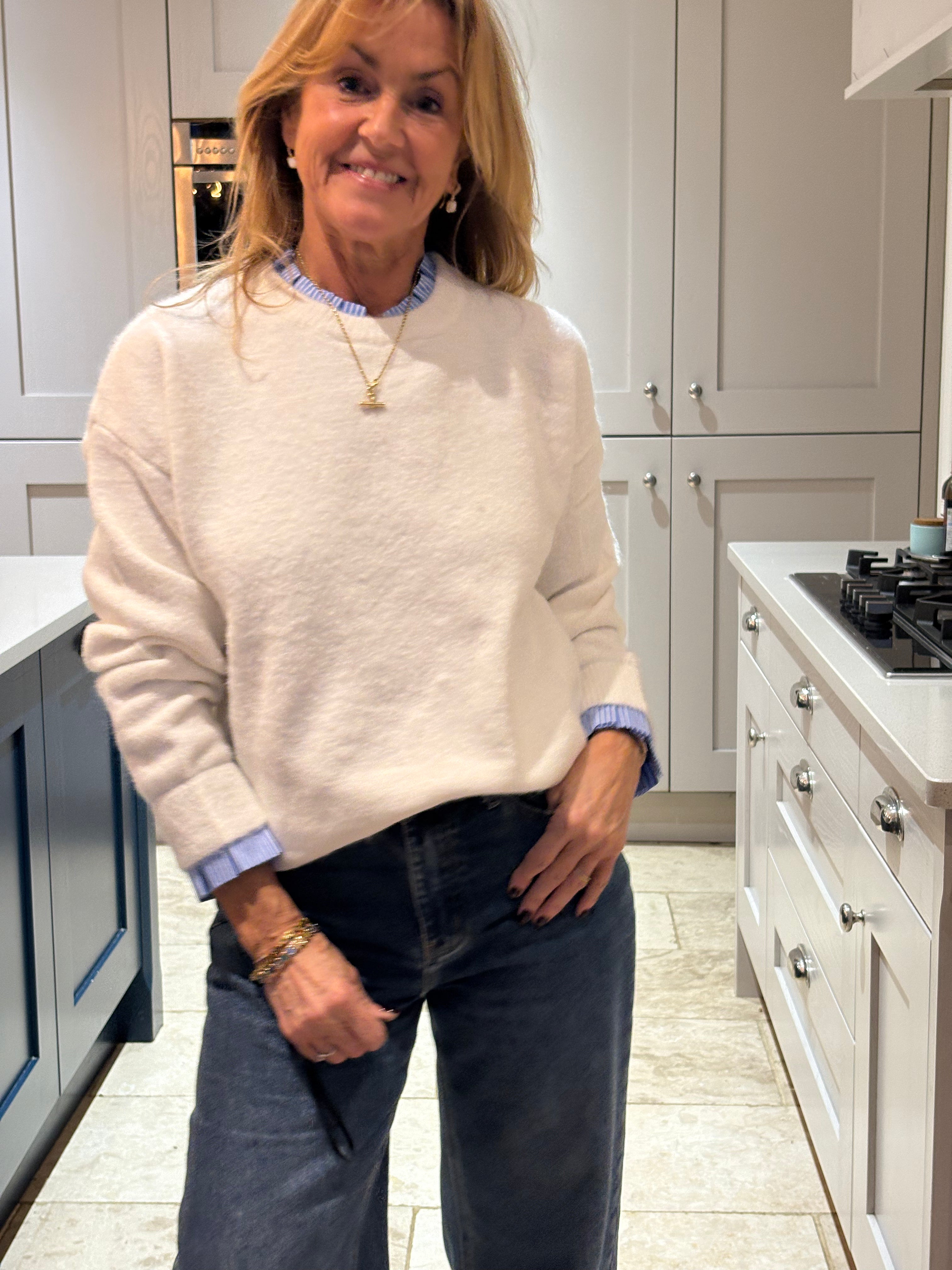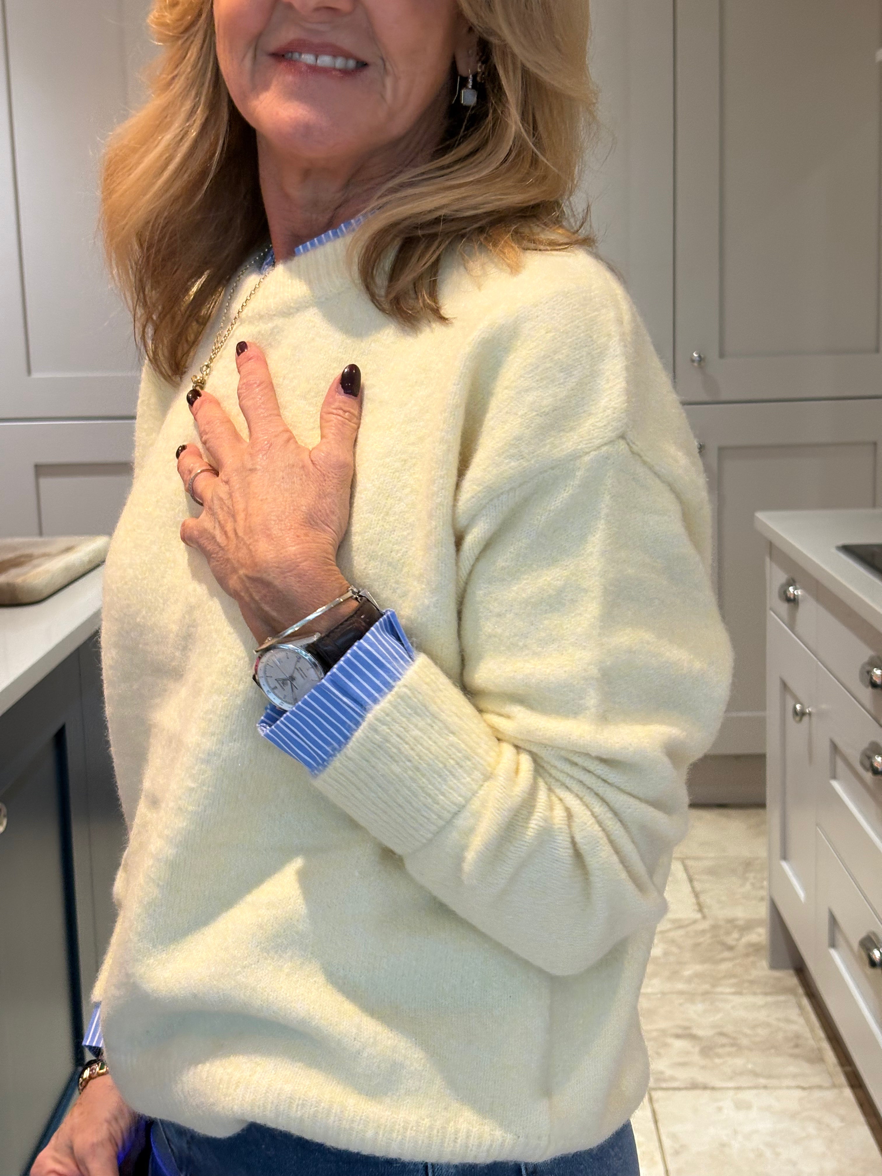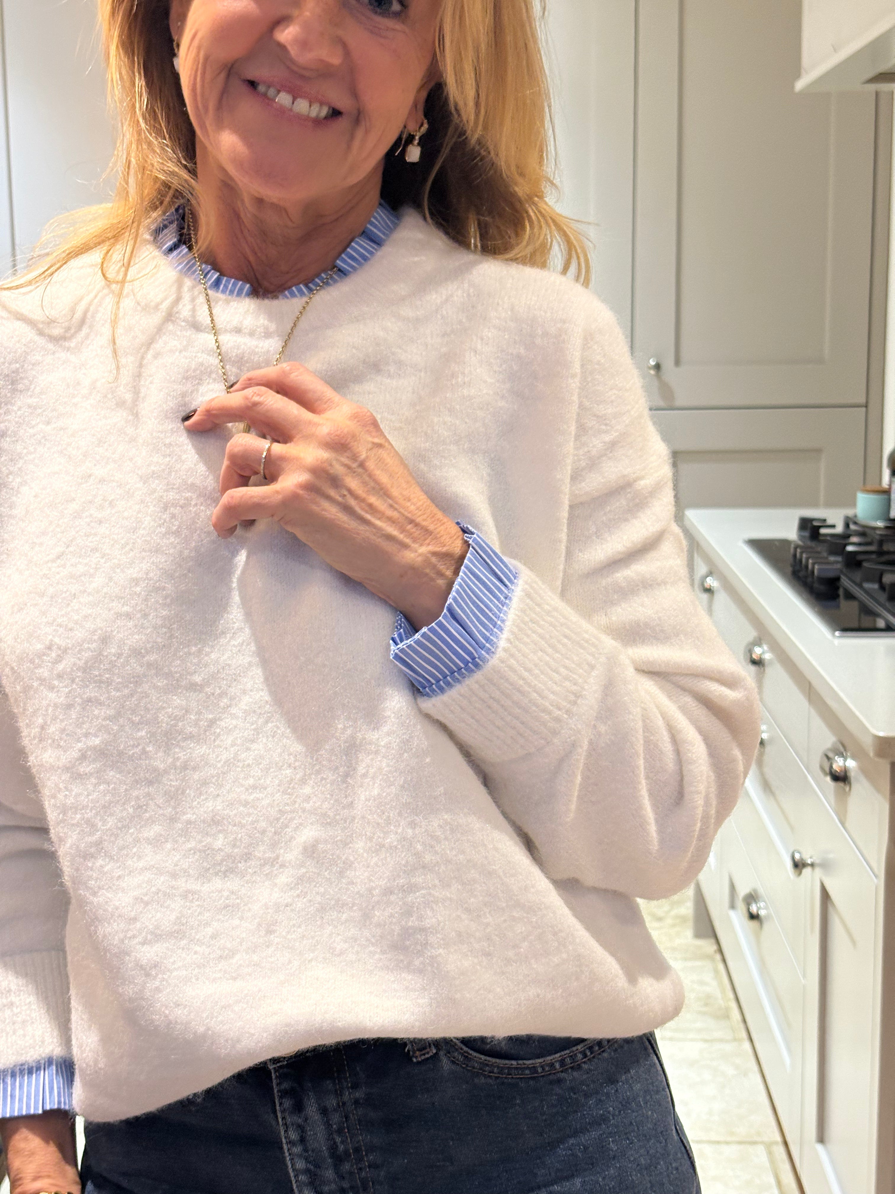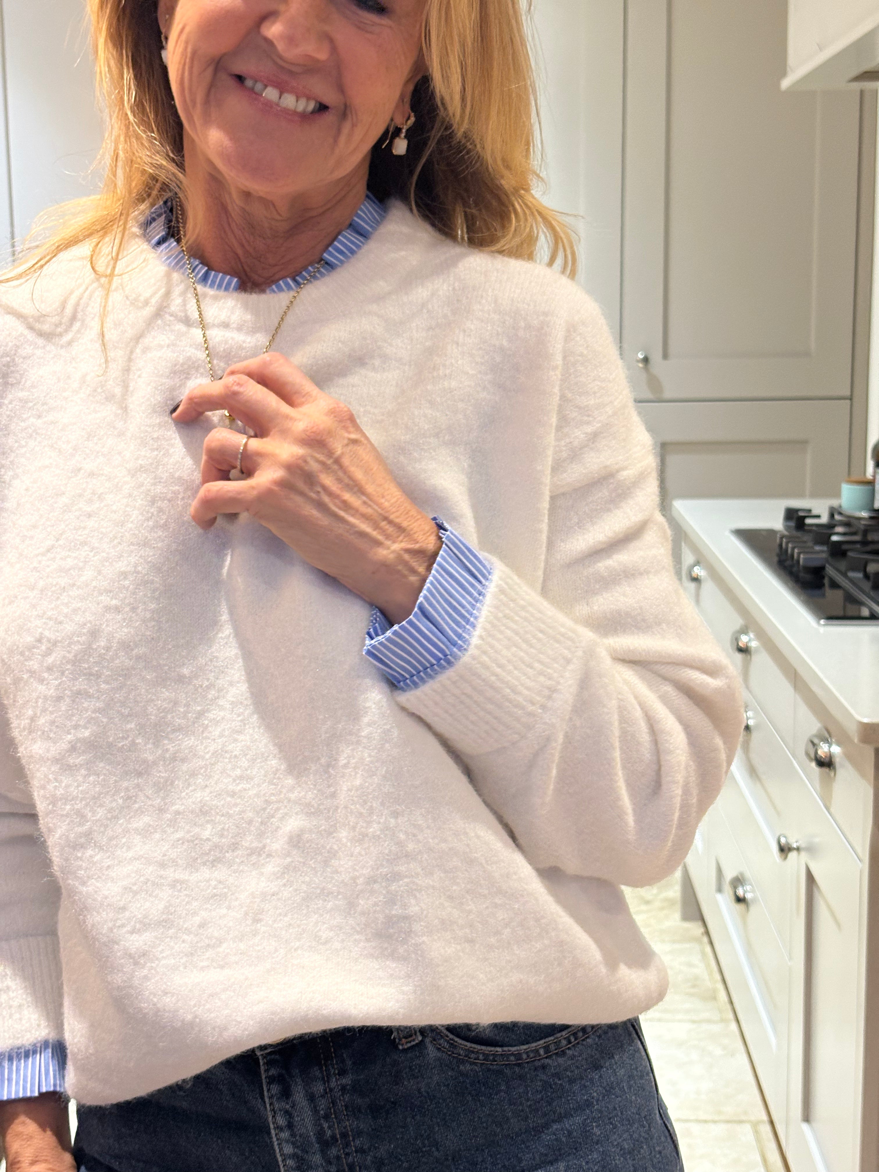 A crew neck, classic-fit jumper featuring a blue and white pinstripe pleated collar and cuffs, creating the illusion of a shirt layered underneath. Finished with a small percentage of wool for added softness and warmth, this piece is kind to the skin while offering effortless comfort and understated elegance. The Taylor is a one size piece and is very soft and fluid.