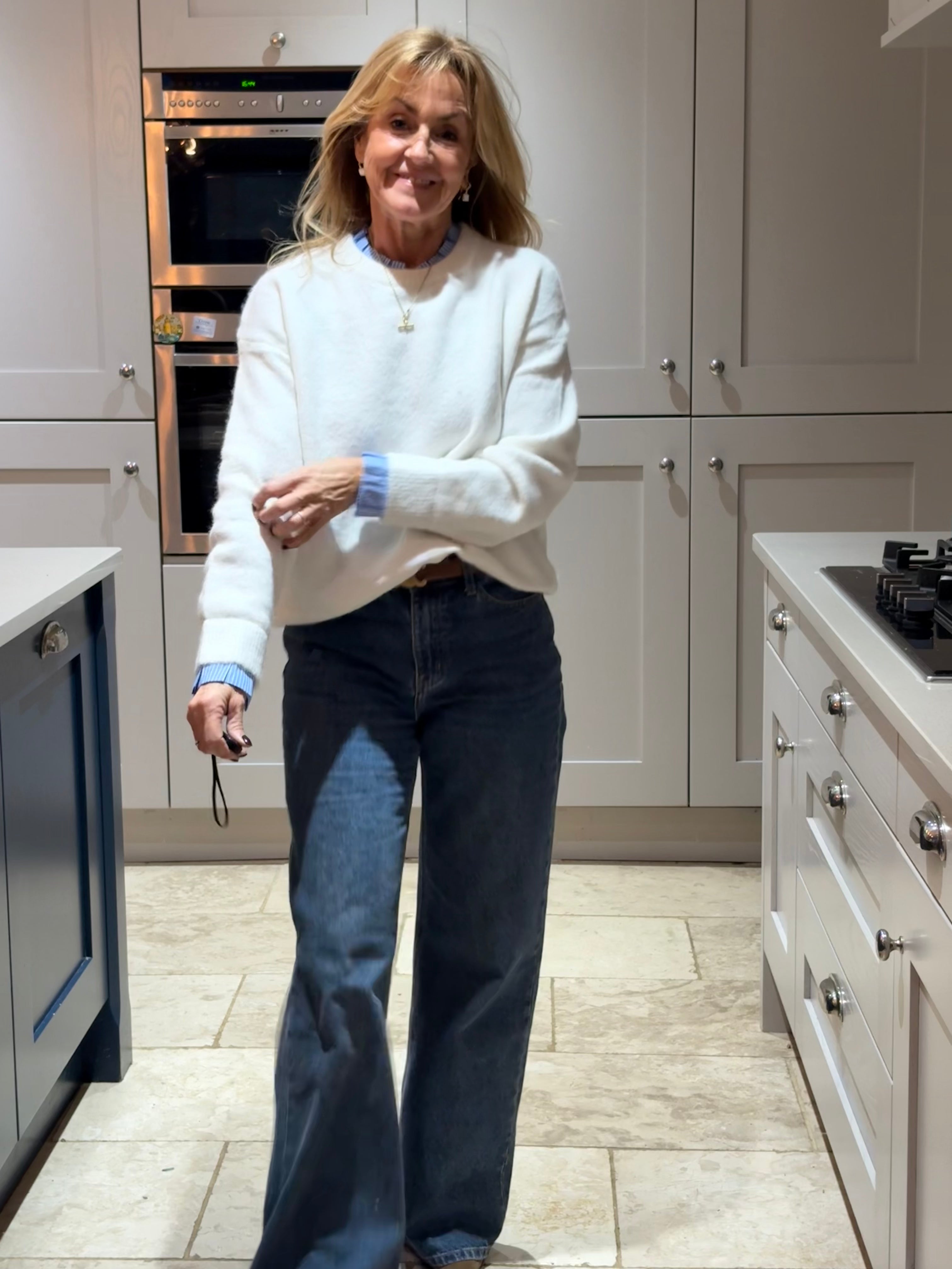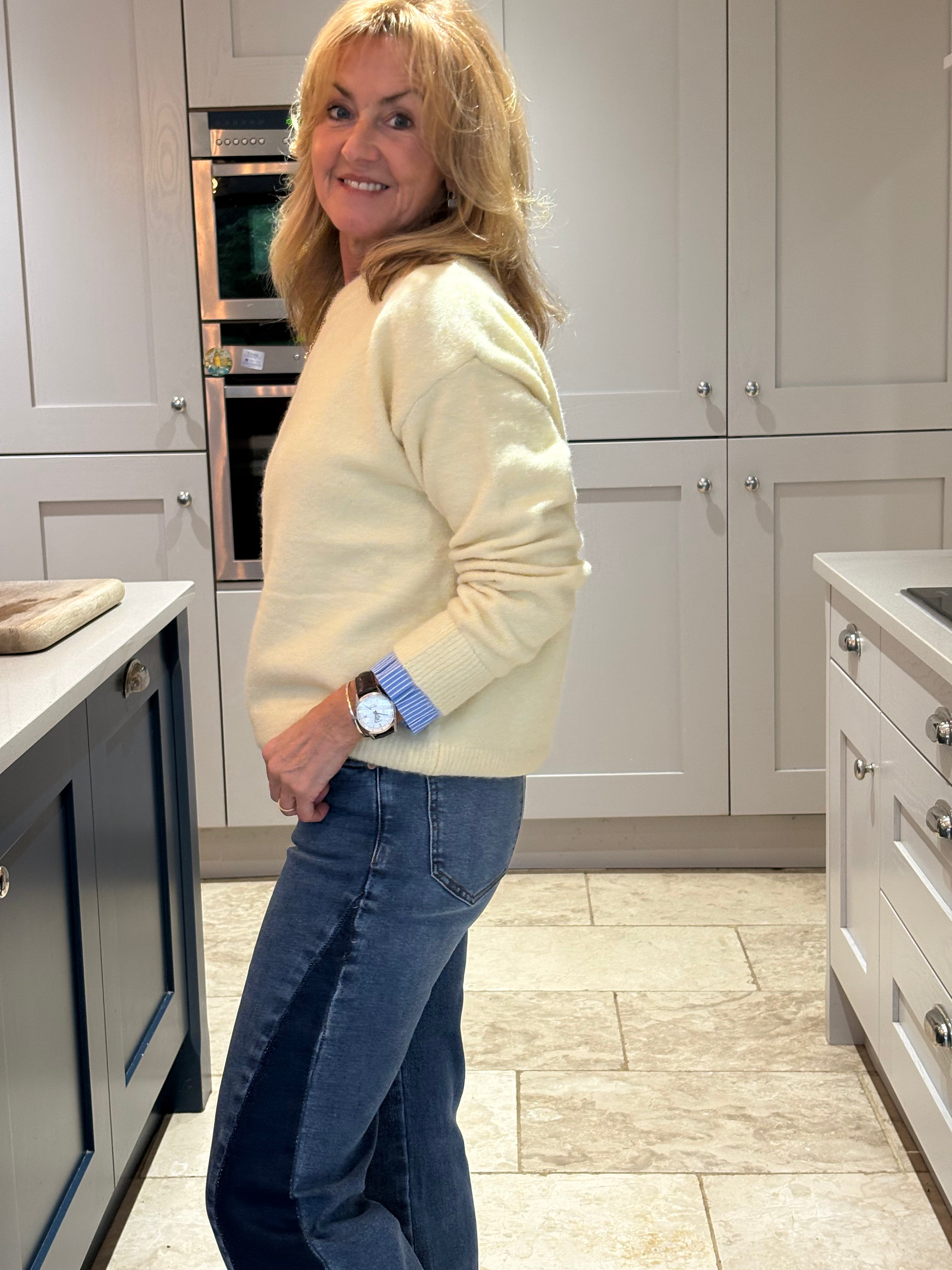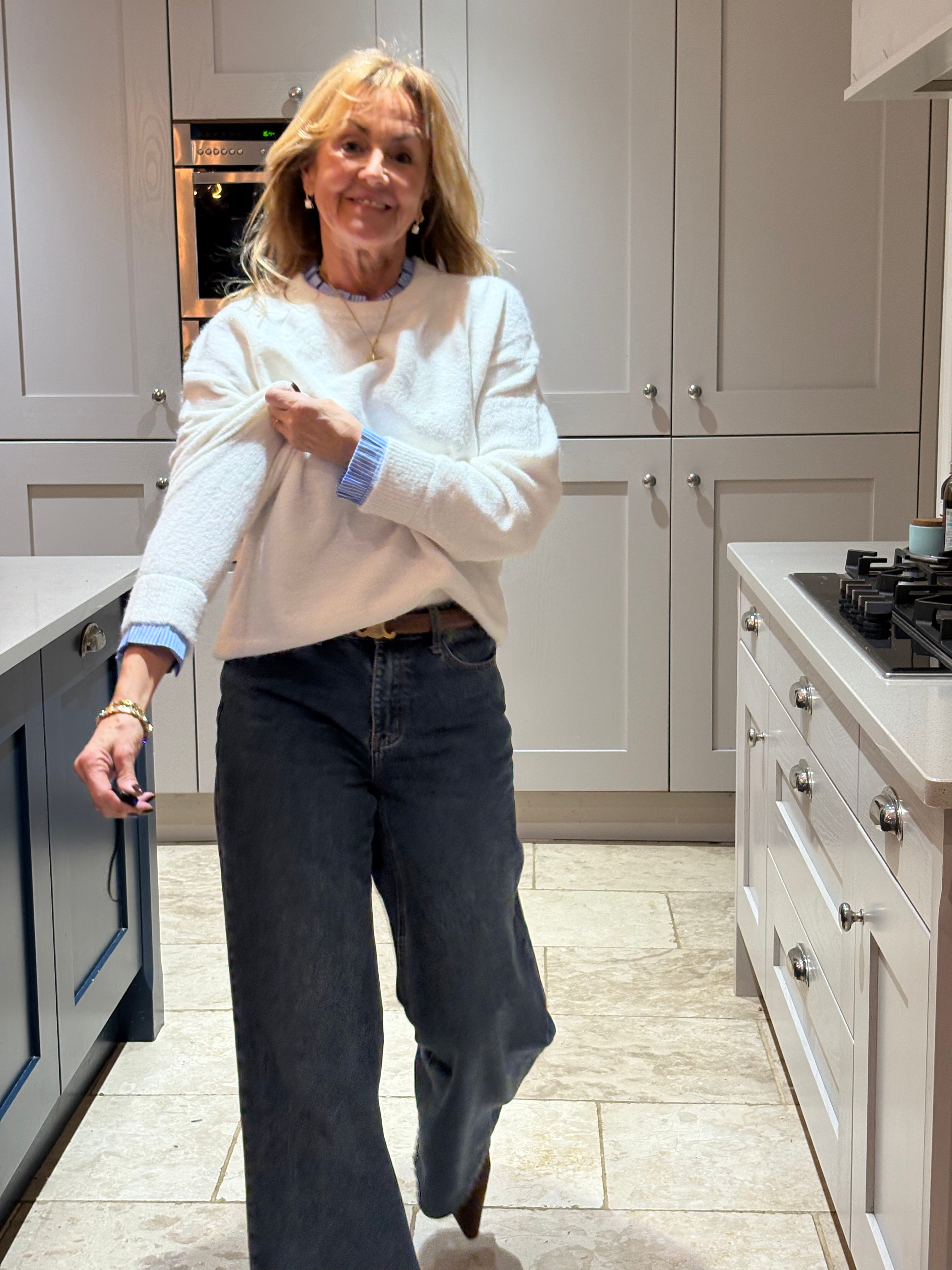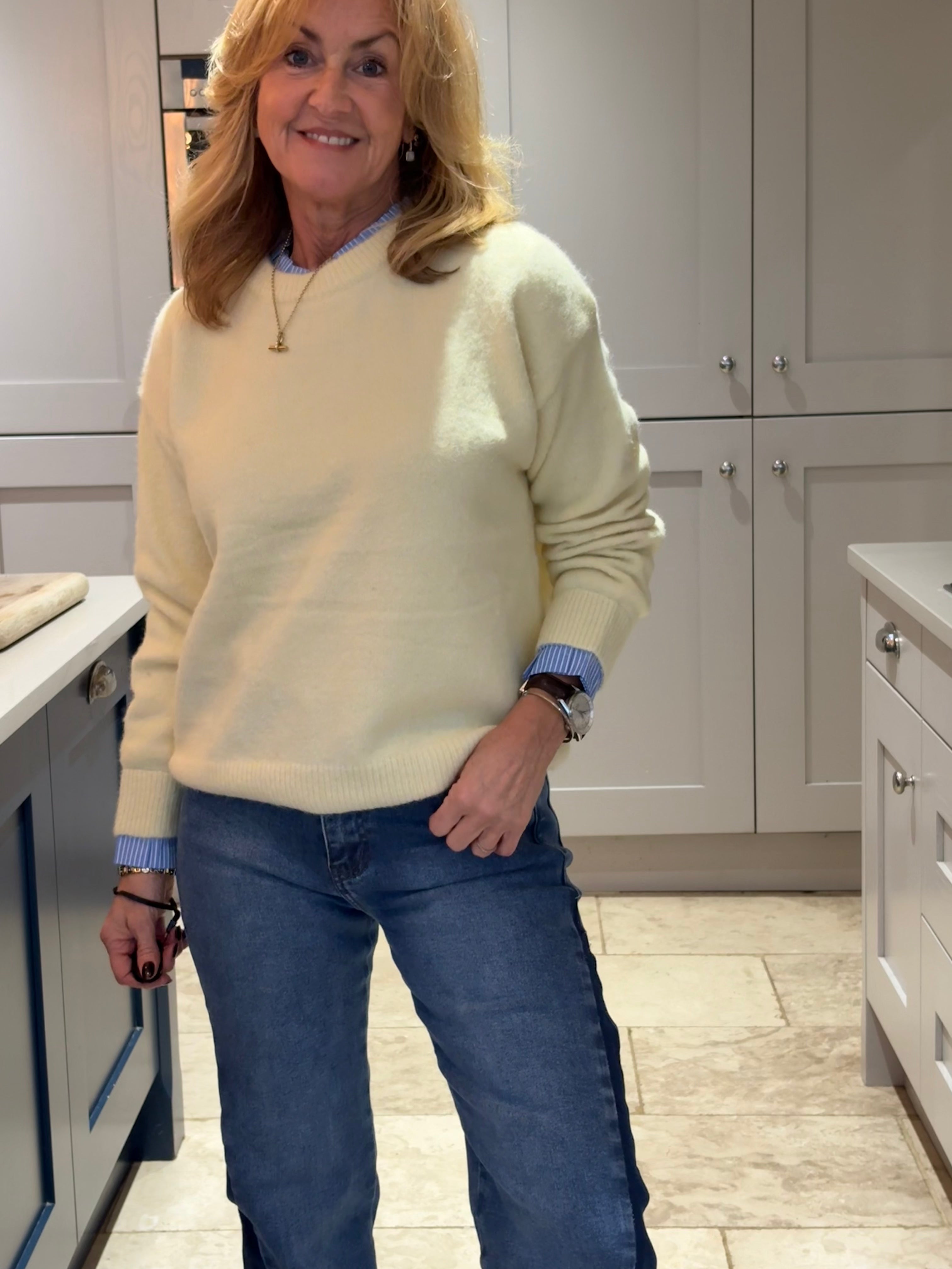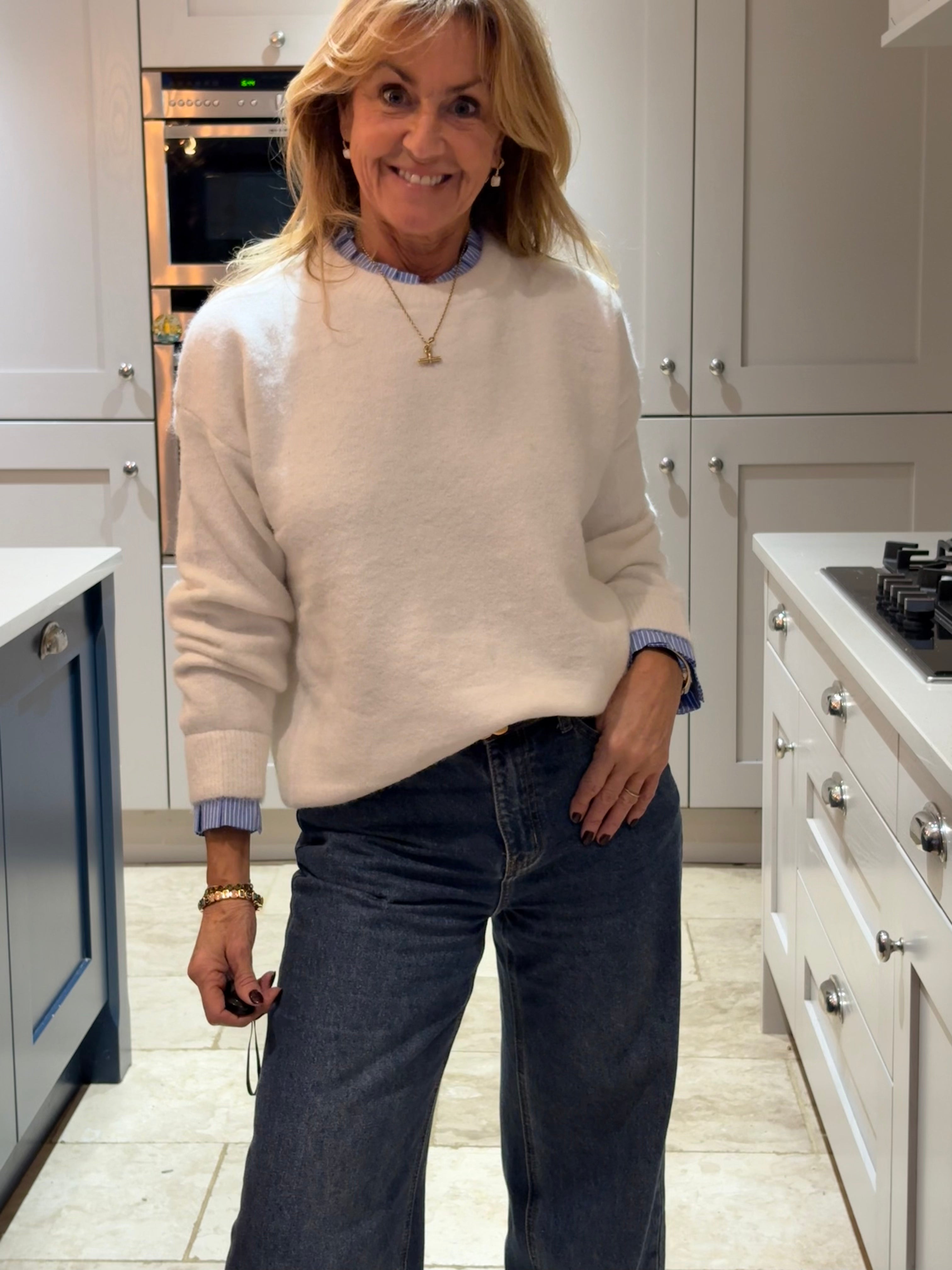 A crew neck, classic-fit jumper featuring a blue and white pinstripe pleated collar and cuffs, creating the illusion of a shirt layered underneath. Finished with a small percentage of wool for added softness and warmth, this piece is kind to the skin while offering effortless comfort and understated elegance. The Taylor is a one size piece and is very soft and fluid.