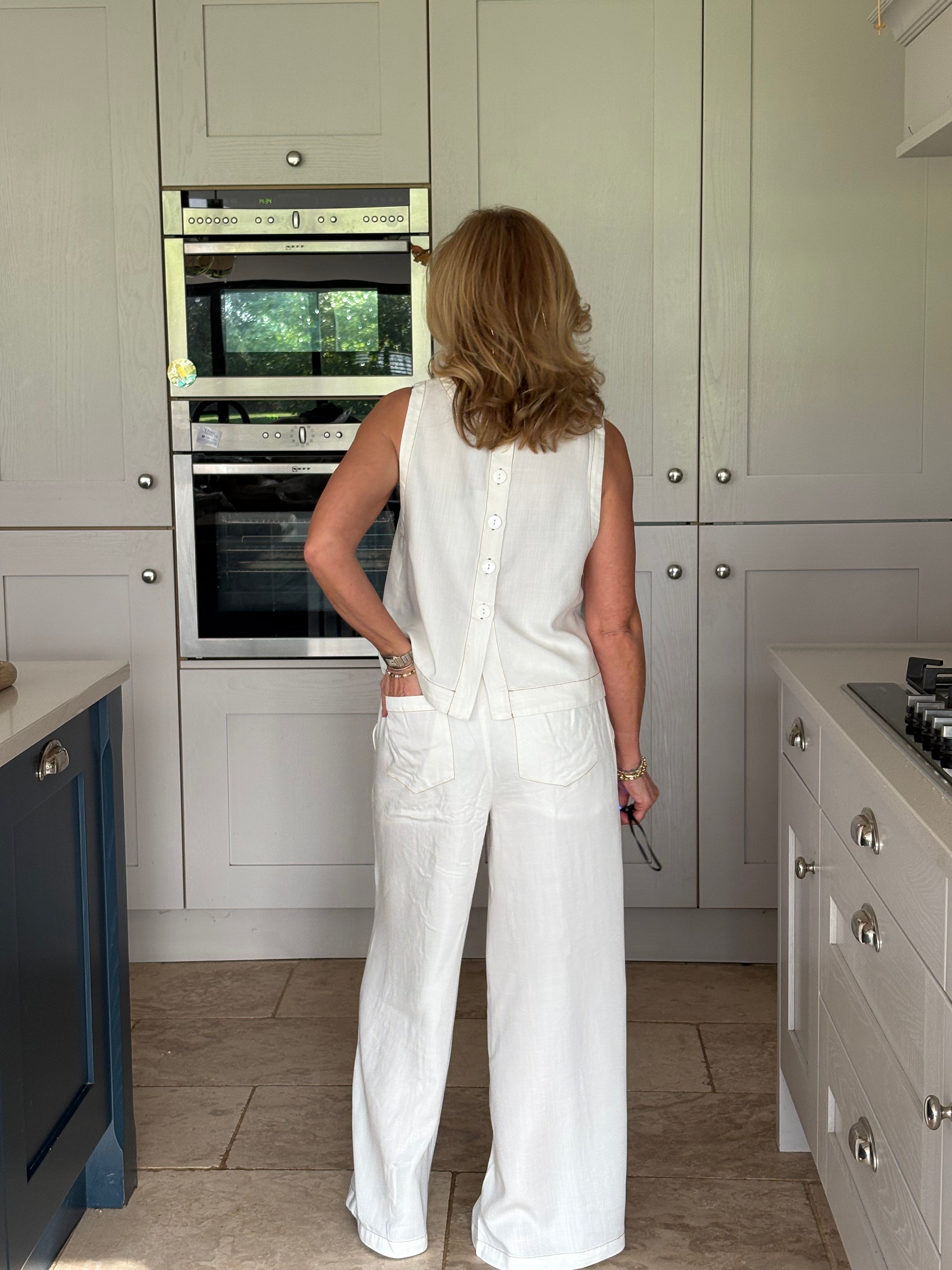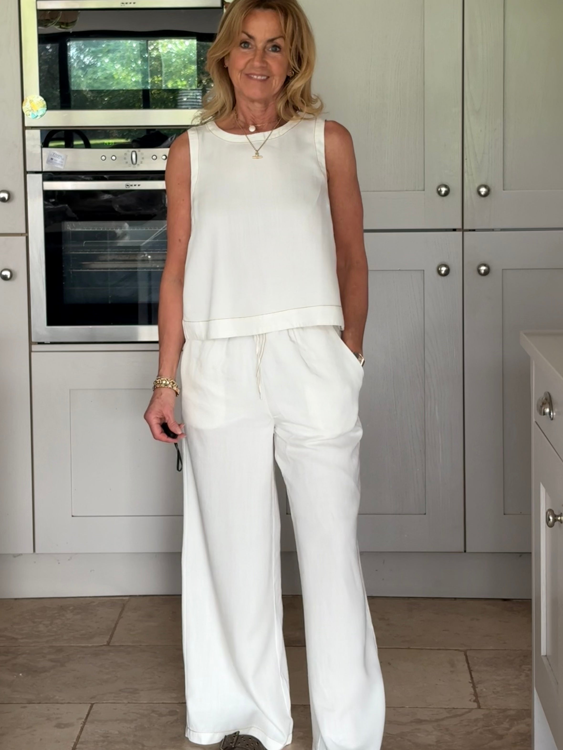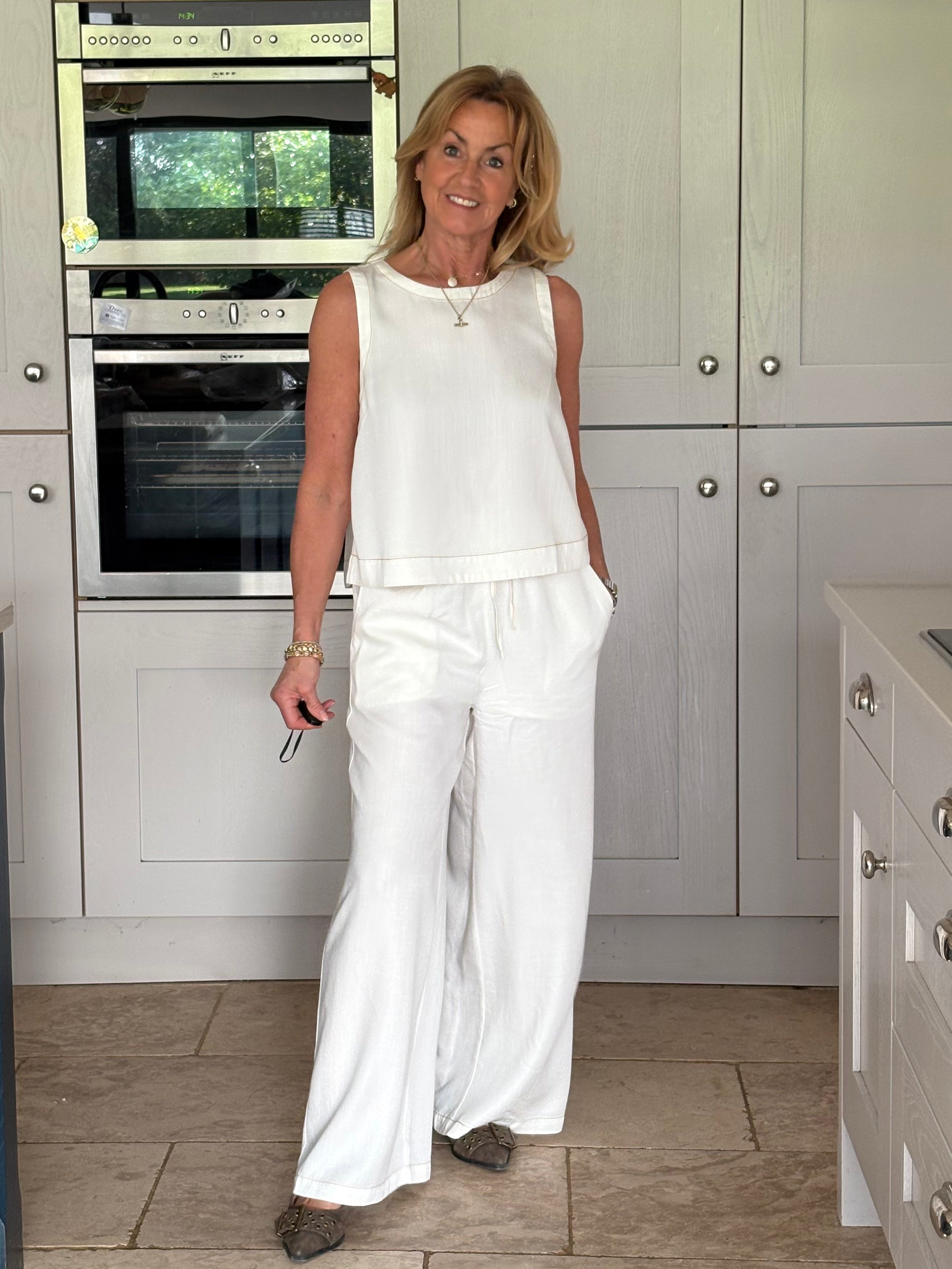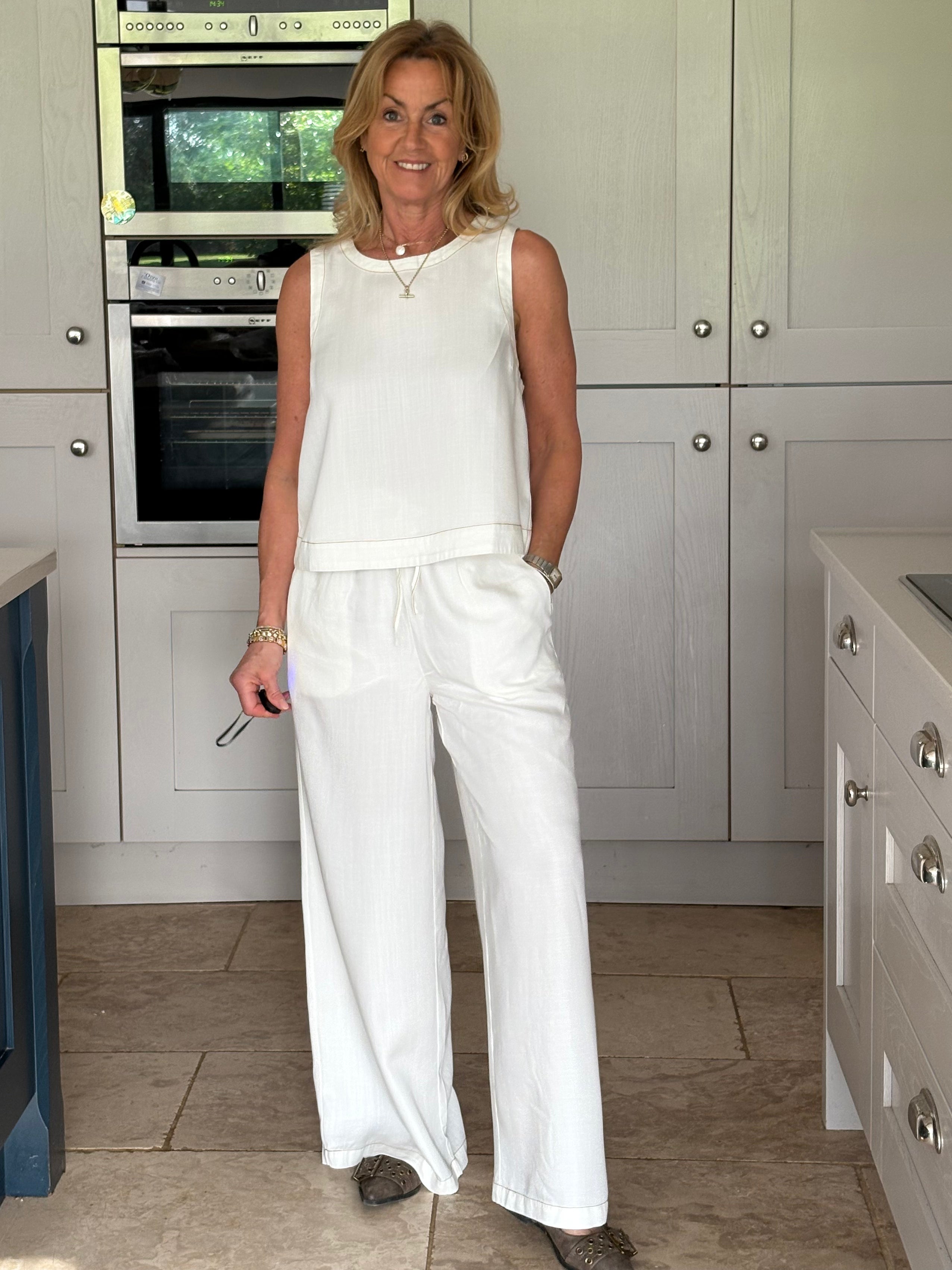 A gorgeous pair of off-white lyocell pants, beautifully elevated with contrast brown stitching that adds subtle definition and a modern, refined edge. The stitching gently outlines the silhouette, enhancing the clean lines while complementing the soft, natural tone of the fabric. Designed for both comfort and style, they feature a thick elasticated waistband with adjustable ties for the perfect fit. Two front pockets and two back pockets add practicality without disrupting the effortless flow of the design. The lightweight lyocell fabric falls fluidly to the floor in a loose, wide-legged silhouette, creating a relaxed yet elegant look with a truly beautiful drape. Soft, breathable, and graceful in movement, these trousers feel as good as they look. Wear them styled together with the matching top for a polished, coordinated outfit, or pair them with a jumper, jacket, or blouse for endless versatile combinations. Relaxed sophistication at its finest.