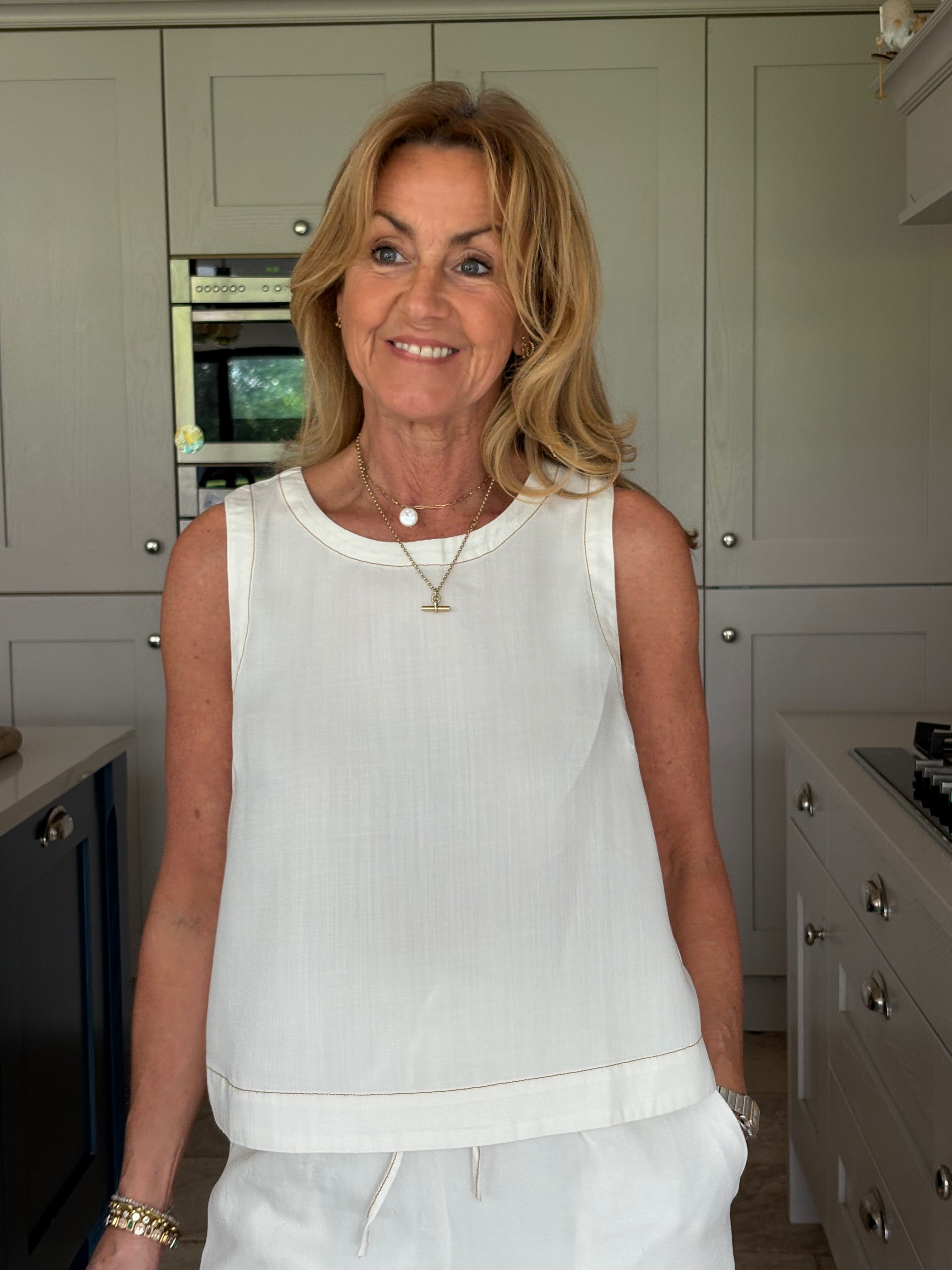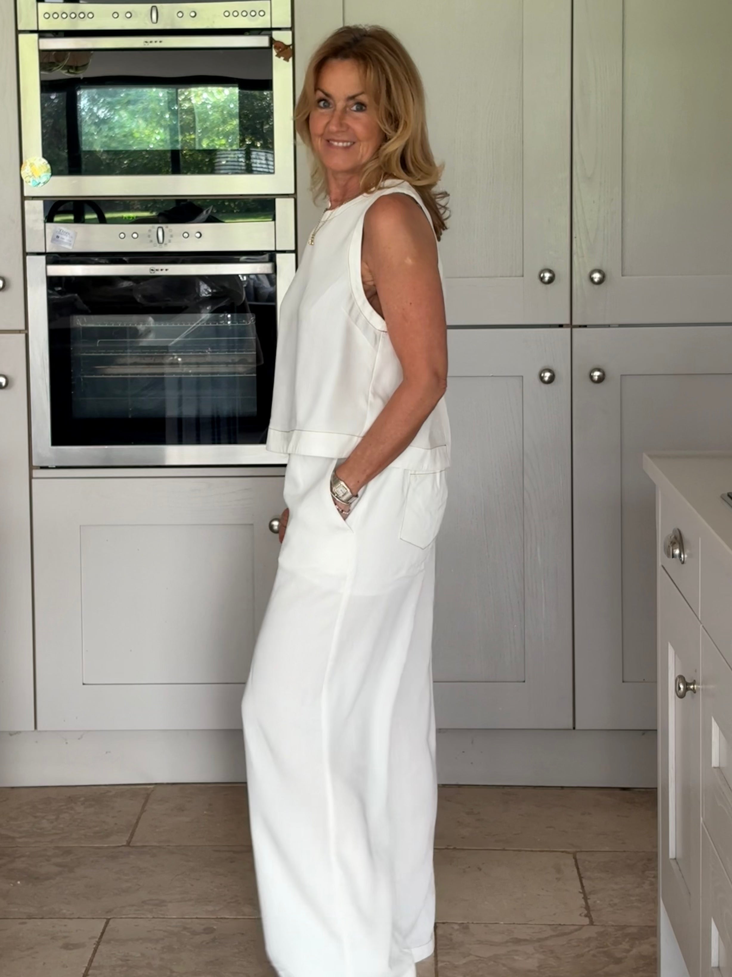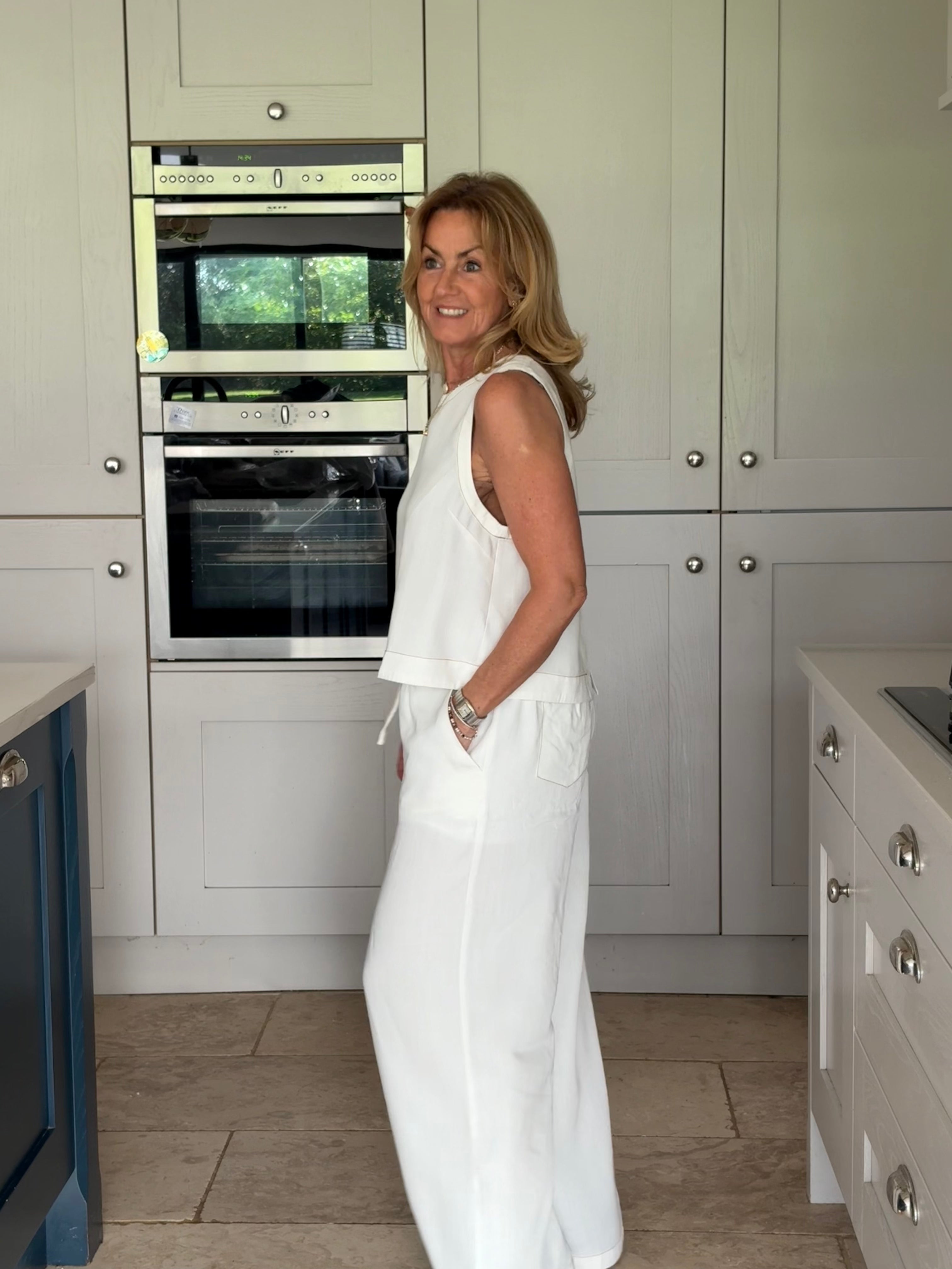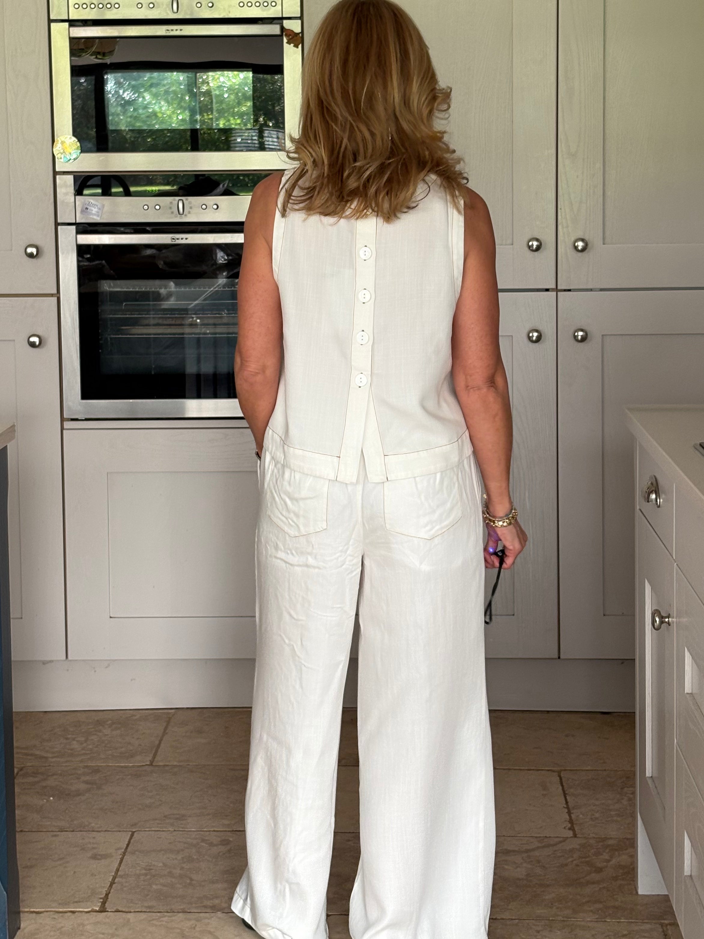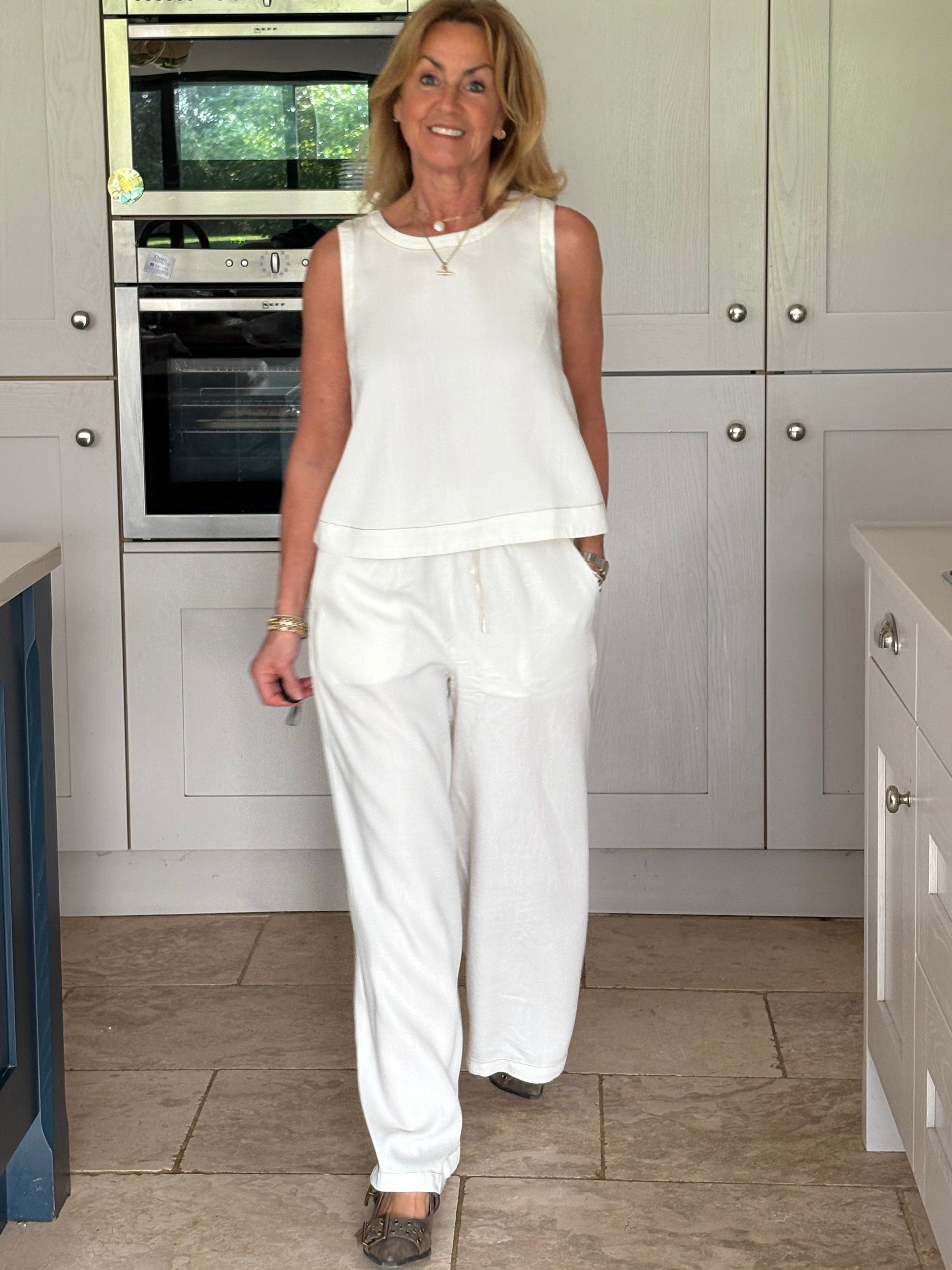 A gorgeous pair of off-white lyocell pants, beautifully elevated with contrast brown stitching that adds subtle definition and a modern, refined edge. The stitching gently outlines the silhouette, enhancing the clean lines while complementing the soft, natural tone of the fabric. Designed for both comfort and style, they feature a thick elasticated waistband with adjustable ties for the perfect fit. Two front pockets and two back pockets add practicality without disrupting the effortless flow of the design. The lightweight lyocell fabric falls fluidly to the floor in a loose, wide-legged silhouette, creating a relaxed yet elegant look with a truly beautiful drape. Soft, breathable, and graceful in movement, these trousers feel as good as they look. Wear them styled together with the matching top for a polished, coordinated outfit, or pair them with a jumper, jacket, or blouse for endless versatile combinations. Relaxed sophistication at its finest.